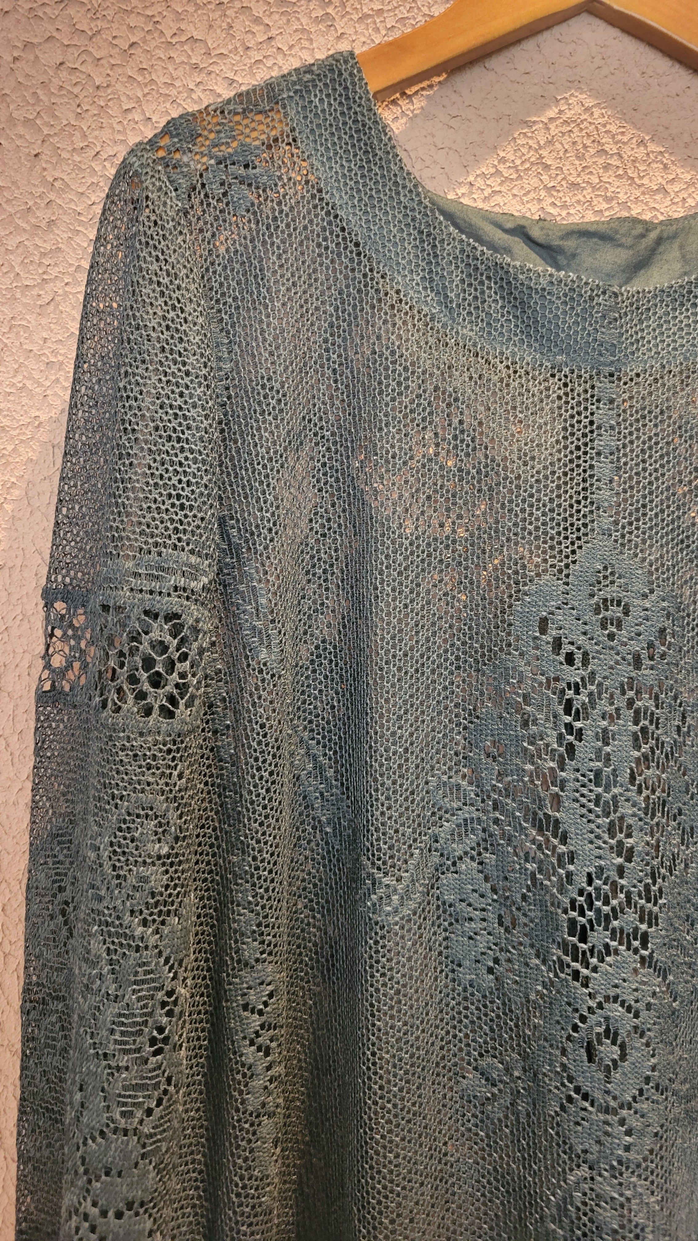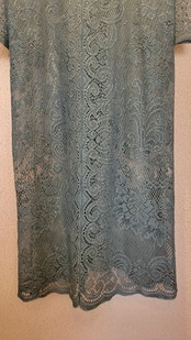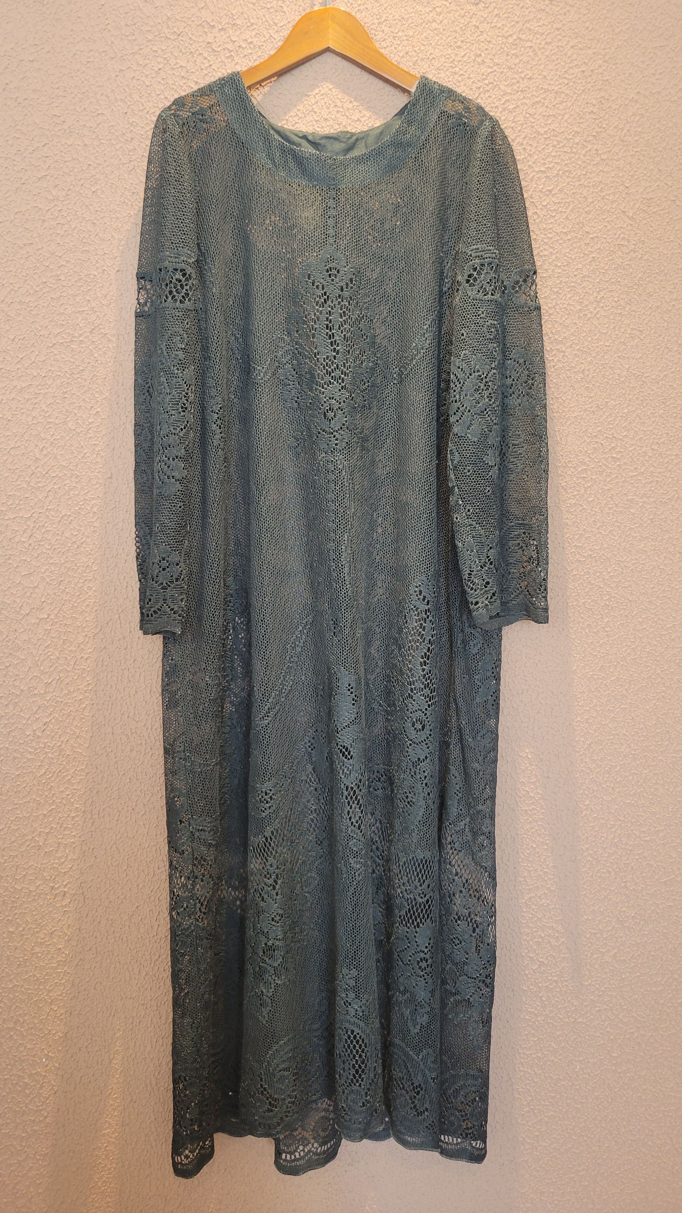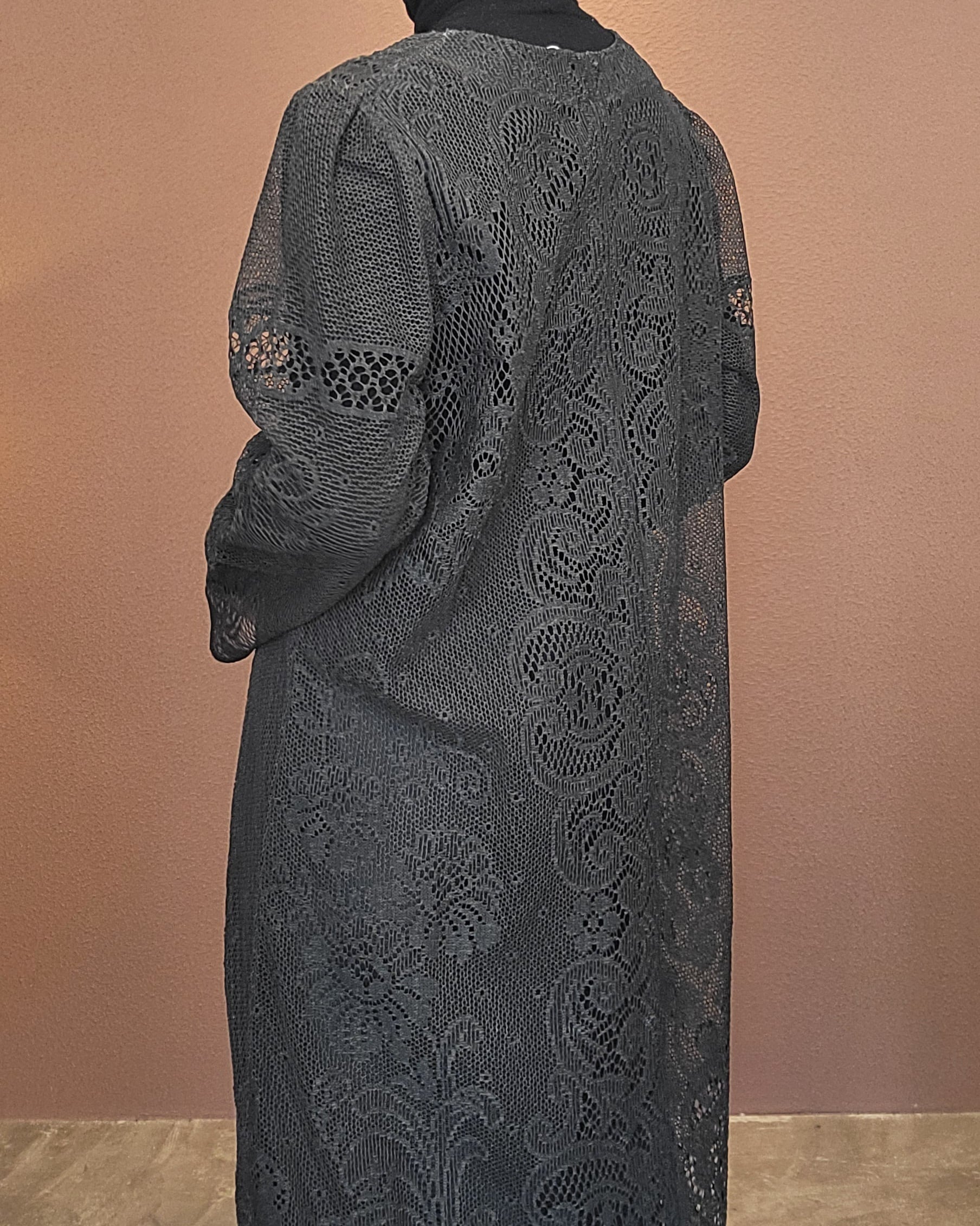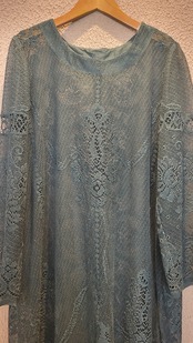 ヴィンテージのホワイトレースをブラックに後染めしたリメイクワンピース。染めは無農薬、無科学肥料で栽培された琉球藍を使用し、藍染→柿渋染→鉄媒染という複数の行程を経て丁寧に染め上げています。ボタンやファスナーは付いておらず頭から被るようにして着用するプルオーバータイプ。すとんと落ちるシルエットが縦ラインを際立たせすっきり見せてくれます。