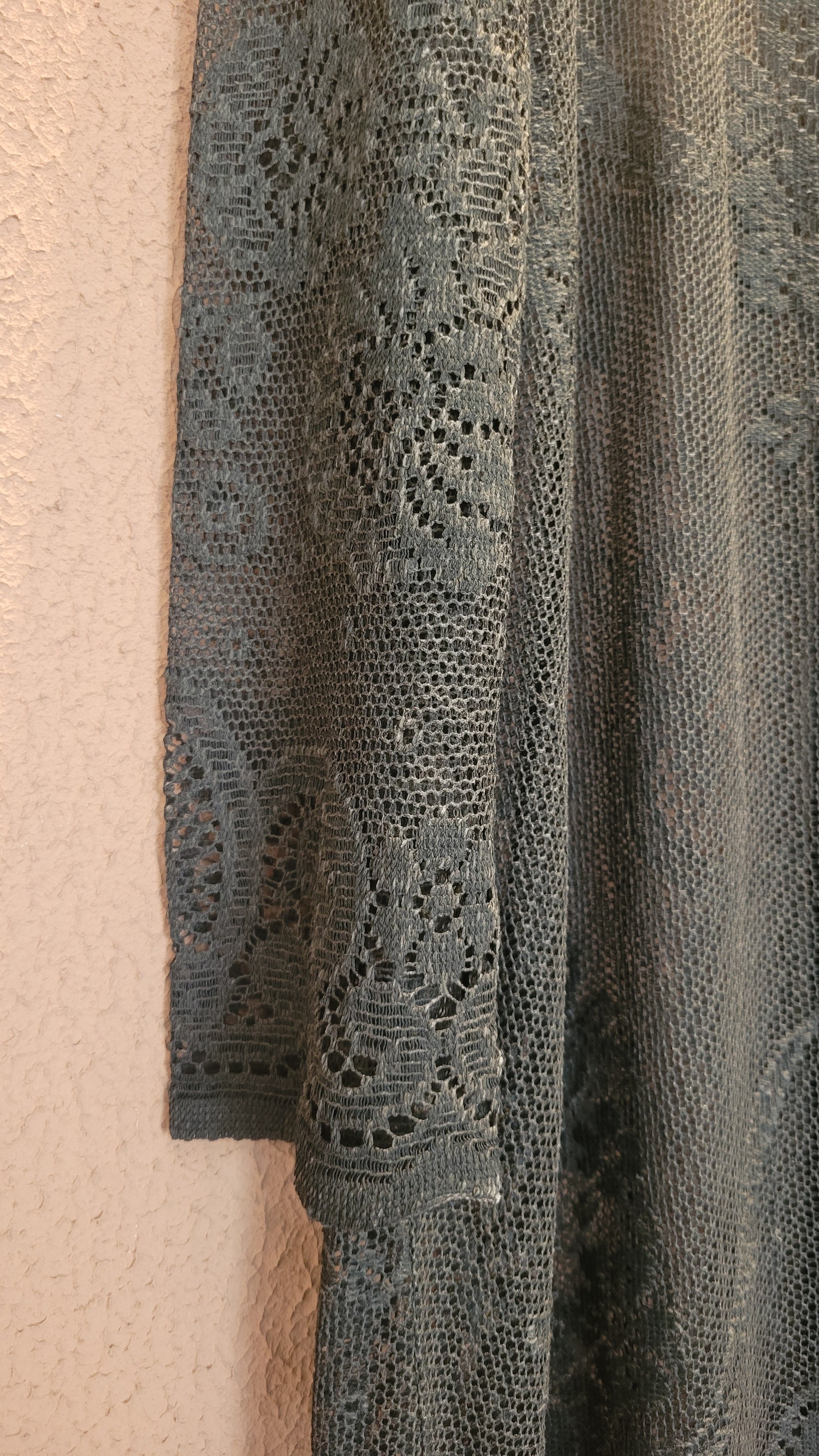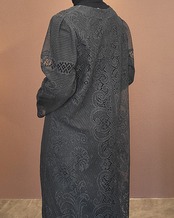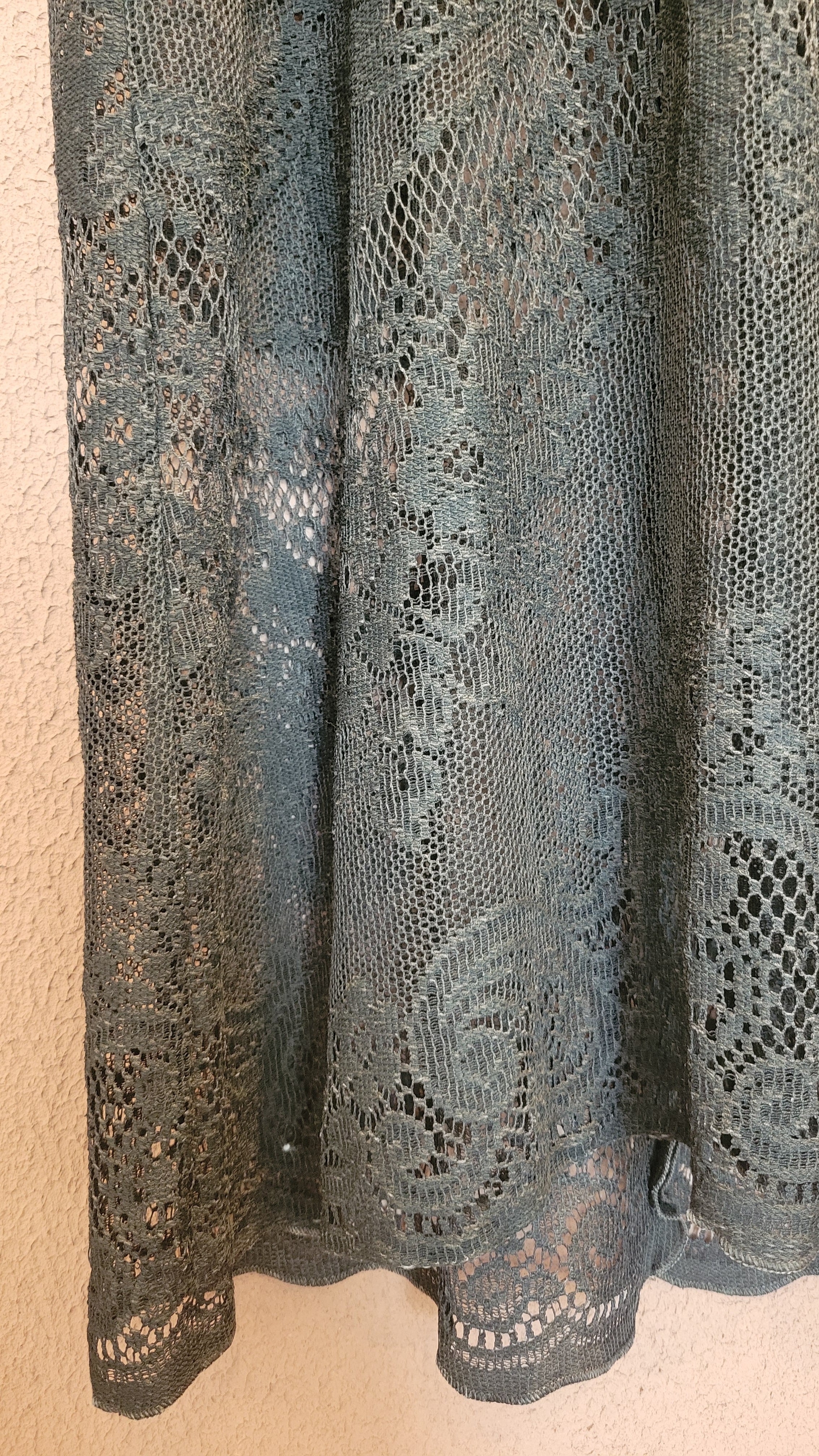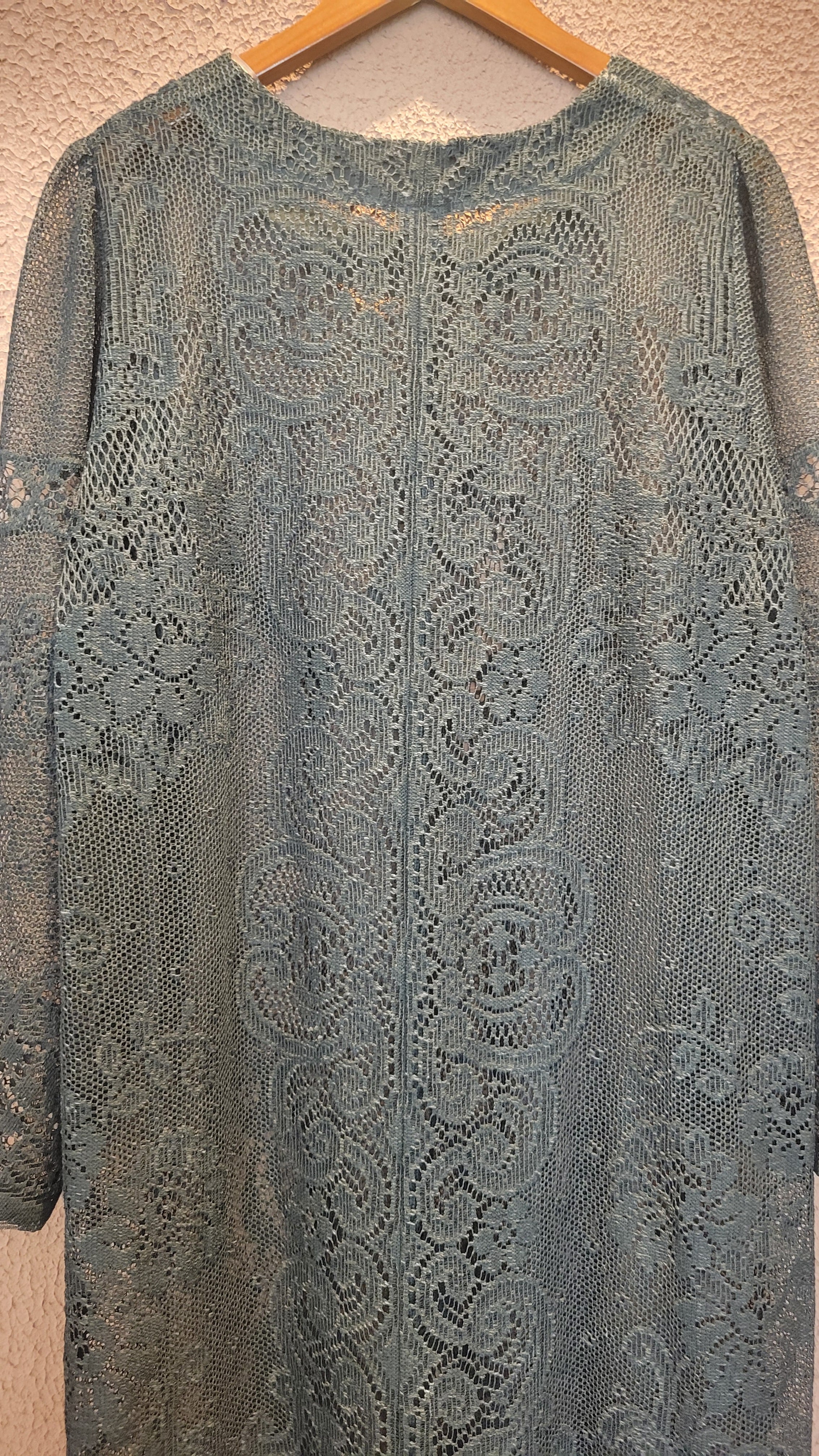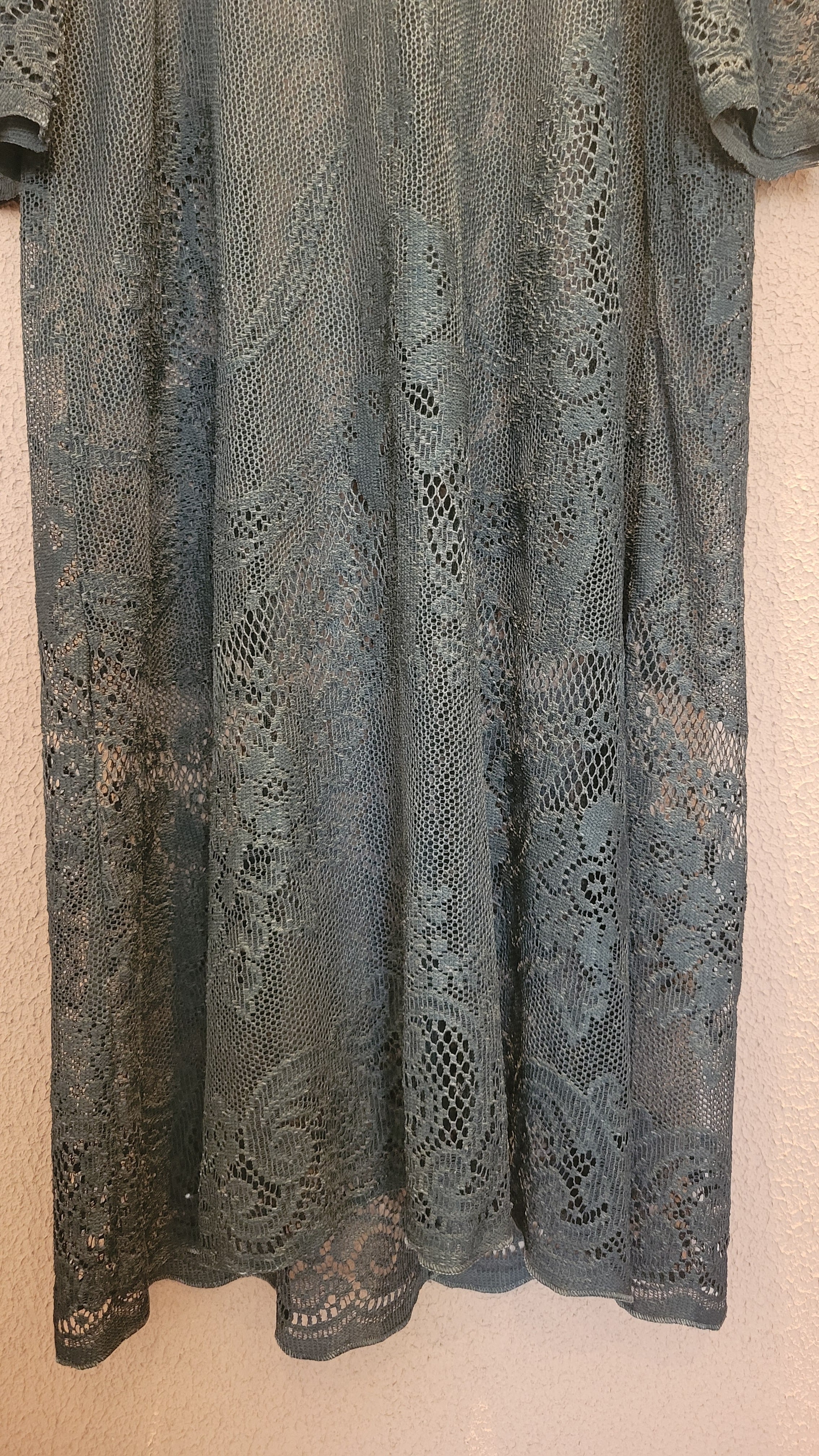 ヴィンテージのホワイトレースをブラックに後染めしたリメイクワンピース。染めは無農薬、無科学肥料で栽培された琉球藍を使用し、藍染→柿渋染→鉄媒染という複数の行程を経て丁寧に染め上げています。ボタンやファスナーは付いておらず頭から被るようにして着用するプルオーバータイプ。すとんと落ちるシルエットが縦ラインを際立たせすっきり見せてくれます。
