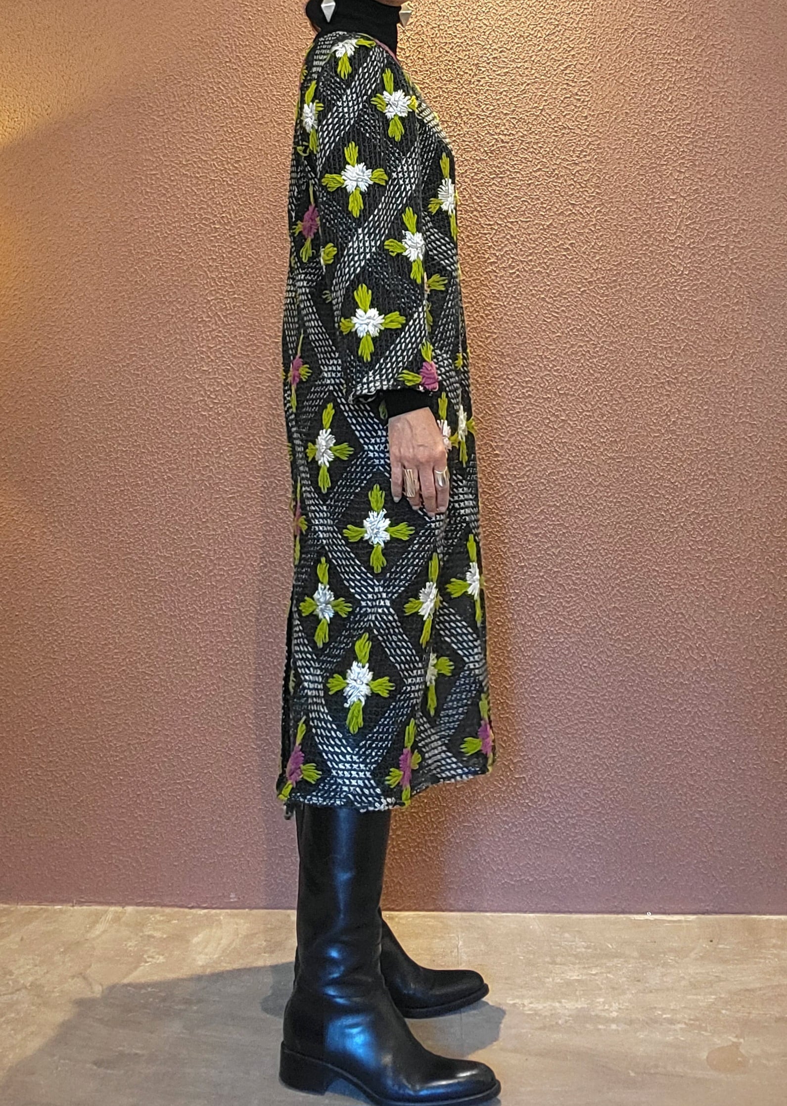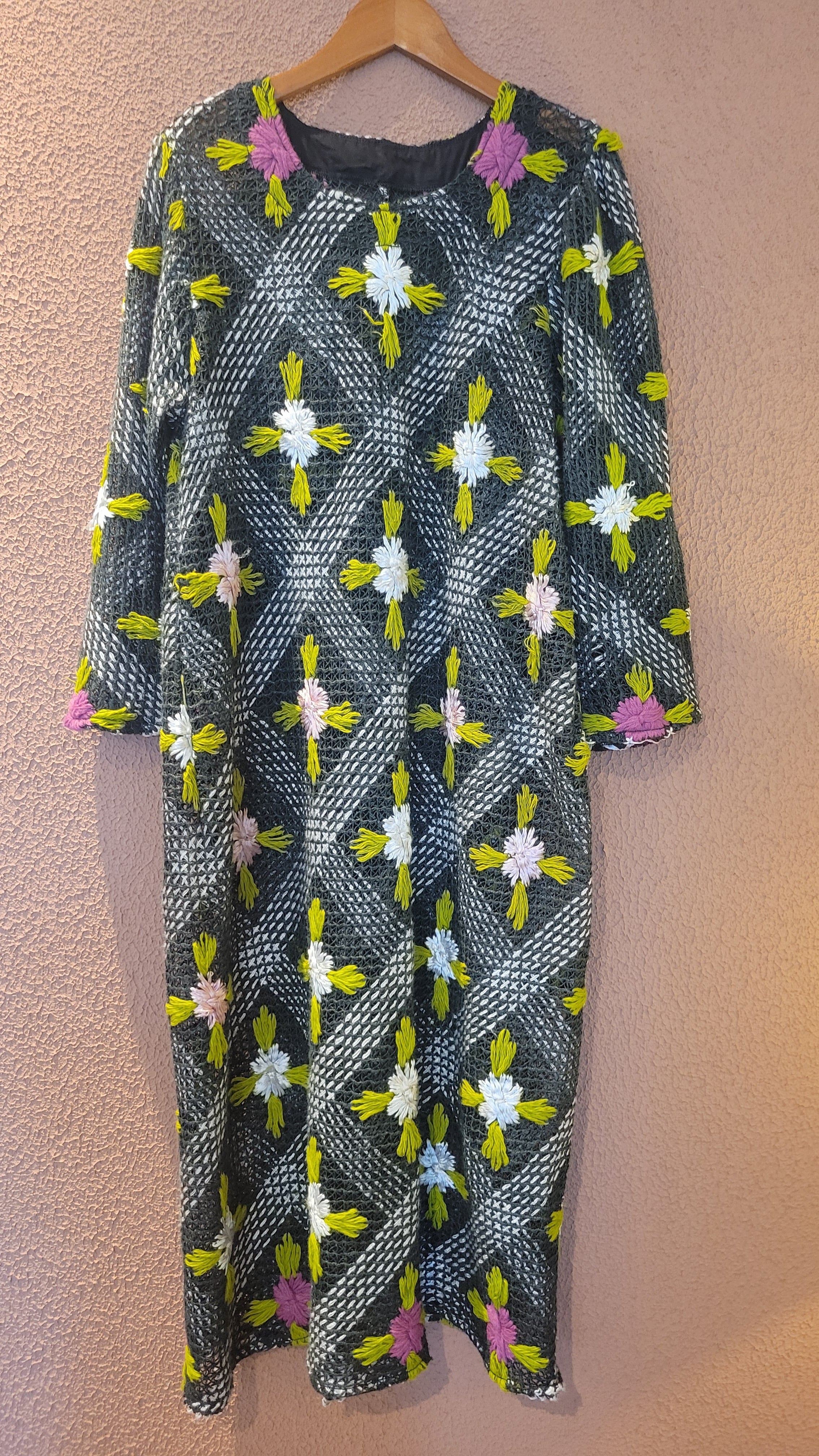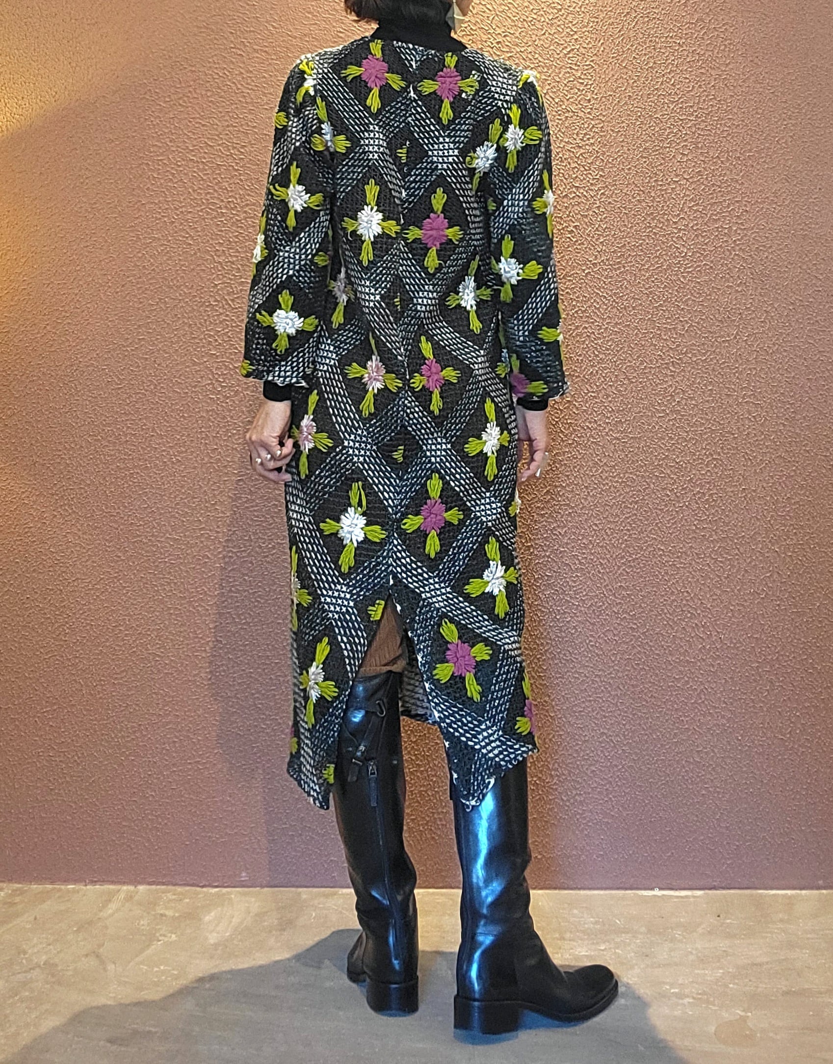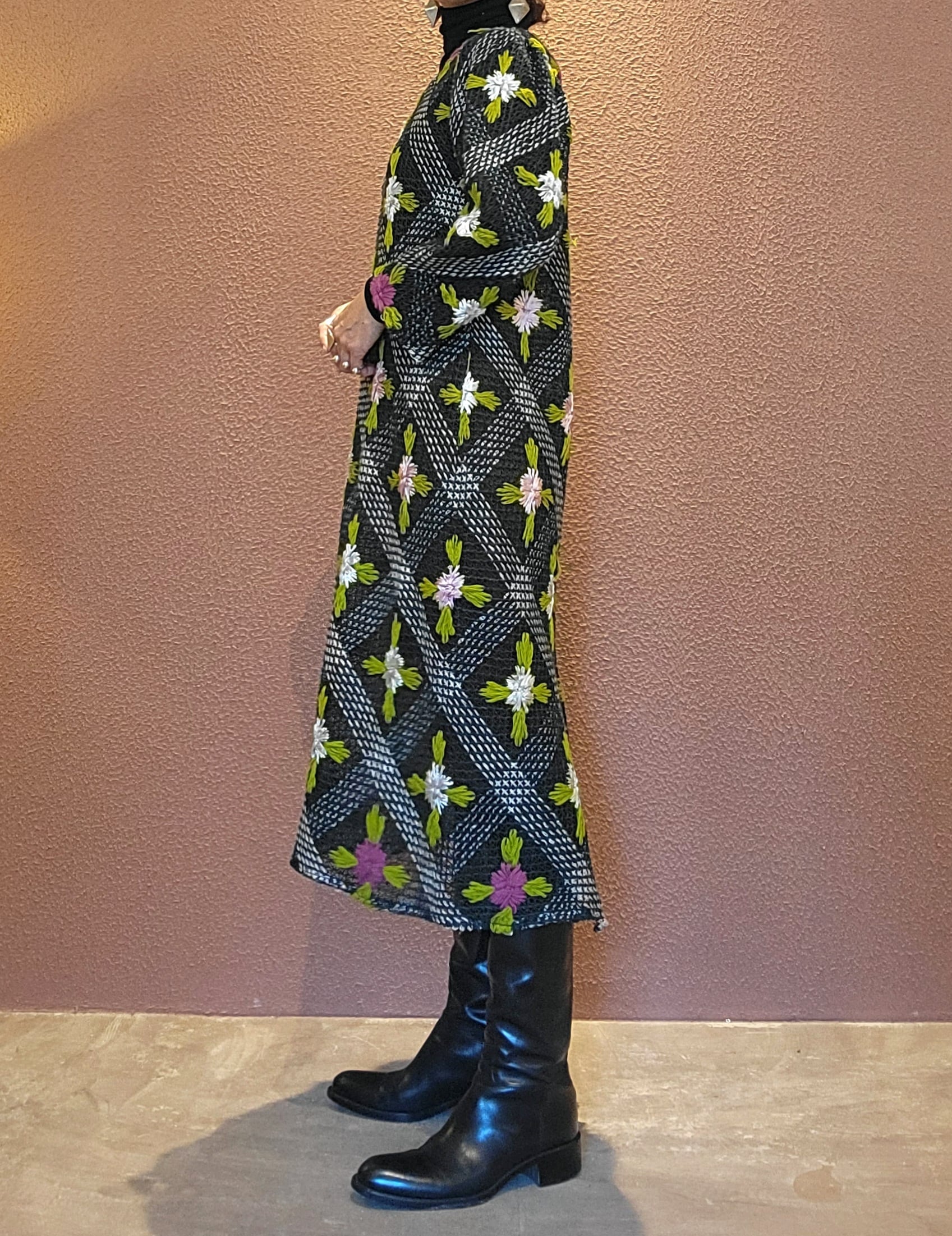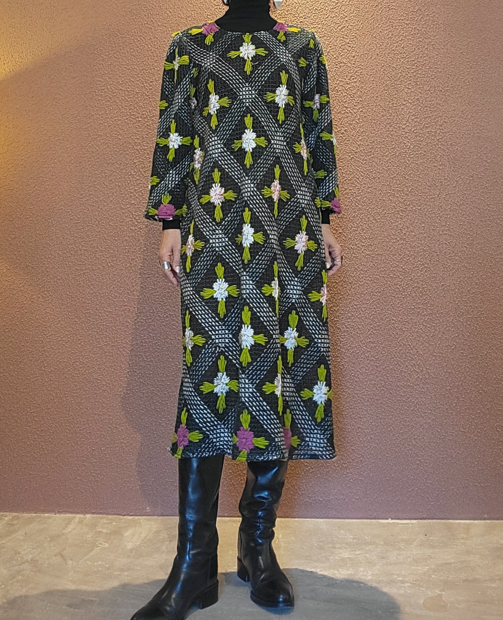 ヴィンテージのカラークロシェ生地を使用したリメイクワンピース。黒地にカラフルで立体的なお花刺繍が目を引きます。ボタンやファスナーは付いておらず頭から被るようにして着用するプルオーバータイプ。すとんと落ちるシルエットが縦ラインを際立たせすっきり見えます。