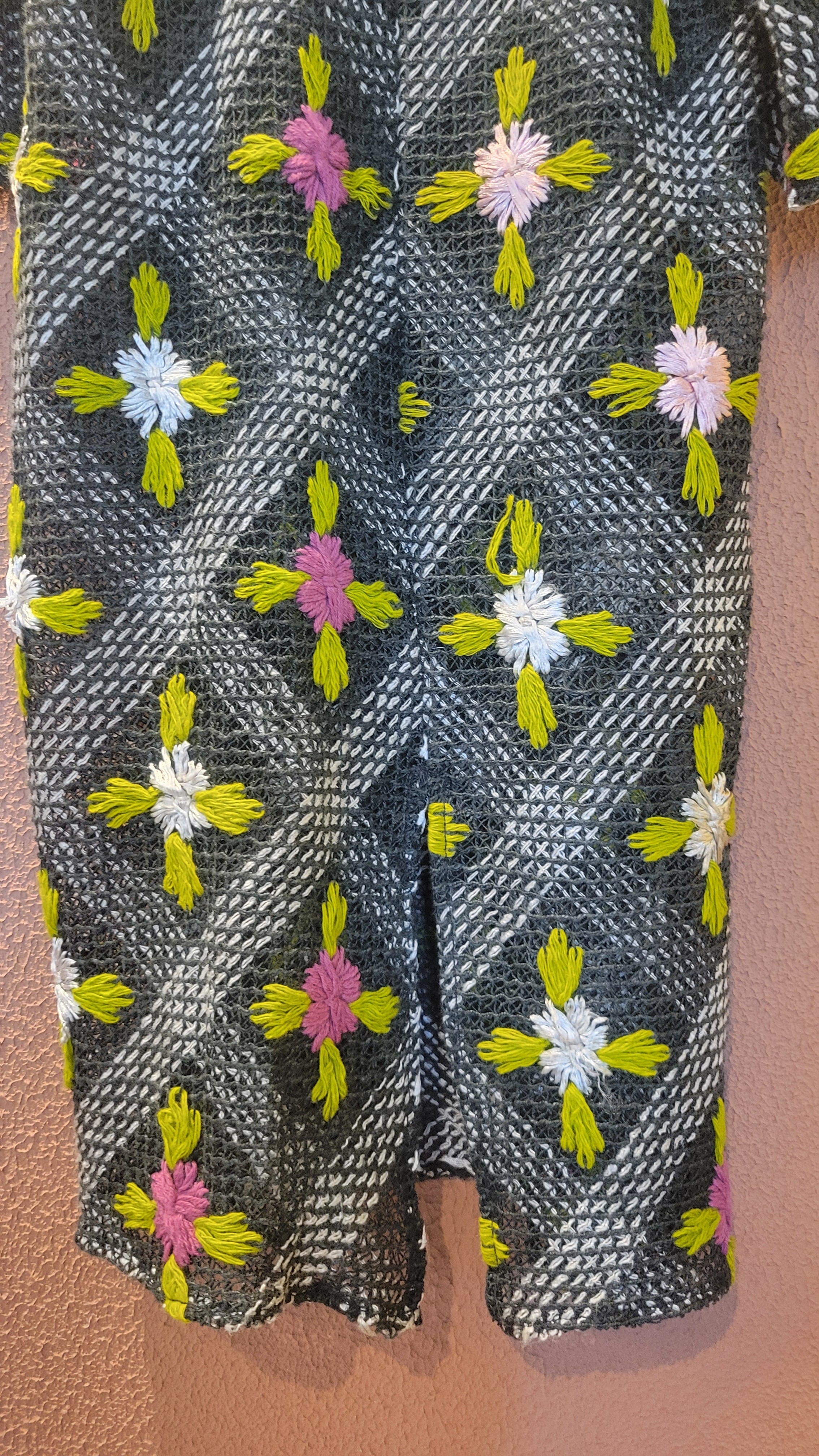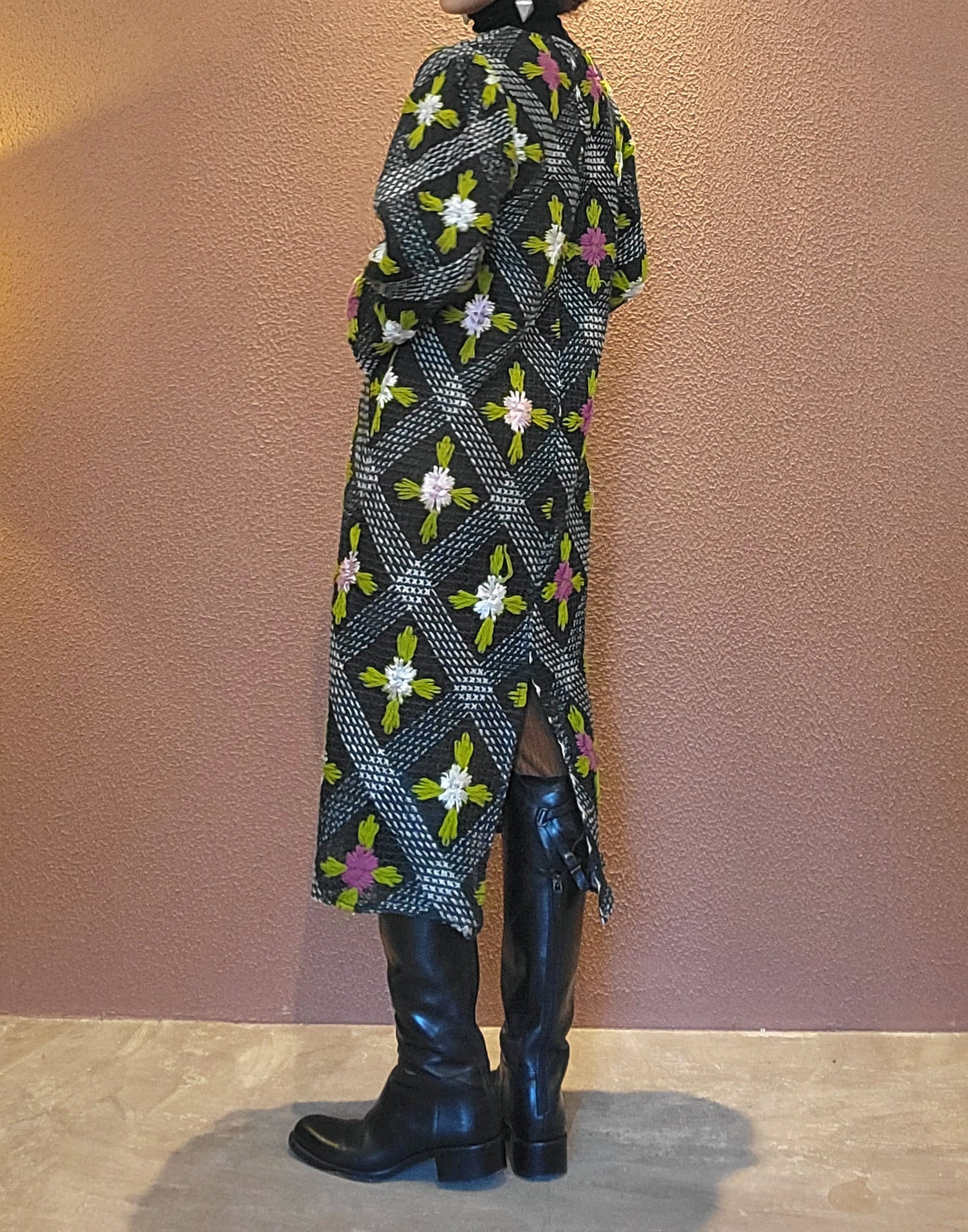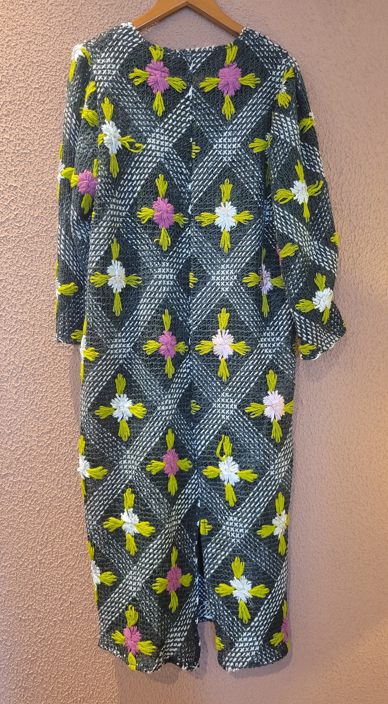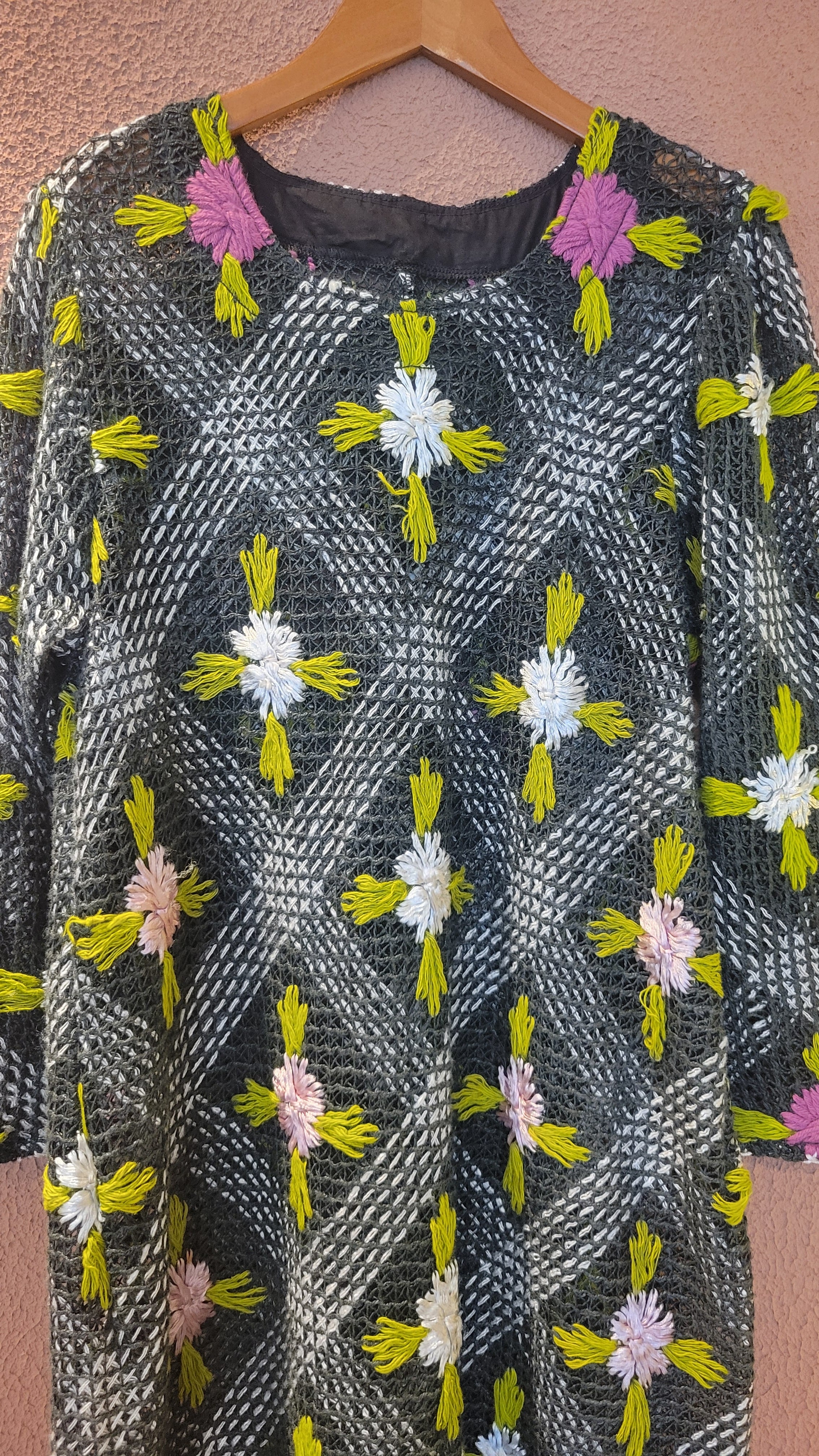 ヴィンテージのカラークロシェ生地を使用したリメイクワンピース。黒地にカラフルで立体的なお花刺繍が目を引きます。ボタンやファスナーは付いておらず頭から被るようにして着用するプルオーバータイプ。すとんと落ちるシルエットが縦ラインを際立たせすっきり見えます。