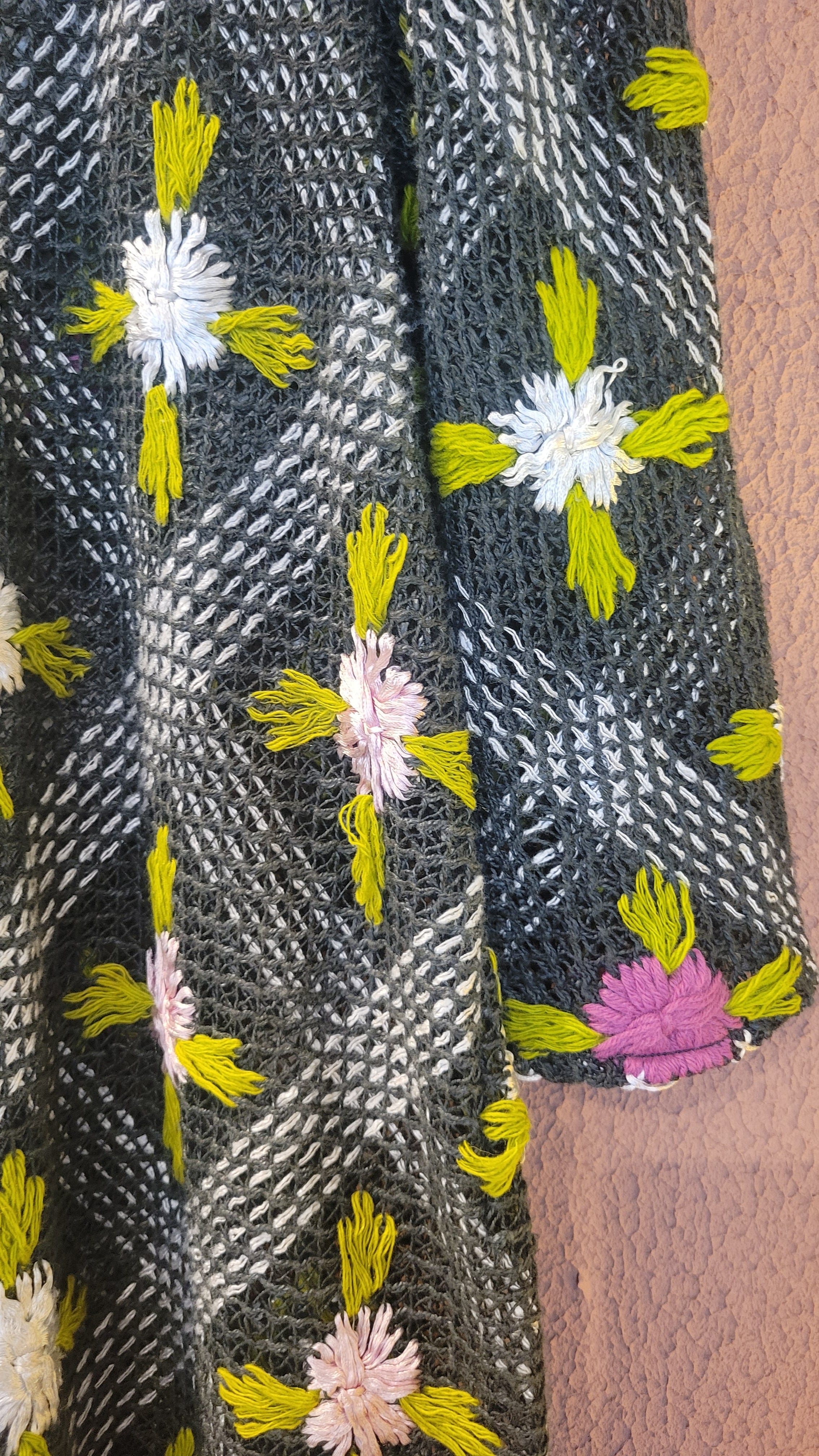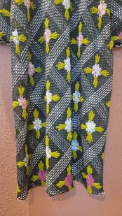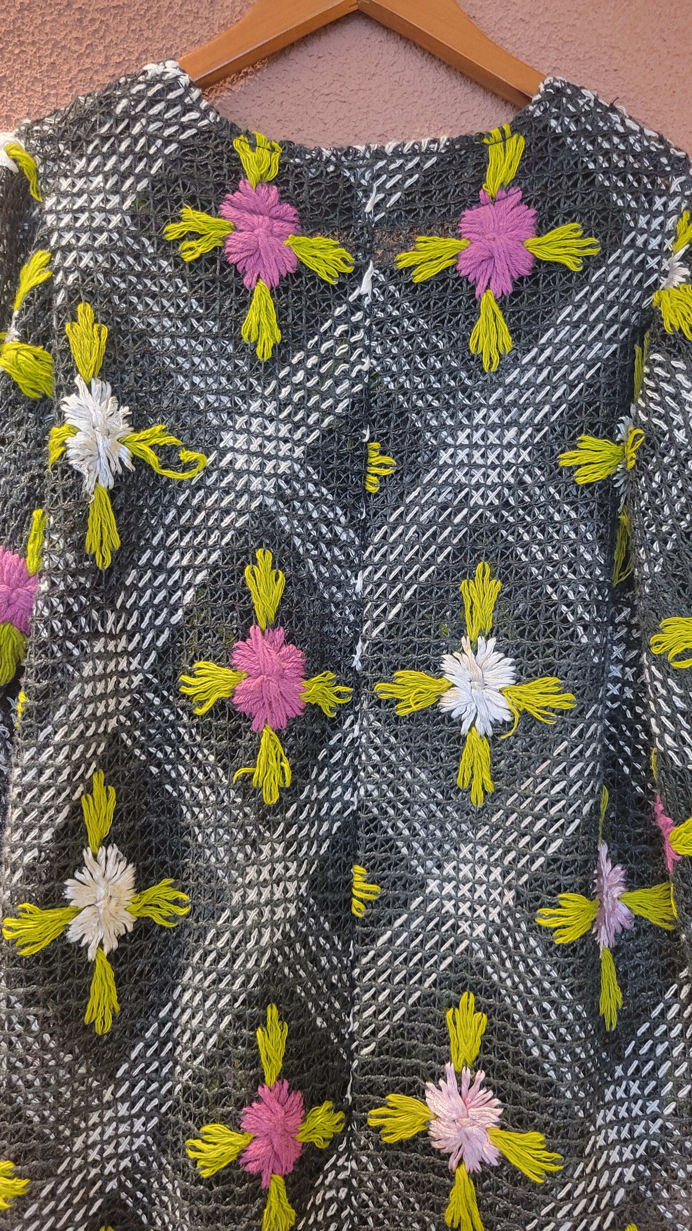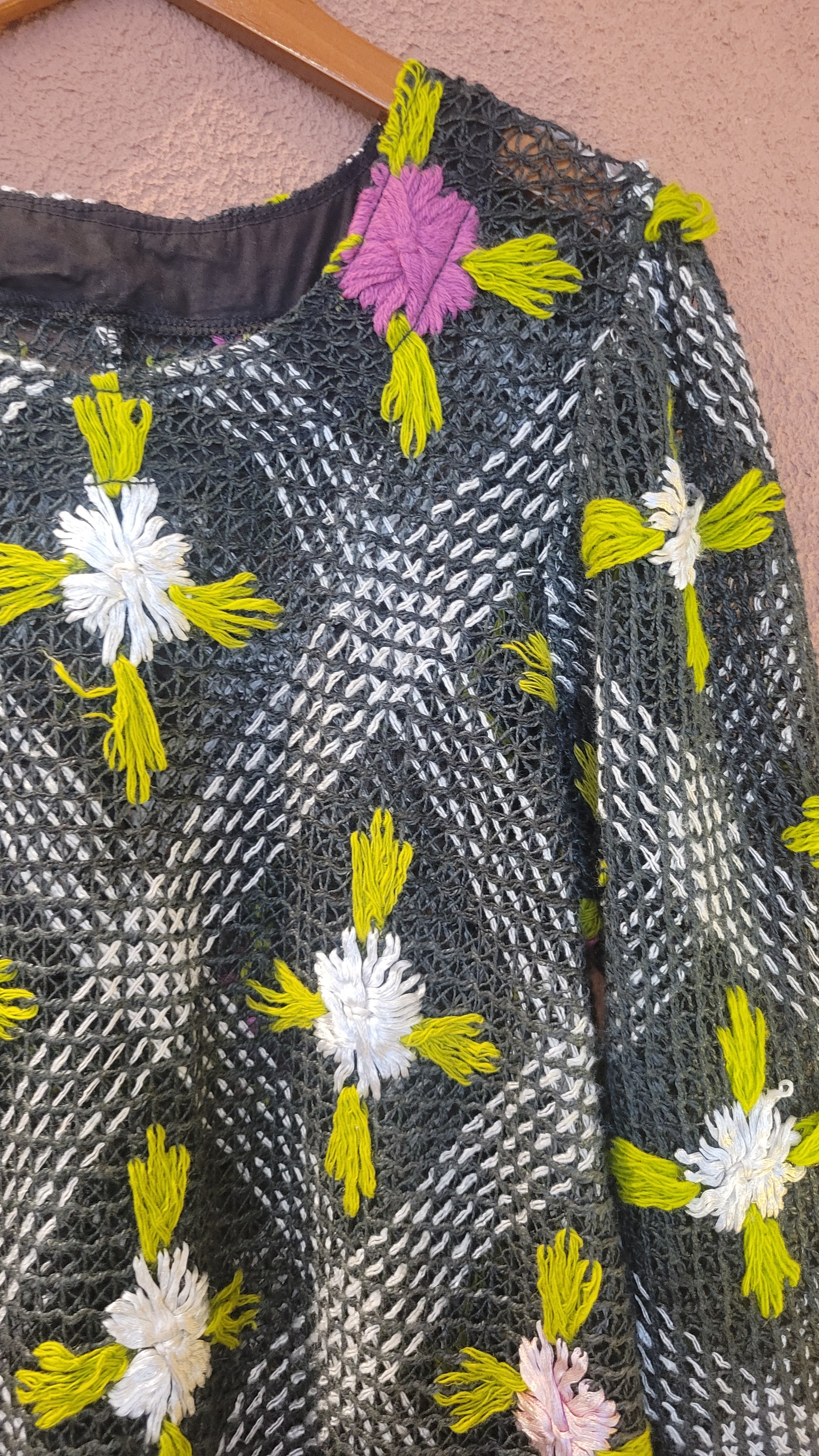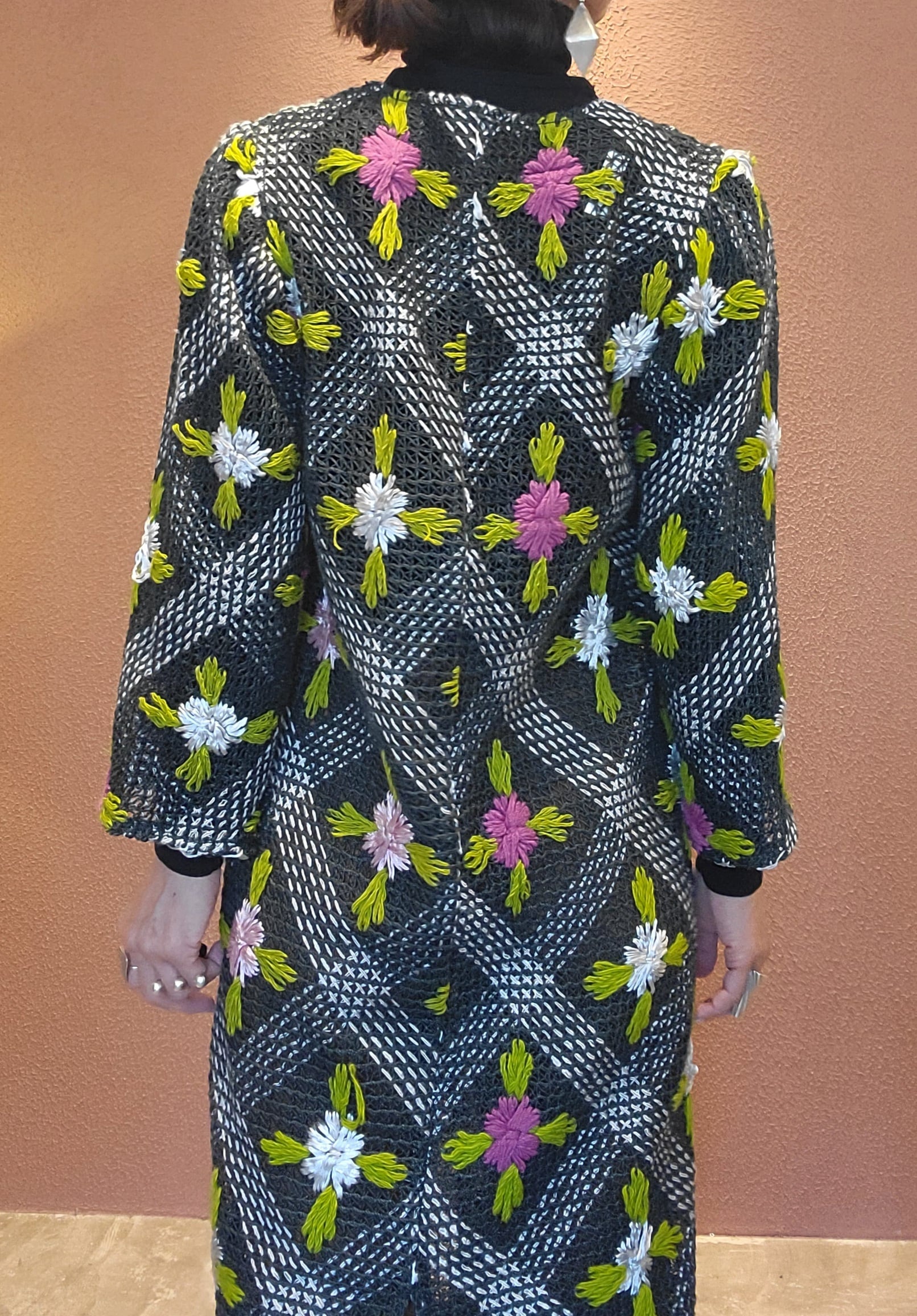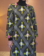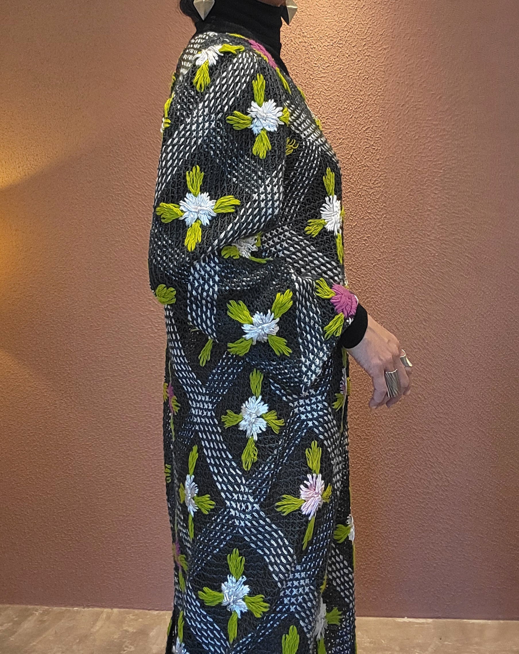 ヴィンテージのカラークロシェ生地を使用したリメイクワンピース。黒地にカラフルで立体的なお花刺繍が目を引きます。ボタンやファスナーは付いておらず頭から被るようにして着用するプルオーバータイプ。すとんと落ちるシルエットが縦ラインを際立たせすっきり見えます。