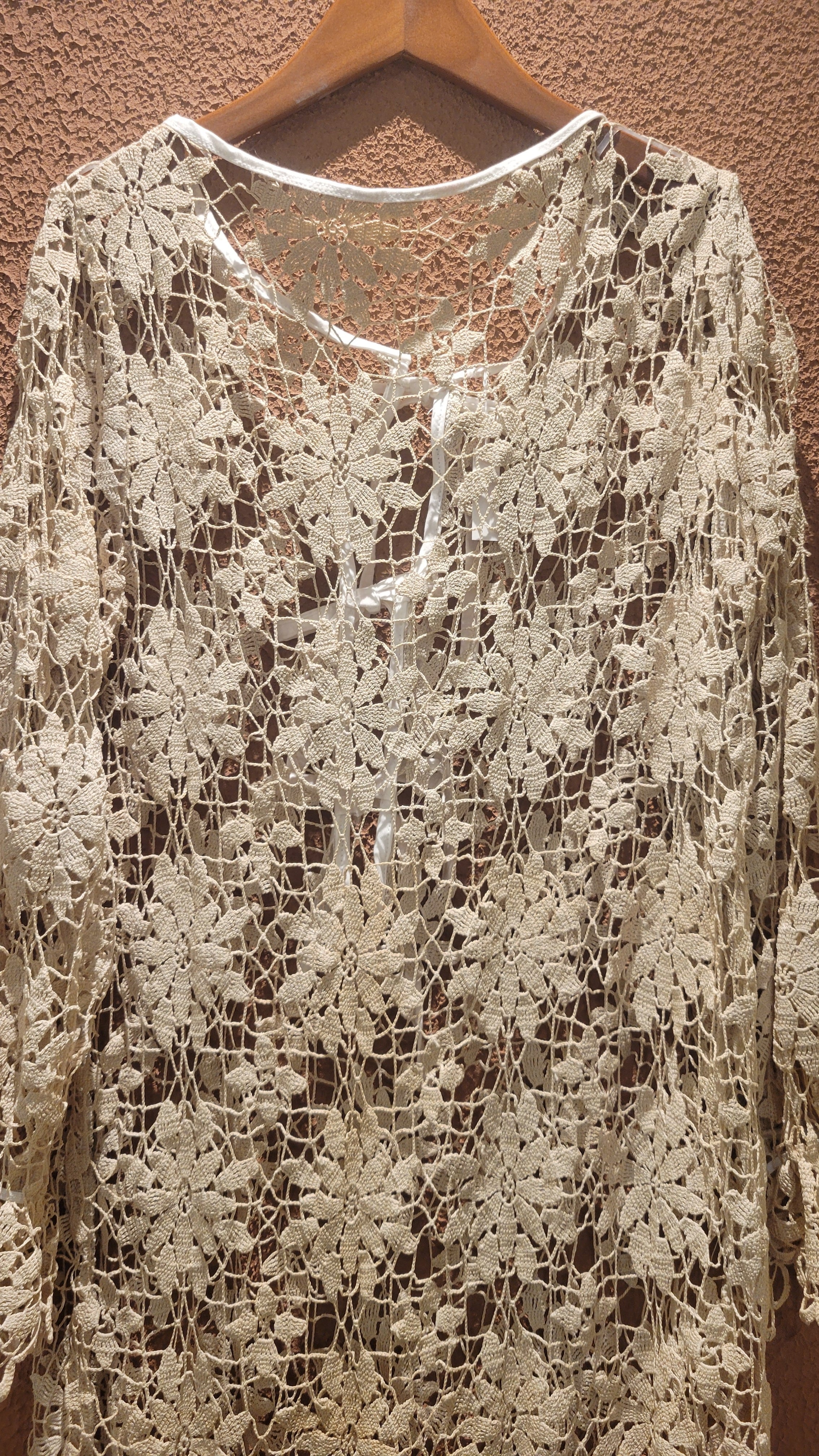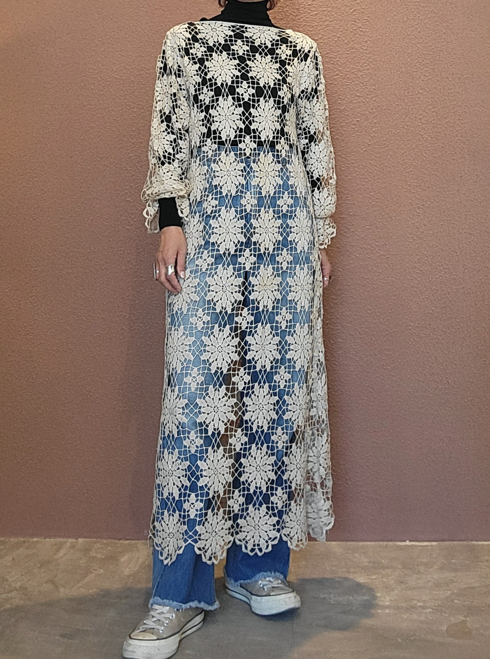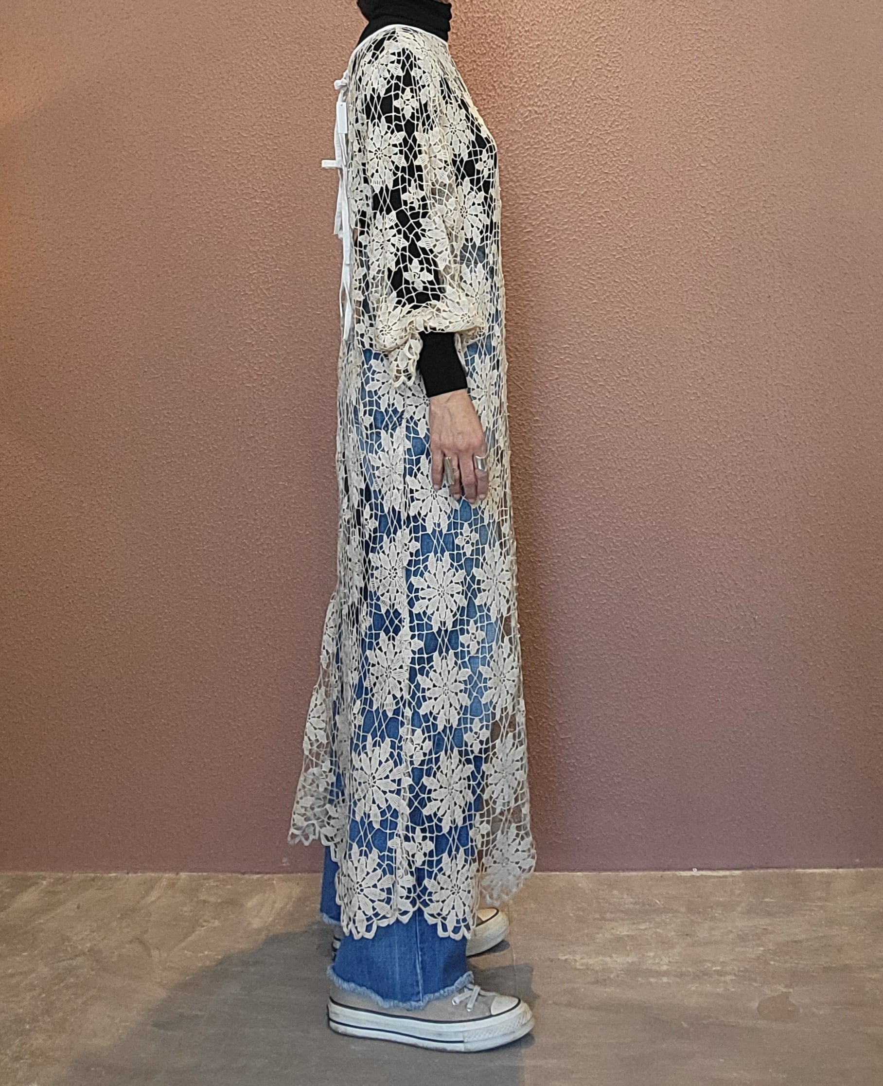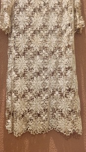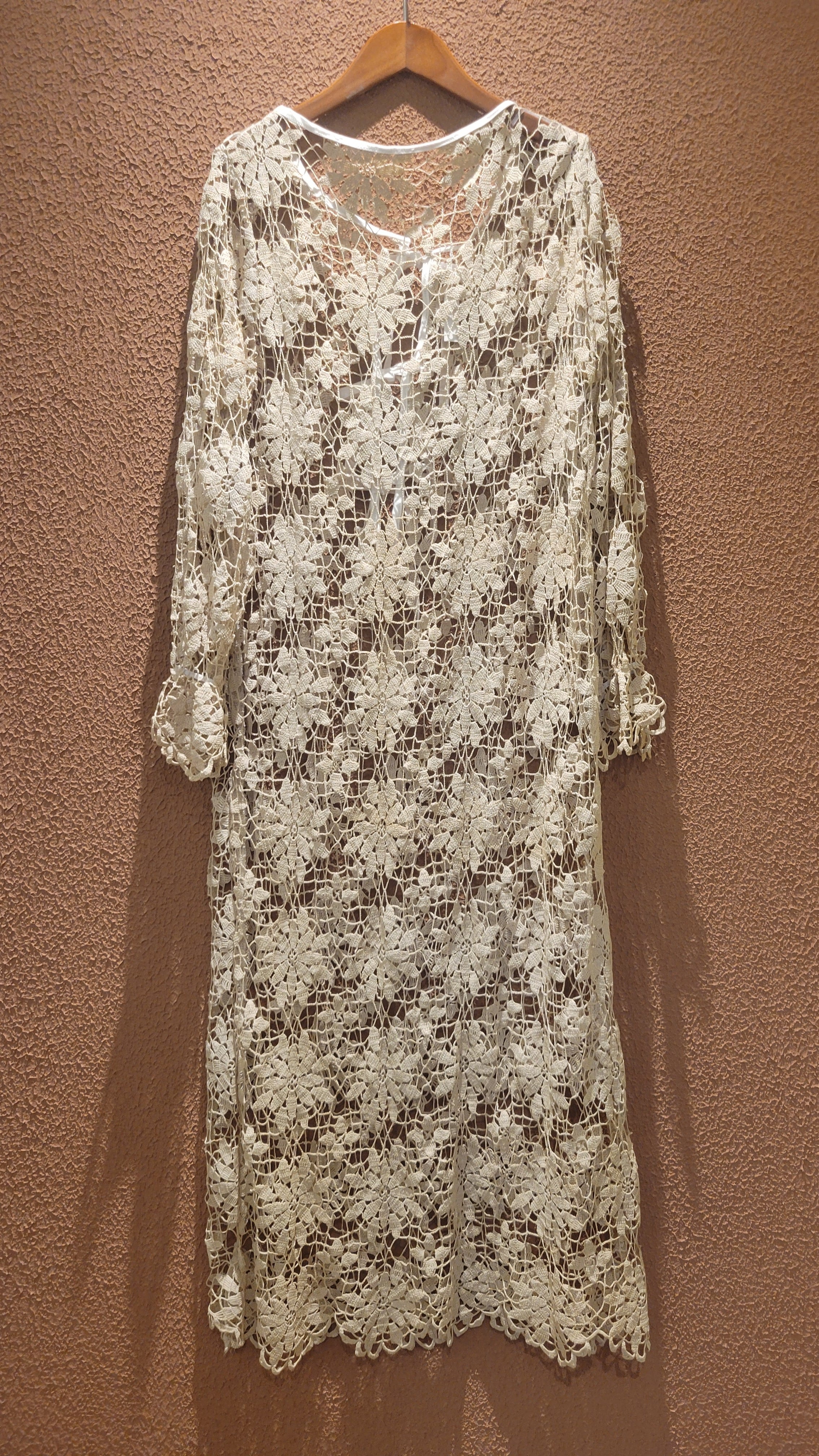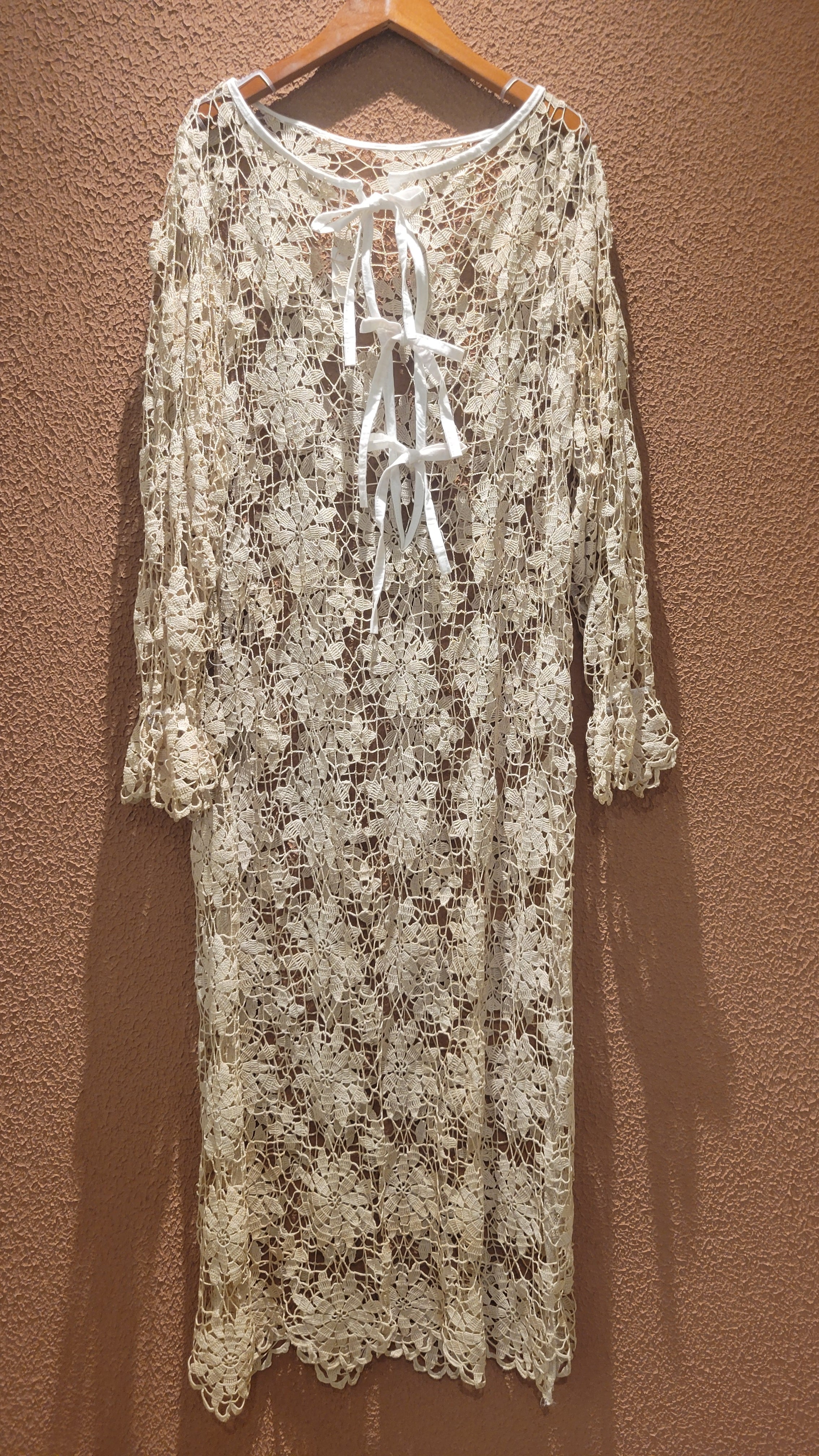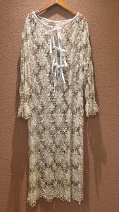 ヴィンテージのクロシェ生地を使用したリメイクワンピース。素材表記はありませんがコットンのようです。薄手の繊細なクロシェ編みで軽量です。ファスナー等は付いておらず頭から被るようにして着用するプルオーバータイプです。カフスにゴム入りです。前後どちらでも着用可能な2wayです。秋冬はインナーにリブタートルニット等を合わせて。