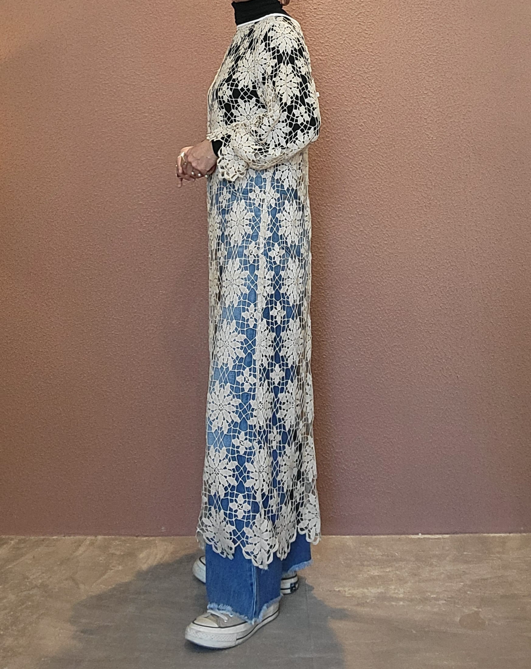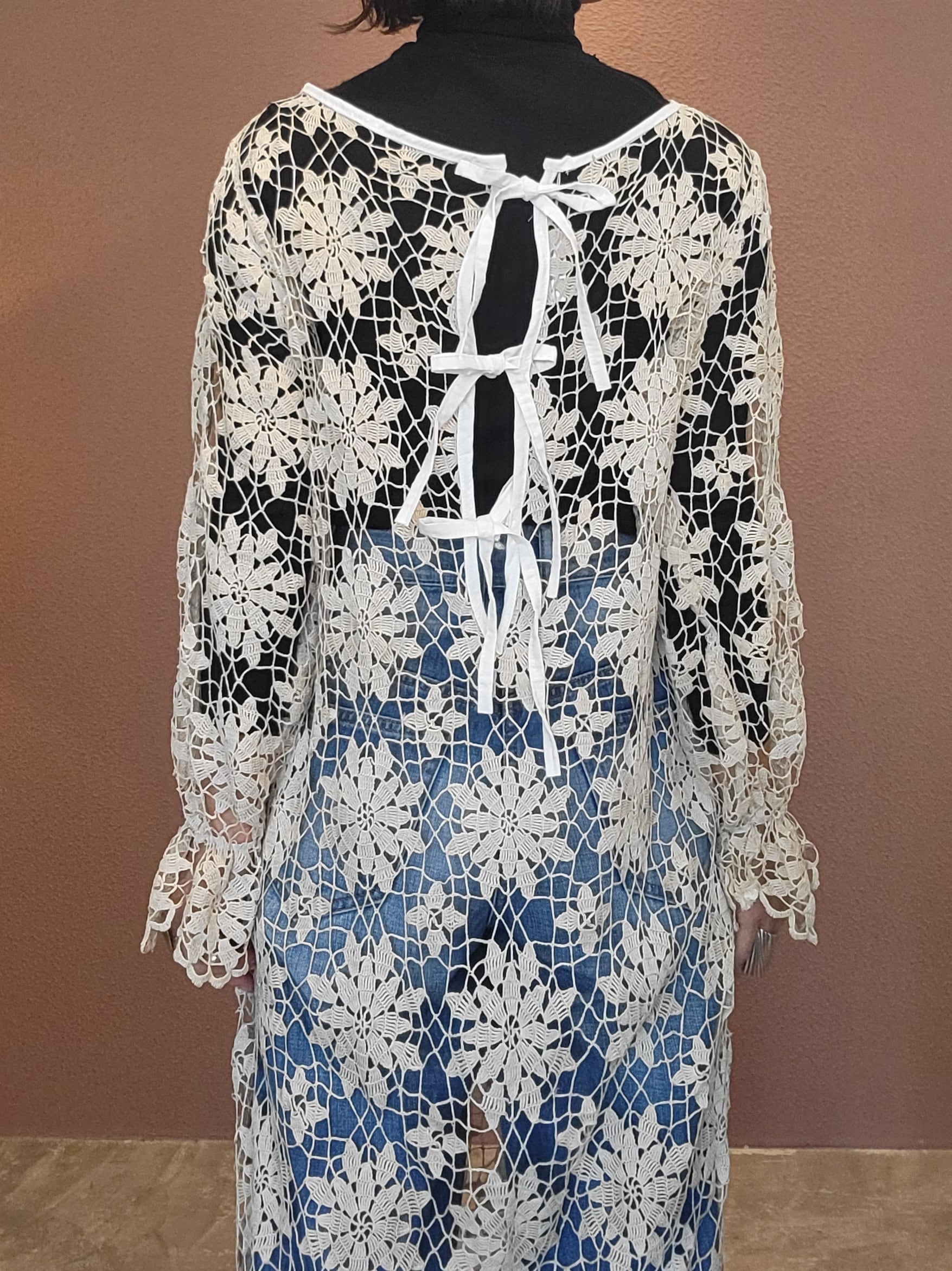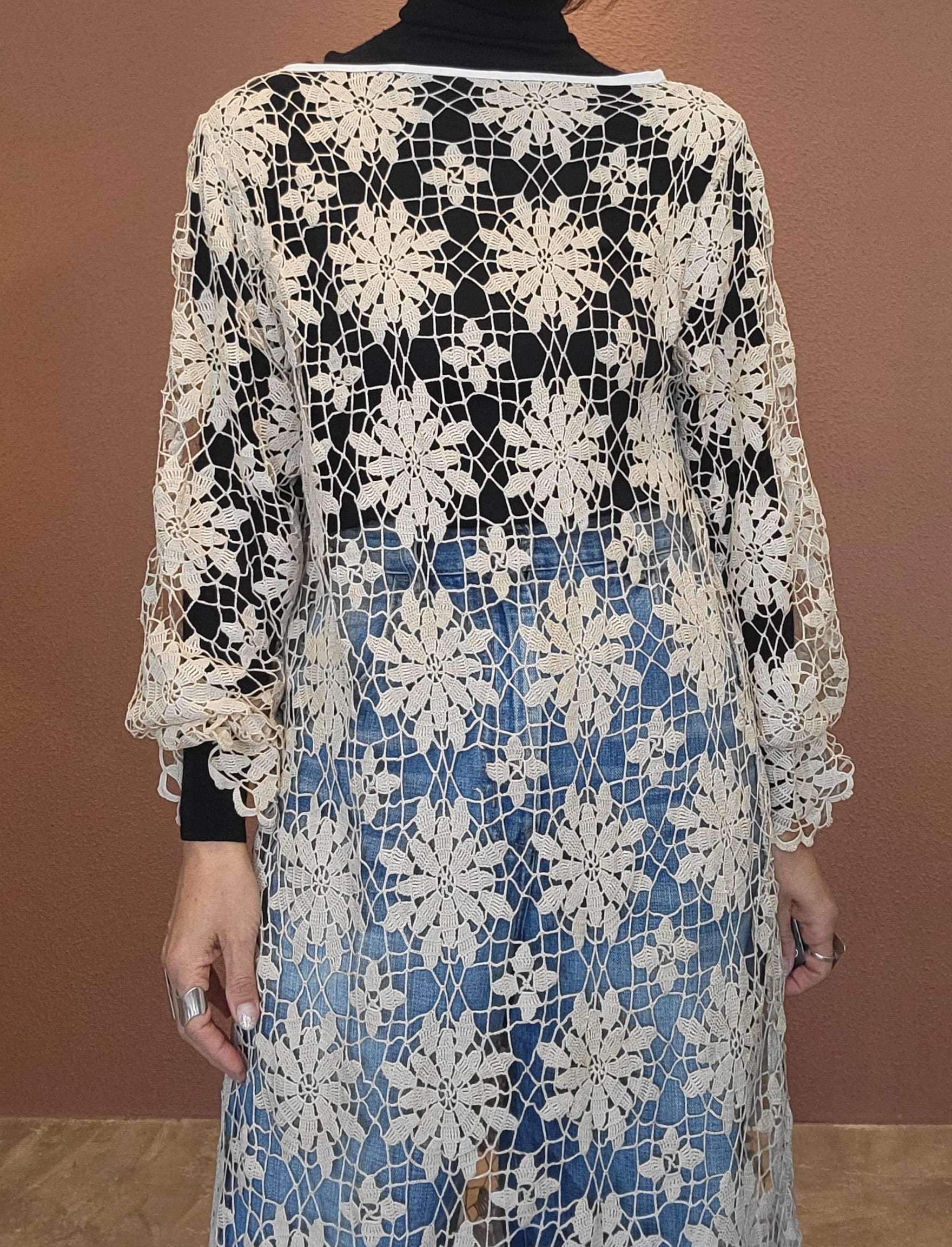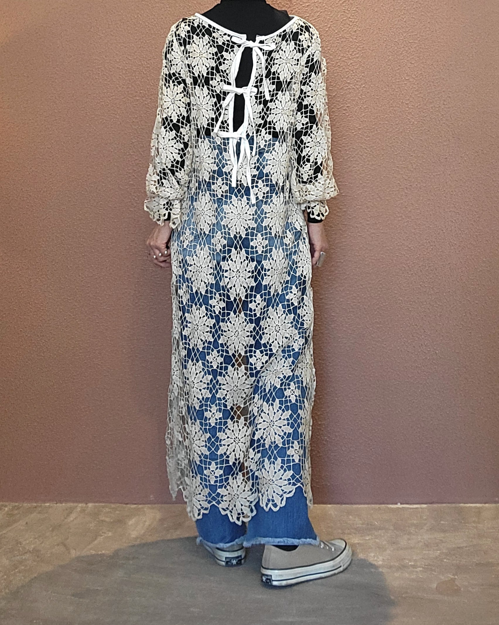 ヴィンテージのクロシェ生地を使用したリメイクワンピース。素材表記はありませんがコットンのようです。薄手の繊細なクロシェ編みで軽量です。ファスナー等は付いておらず頭から被るようにして着用するプルオーバータイプです。カフスにゴム入りです。前後どちらでも着用可能な2wayです。秋冬はインナーにリブタートルニット等を合わせて。