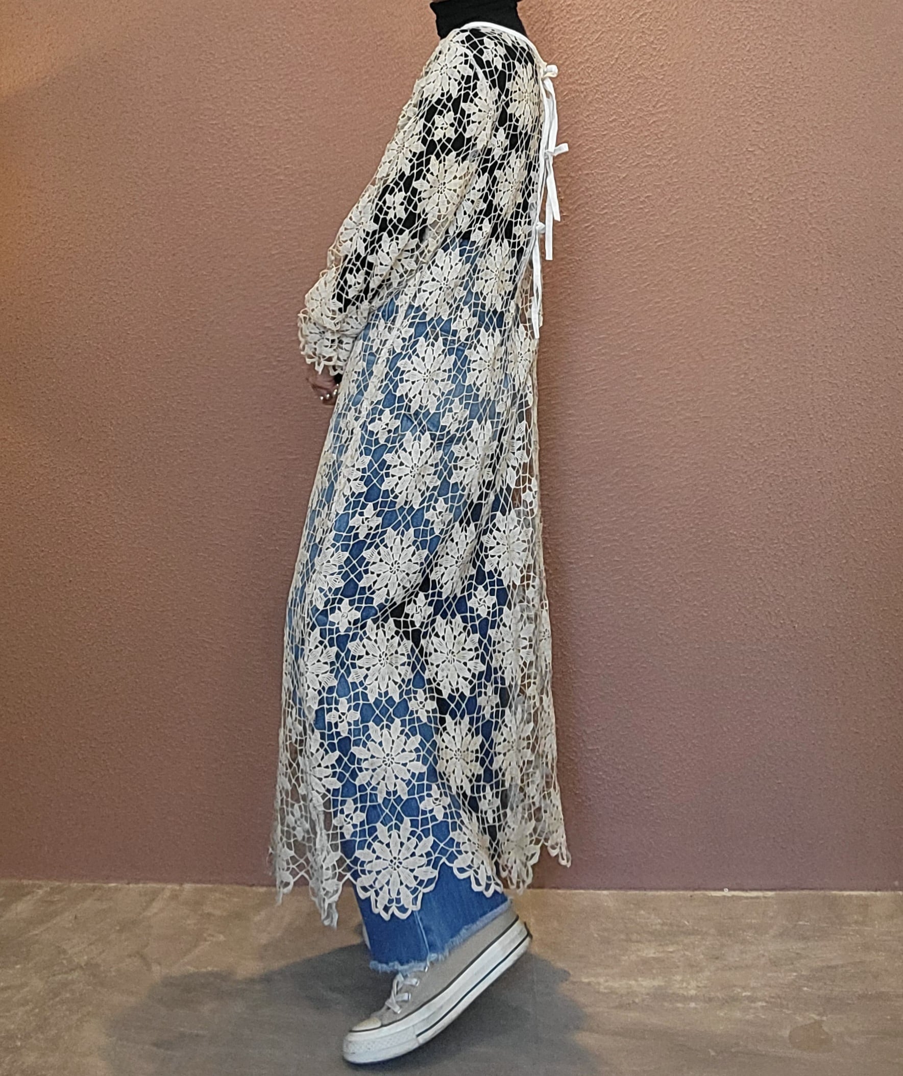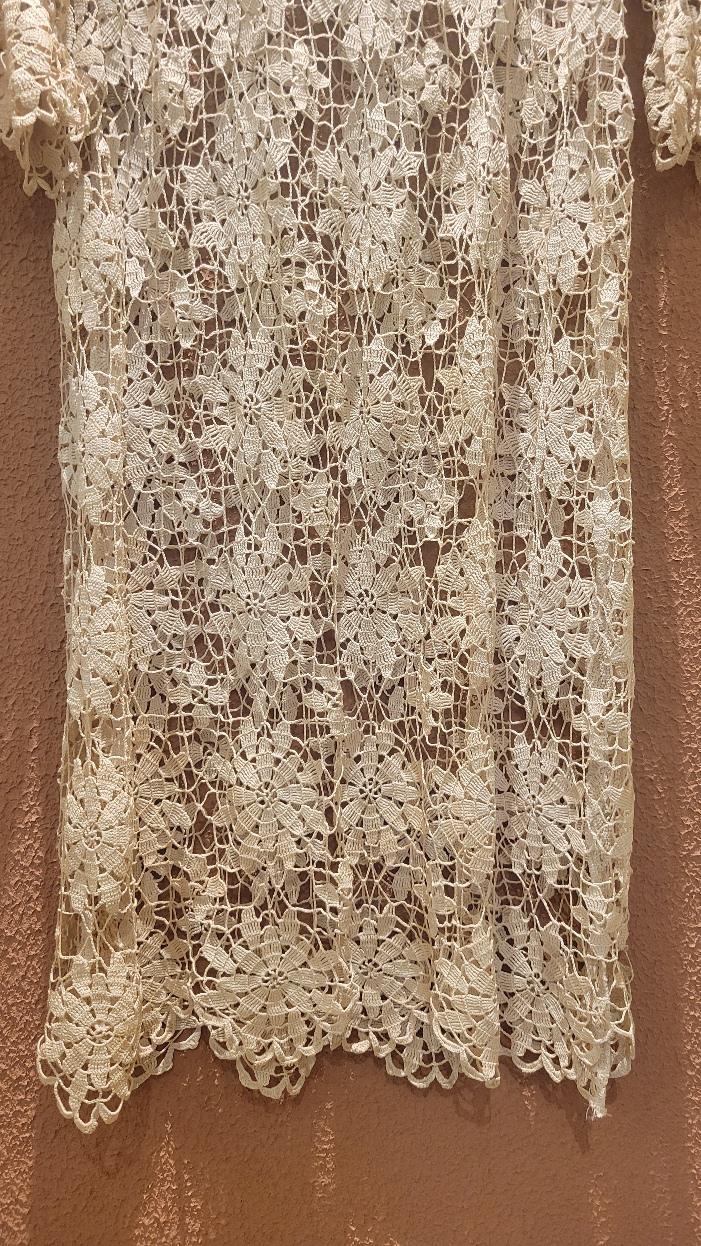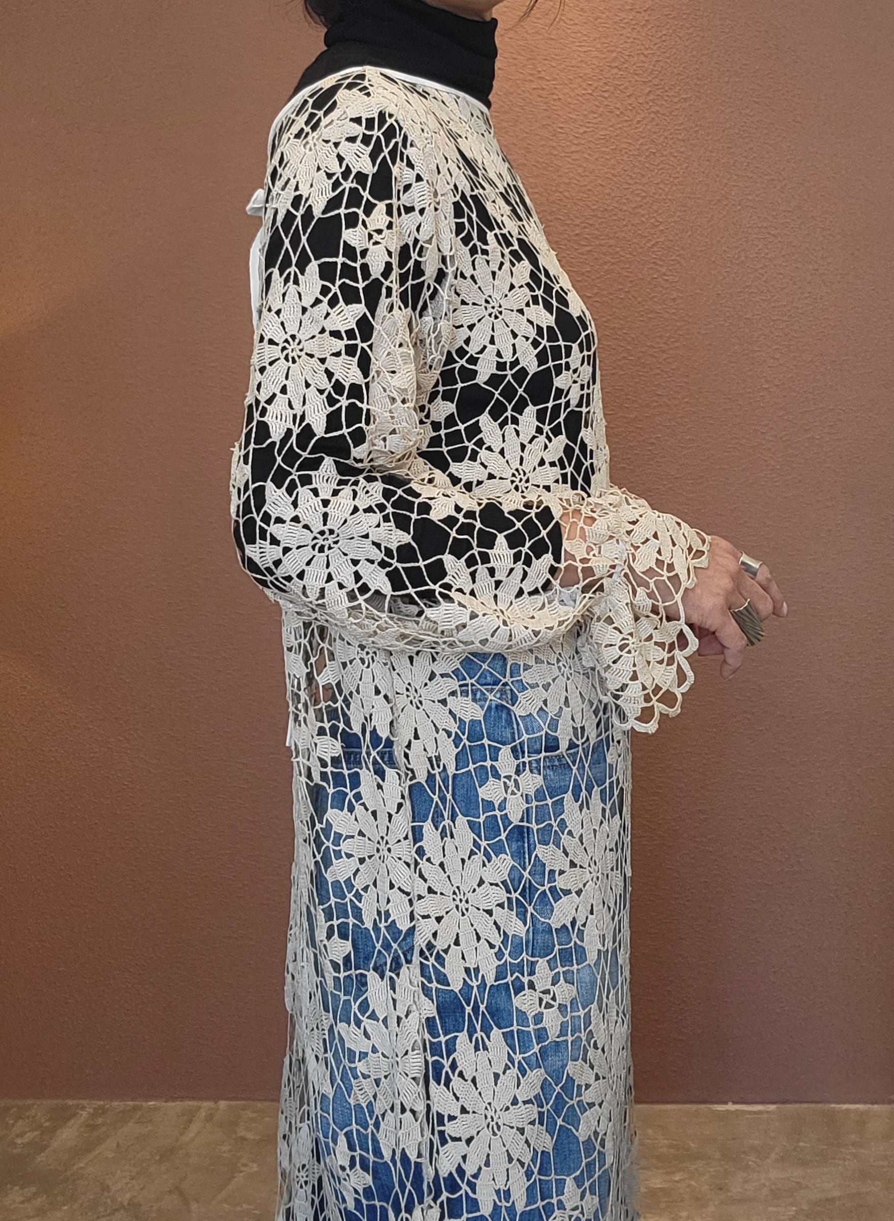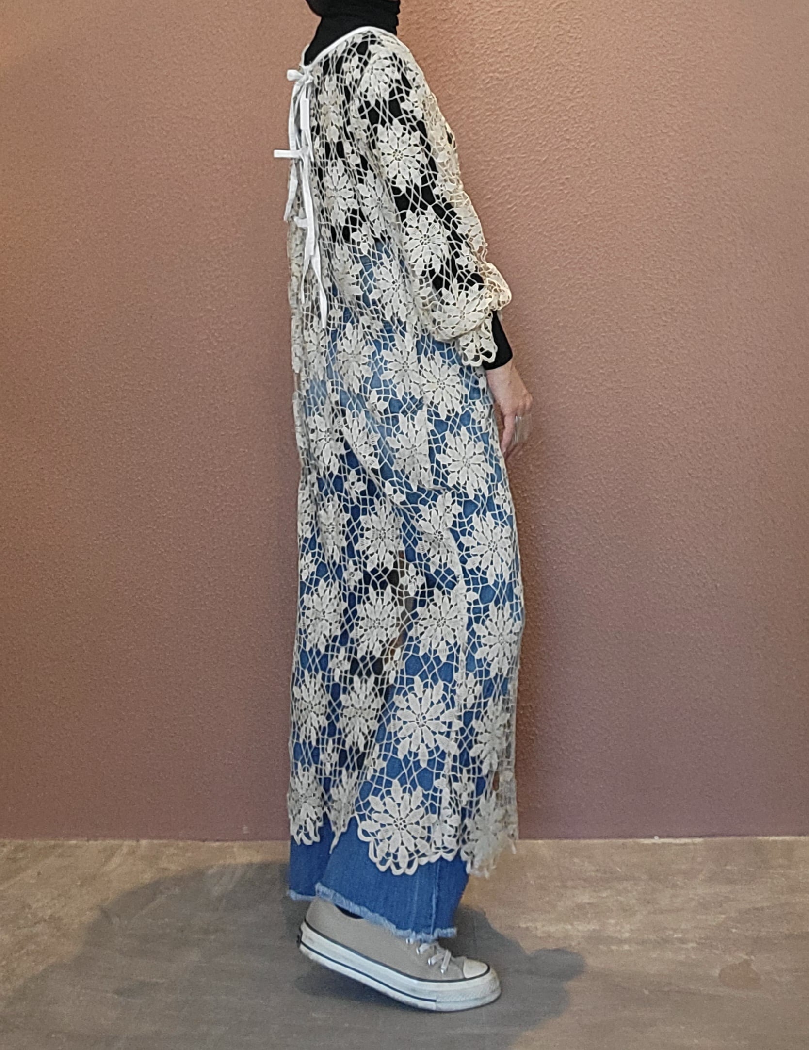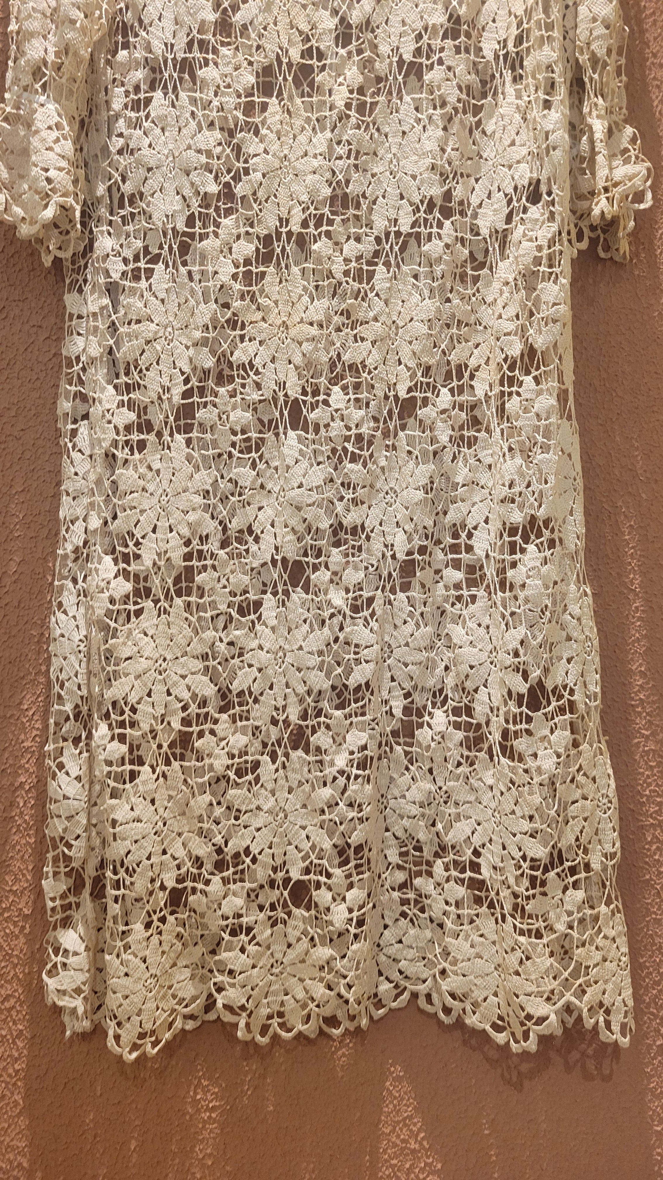ヴィンテージのクロシェ生地を使用したリメイクワンピース。素材表記はありませんがコットンのようです。薄手の繊細なクロシェ編みで軽量です。ファスナー等は付いておらず頭から被るようにして着用するプルオーバータイプです。カフスにゴム入りです。前後どちらでも着用可能な2wayです。秋冬はインナーにリブタートルニット等を合わせて。