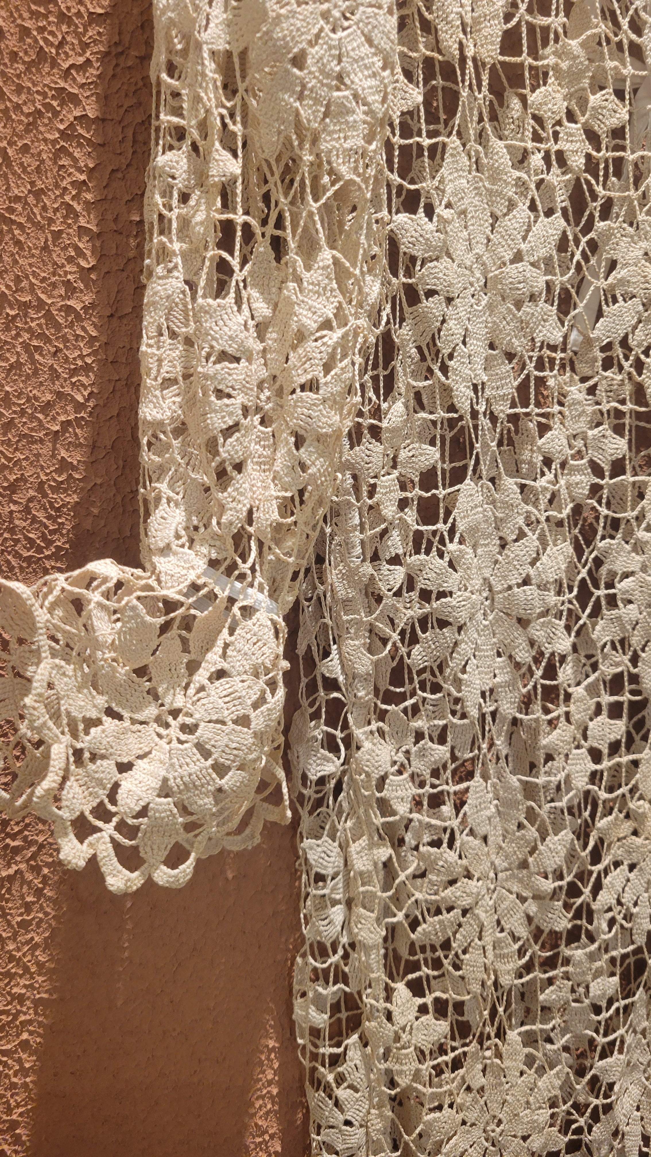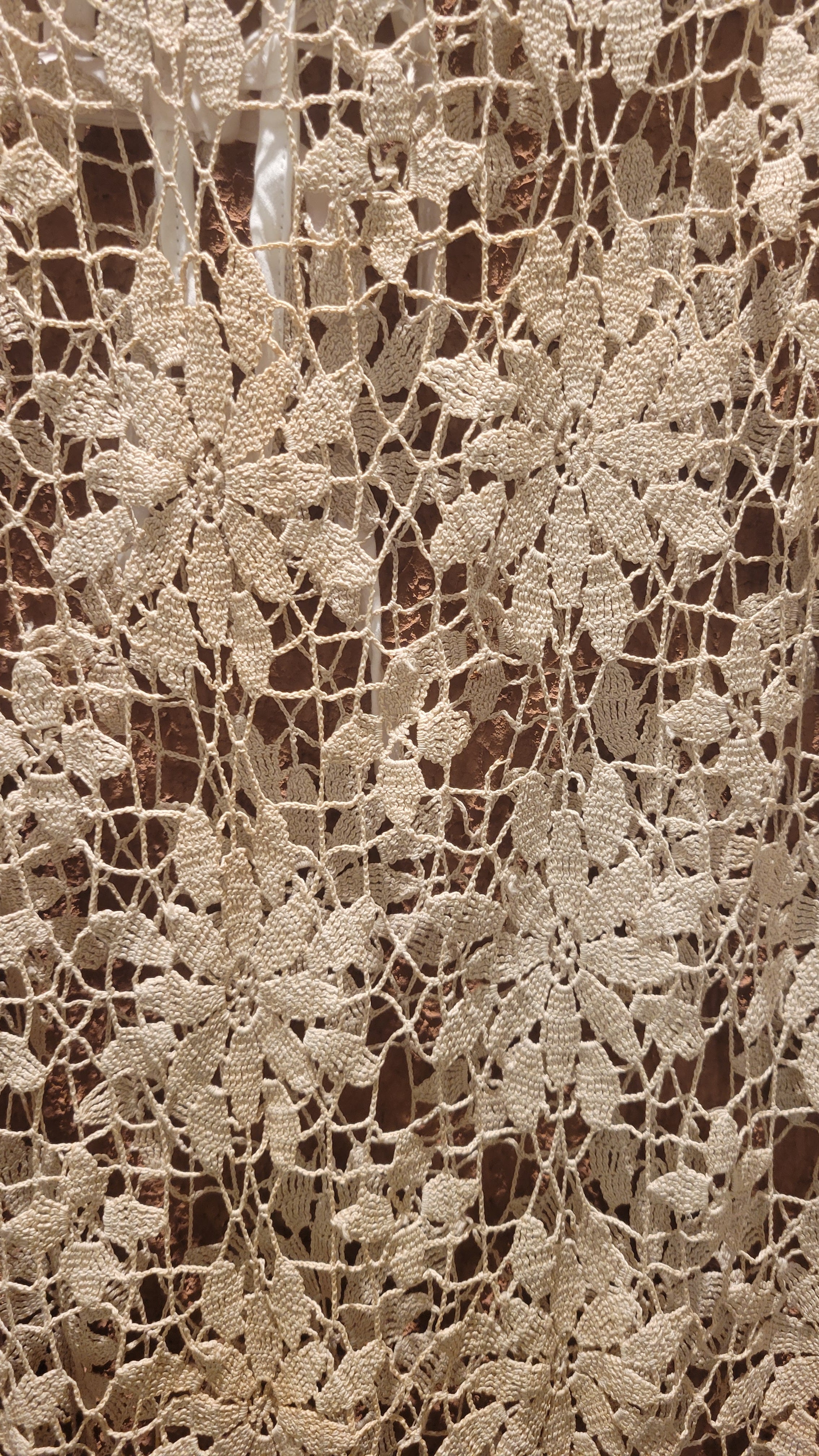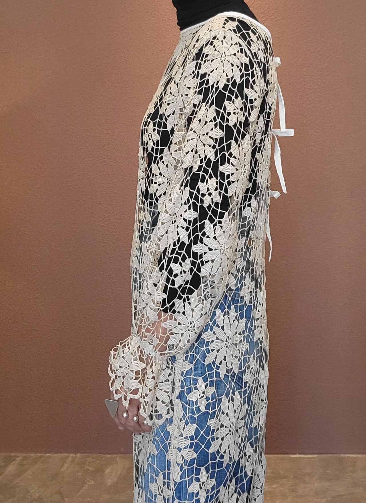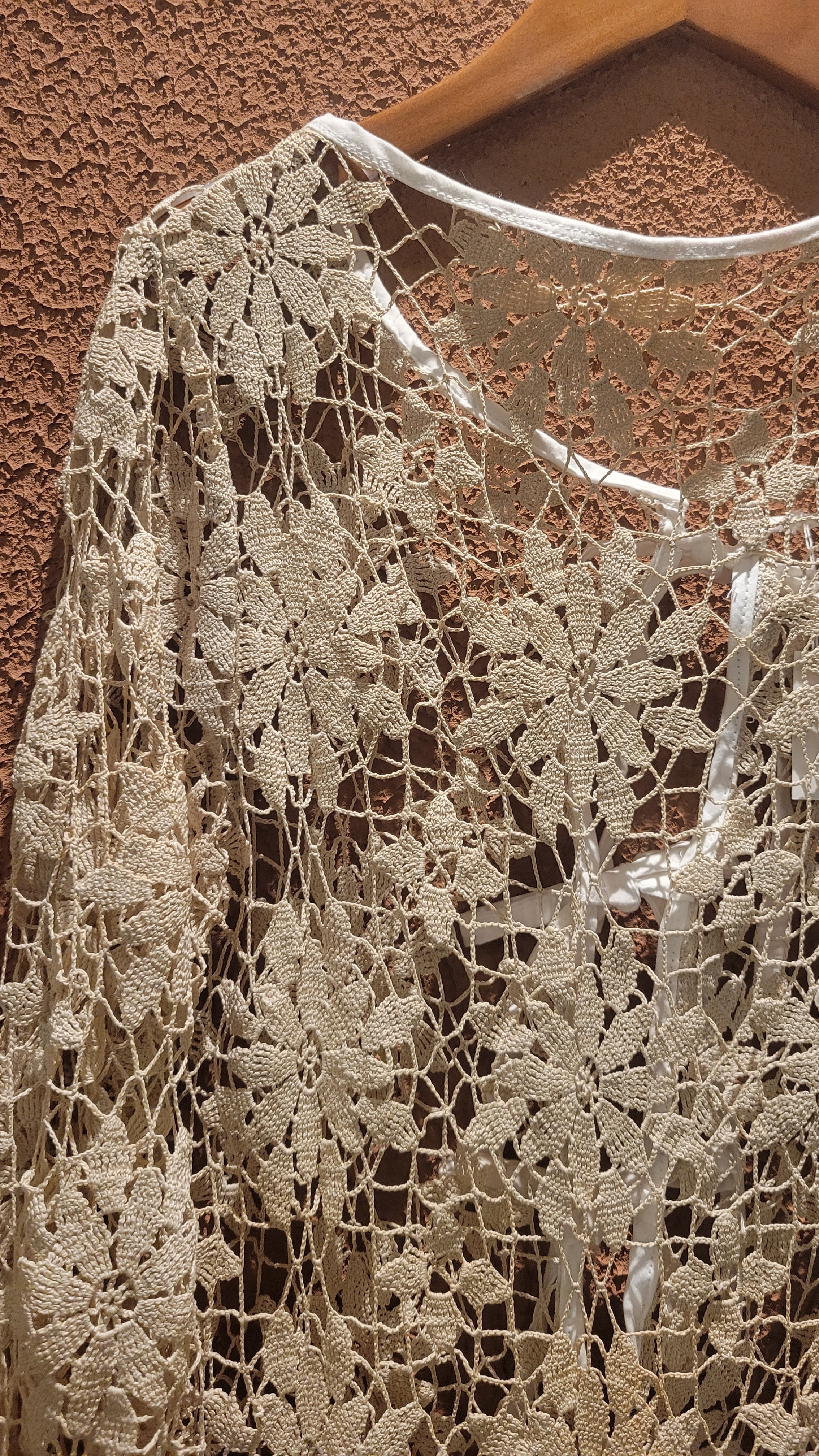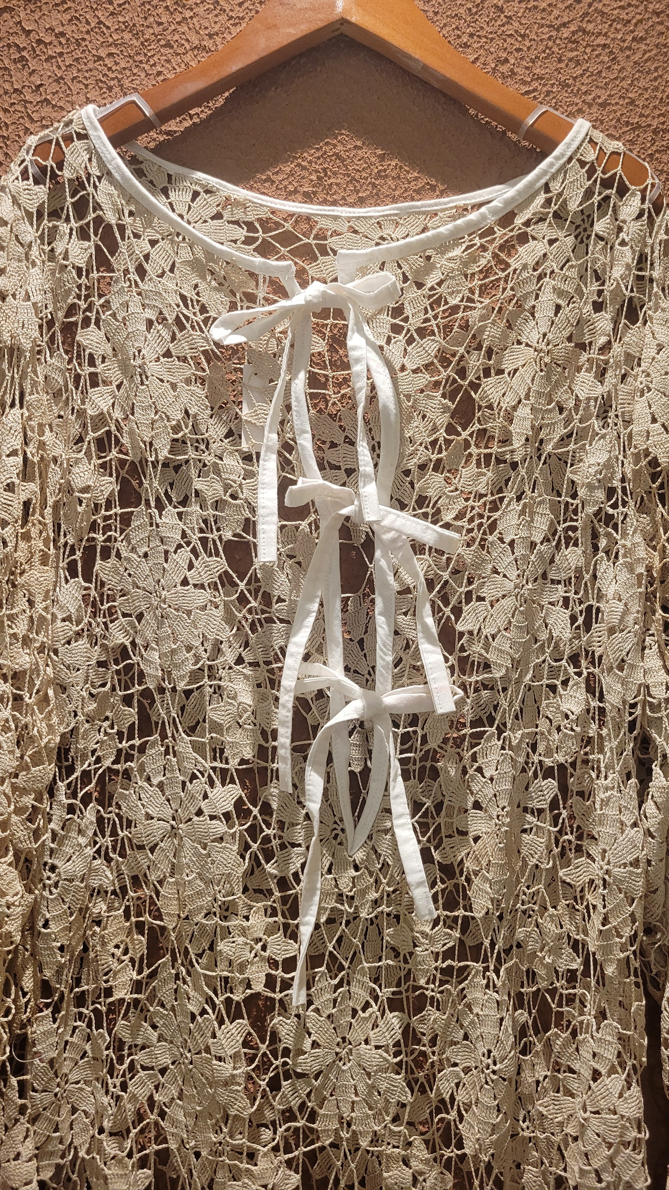ヴィンテージのクロシェ生地を使用したリメイクワンピース。素材表記はありませんがコットンのようです。薄手の繊細なクロシェ編みで軽量です。ファスナー等は付いておらず頭から被るようにして着用するプルオーバータイプです。カフスにゴム入りです。前後どちらでも着用可能な2wayです。秋冬はインナーにリブタートルニット等を合わせて。