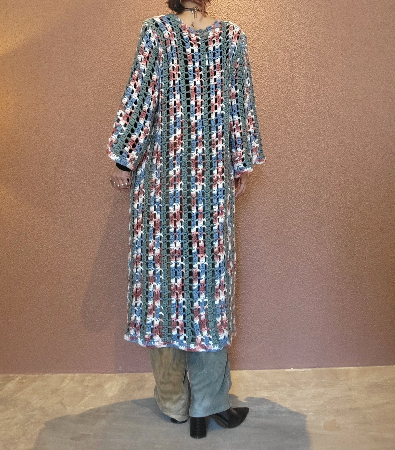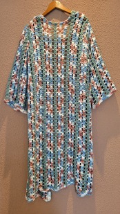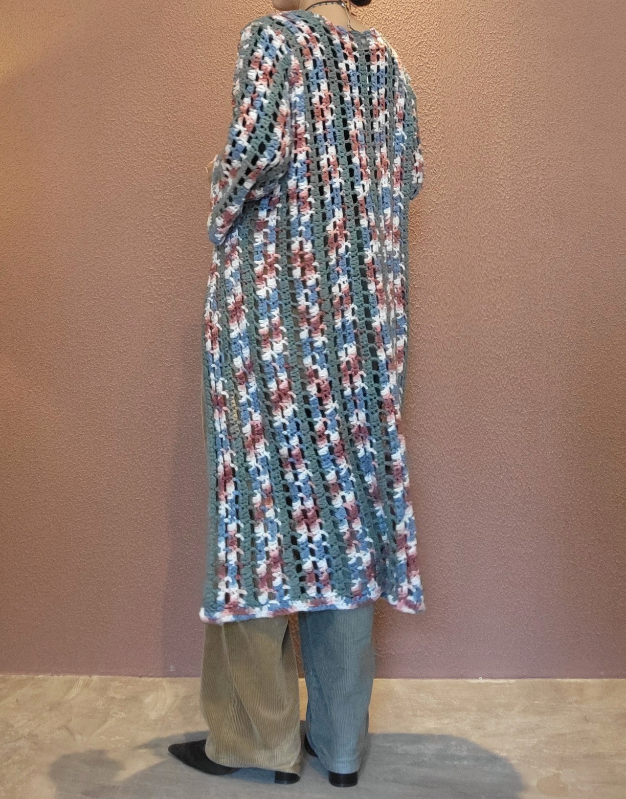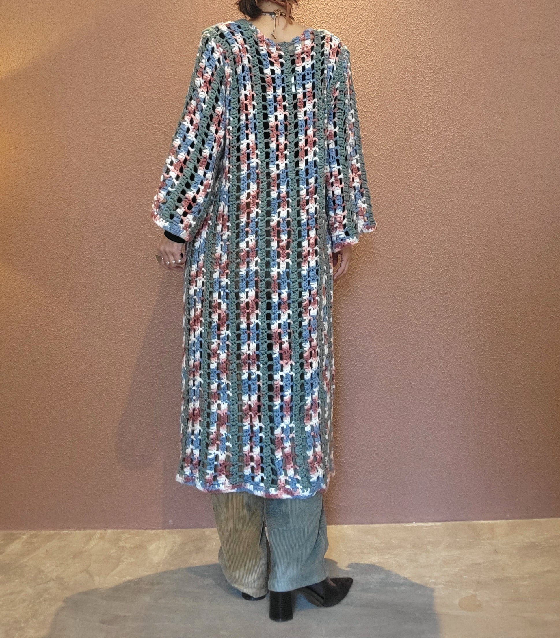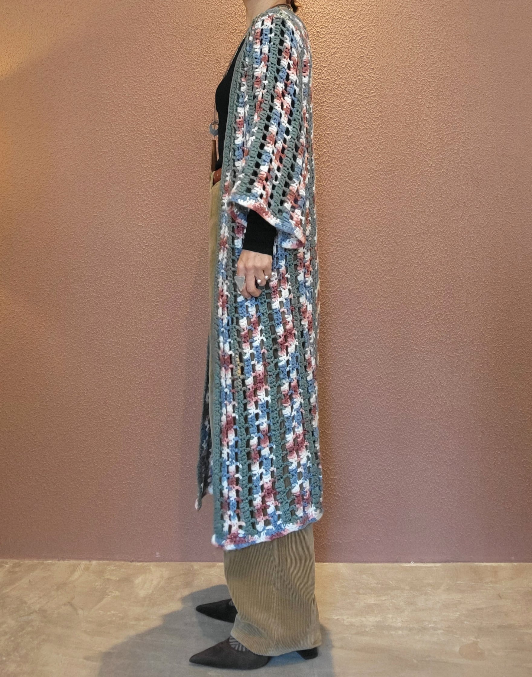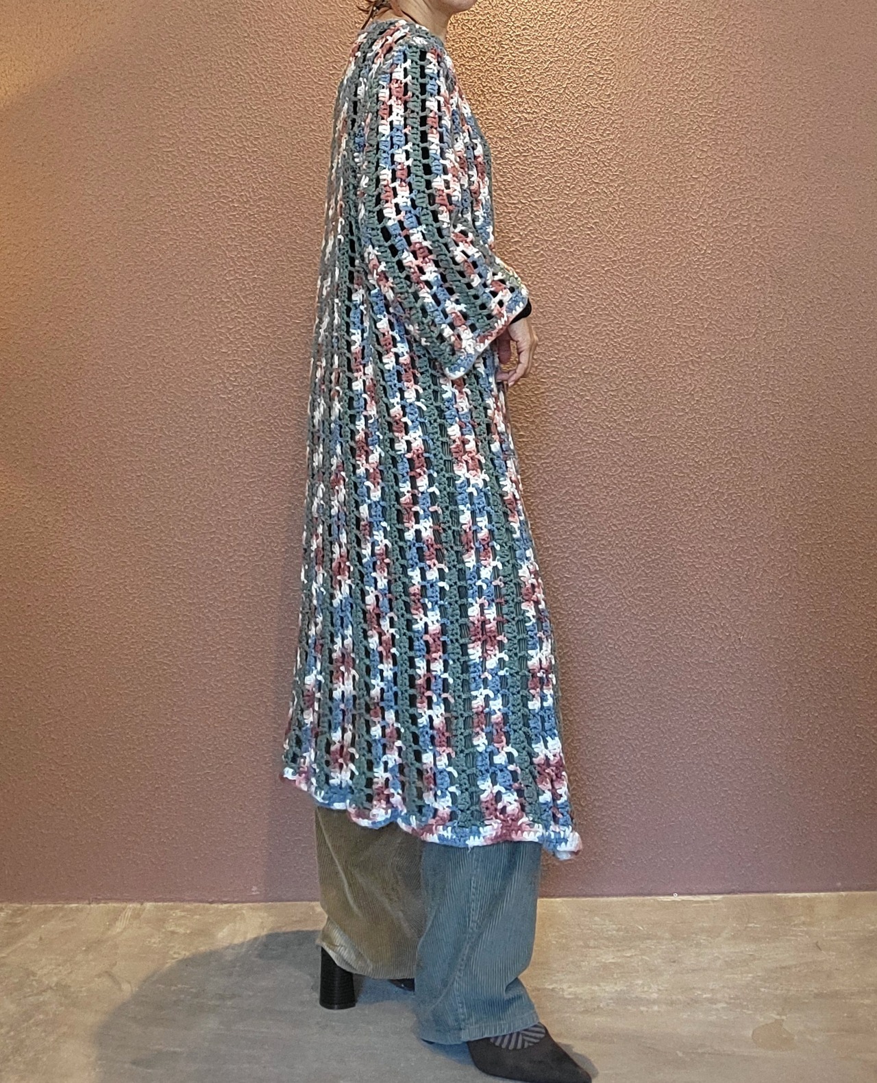 ヴィンテージのグラニーニットを使用したリメイクガウン。素材不明ですがアクリルニットのようです。重くはありません。フロントオープン、さっと羽織れてお部屋の中での防寒用にもぴったりです。くすみのあるミックスカラーとざっくりハンドニットに温かみを感じる1枚。
