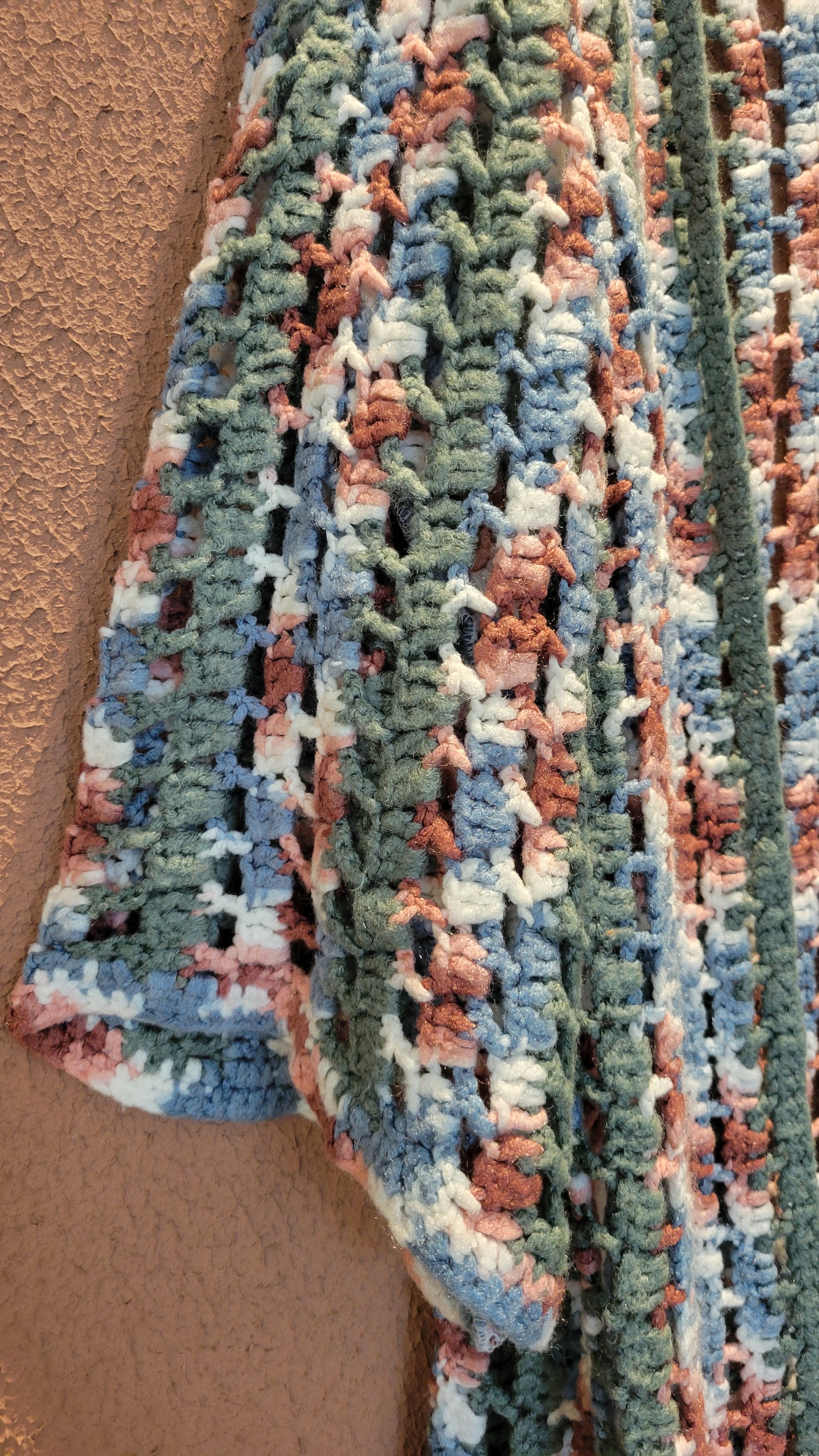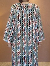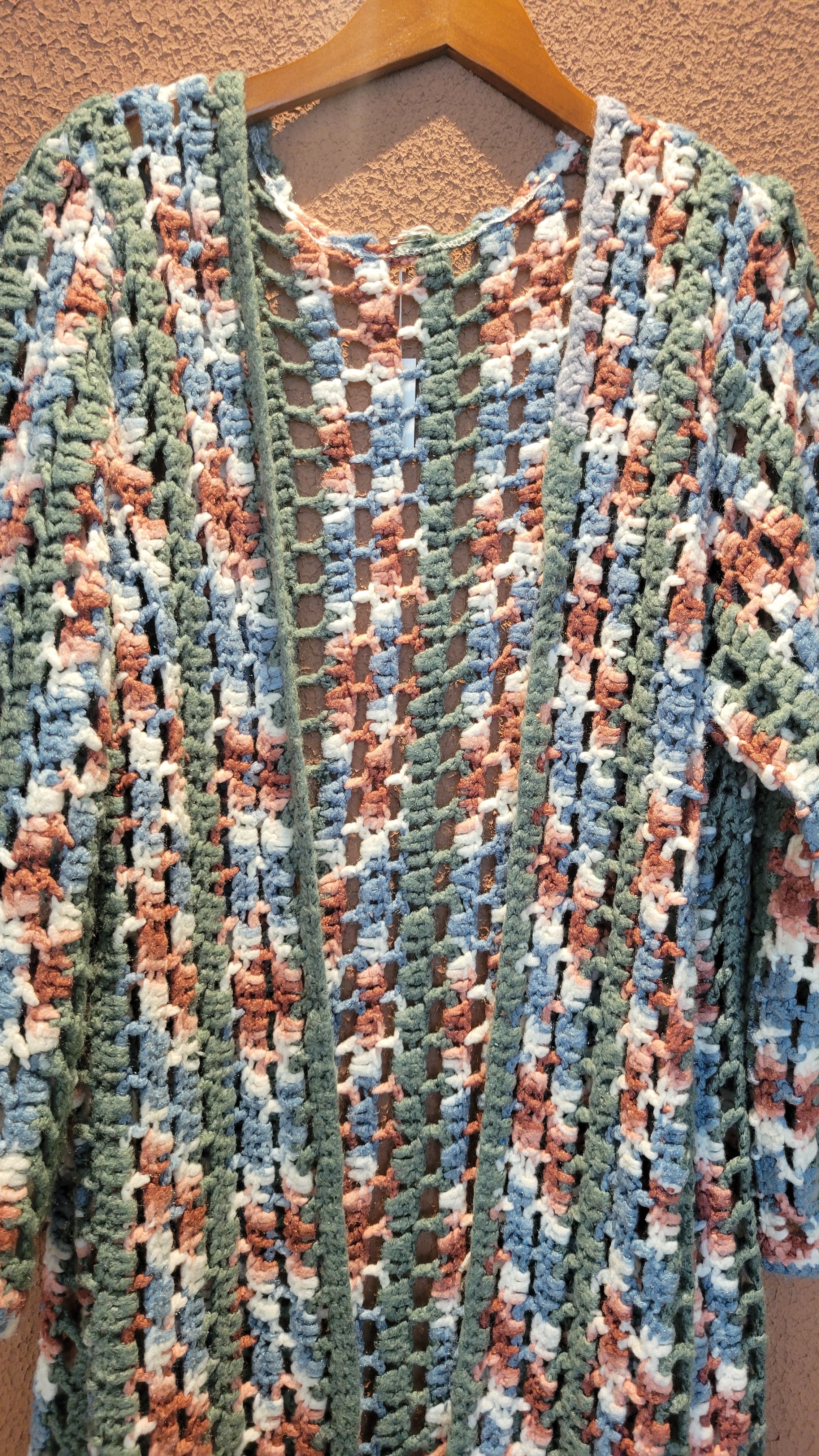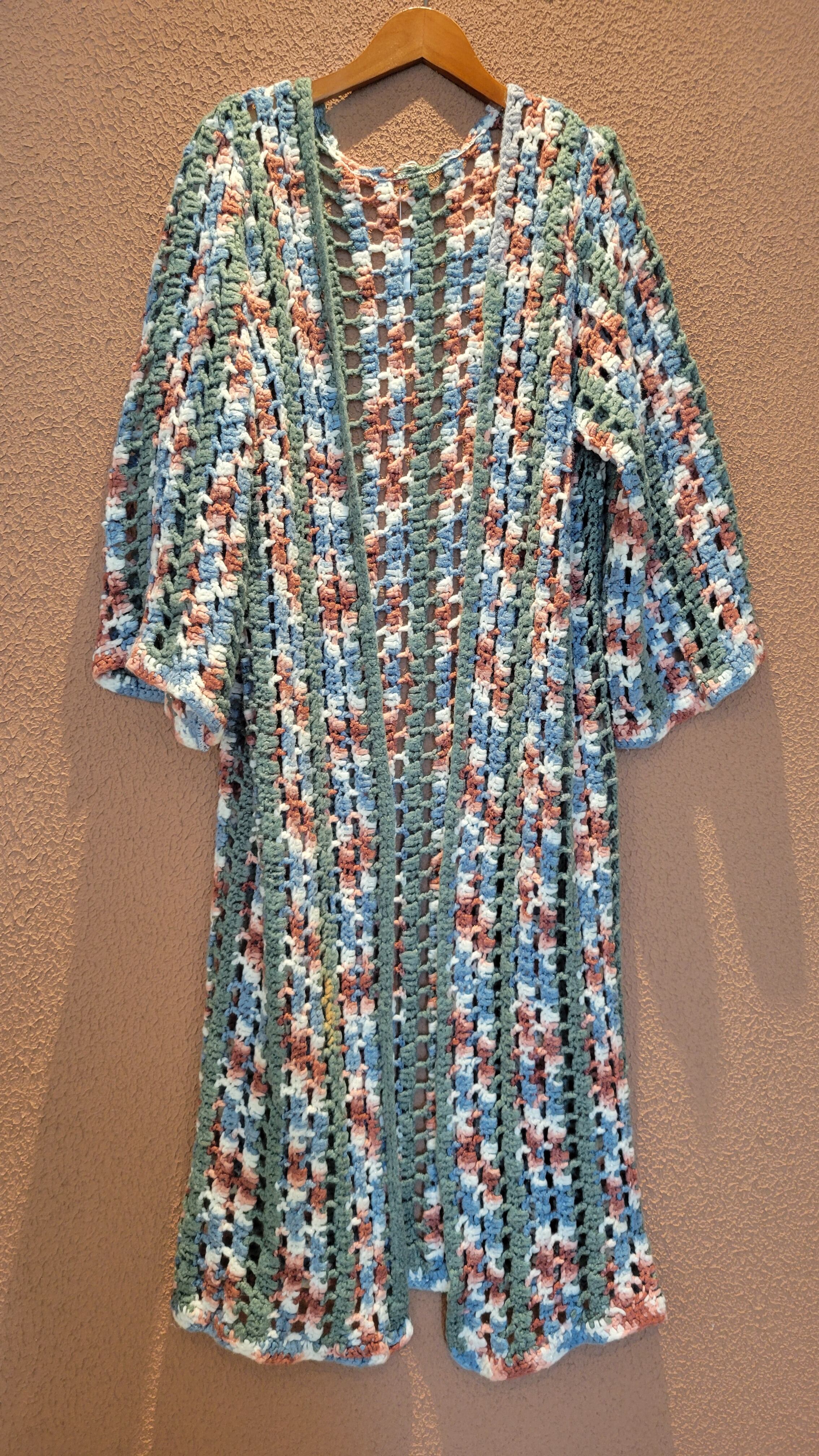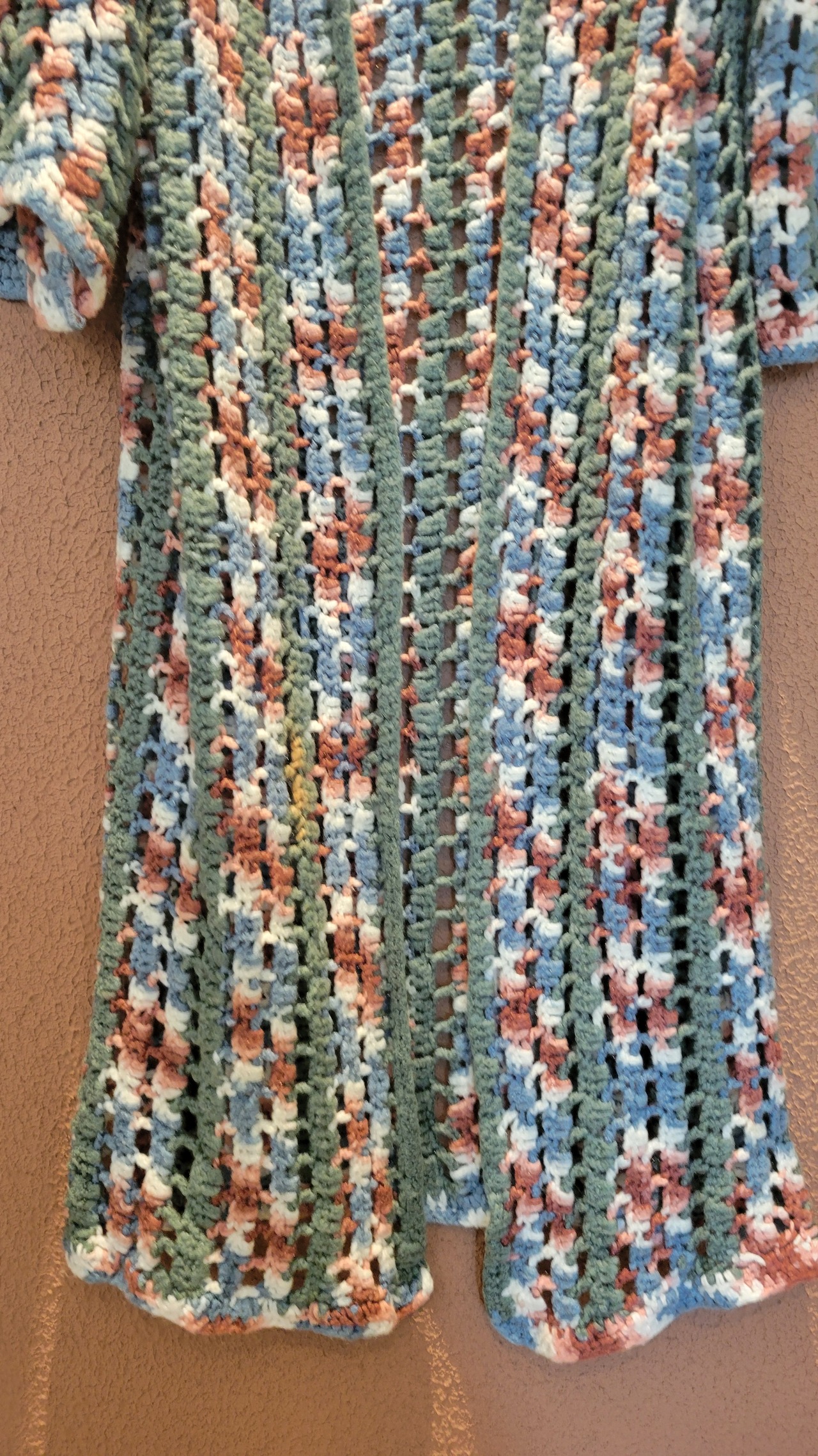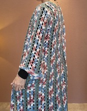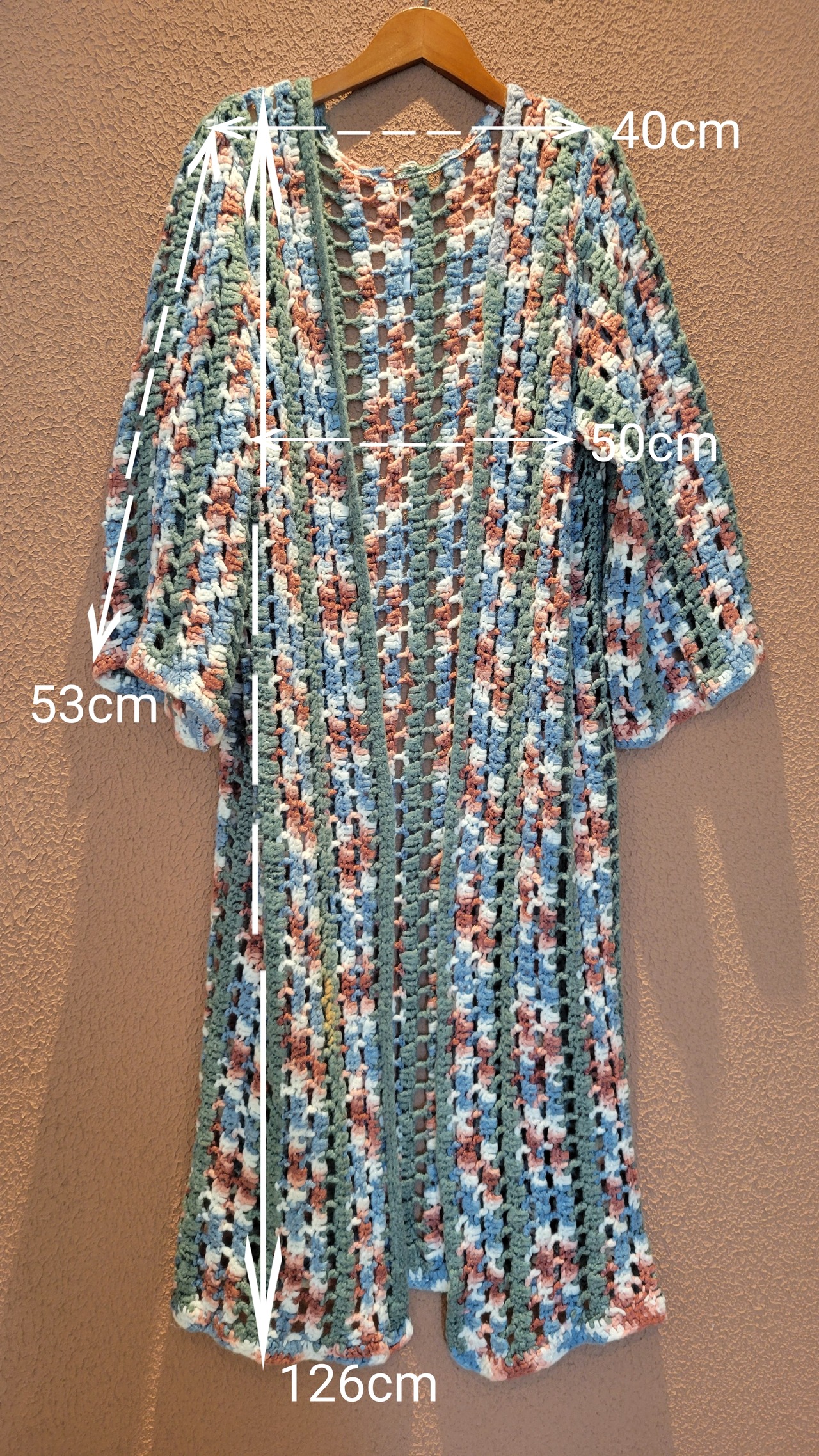 ヴィンテージのグラニーニットを使用したリメイクガウン。素材不明ですがアクリルニットのようです。重くはありません。フロントオープン、さっと羽織れてお部屋の中での防寒用にもぴったりです。くすみのあるミックスカラーとざっくりハンドニットに温かみを感じる1枚。