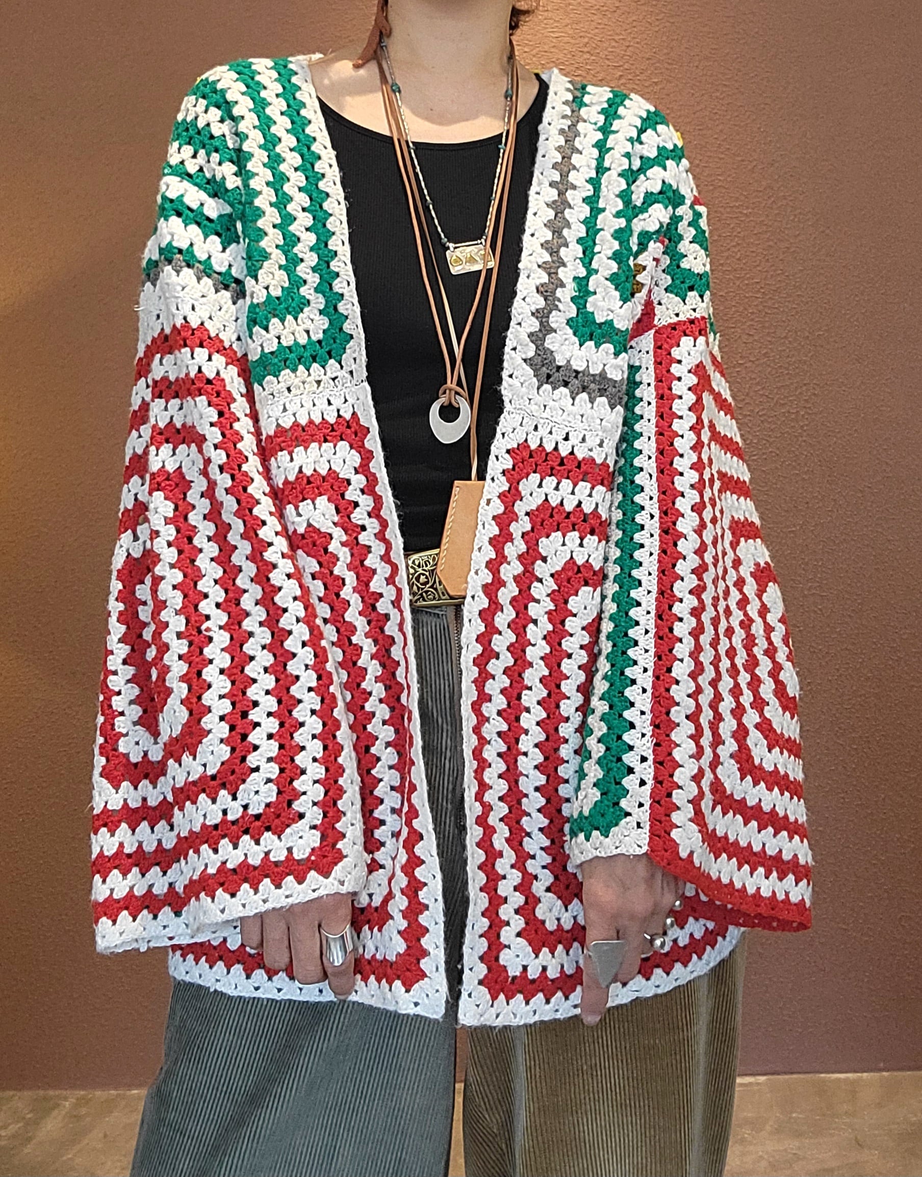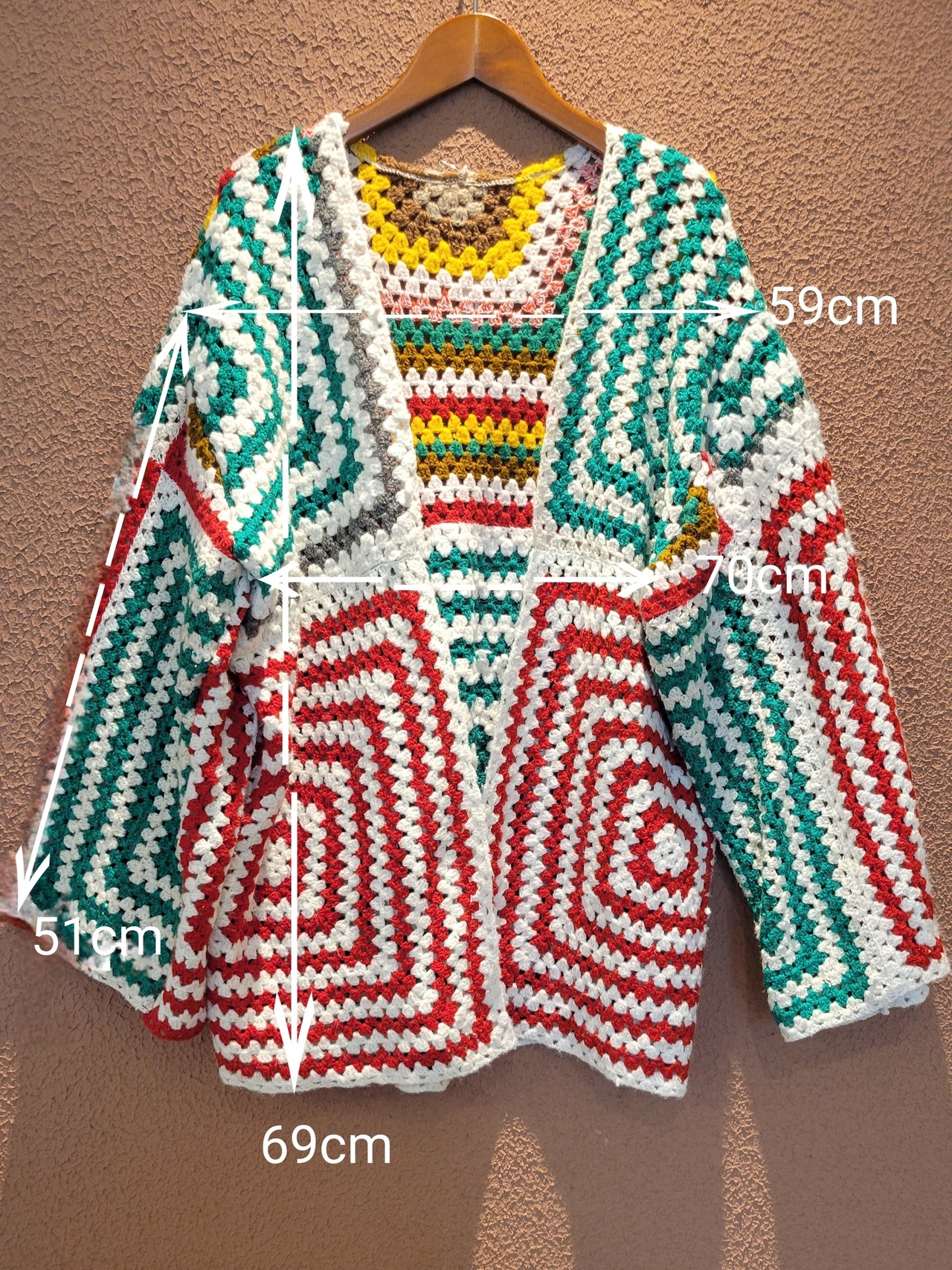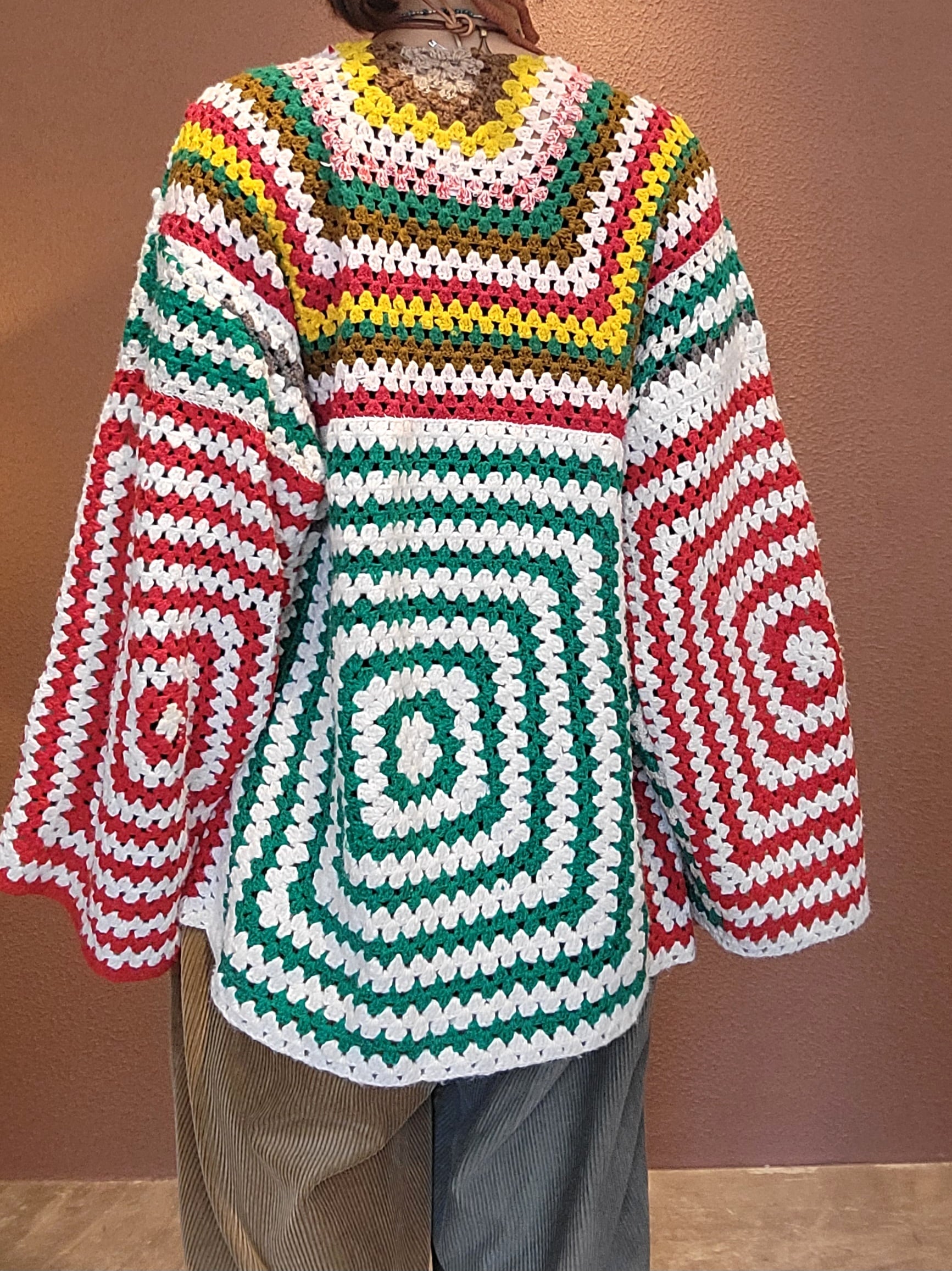 ヴィンテージのグラニーニットを使用したリメイクガウン。素材不明ですがアクリルニットのようです。軽量です。フロントオープン、さっと羽織れてお部屋の中での防寒用にもぴったりです。明るいカラーとスクエアモチーフが陽気な雰囲気の1枚。