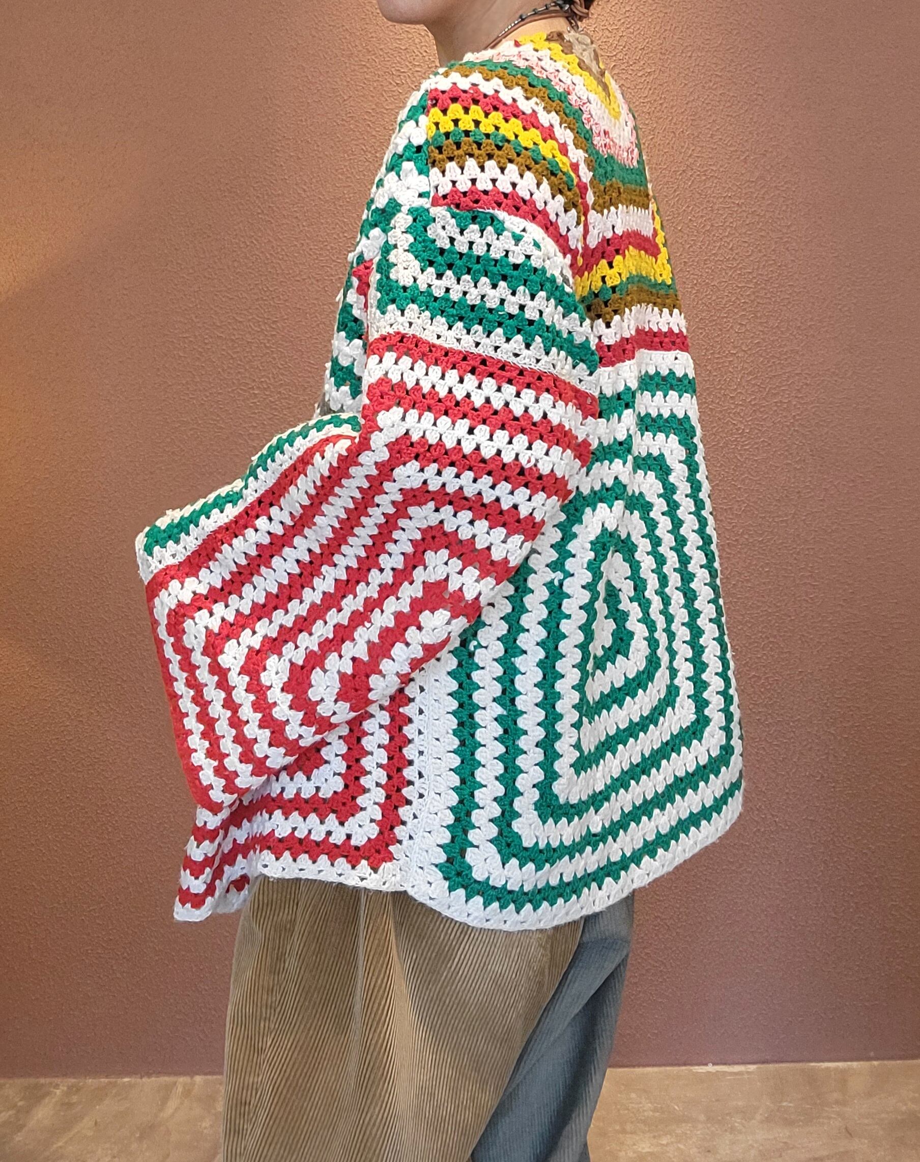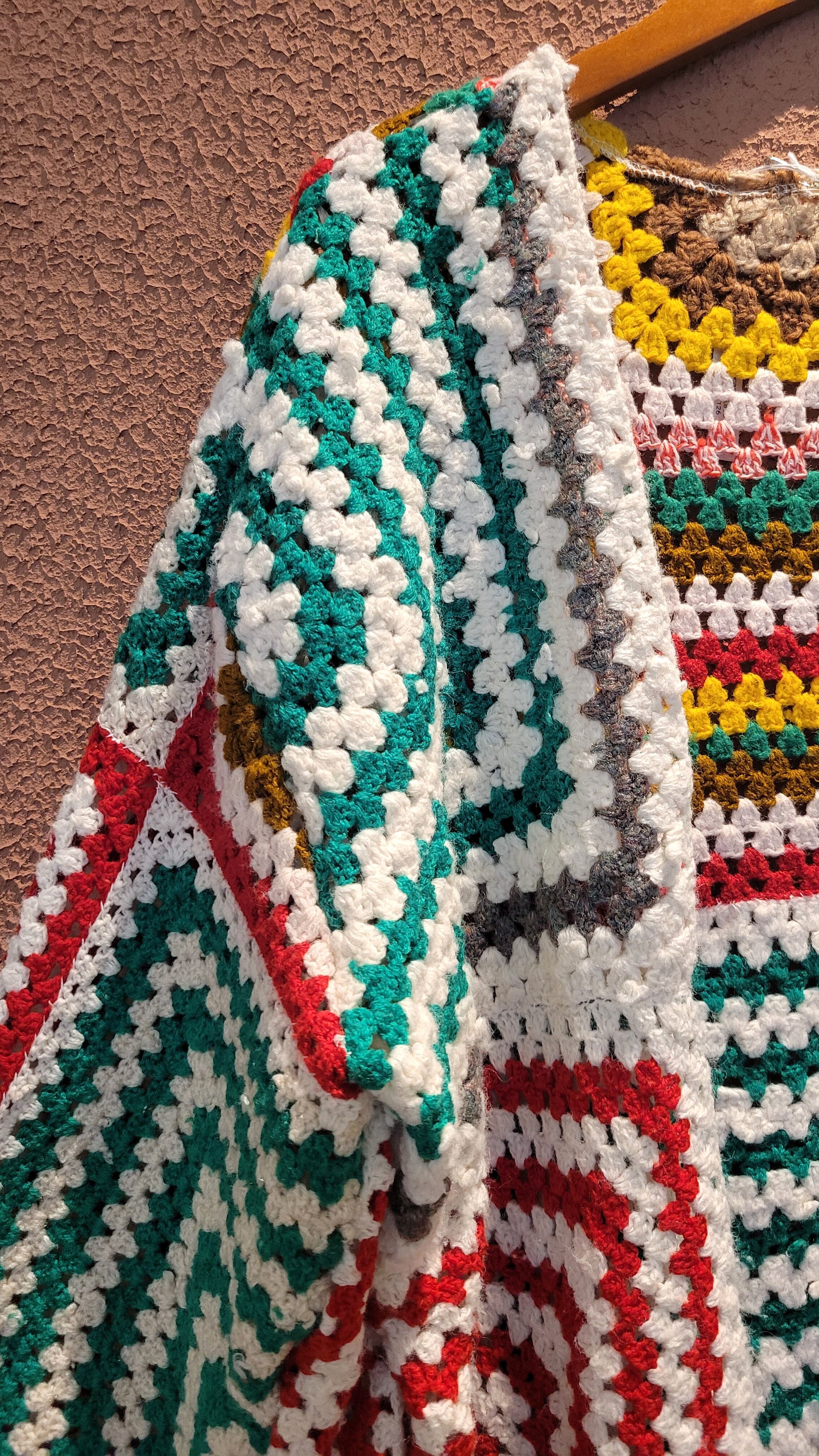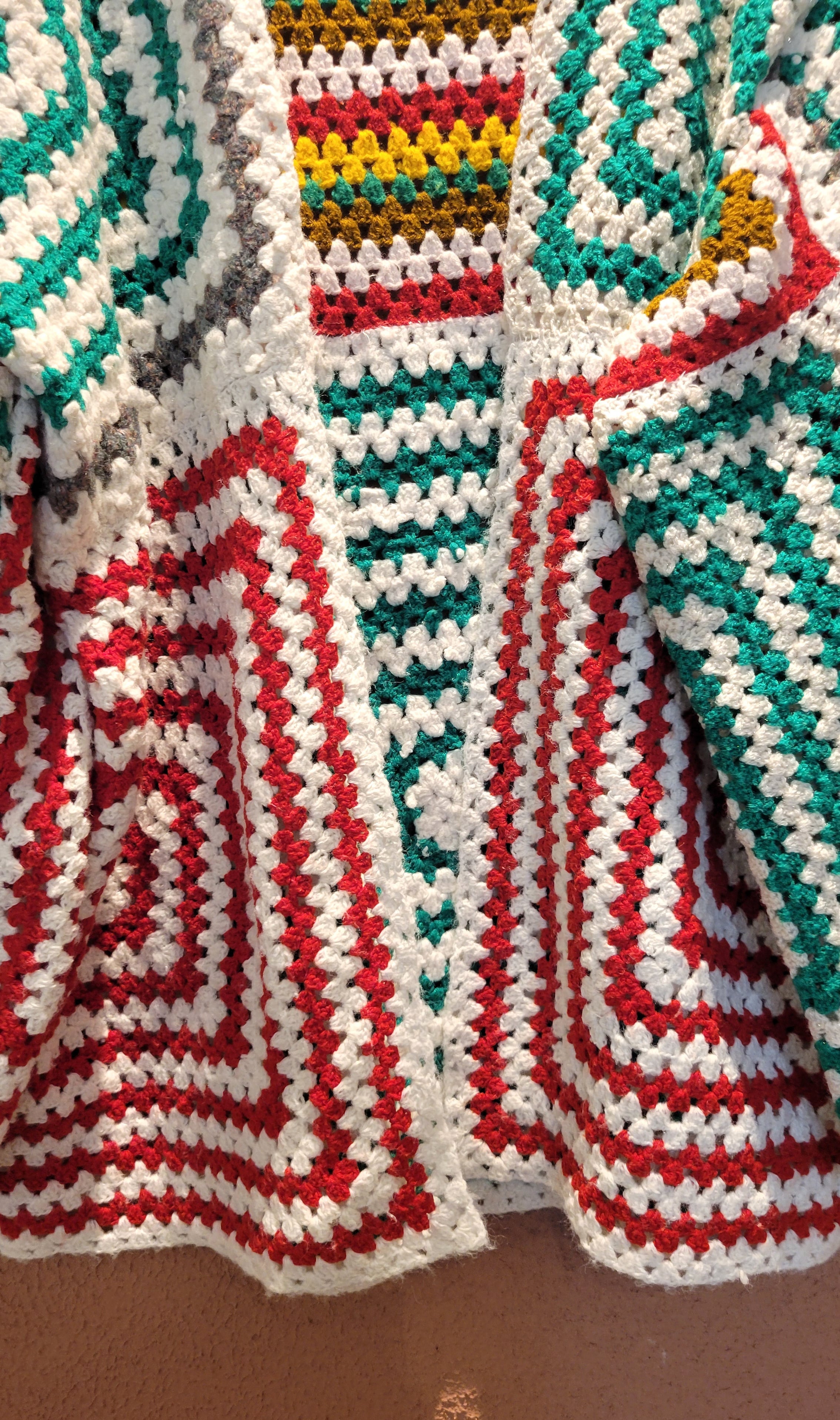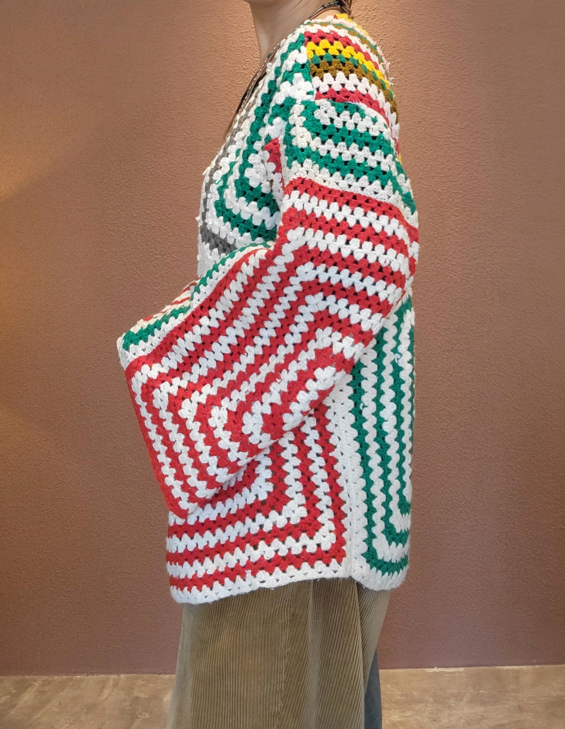 ヴィンテージのグラニーニットを使用したリメイクガウン。素材不明ですがアクリルニットのようです。軽量です。フロントオープン、さっと羽織れてお部屋の中での防寒用にもぴったりです。明るいカラーとスクエアモチーフが陽気な雰囲気の1枚。
