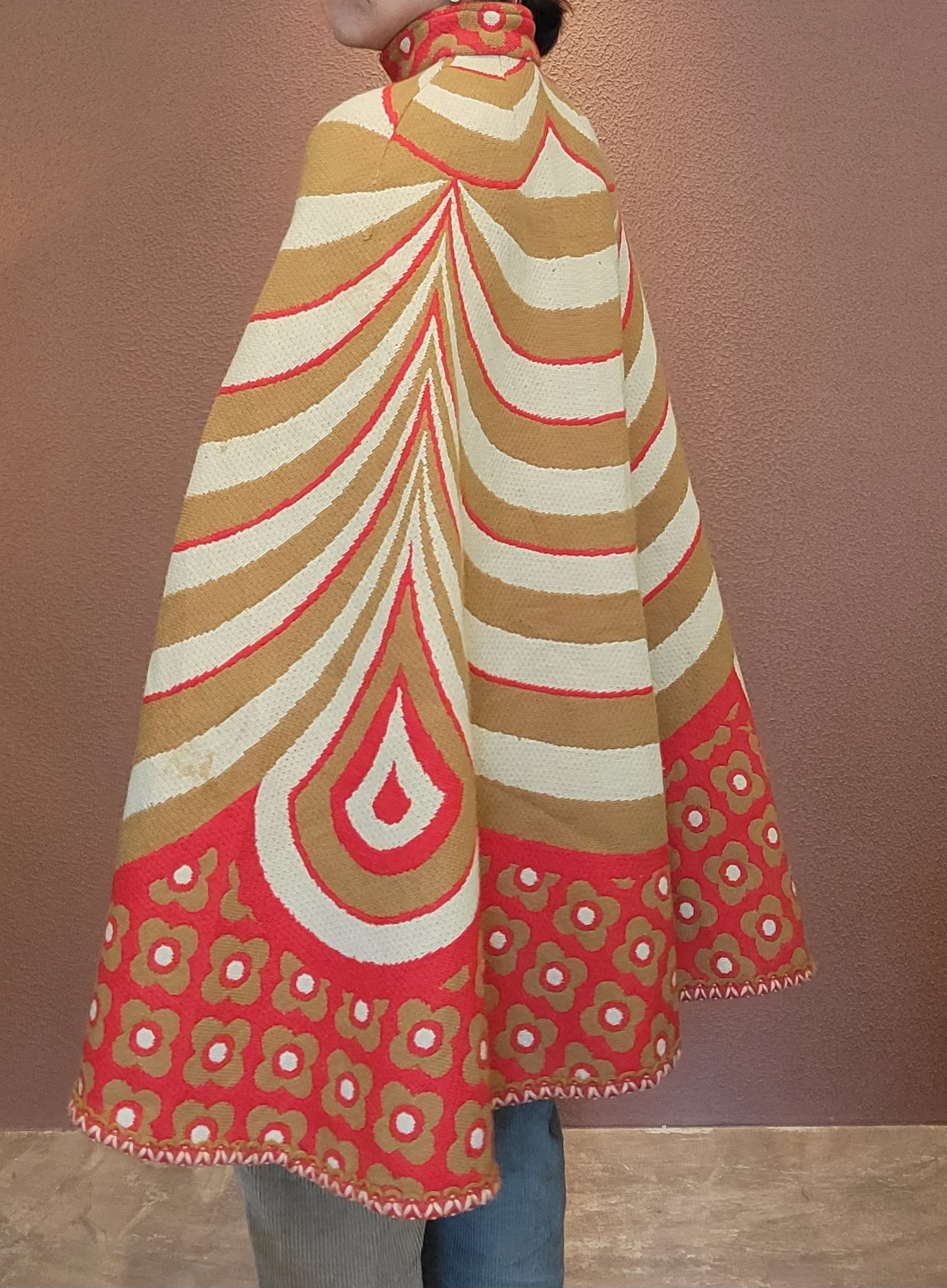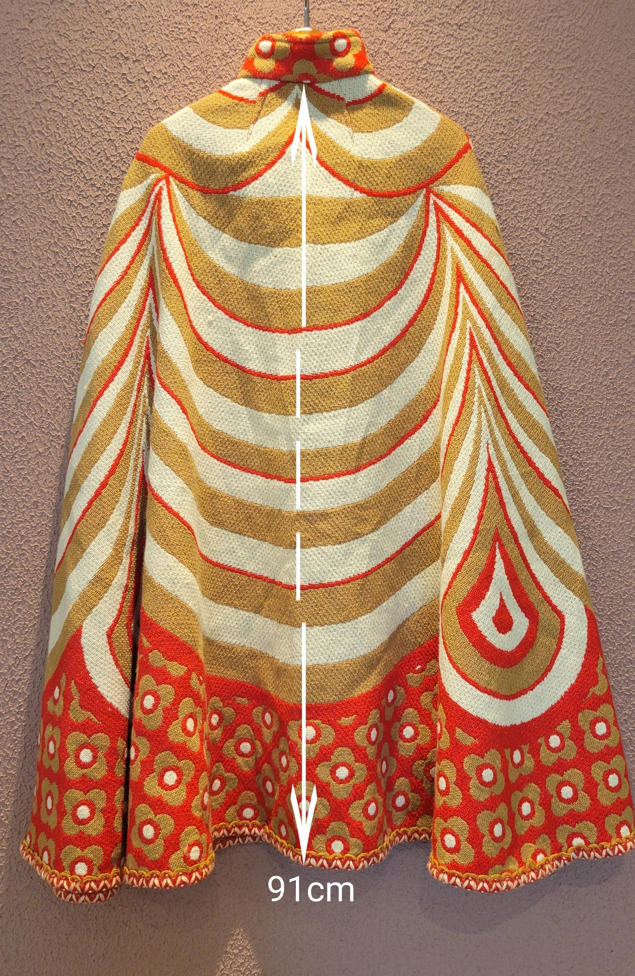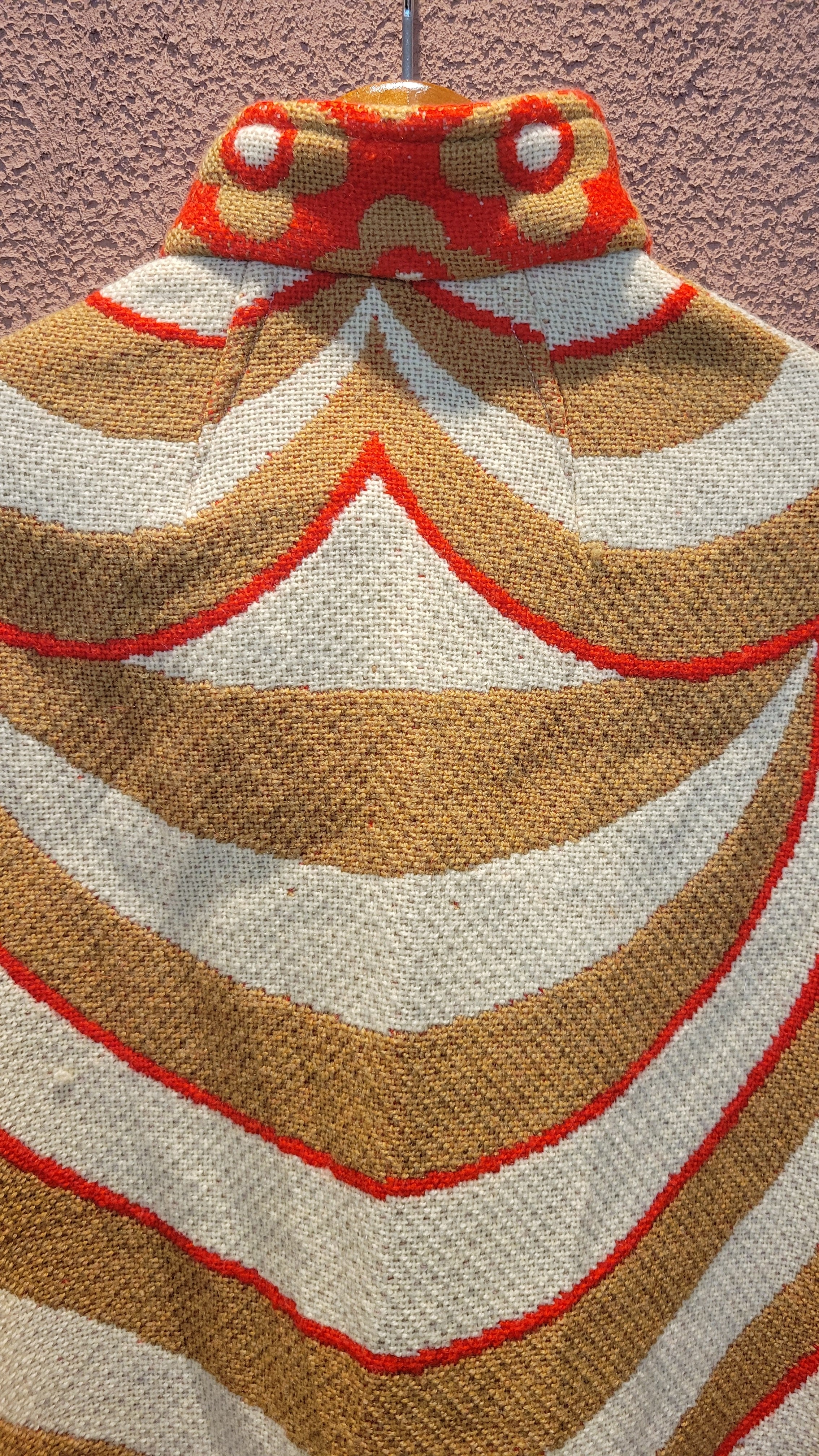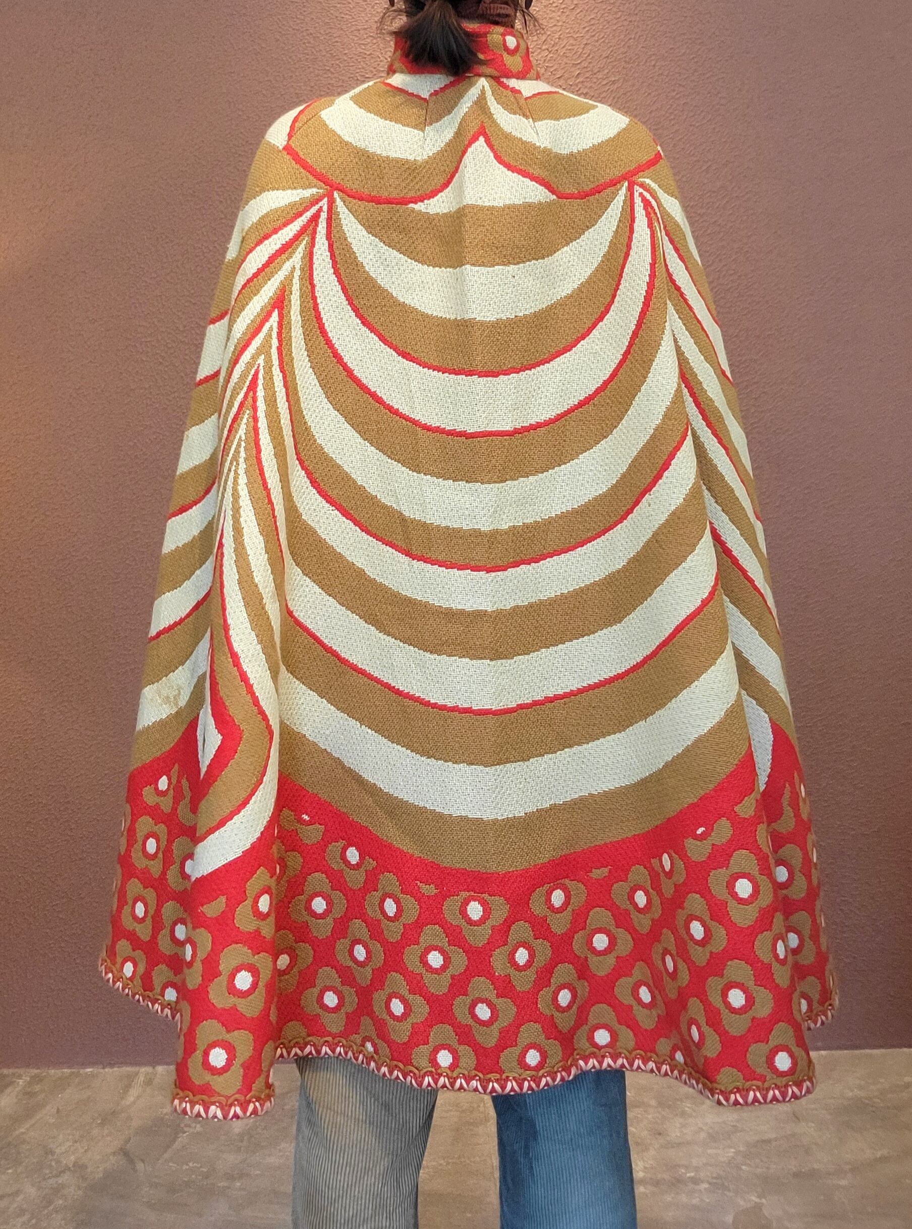ユーロヴィンテージのニットケープ。素材不明ですがミラノニットのような、目が詰まった張り感と伸縮性のある素材です。首元にホックが1つ、前身ごろに腕を出すためのスリットがあります。オプティカルアートのような幾何学柄とベージュ×赤の配色が目を引きます。レトロでありながら新しさも感じる秀逸なデザインです。*数カ所シミがあります。画像でご確認ください。