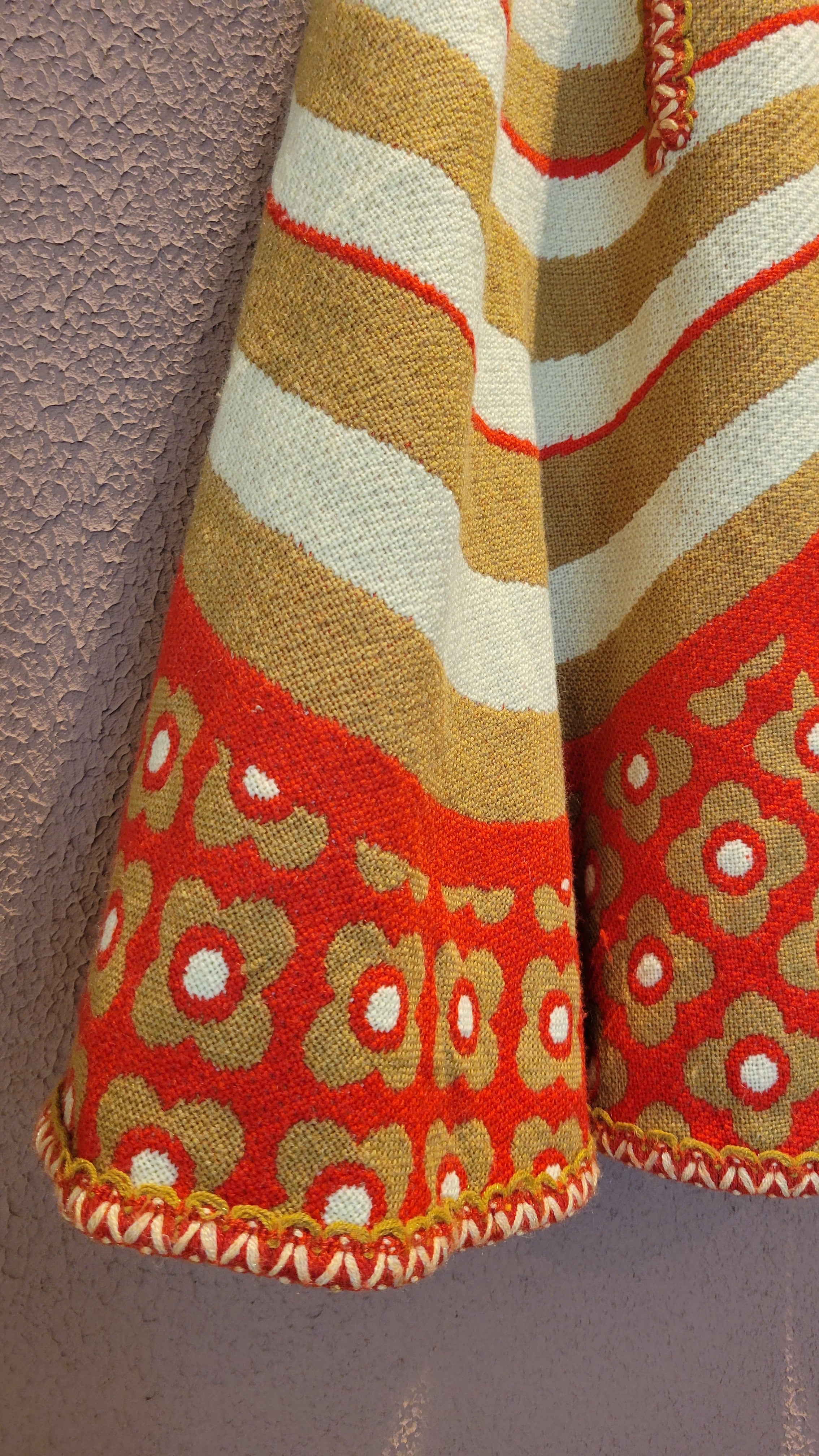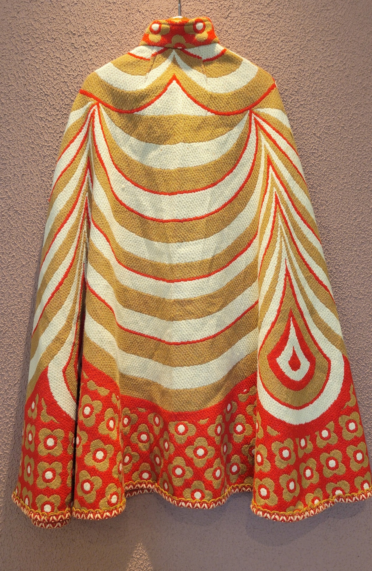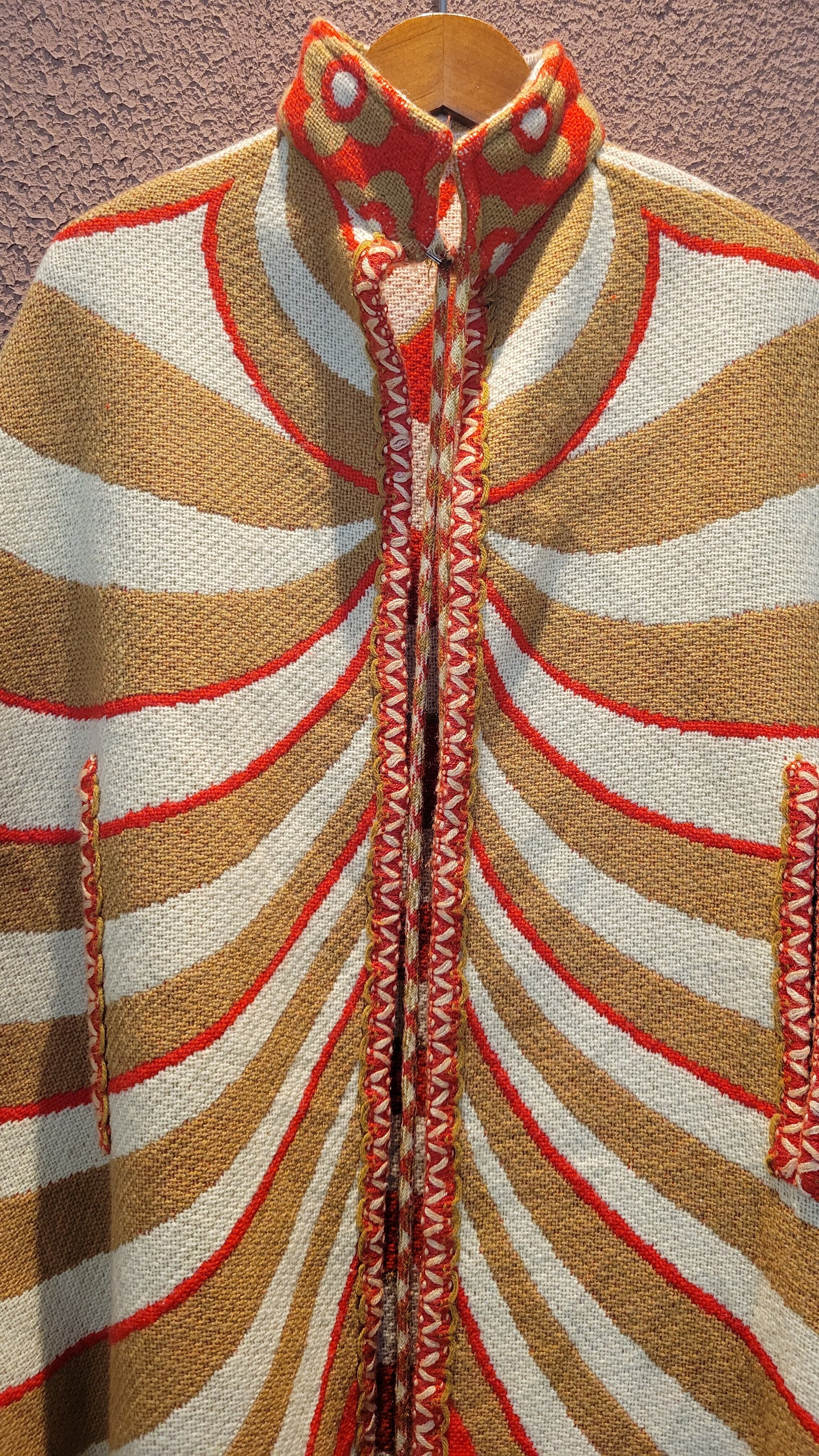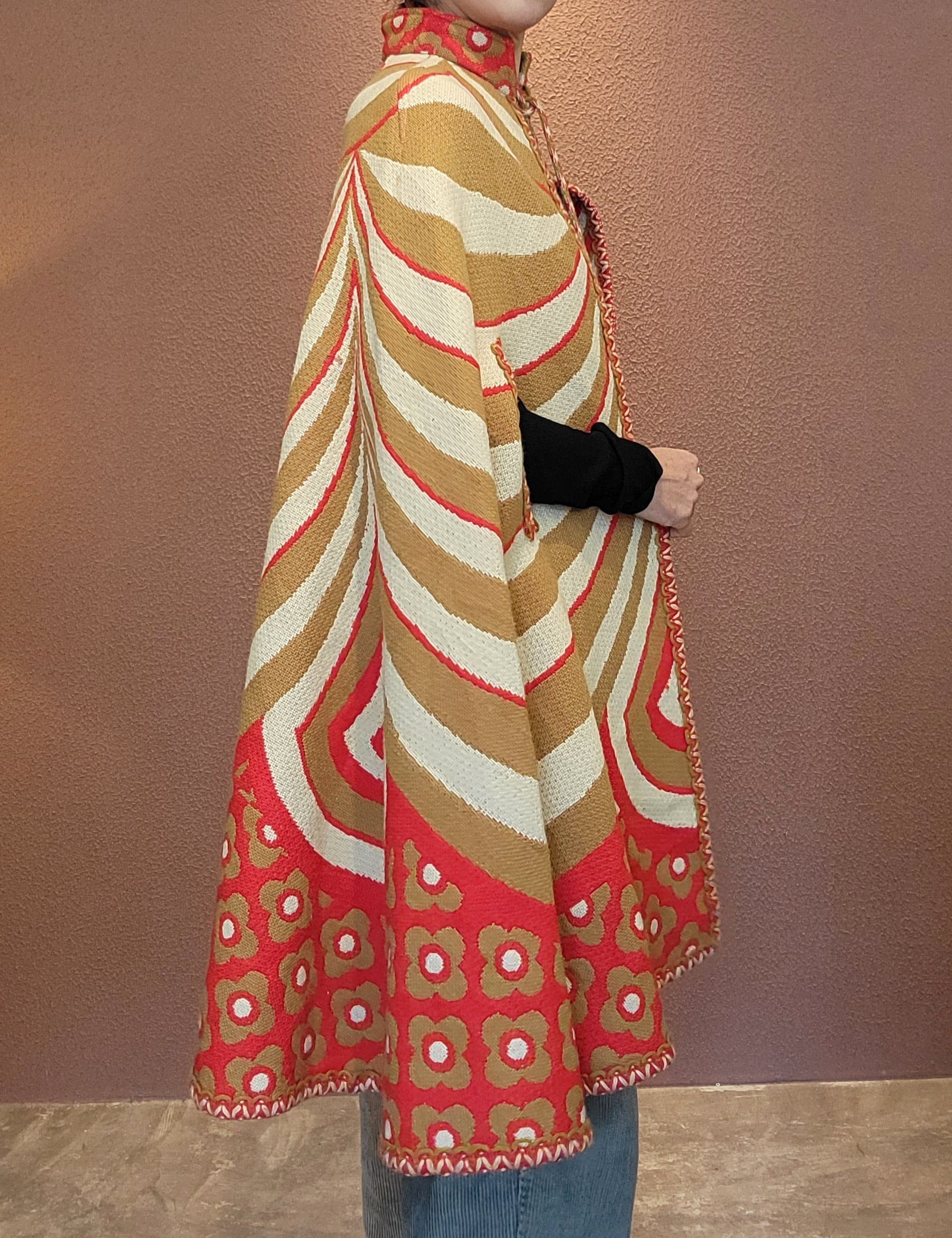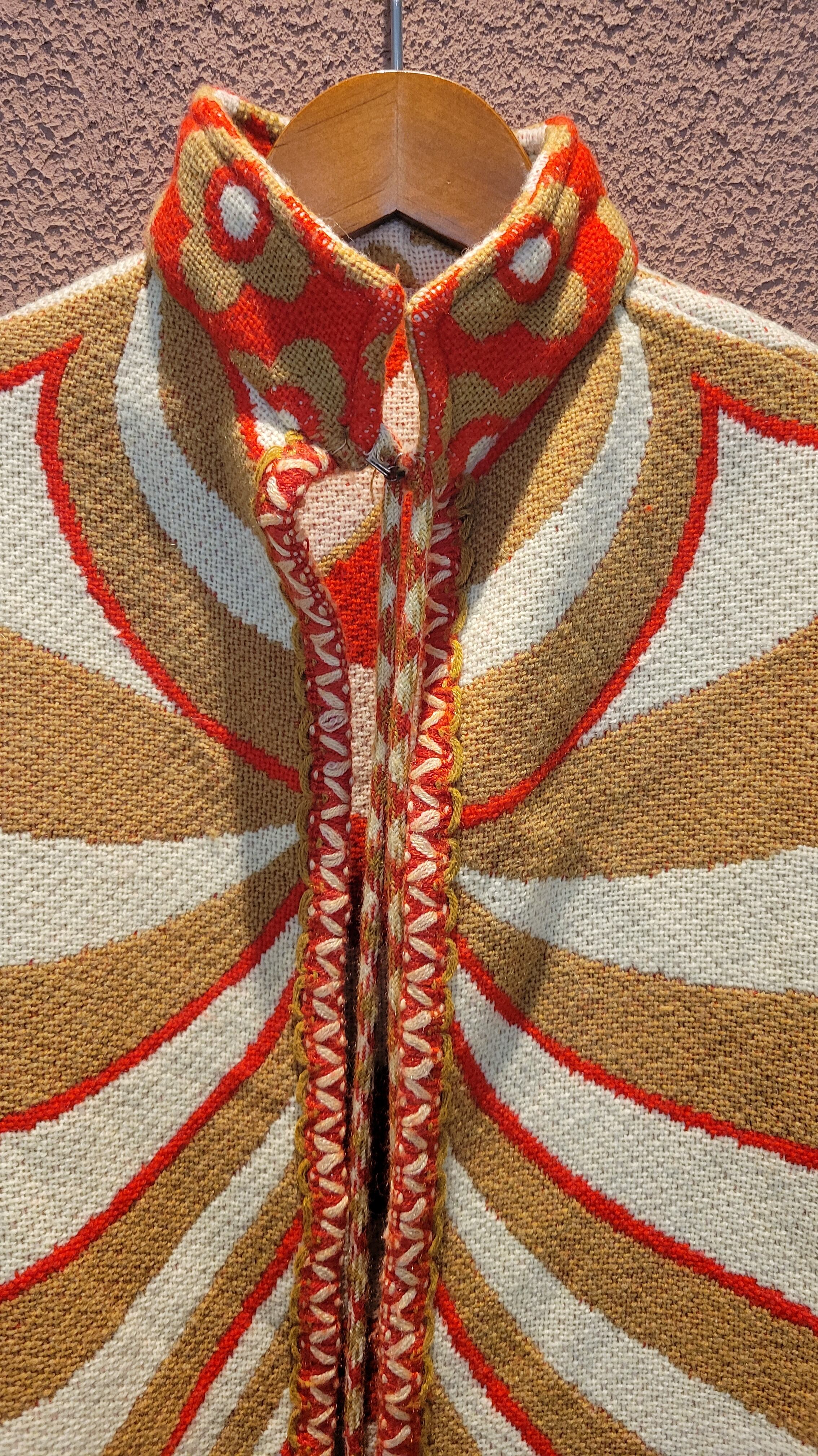 ユーロヴィンテージのニットケープ。素材不明ですがミラノニットのような、目が詰まった張り感と伸縮性のある素材です。首元にホックが1つ、前身ごろに腕を出すためのスリットがあります。オプティカルアートのような幾何学柄とベージュ×赤の配色が目を引きます。レトロでありながら新しさも感じる秀逸なデザインです。*数カ所シミがあります。画像でご確認ください。