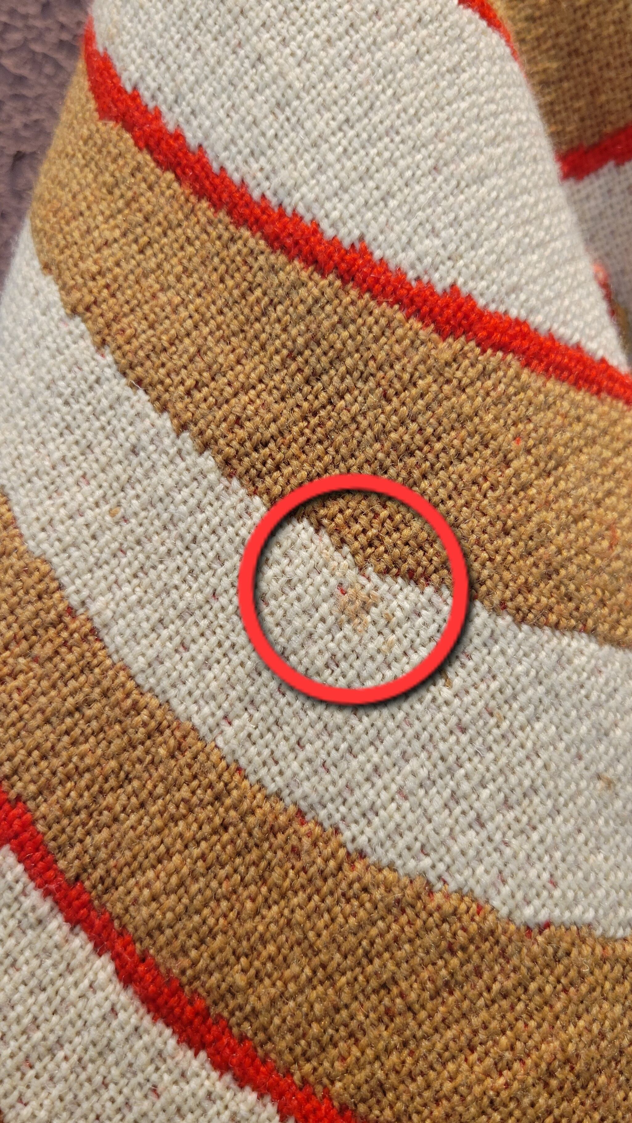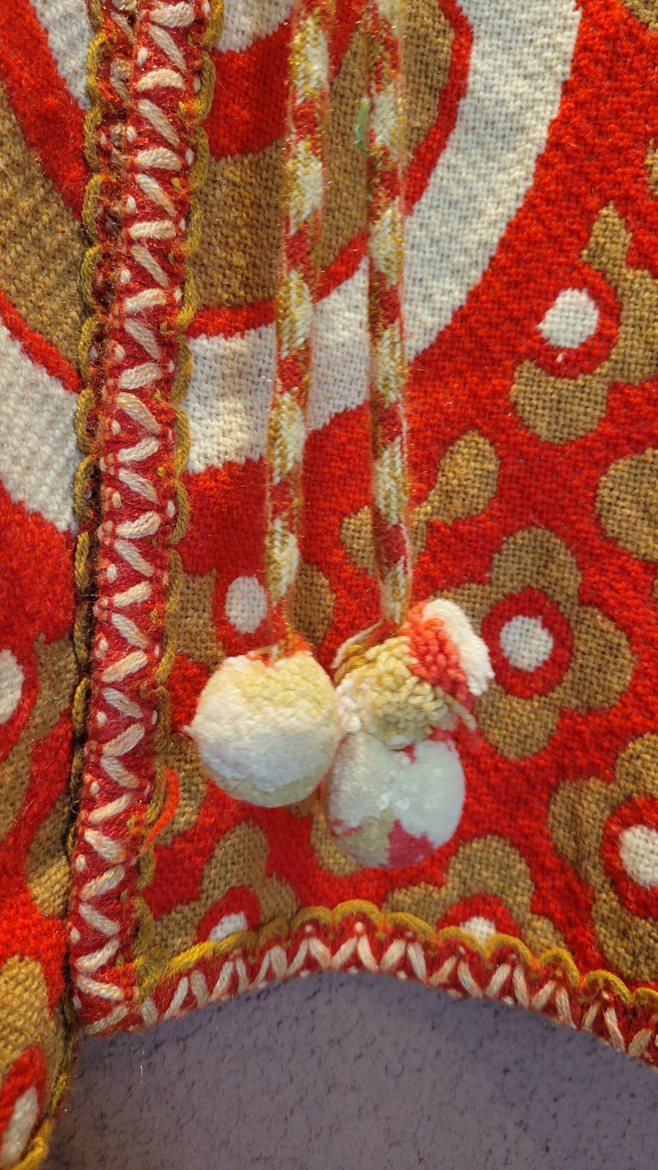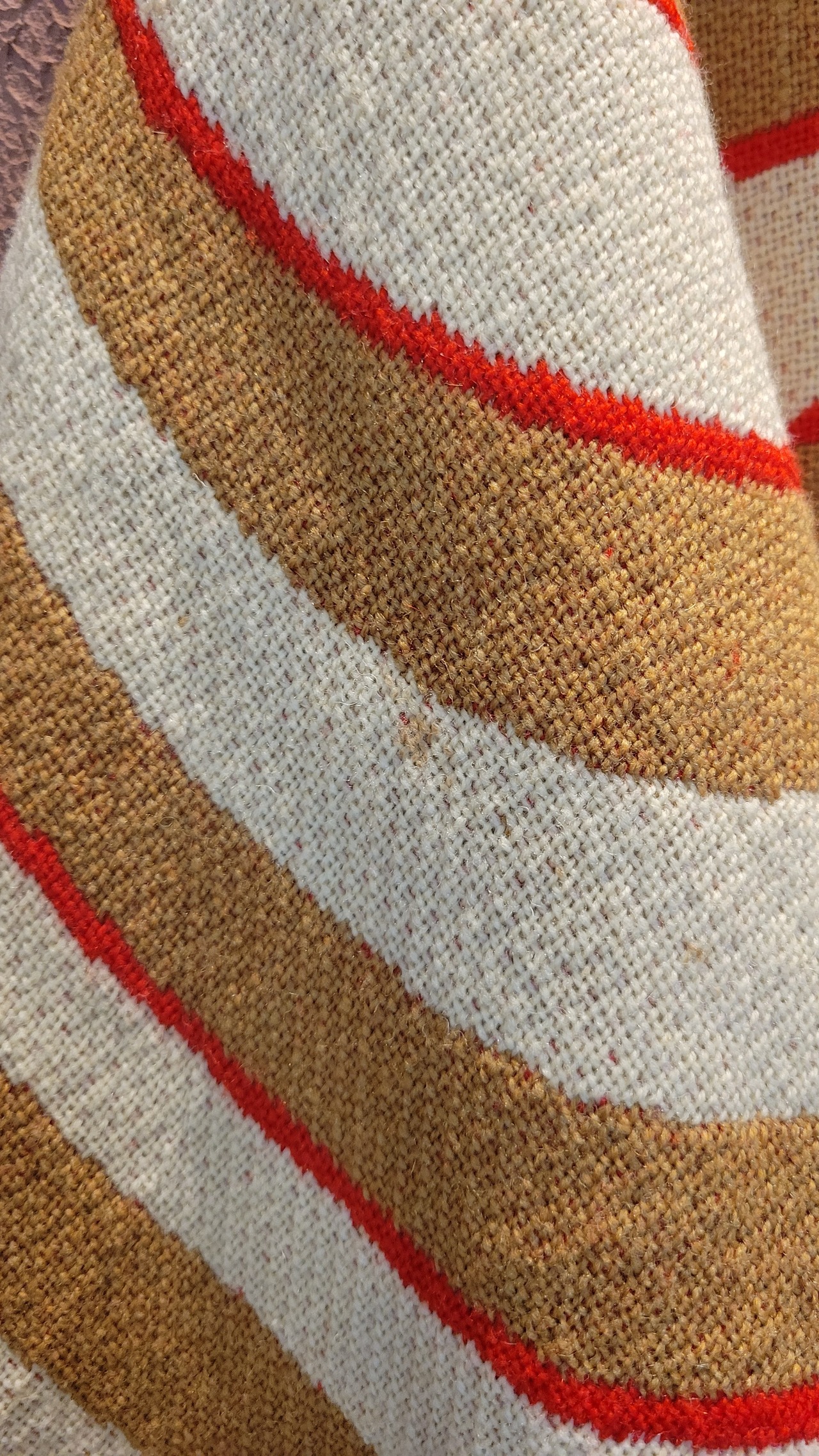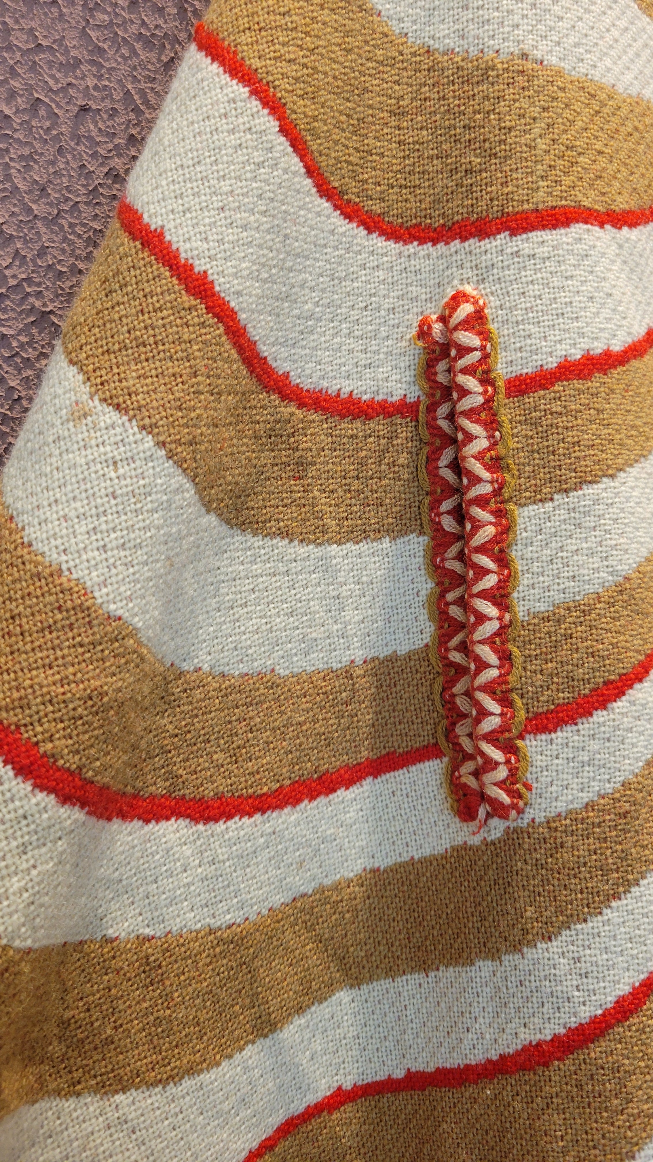 ユーロヴィンテージのニットケープ。素材不明ですがミラノニットのような、目が詰まった張り感と伸縮性のある素材です。首元にホックが1つ、前身ごろに腕を出すためのスリットがあります。オプティカルアートのような幾何学柄とベージュ×赤の配色が目を引きます。レトロでありながら新しさも感じる秀逸なデザインです。*数カ所シミがあります。画像でご確認ください。