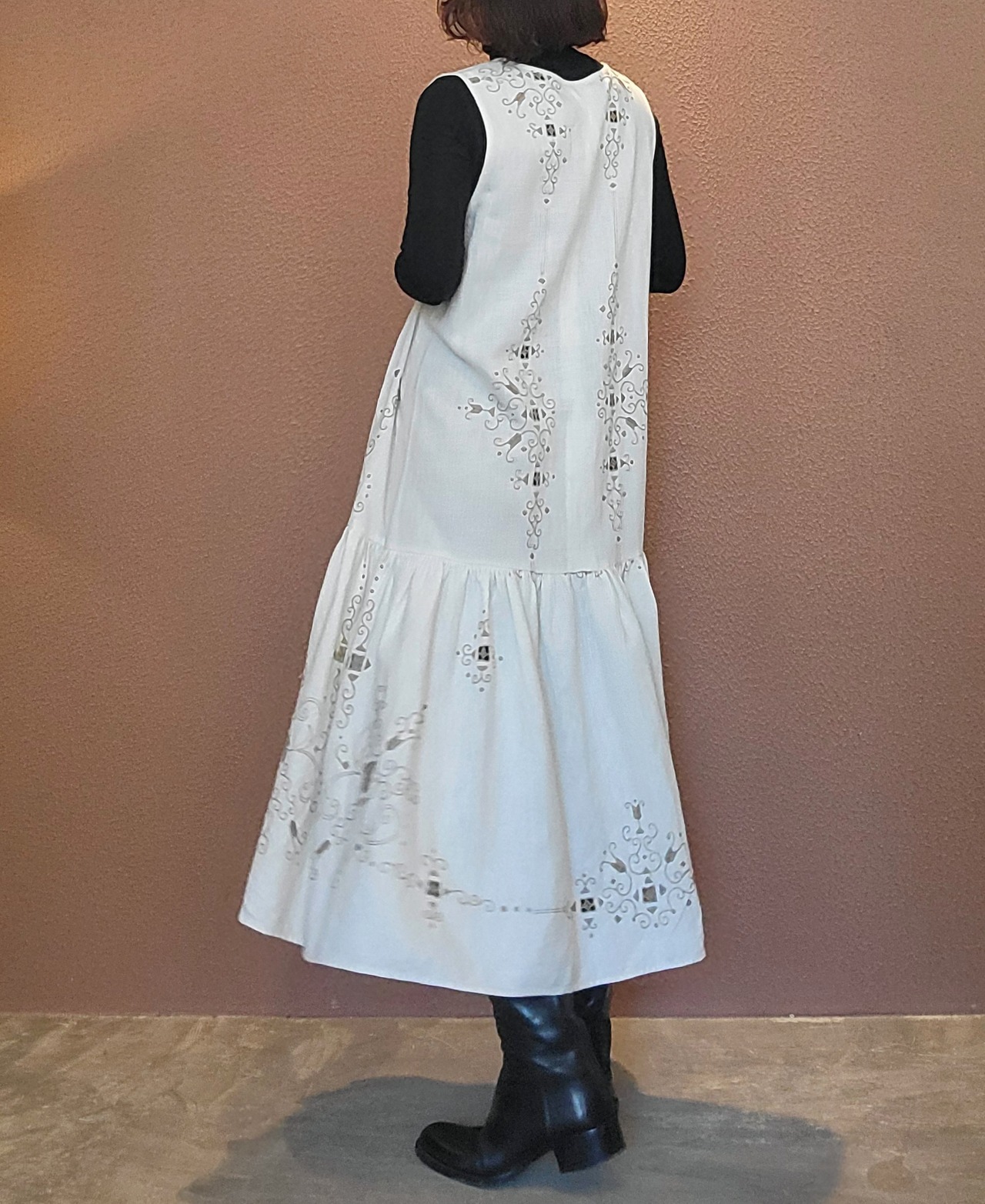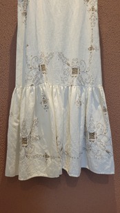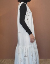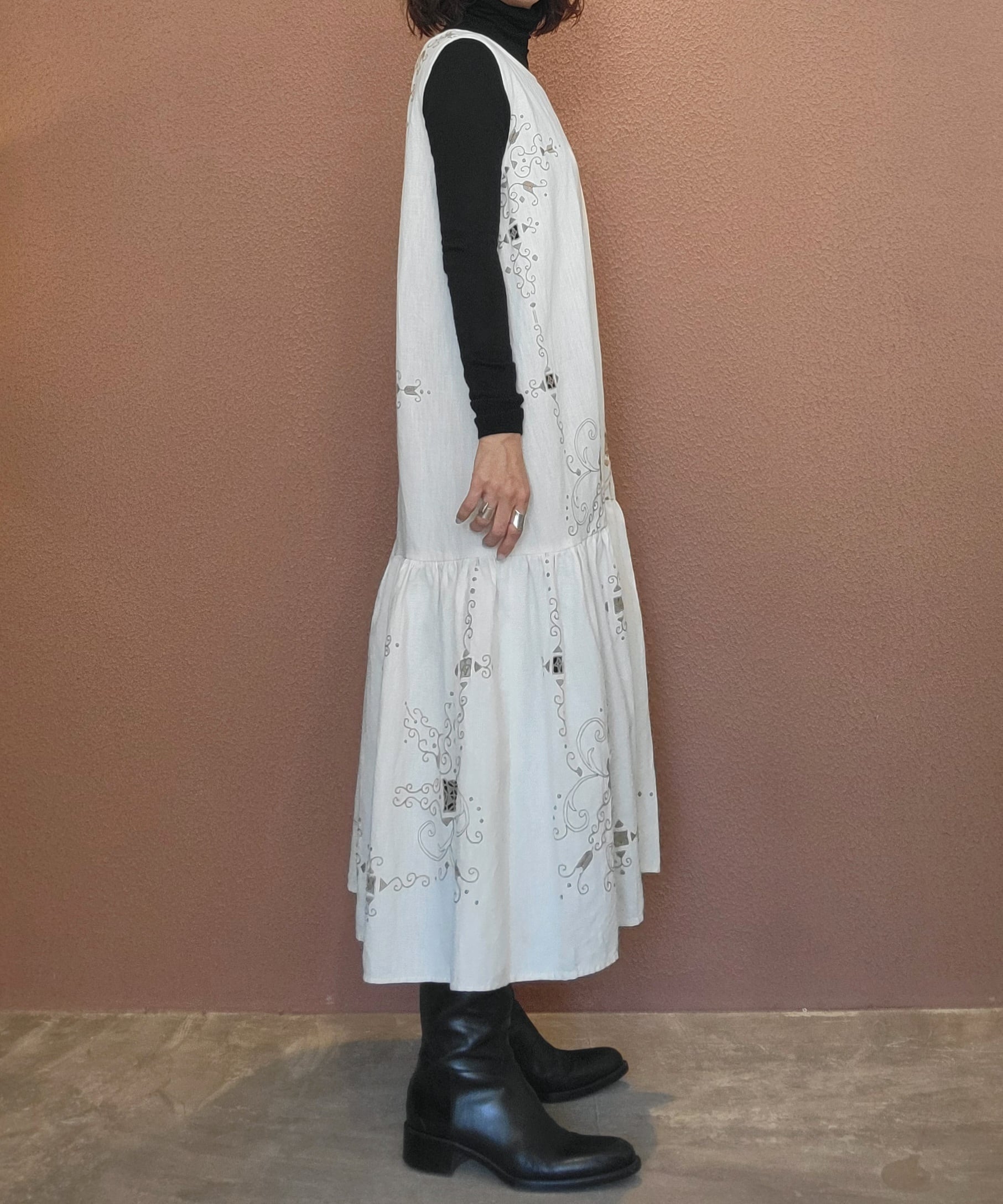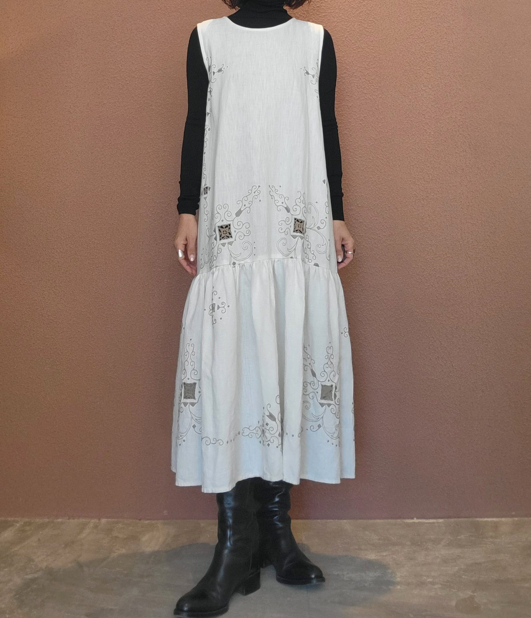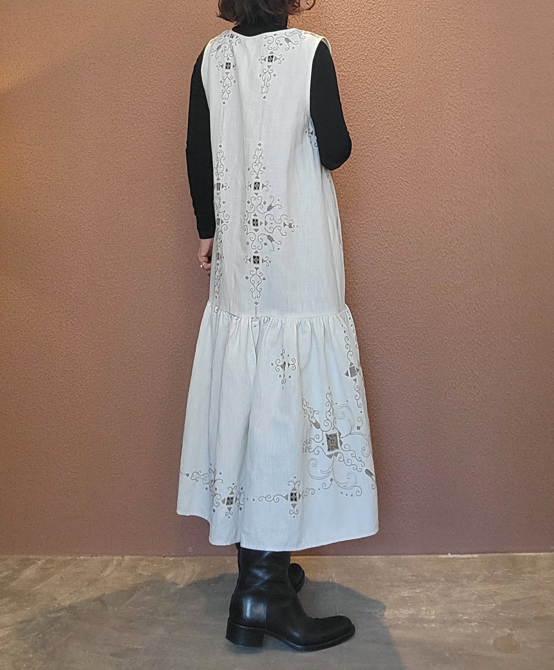 ヴィンテージの刺繍レース生地を使用したリメイクワンピース。素材表記はありませんがコットンのようです。ボタンやファスナーは付いておらず頭から被るようにして着用するプルオーバータイプ、そのため身幅は広めに設定されています。裏地は付いていません。夏は涼しく、秋冬はインナーにタートルネックのニット等を合わせて着用いただけます。