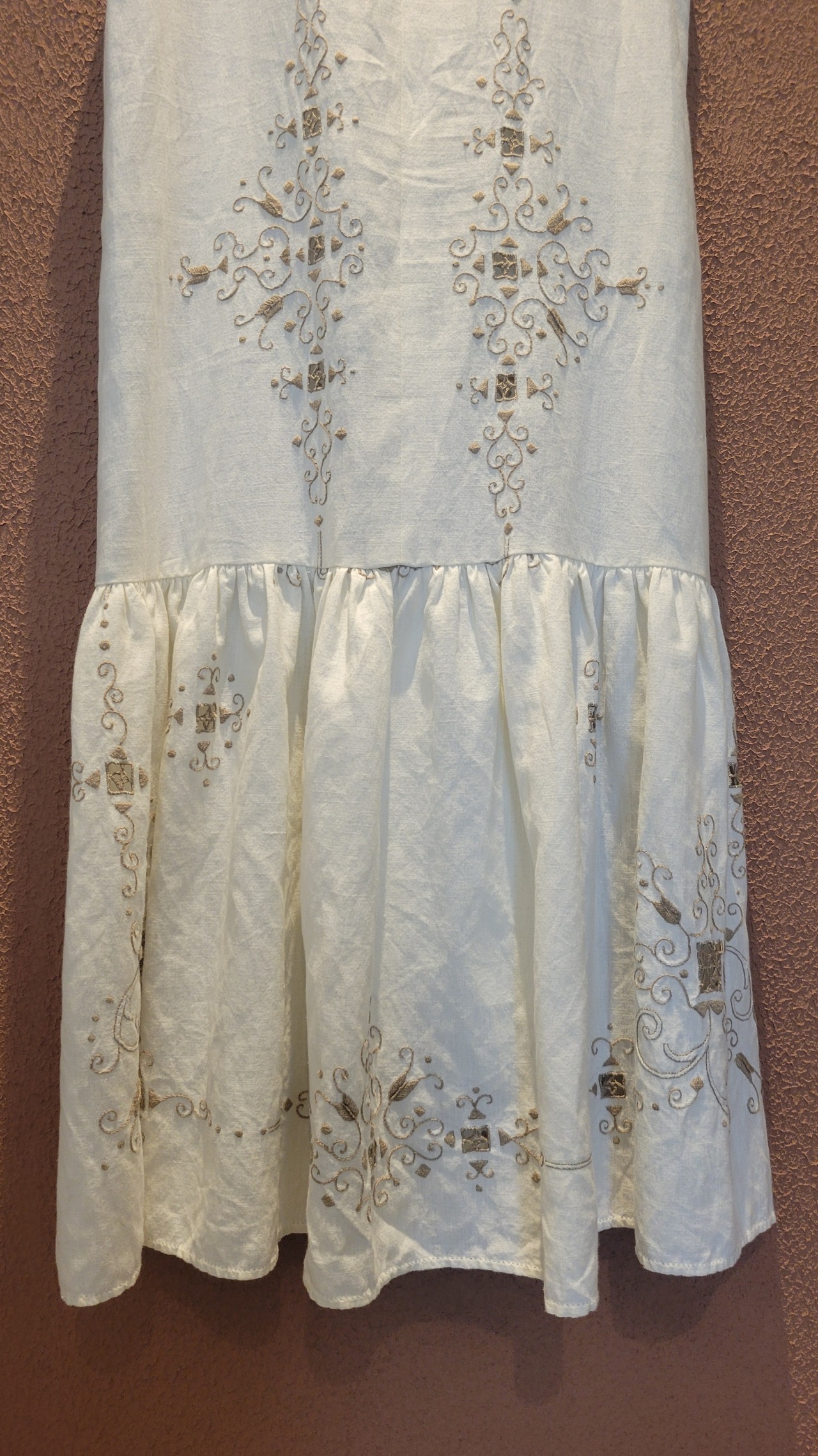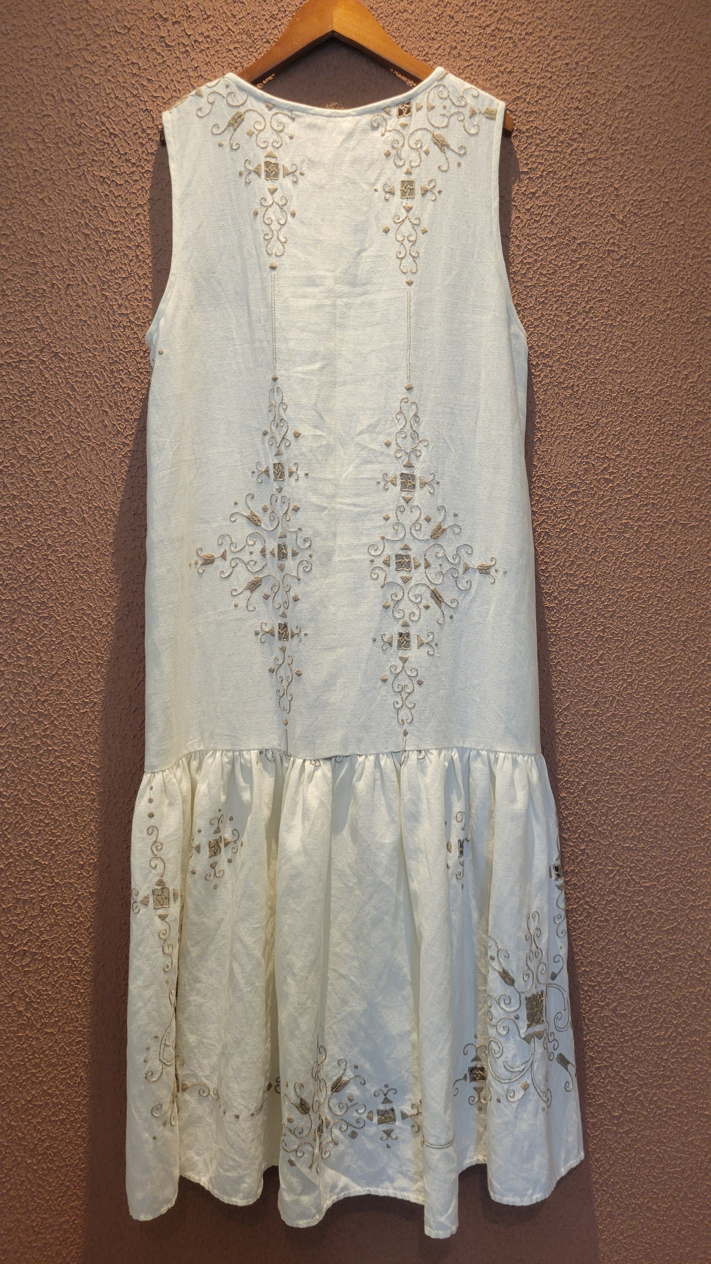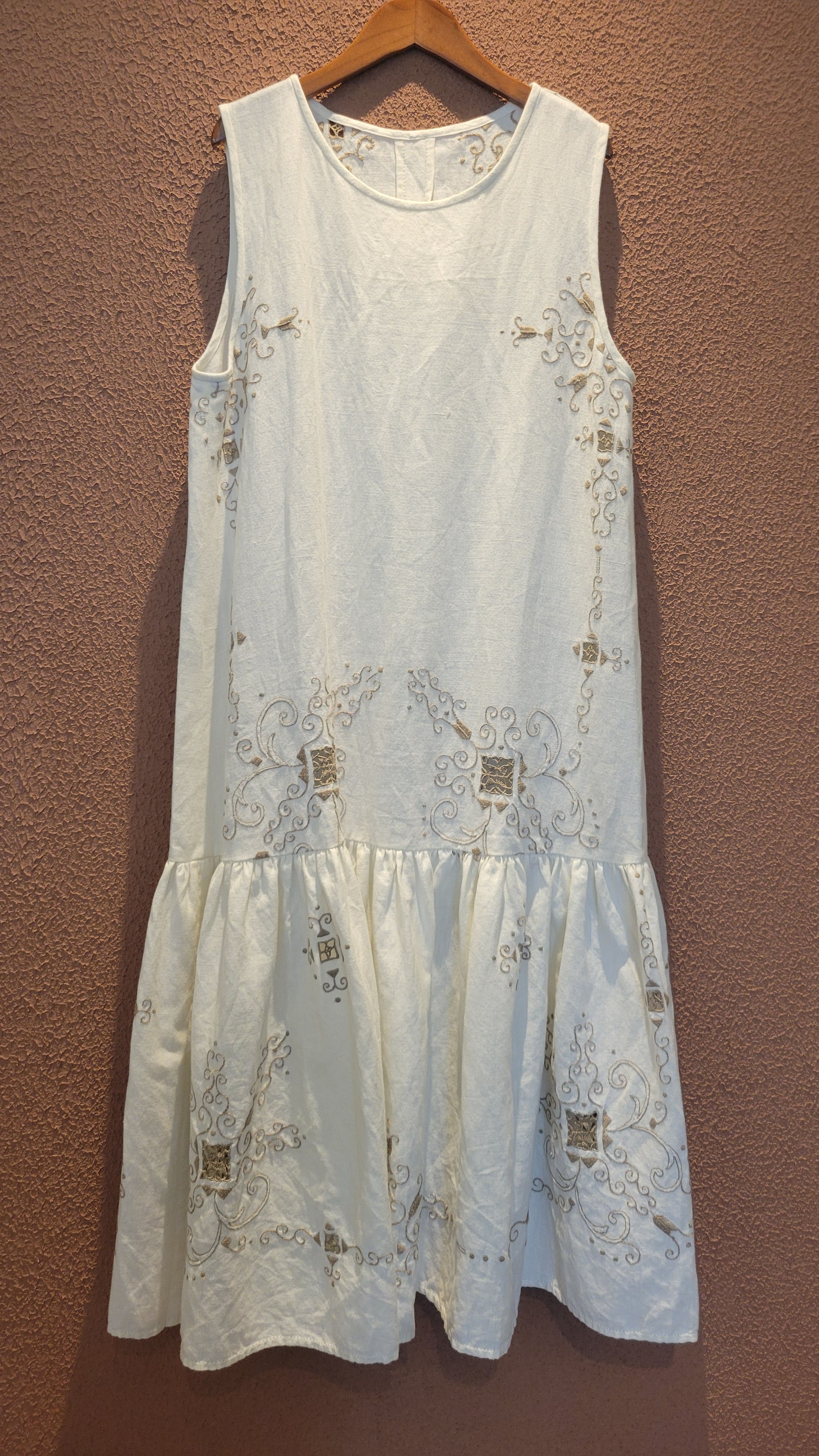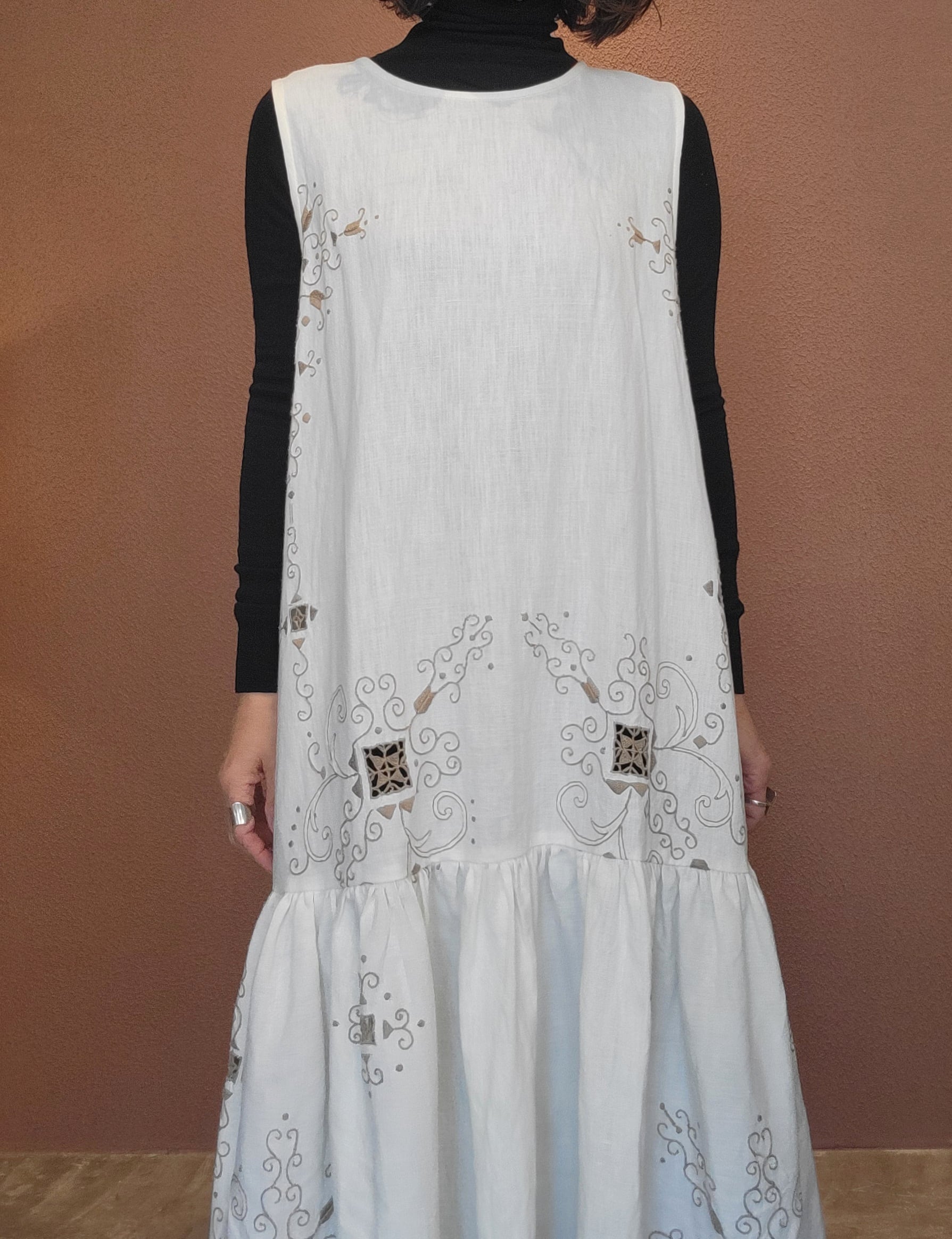 ヴィンテージの刺繍レース生地を使用したリメイクワンピース。素材表記はありませんがコットンのようです。ボタンやファスナーは付いておらず頭から被るようにして着用するプルオーバータイプ、そのため身幅は広めに設定されています。裏地は付いていません。夏は涼しく、秋冬はインナーにタートルネックのニット等を合わせて着用いただけます。