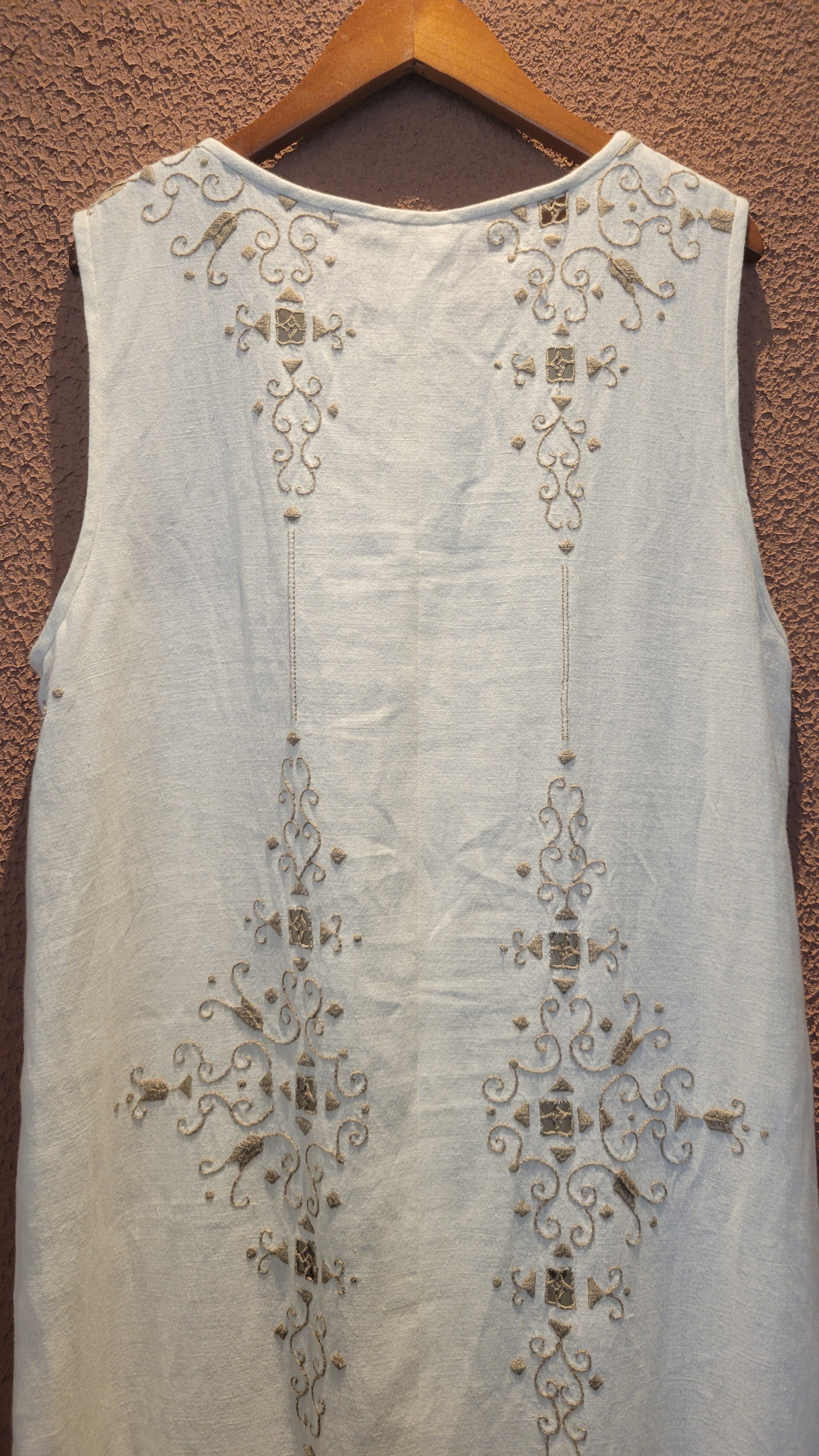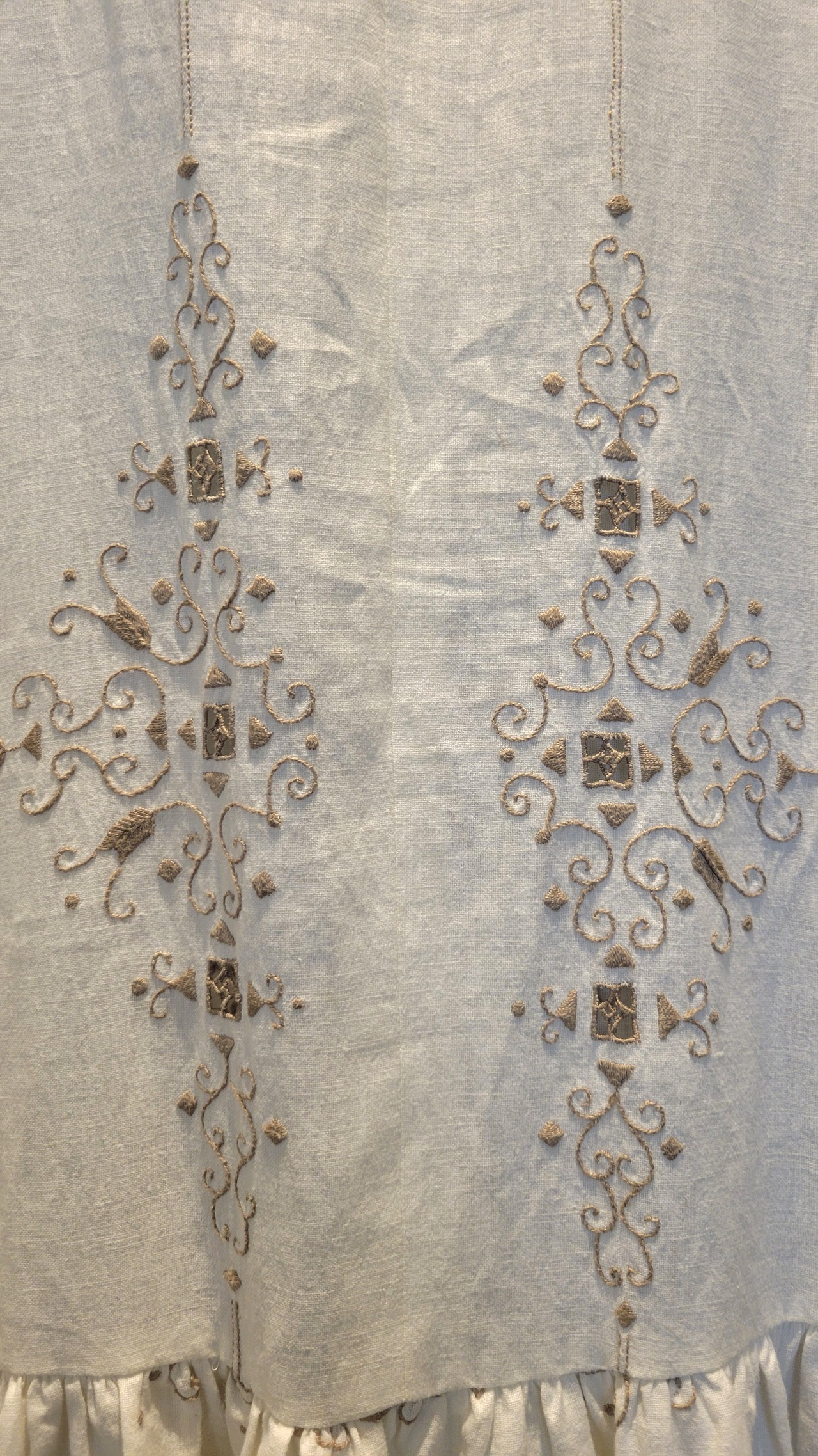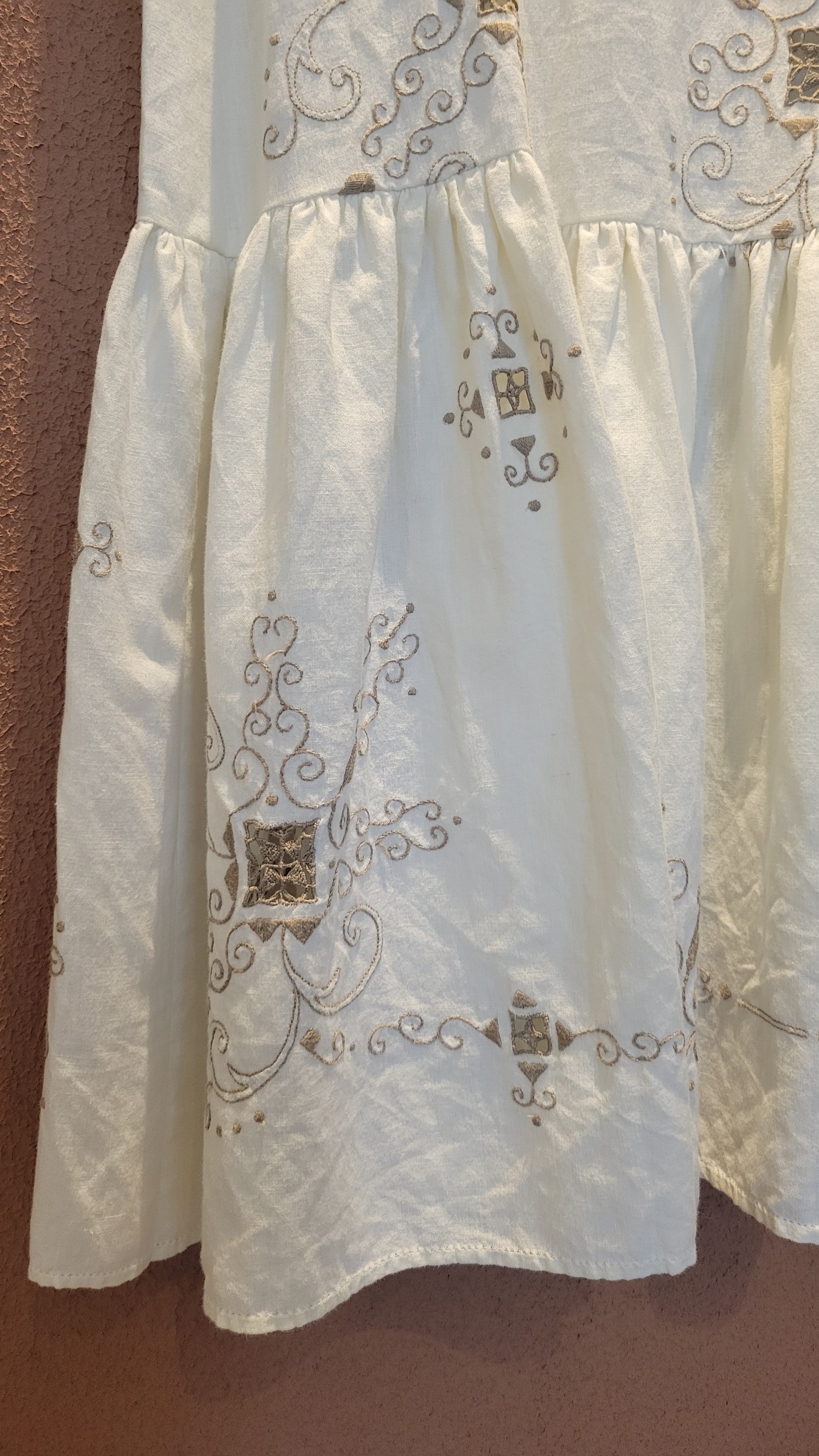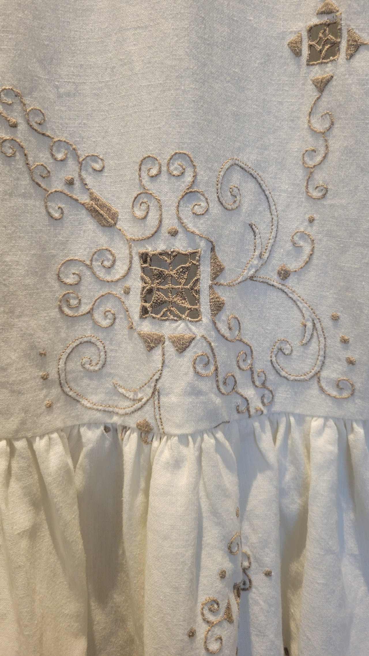ヴィンテージの刺繍レース生地を使用したリメイクワンピース。素材表記はありませんがコットンのようです。ボタンやファスナーは付いておらず頭から被るようにして着用するプルオーバータイプ、そのため身幅は広めに設定されています。裏地は付いていません。夏は涼しく、秋冬はインナーにタートルネックのニット等を合わせて着用いただけます。
