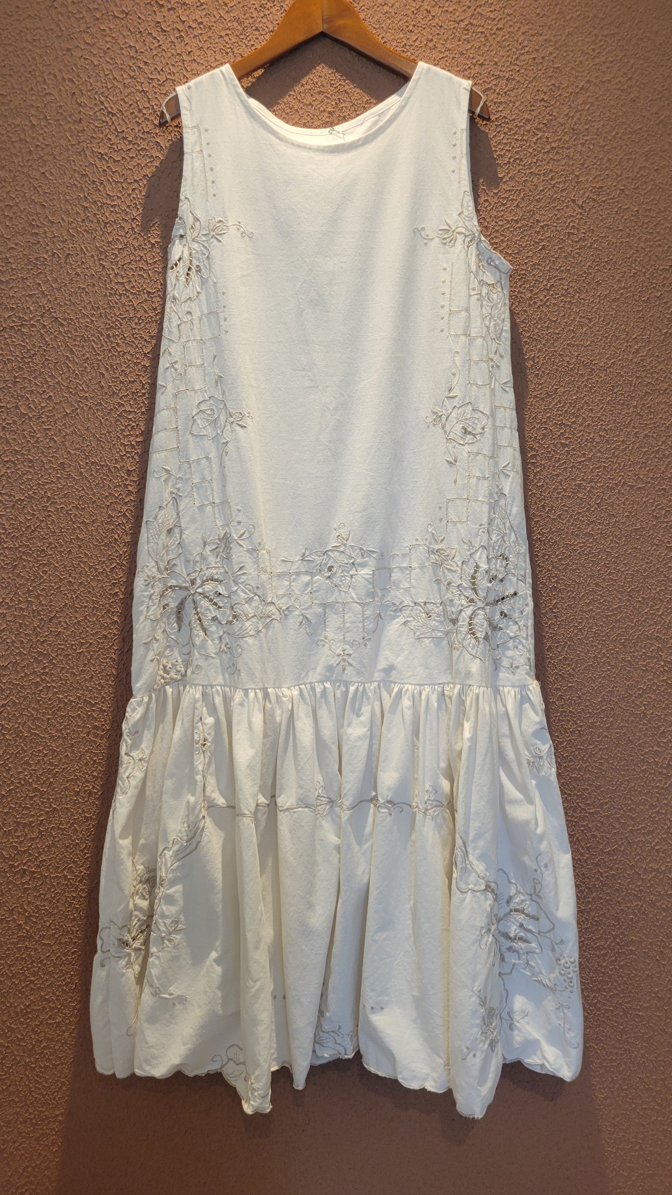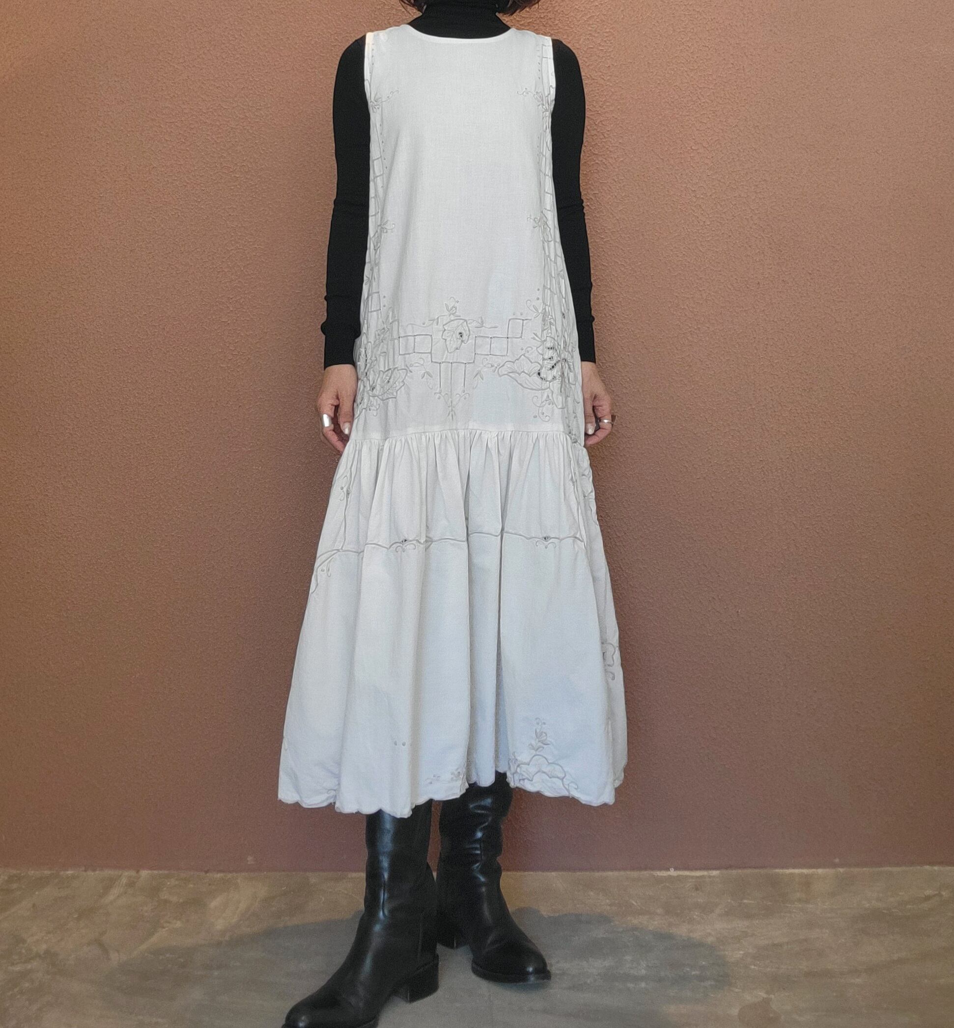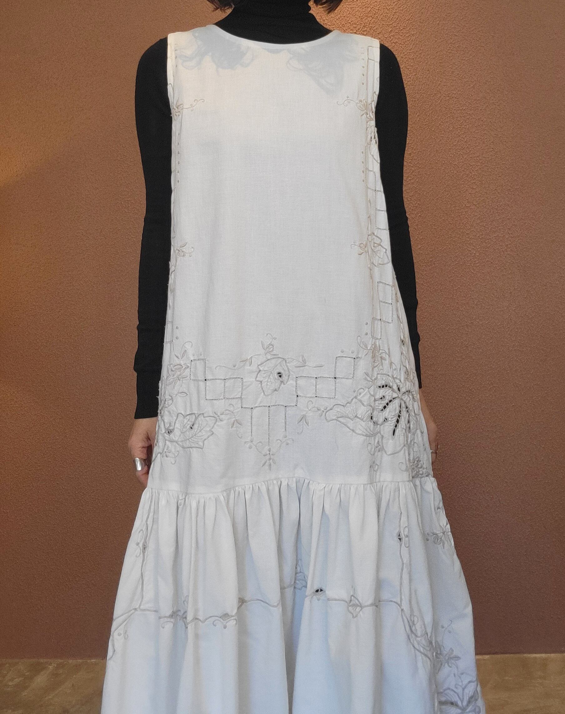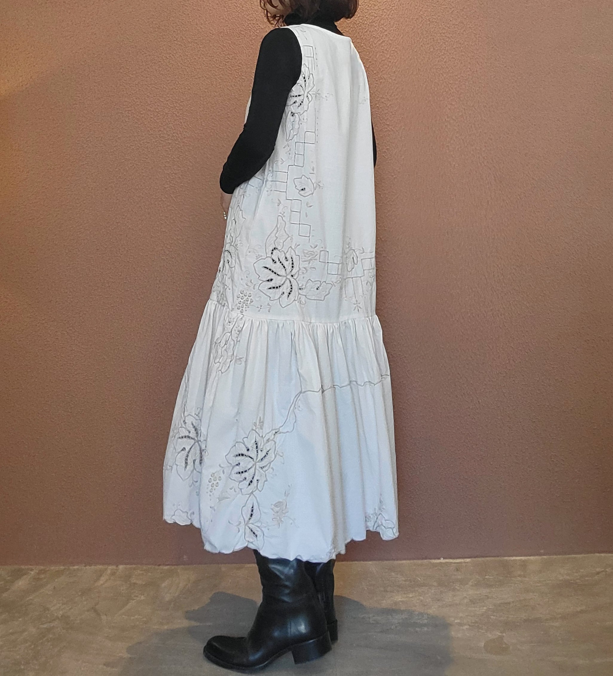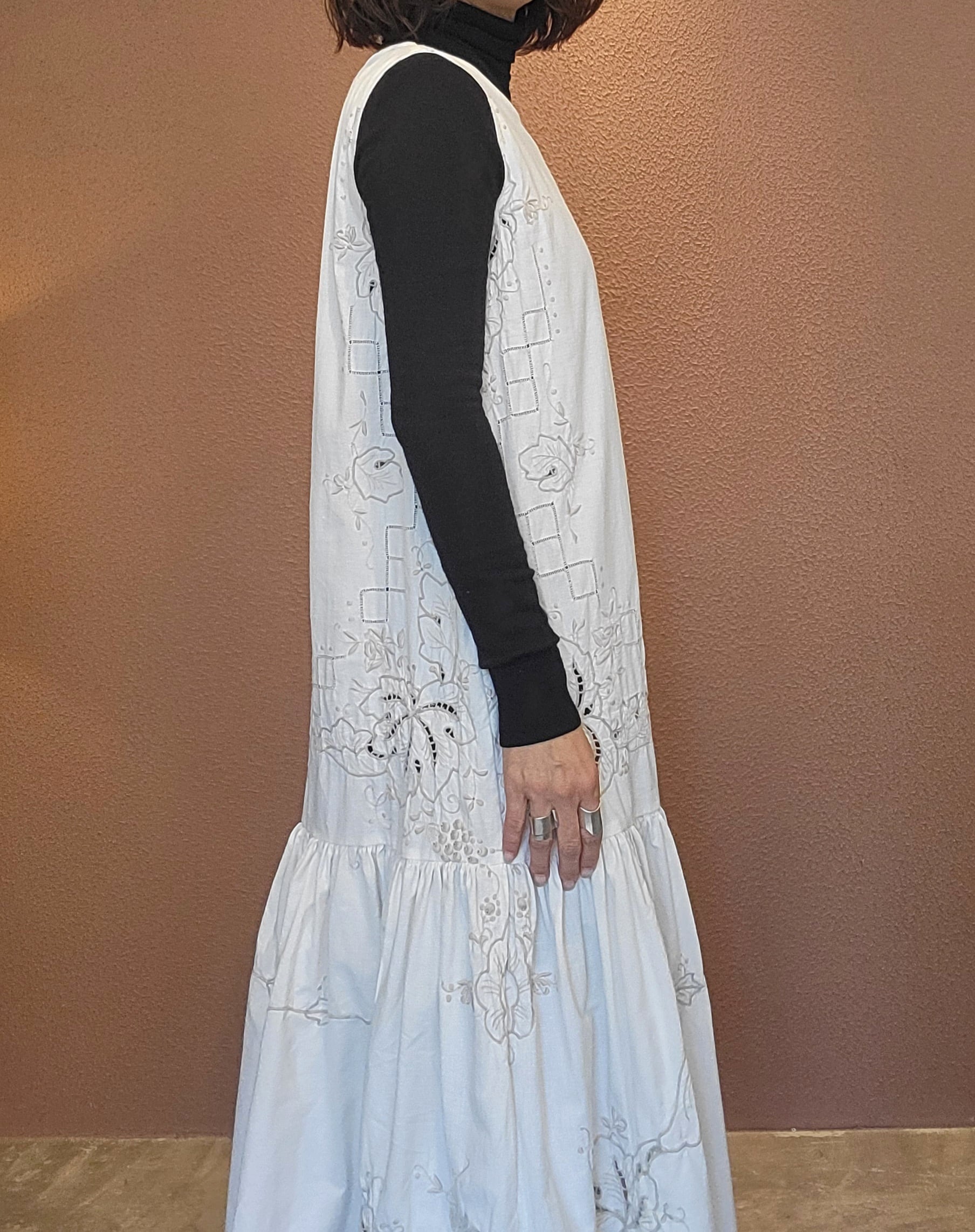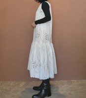ヴィンテージの刺繍レース生地を使用したリメイクワンピース。素材表記はありませんがコットンのようです。ボタンやファスナーは付いておらず頭から被るようにして着用するプルオーバータイプ、そのため身幅は広めに設定されています。裏地は付いていません。夏は涼しく、秋冬はインナーにタートルネックのニット等を合わせて着用いただけます。