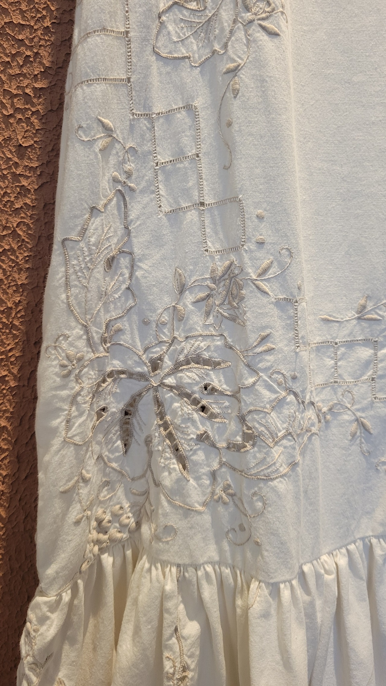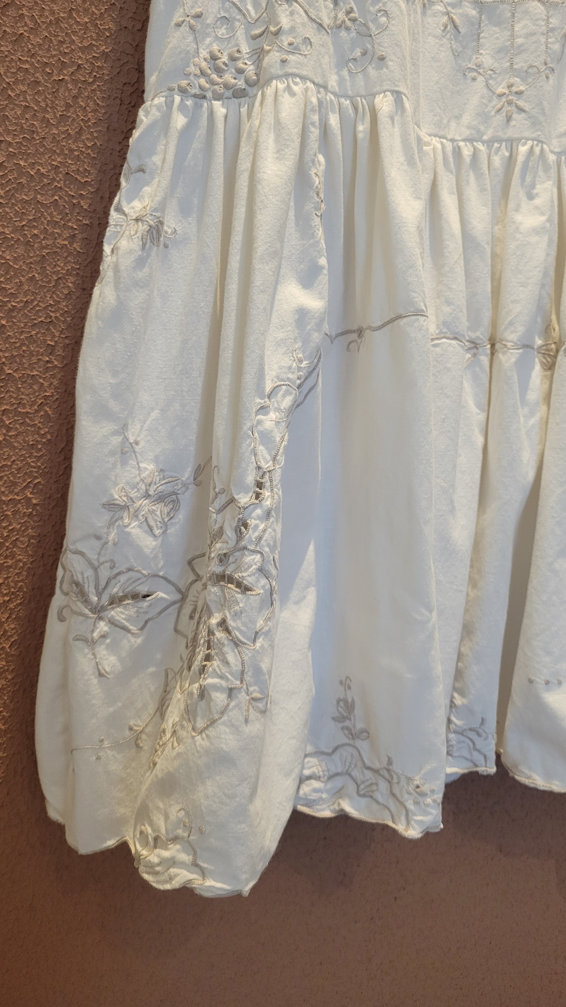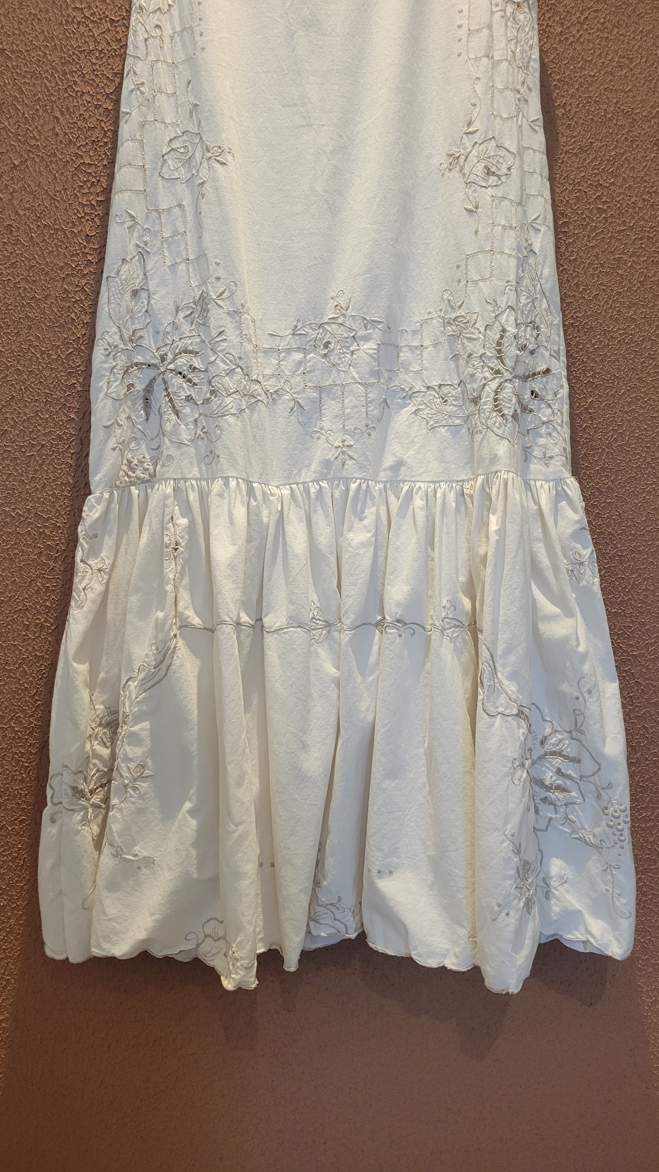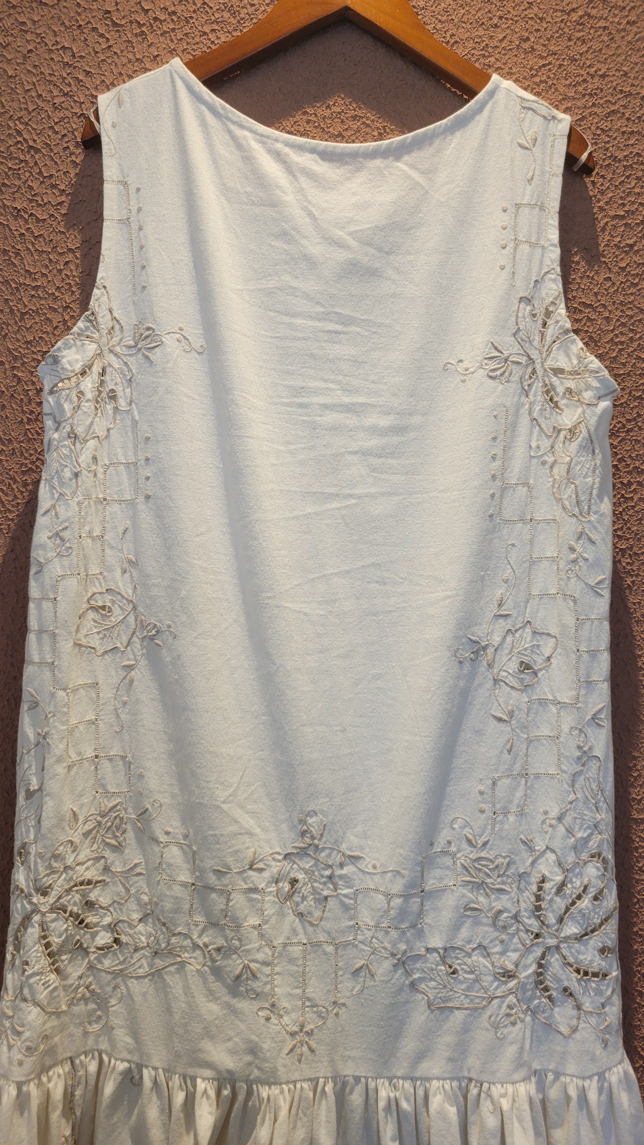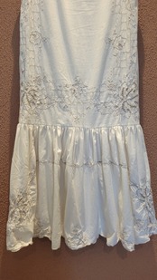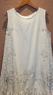 ヴィンテージの刺繍レース生地を使用したリメイクワンピース。素材表記はありませんがコットンのようです。ボタンやファスナーは付いておらず頭から被るようにして着用するプルオーバータイプ、そのため身幅は広めに設定されています。裏地は付いていません。夏は涼しく、秋冬はインナーにタートルネックのニット等を合わせて着用いただけます。