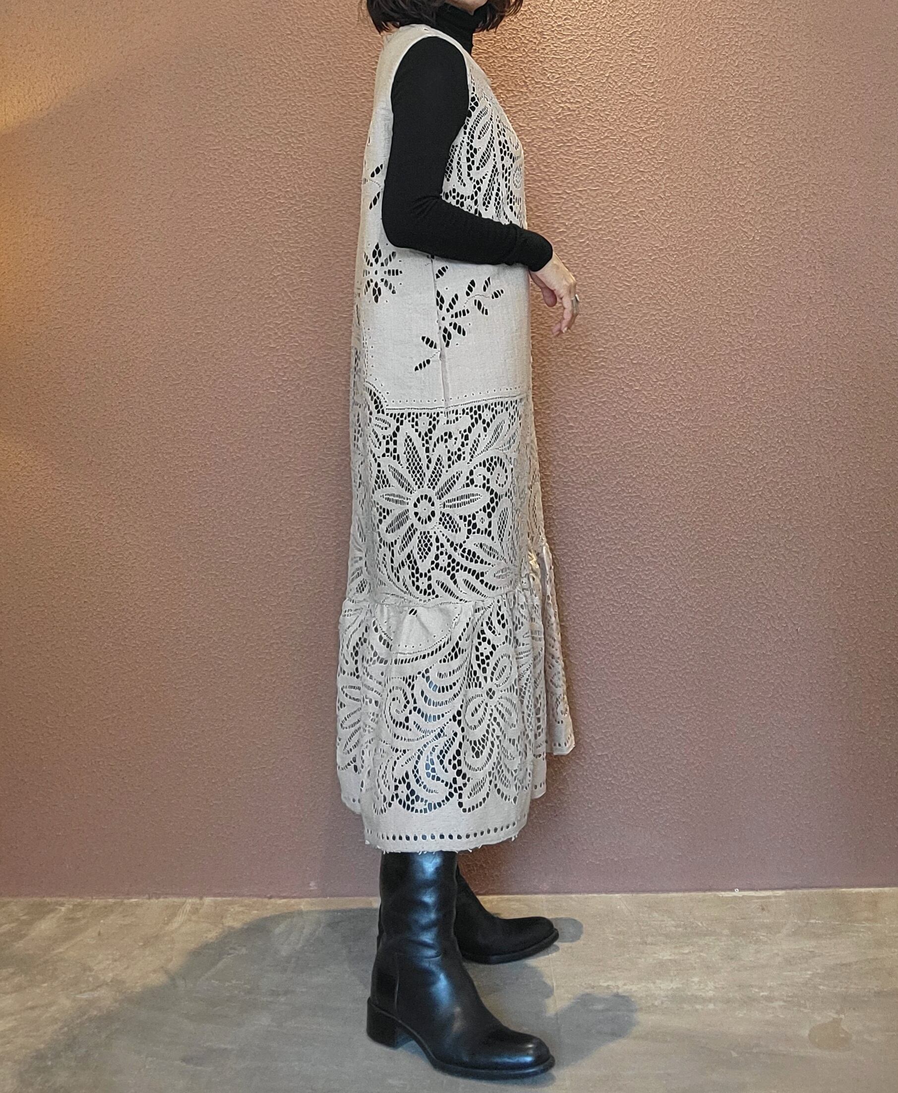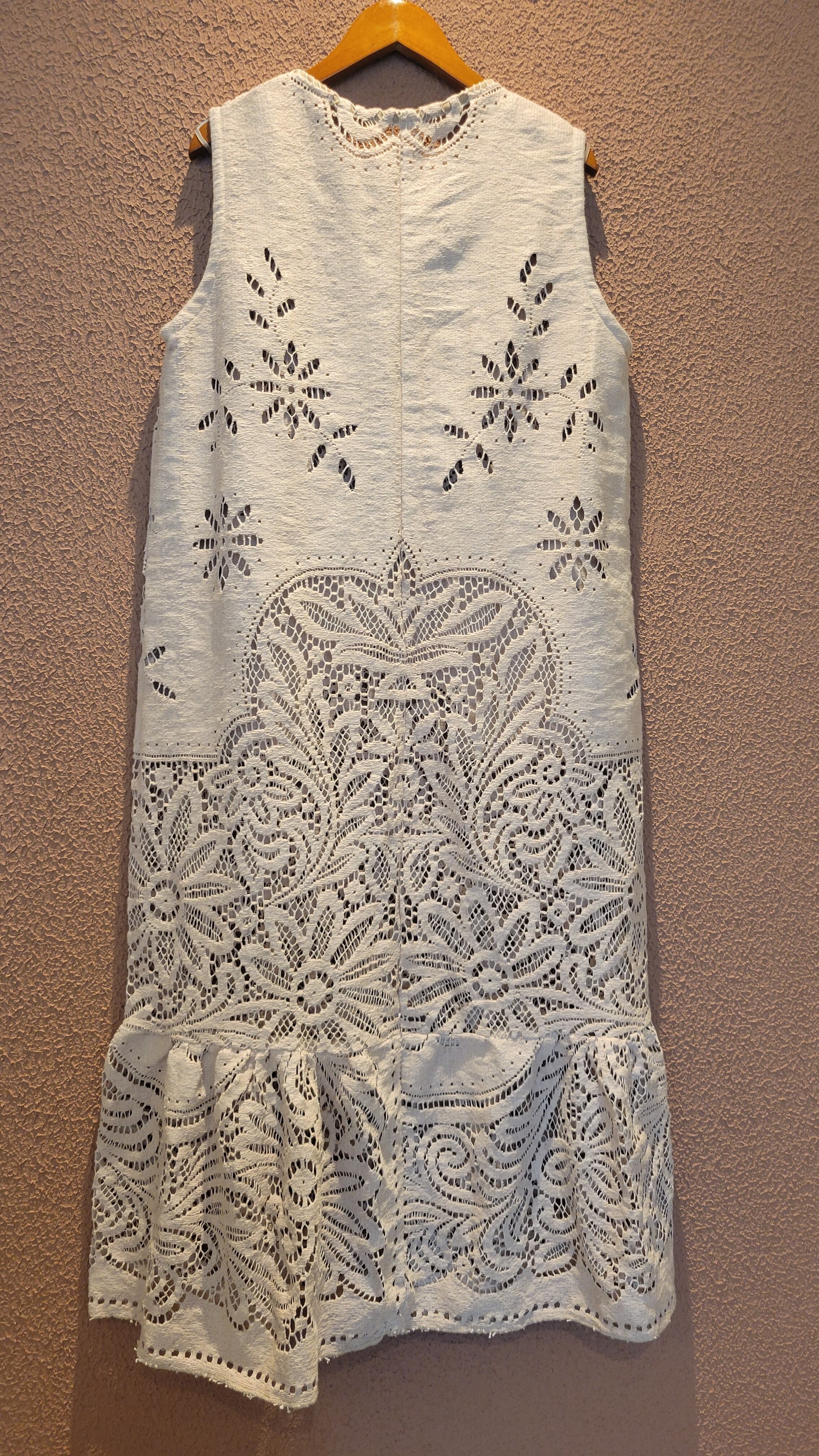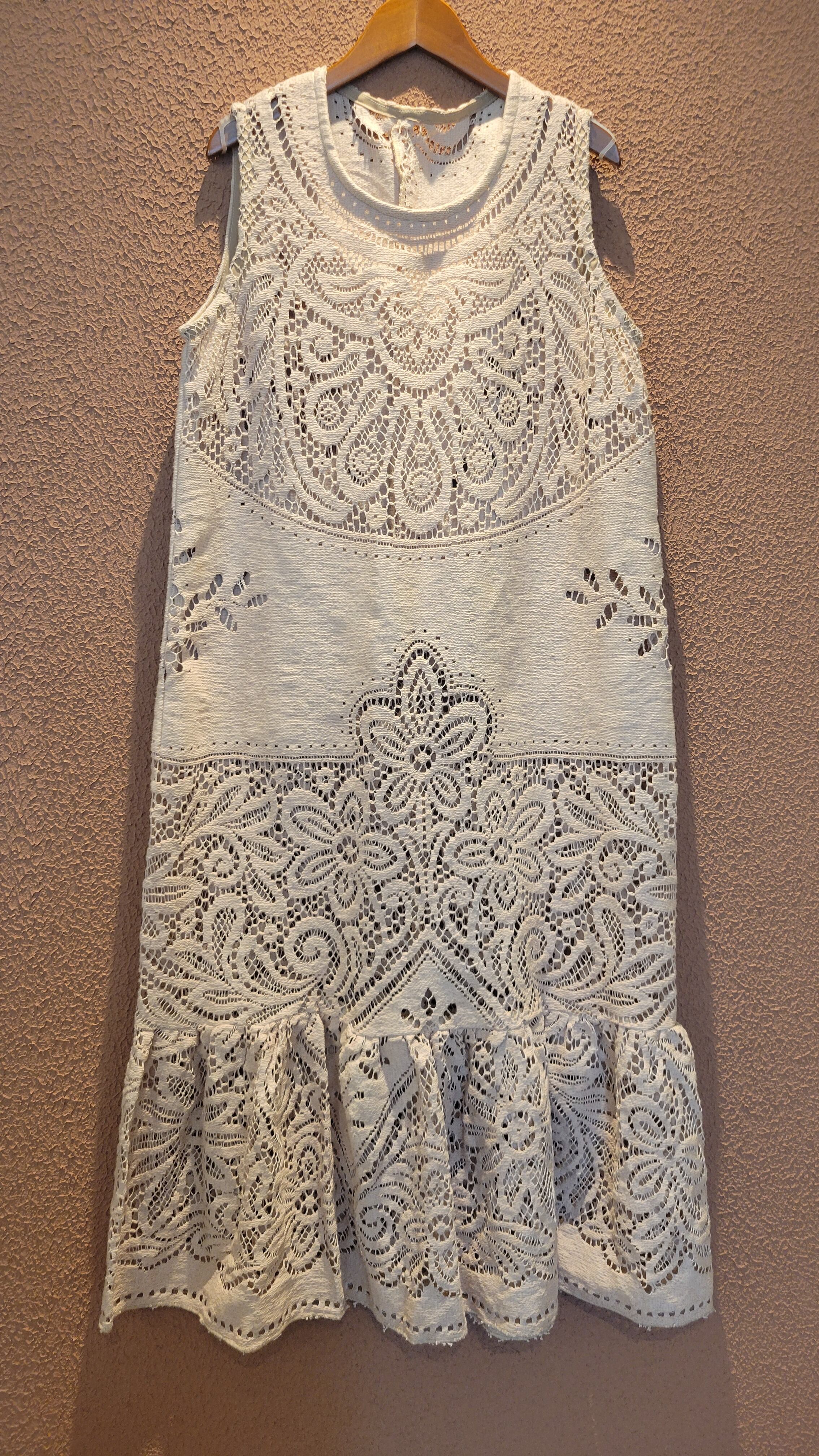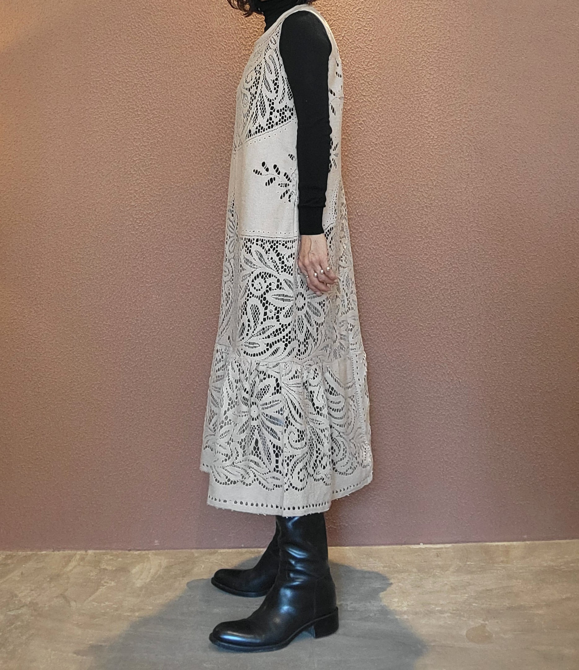 ヴィンテージレースを使用したリメイクワンピース。素材表記はありませんがコットンのようです。ボタンやファスナーは付いておらず頭から被るようにして着用するプルオーバータイプ、そのため身幅は広めに設定されています。裏地は付いていません。夏は涼しく、秋冬はインナーにタートルネックのニット等を合わせて着用いただけます。