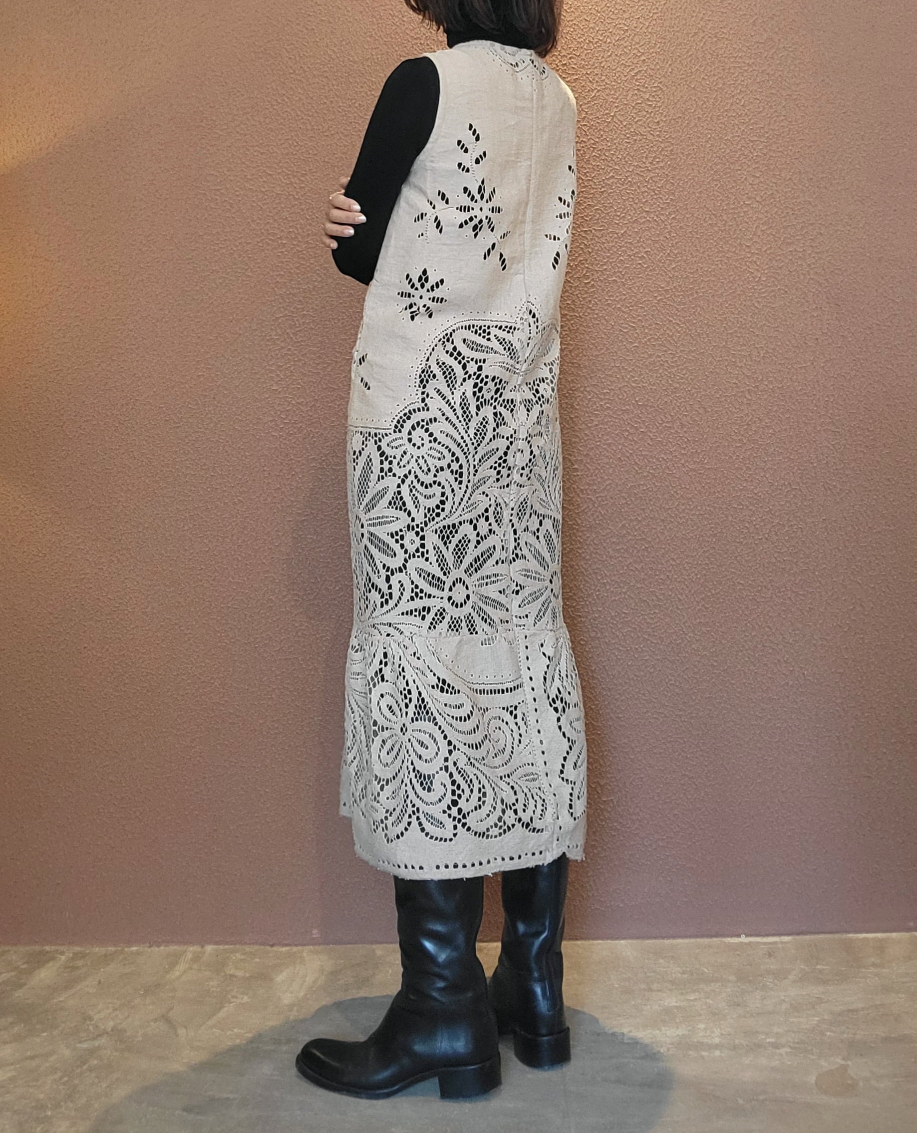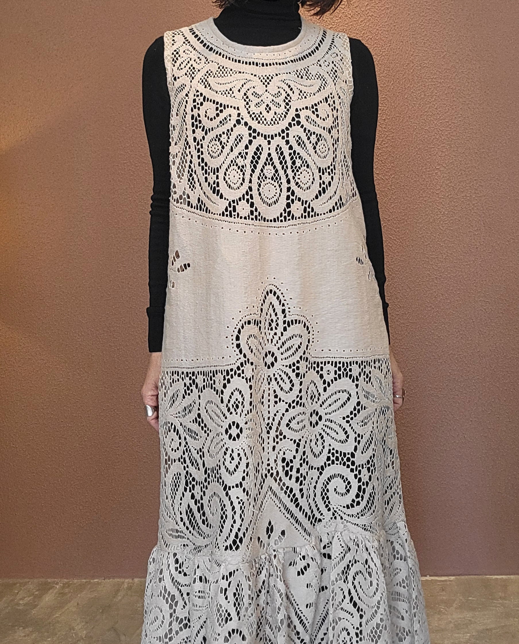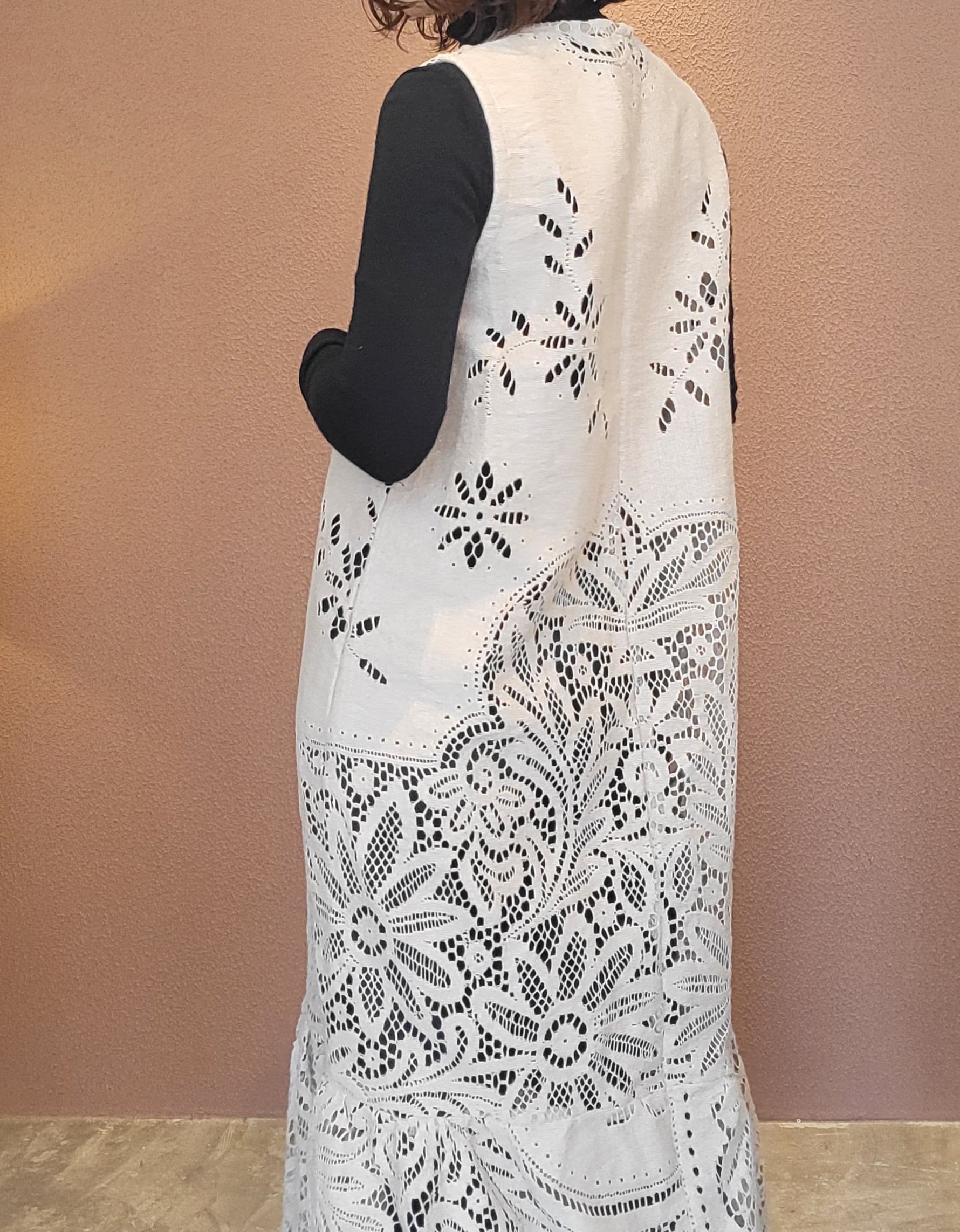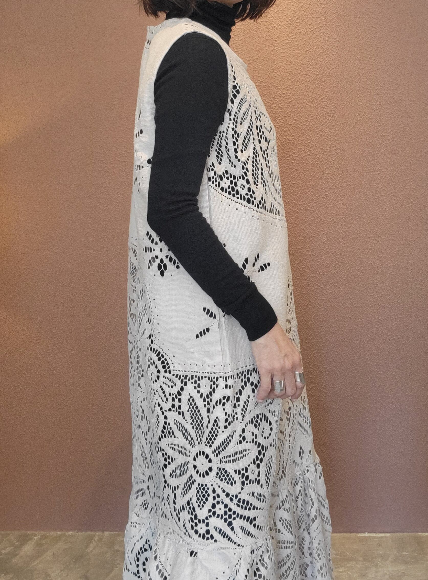 ヴィンテージレースを使用したリメイクワンピース。素材表記はありませんがコットンのようです。ボタンやファスナーは付いておらず頭から被るようにして着用するプルオーバータイプ、そのため身幅は広めに設定されています。裏地は付いていません。夏は涼しく、秋冬はインナーにタートルネックのニット等を合わせて着用いただけます。