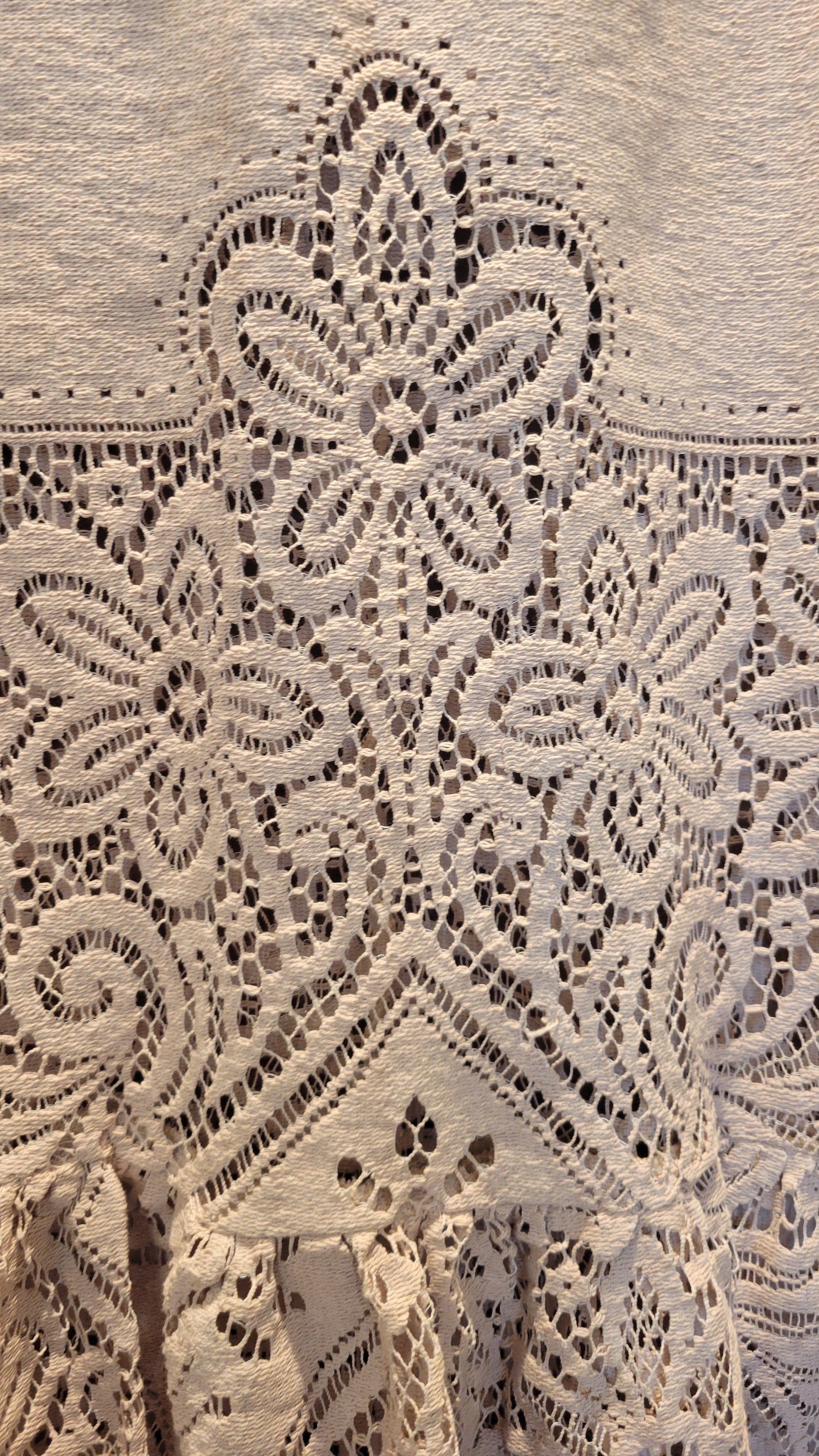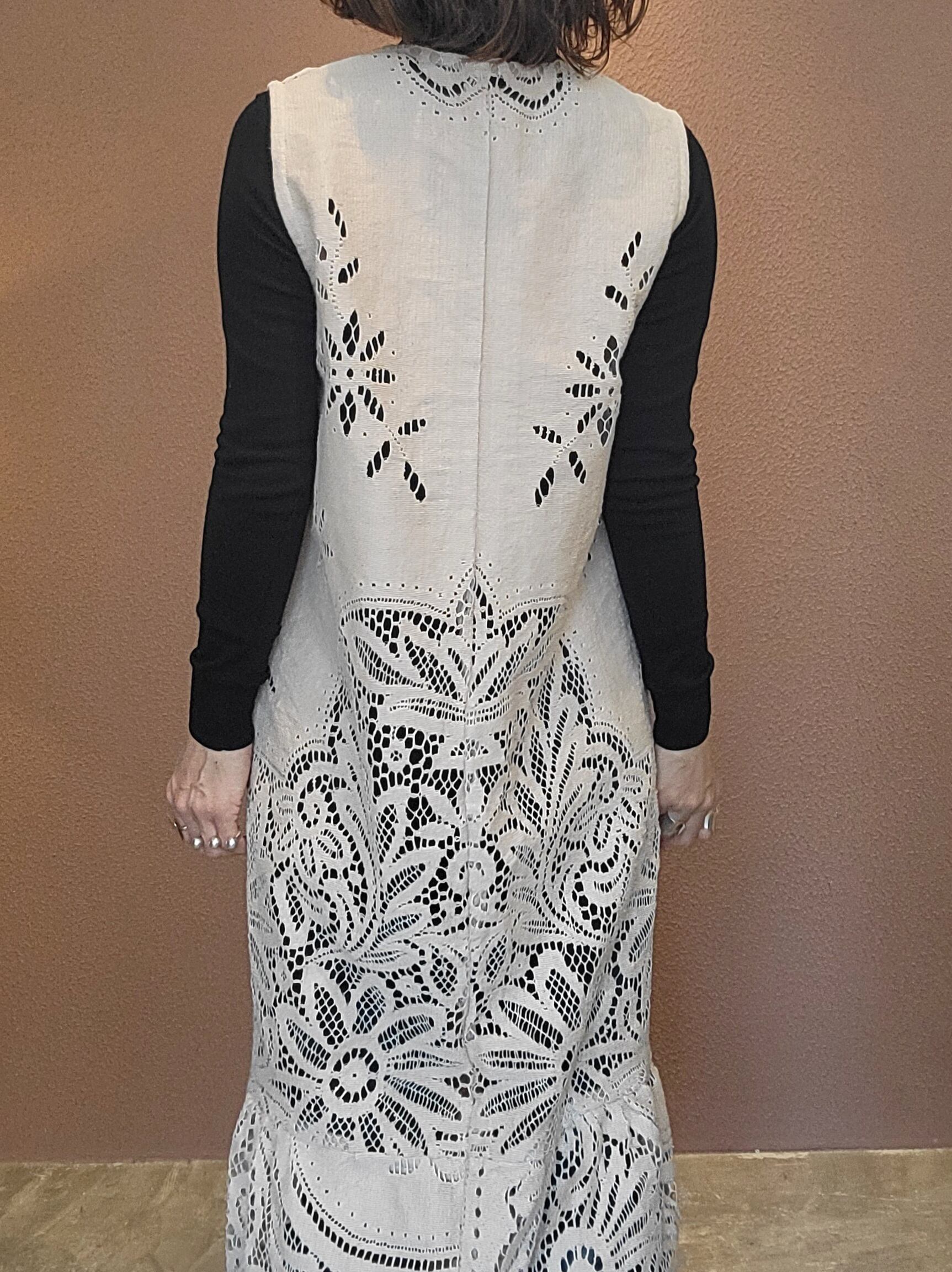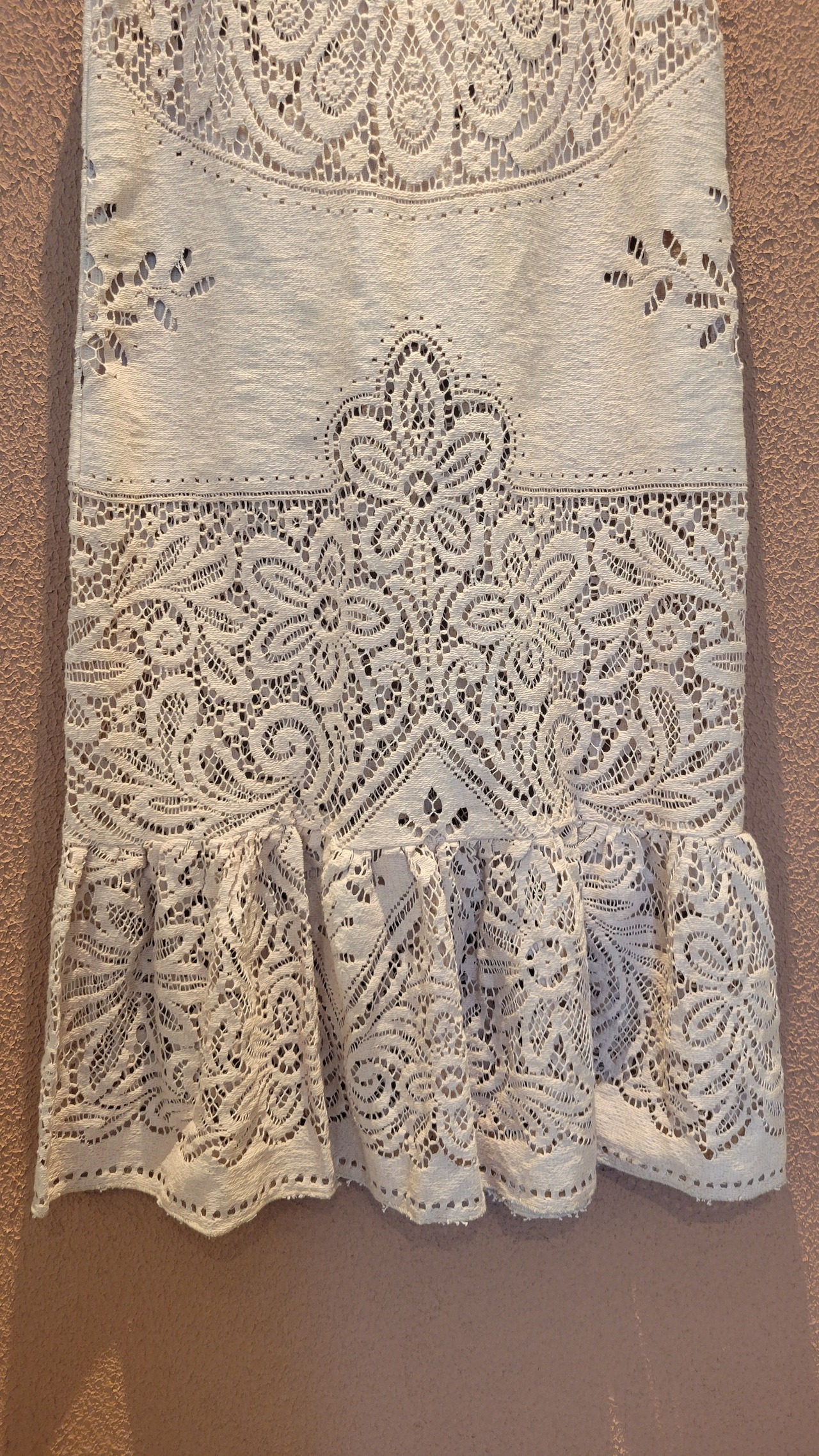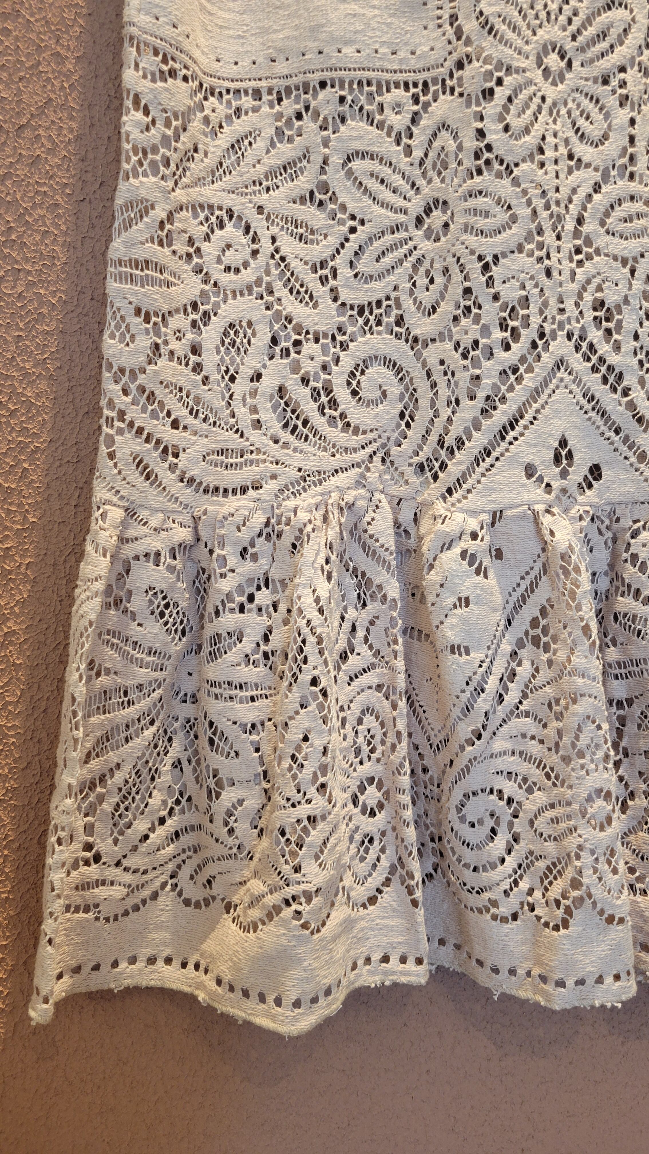 ヴィンテージレースを使用したリメイクワンピース。素材表記はありませんがコットンのようです。ボタンやファスナーは付いておらず頭から被るようにして着用するプルオーバータイプ、そのため身幅は広めに設定されています。裏地は付いていません。夏は涼しく、秋冬はインナーにタートルネックのニット等を合わせて着用いただけます。