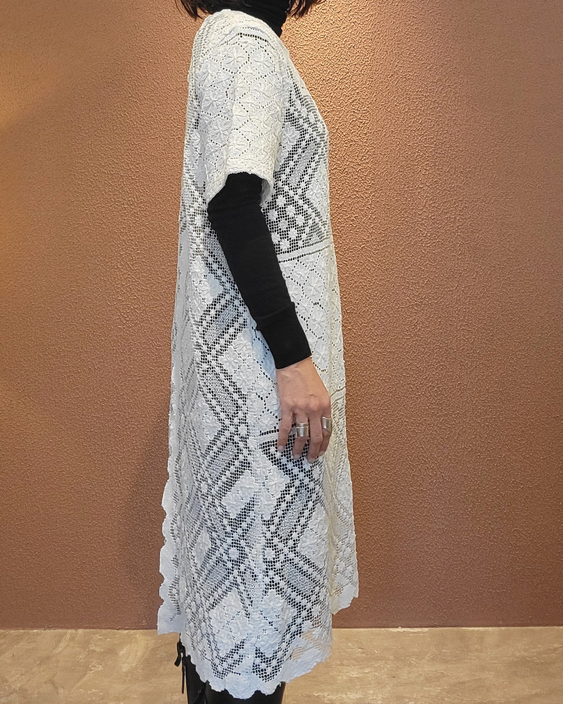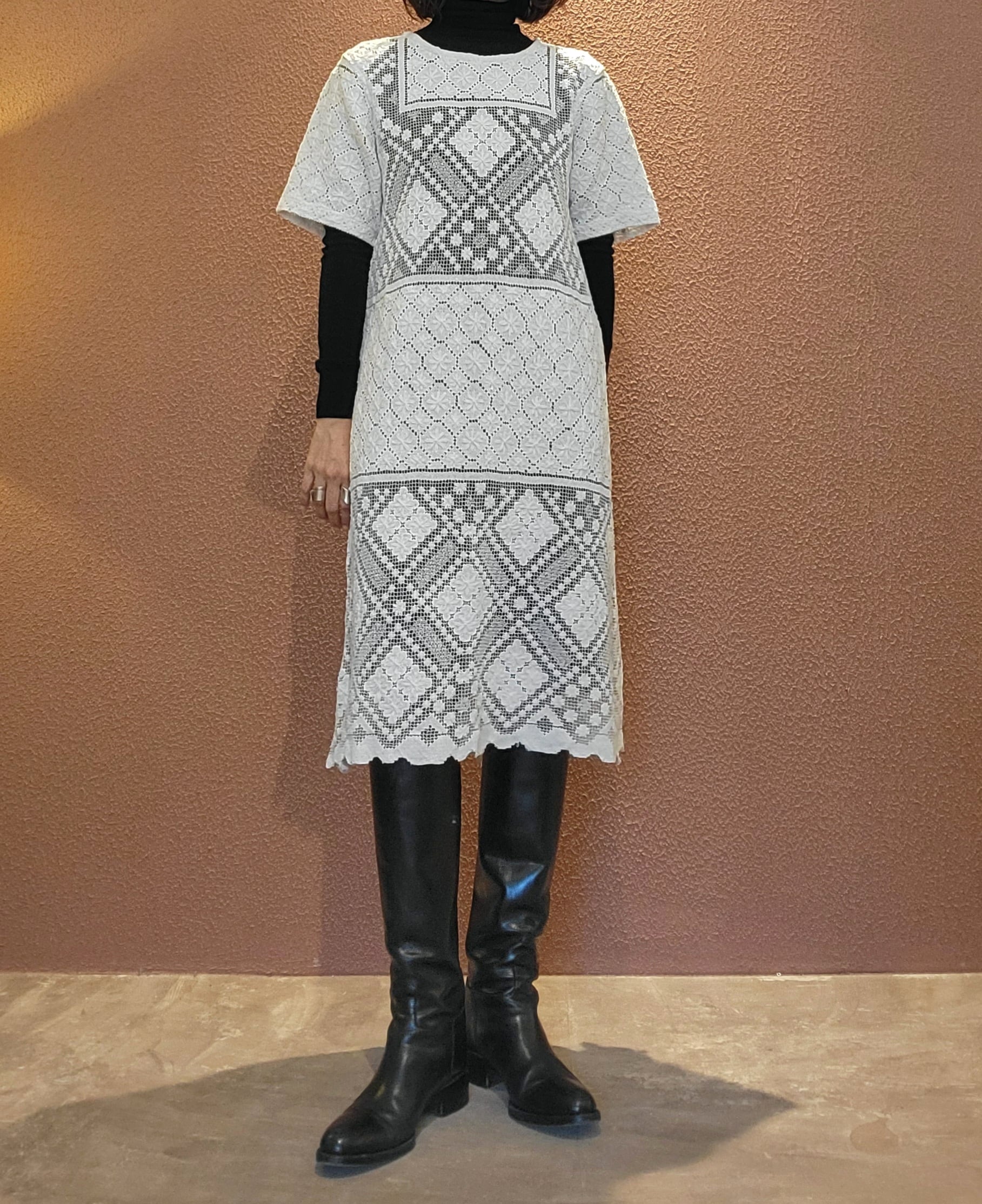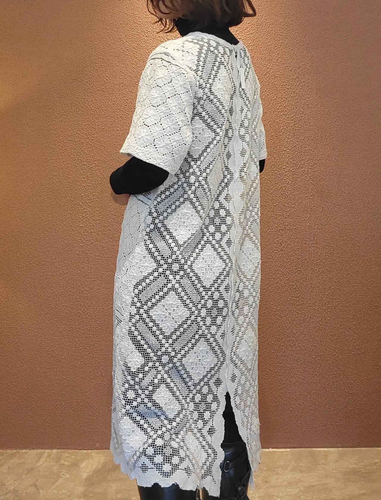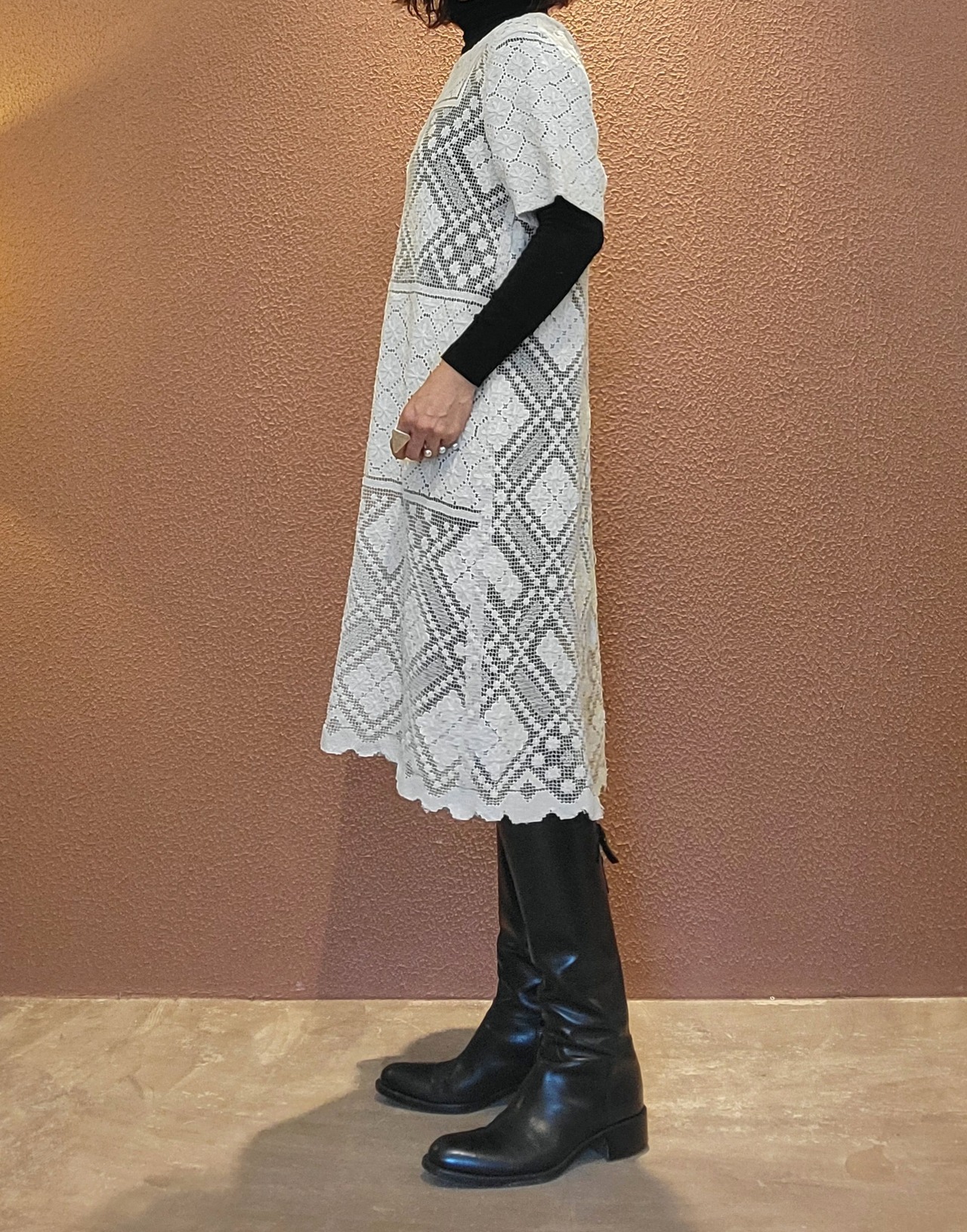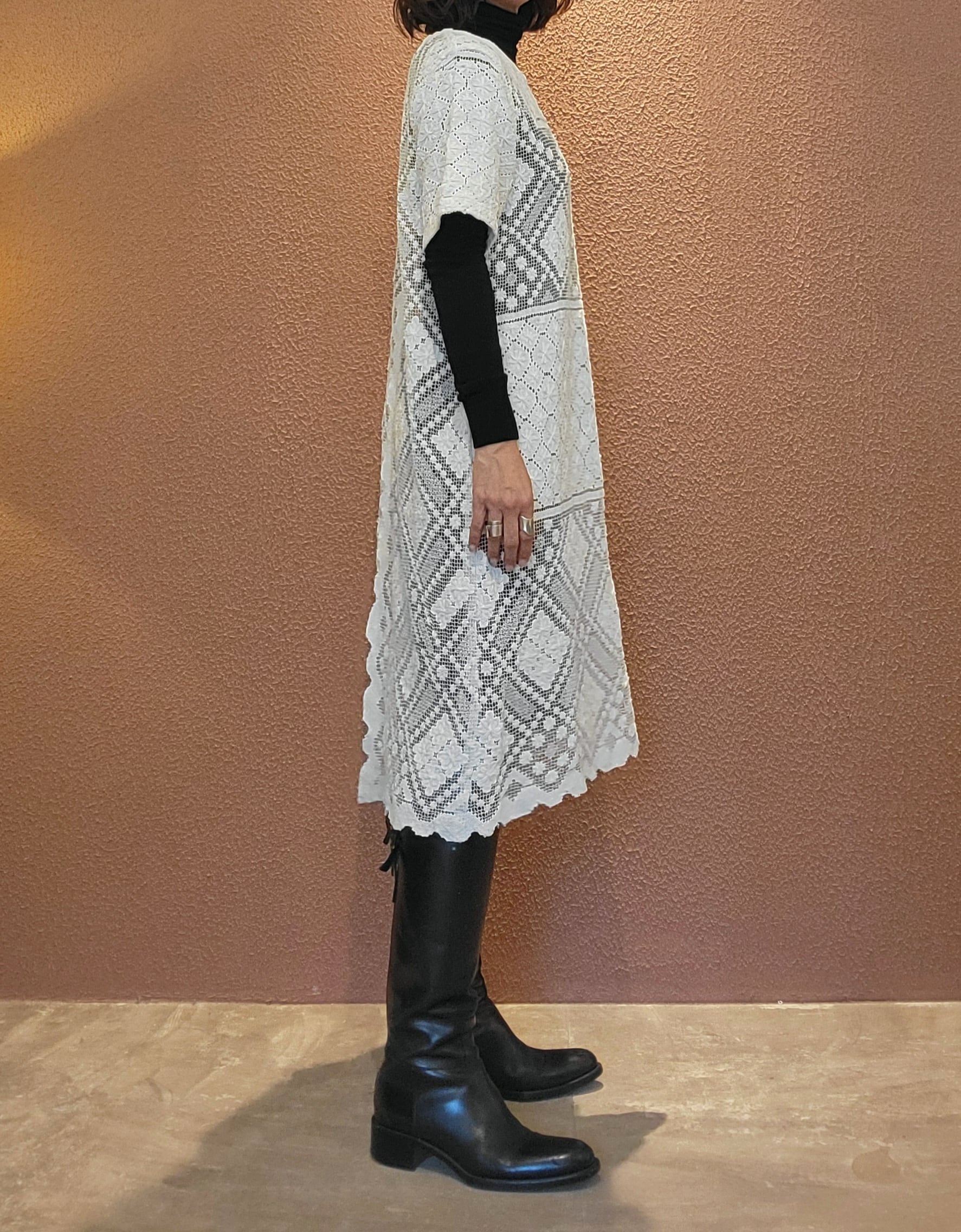 ヴィンテージレースを使用したリメイクワンピース。素材表記はありませんがコットンのようです。ボタンやファスナーは付いておらず頭から被るようにして着用するプルオーバータイプ。裏地は付いていません。夏は涼しく、秋冬はインナーにタートルネックのニット等を合わせて着用いただけます。