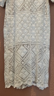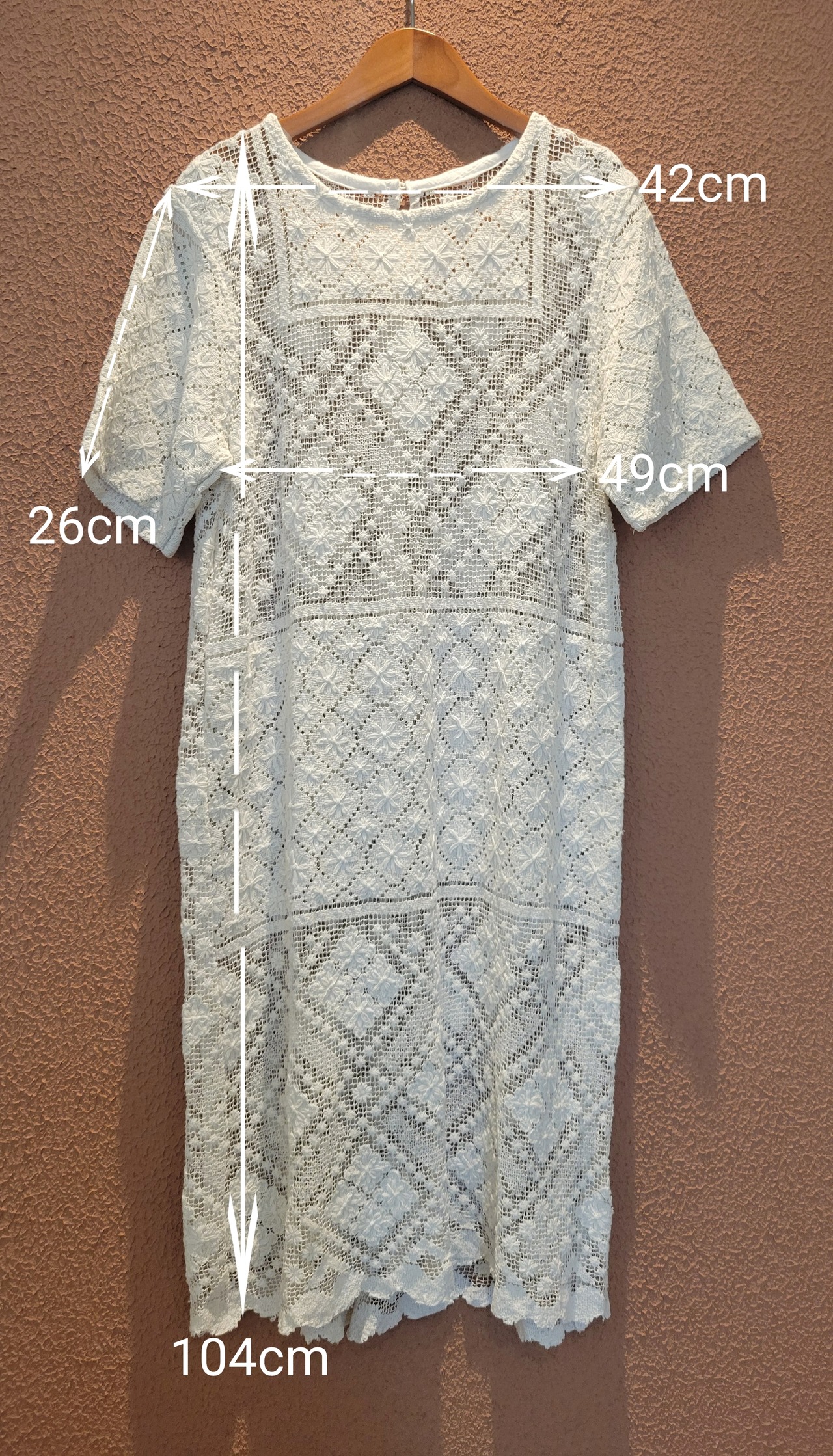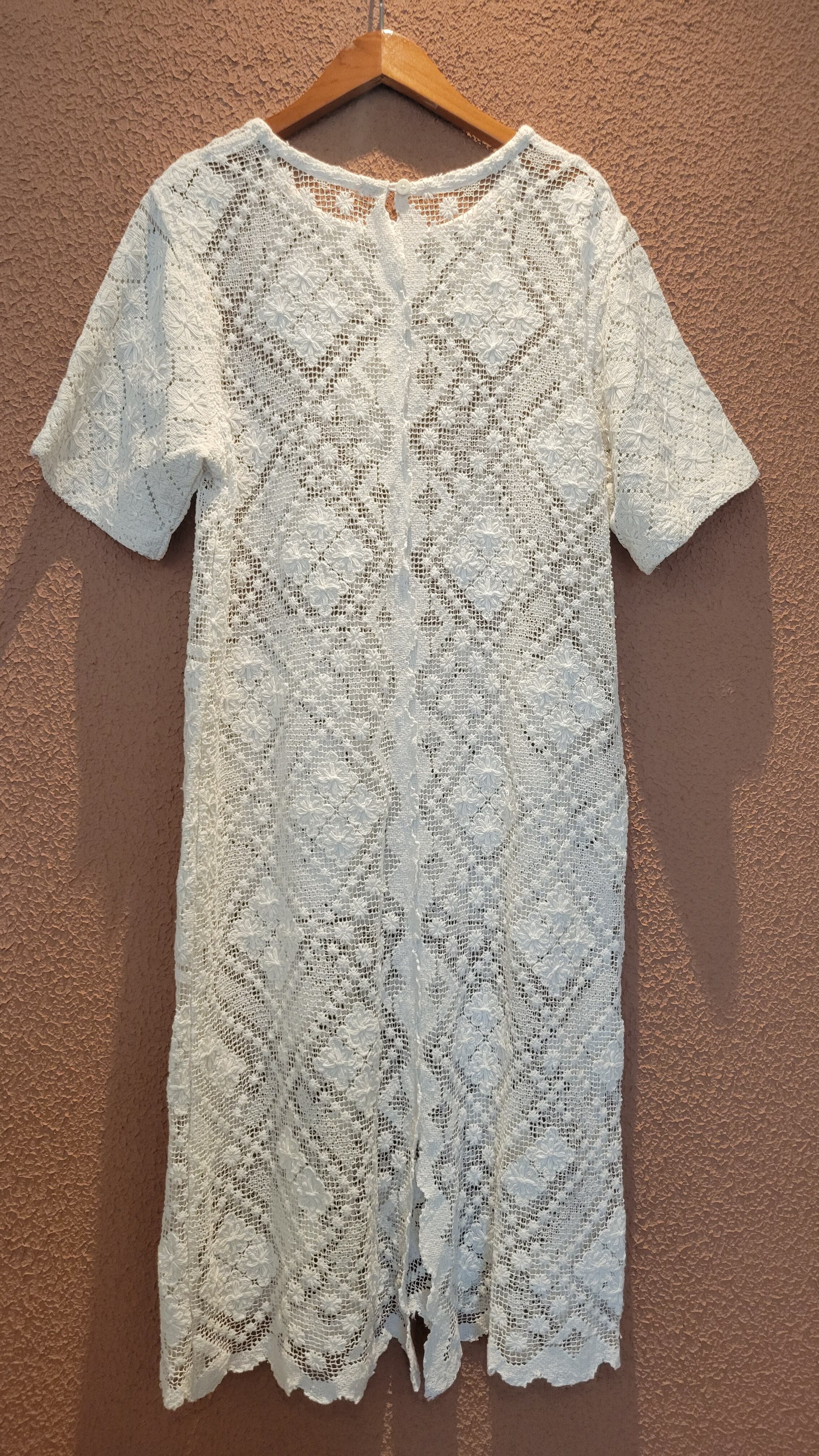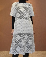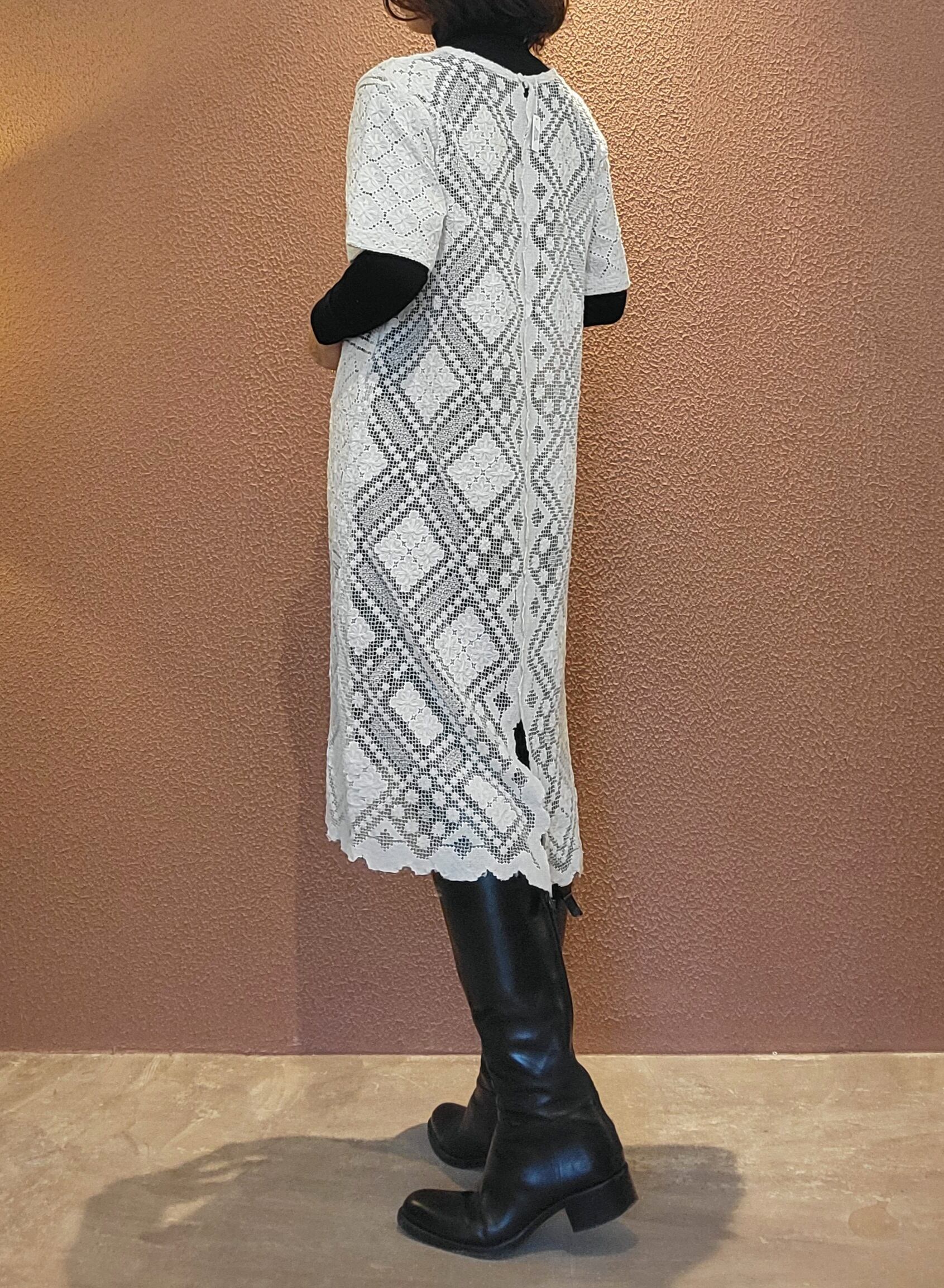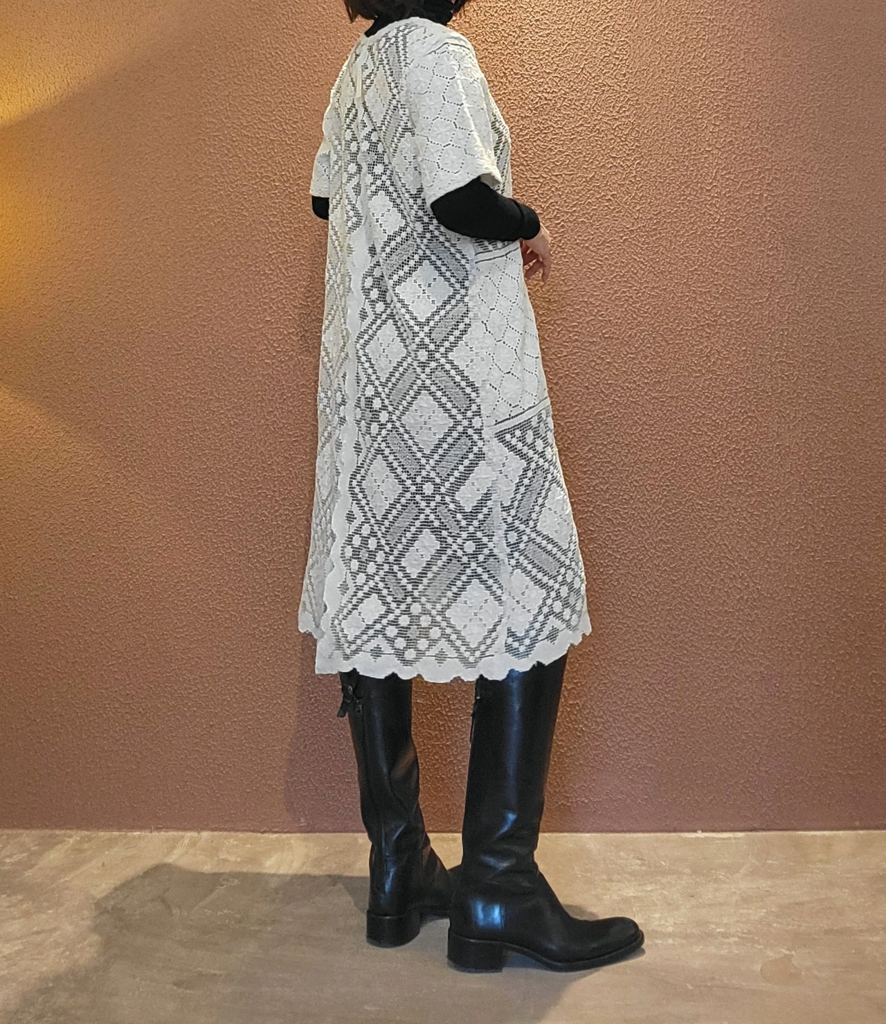 ヴィンテージレースを使用したリメイクワンピース。素材表記はありませんがコットンのようです。ボタンやファスナーは付いておらず頭から被るようにして着用するプルオーバータイプ。裏地は付いていません。夏は涼しく、秋冬はインナーにタートルネックのニット等を合わせて着用いただけます。