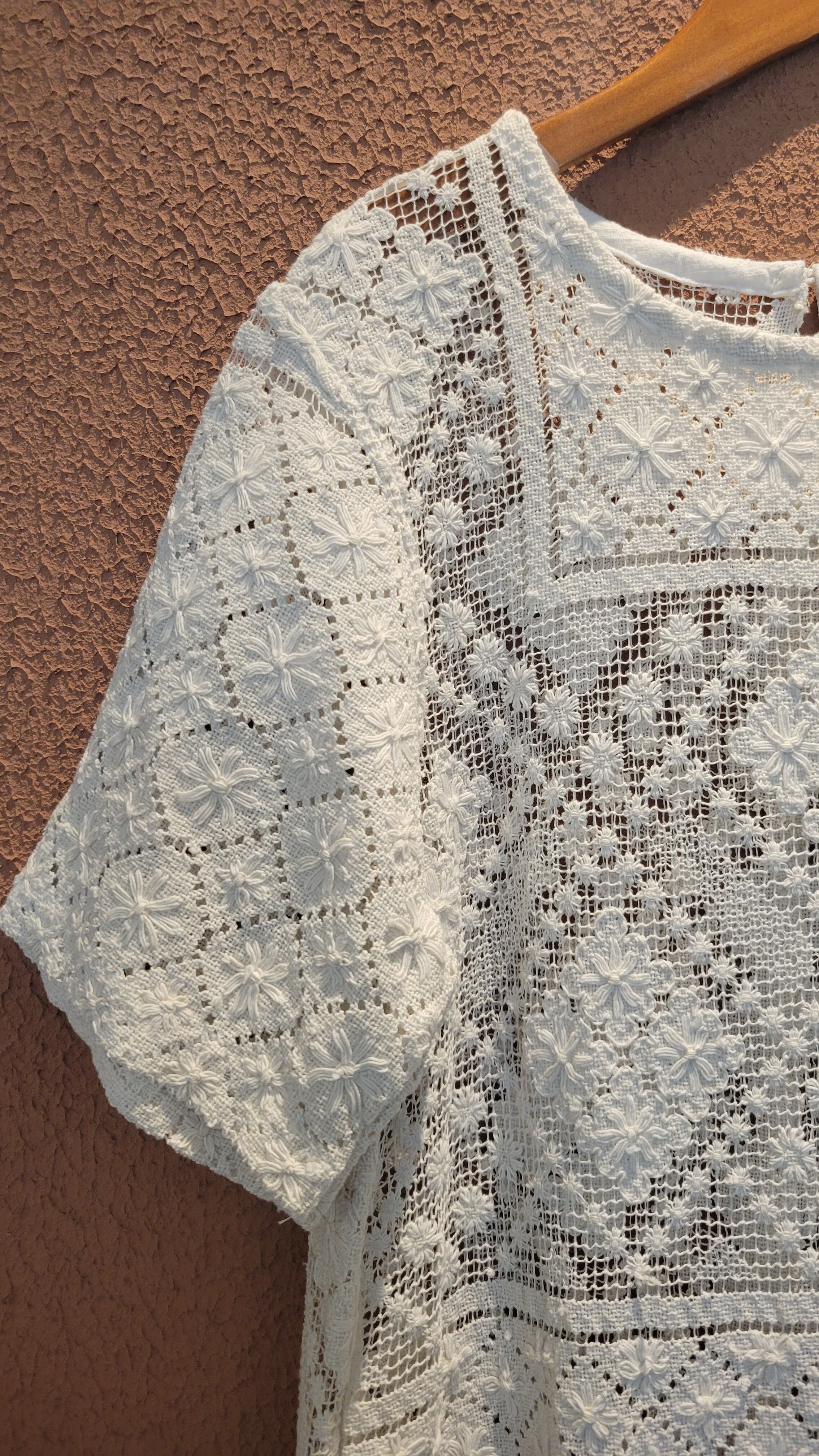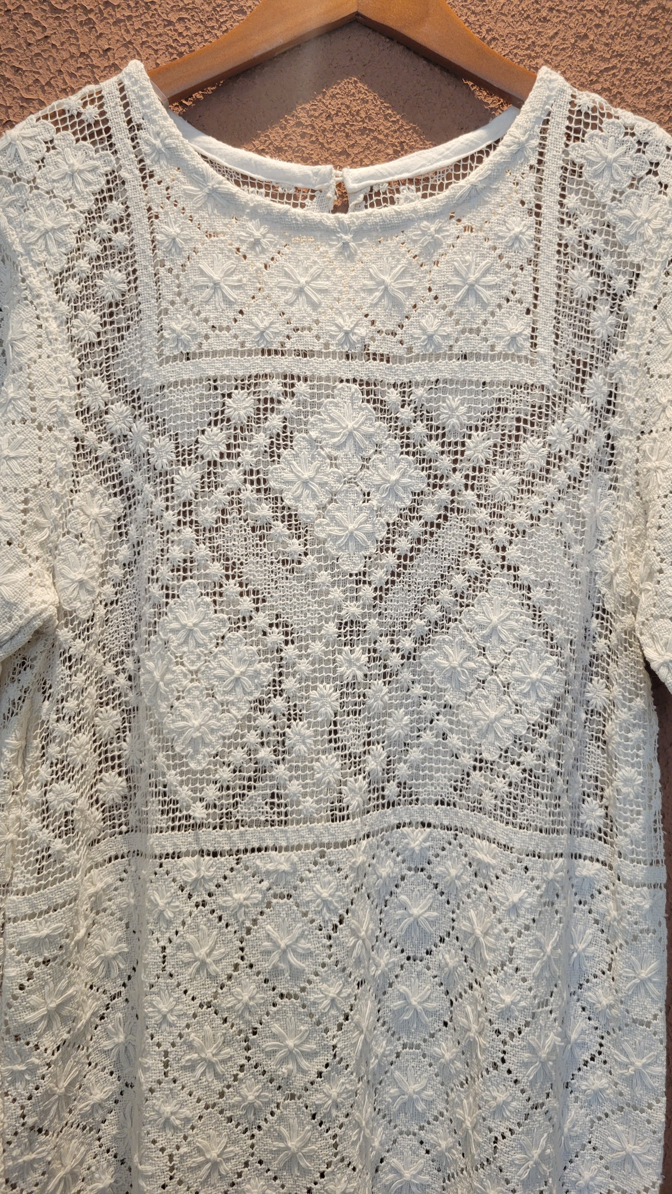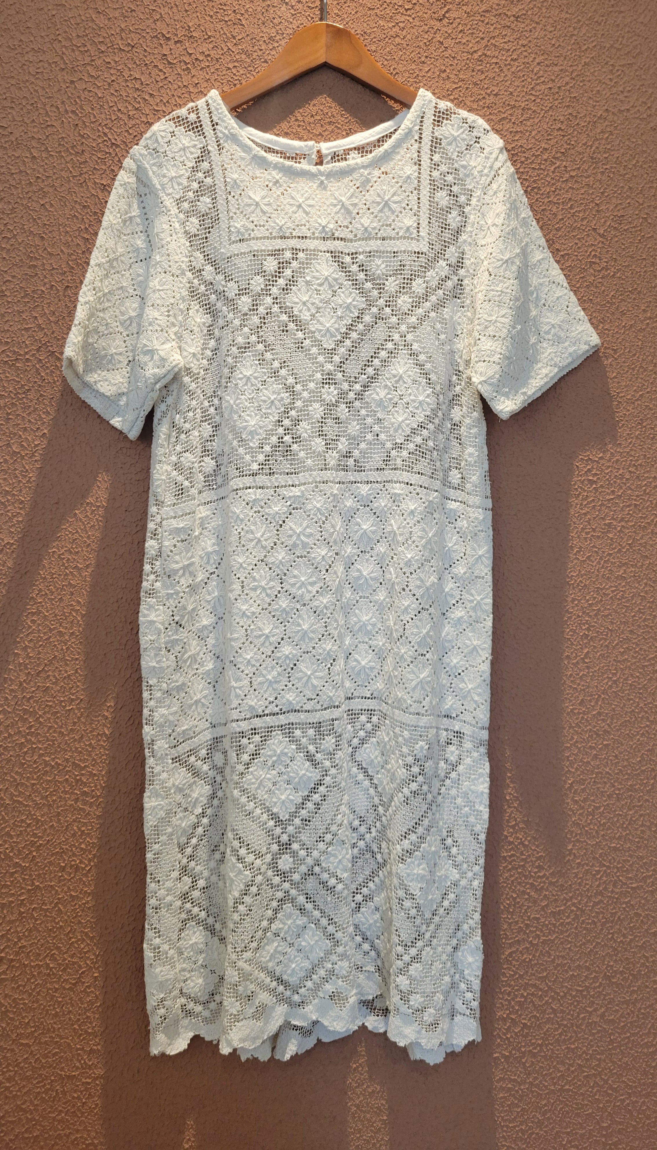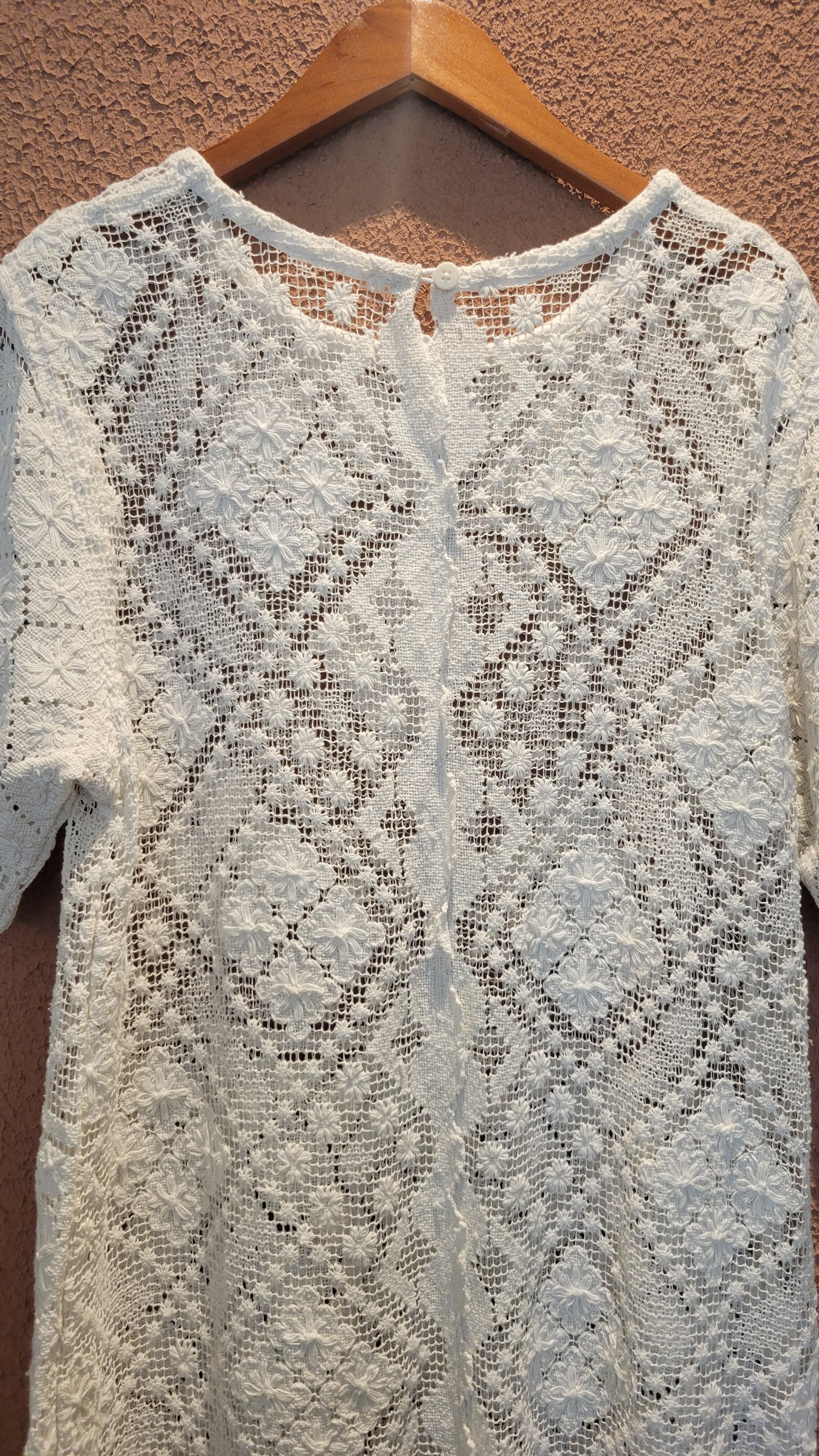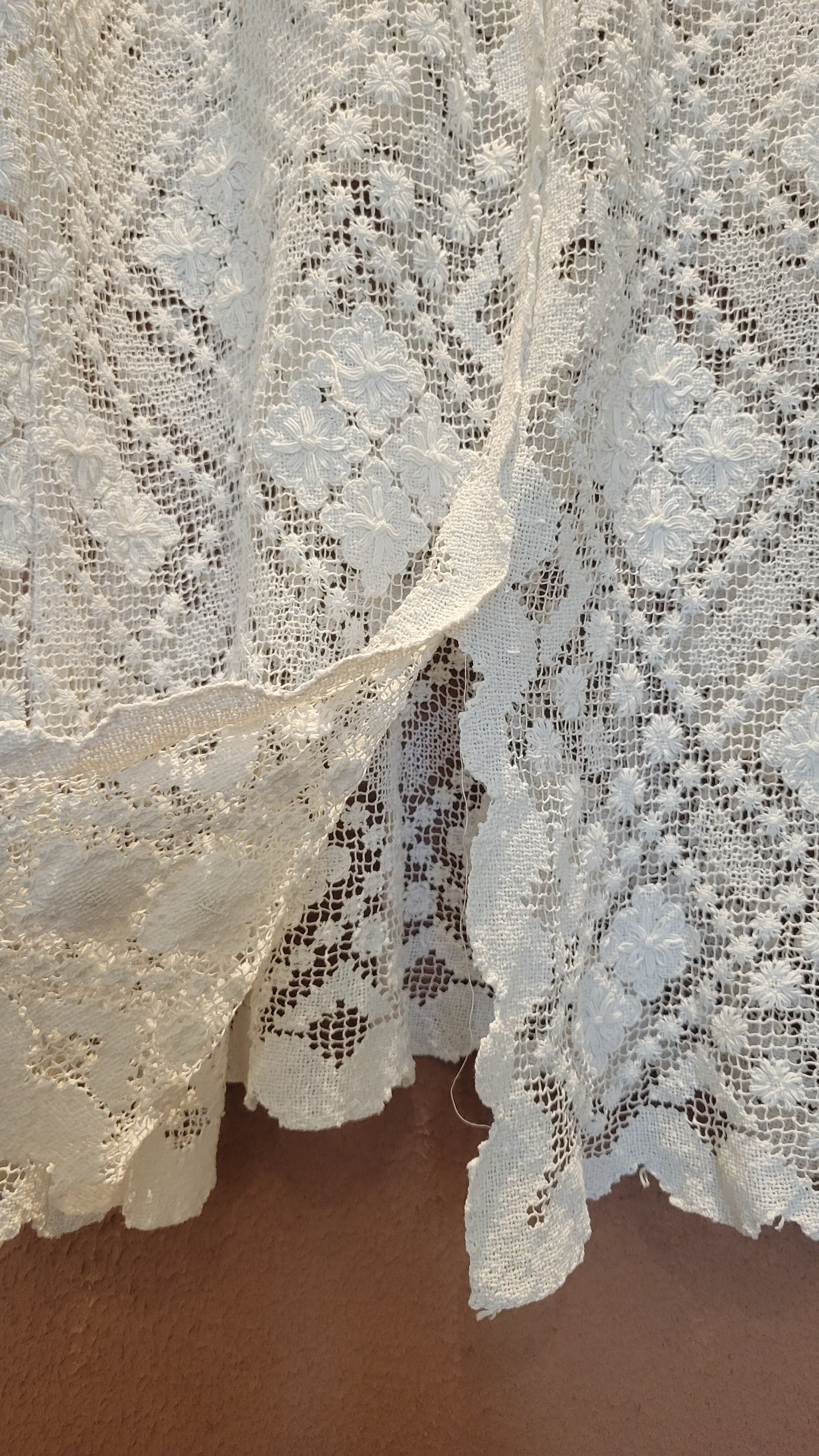 ヴィンテージレースを使用したリメイクワンピース。素材表記はありませんがコットンのようです。ボタンやファスナーは付いておらず頭から被るようにして着用するプルオーバータイプ。裏地は付いていません。夏は涼しく、秋冬はインナーにタートルネックのニット等を合わせて着用いただけます。