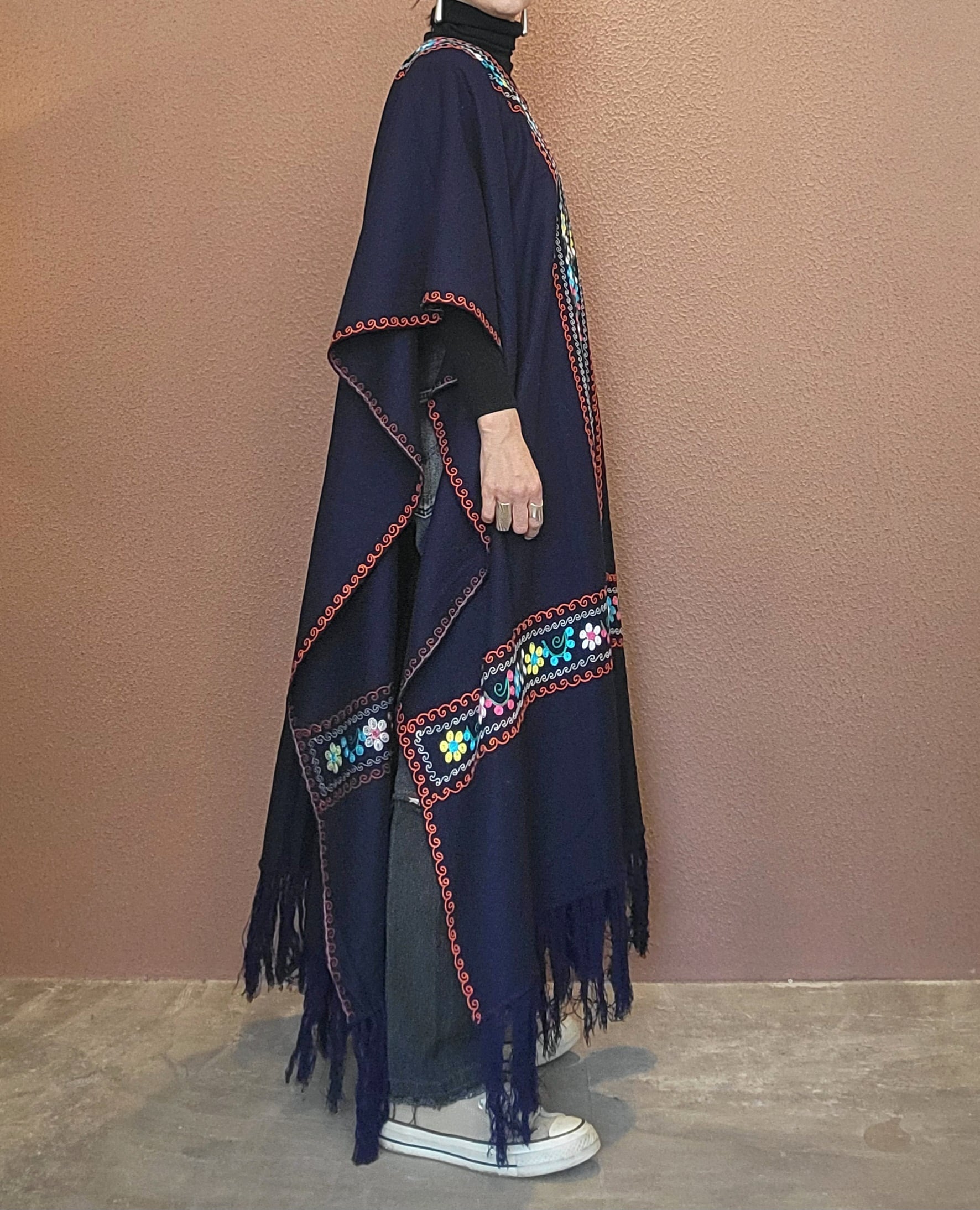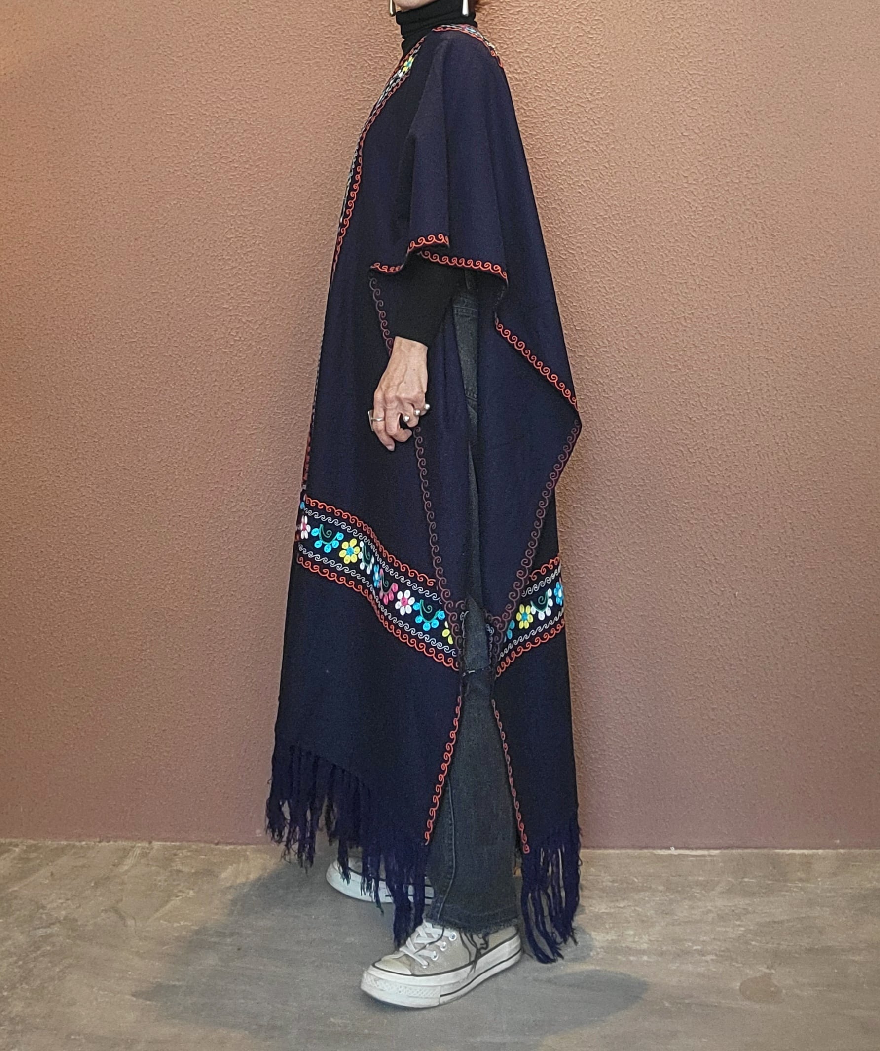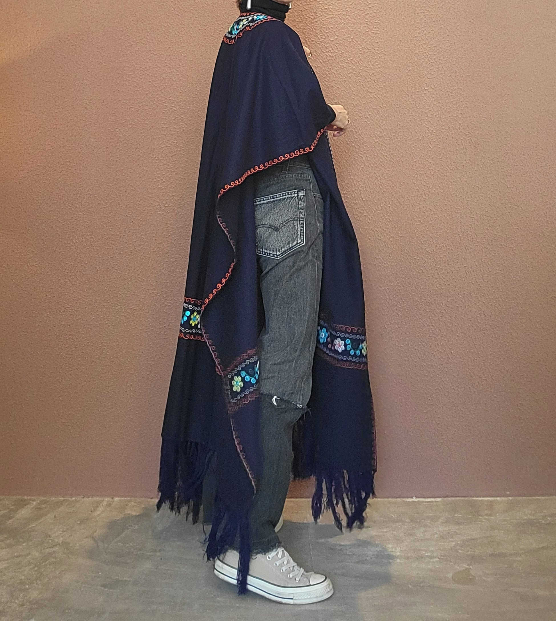 ヴィンテージの刺繍ポンチョ。素材表記はありませんがウールのようです。両サイドは縫われておらずオープンでポンチョのような仕様になっています。たっぷりの生地量で重厚感があり(重くはありません)、動きに合わせて揺れるドレープも魅力です。丈は長めですがフリンジ部分をカットして若干の調整が可能です。