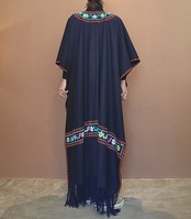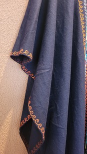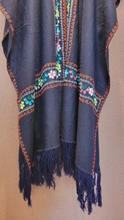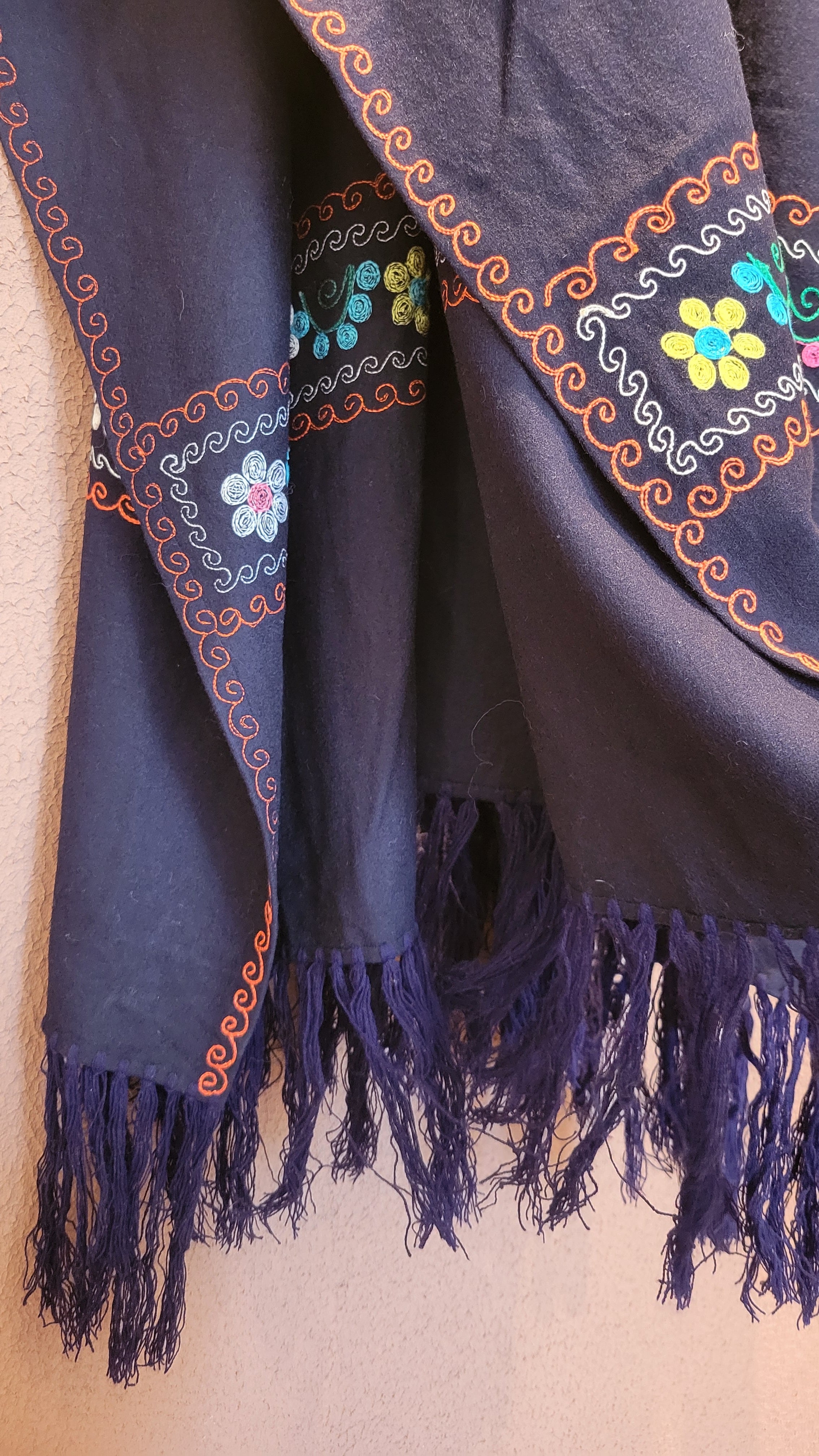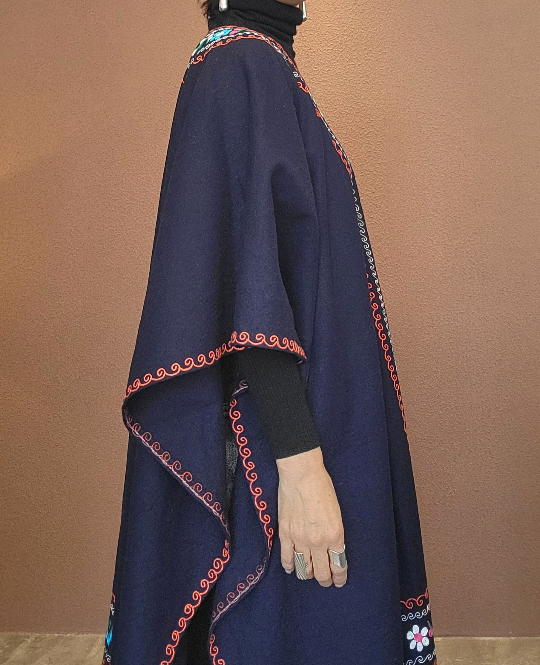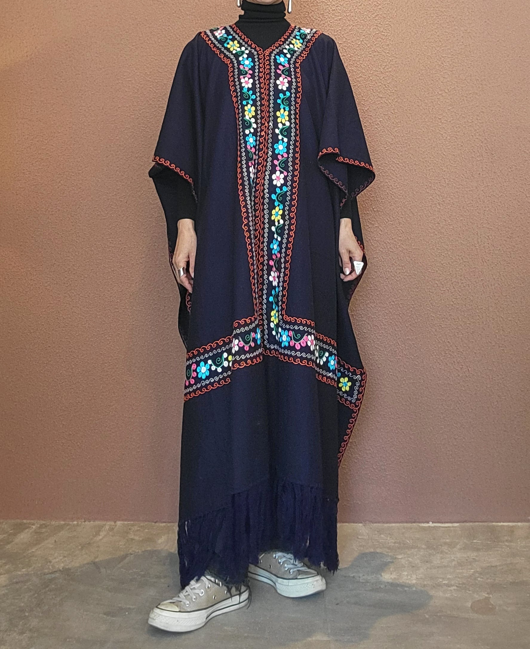 ヴィンテージの刺繍ポンチョ。素材表記はありませんがウールのようです。両サイドは縫われておらずオープンでポンチョのような仕様になっています。たっぷりの生地量で重厚感があり(重くはありません)、動きに合わせて揺れるドレープも魅力です。丈は長めですがフリンジ部分をカットして若干の調整が可能です。
