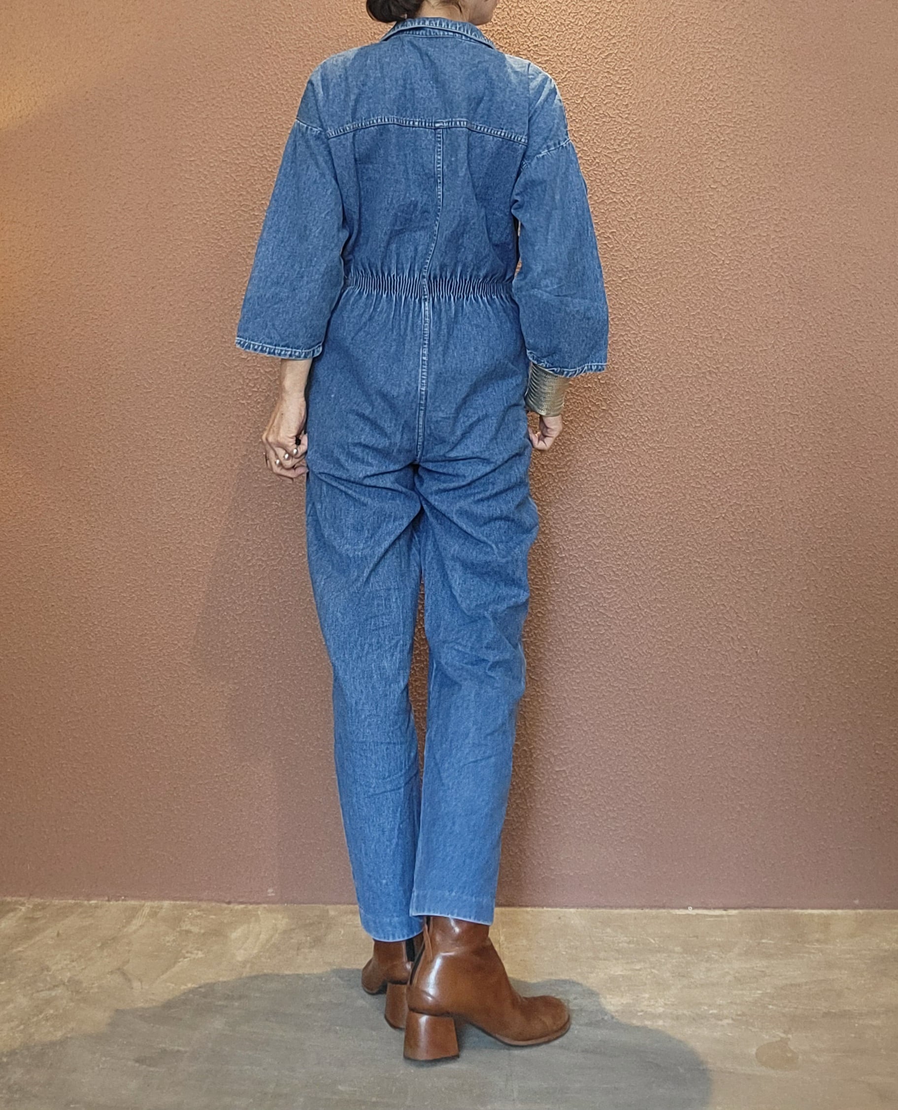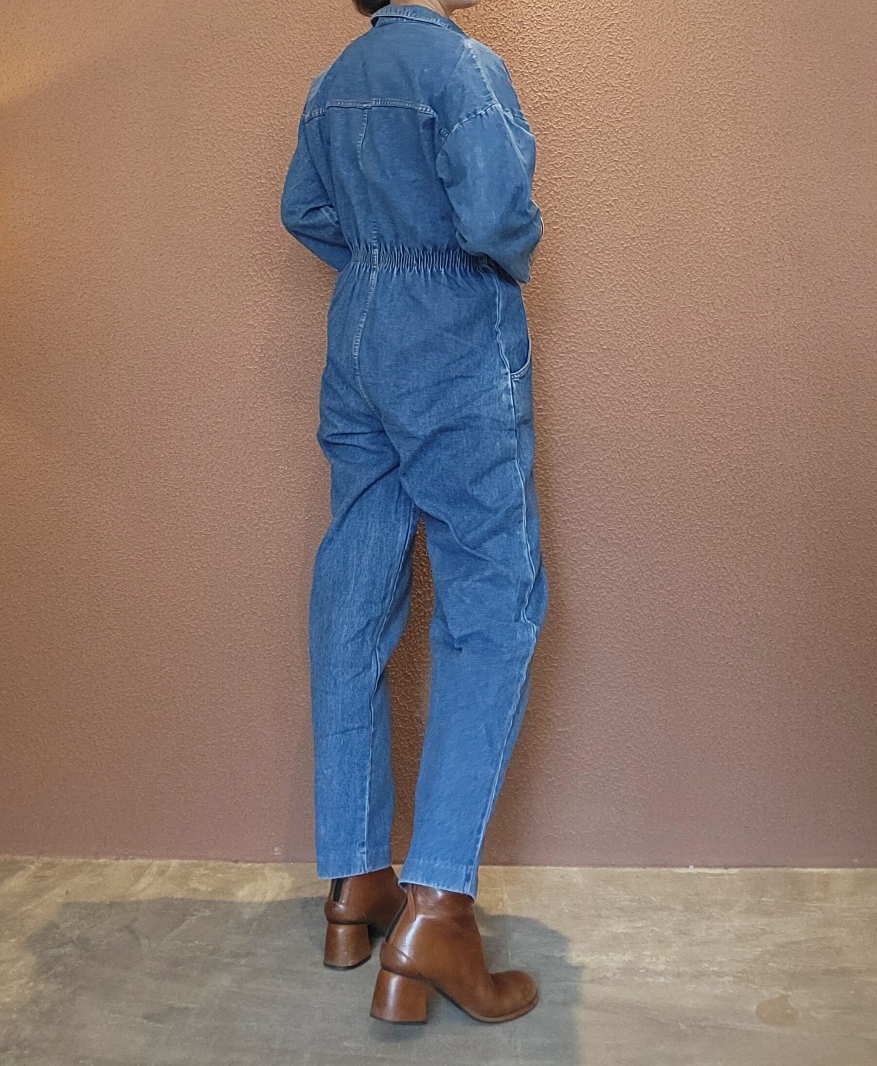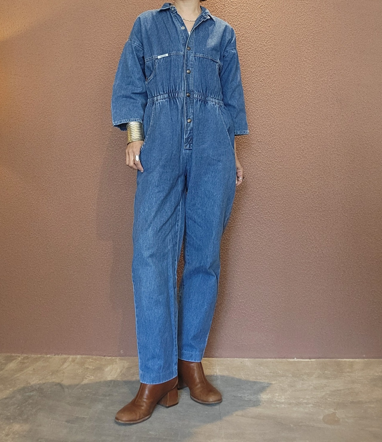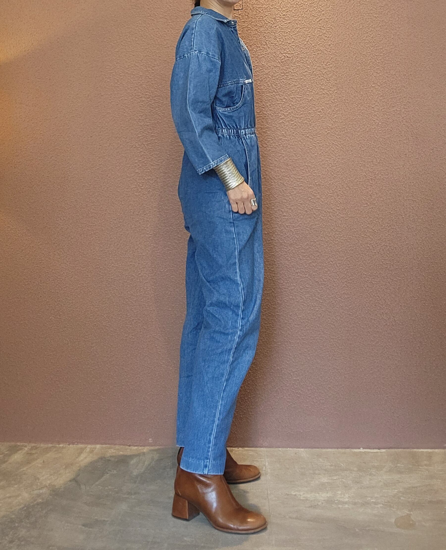 80s デニムジャンプスーツ。フロントはスナップボタン、ウエストゴム、袖は七分丈です。肩はあえての落ちるデザイン。ドルマンスリーブ、ハイウエスト、テーパードシルエット等、80sならではのデザインがたっぷり詰まっています。スニーカーでカジュアルにも、パンプスできれいめにもスタイリングできます。