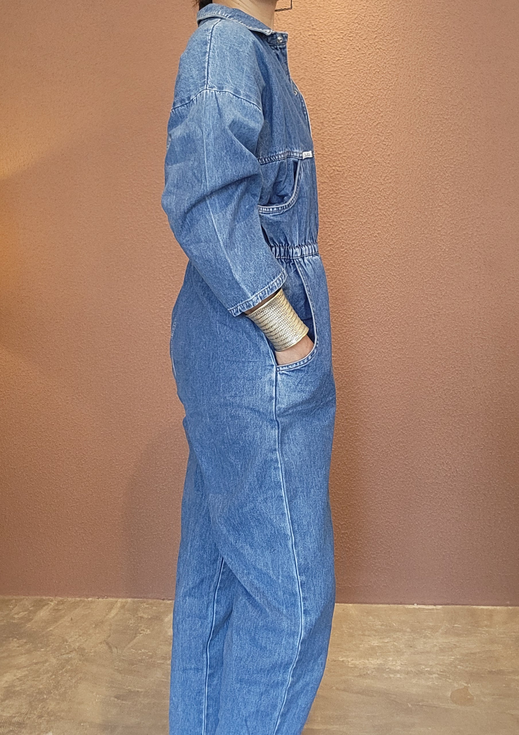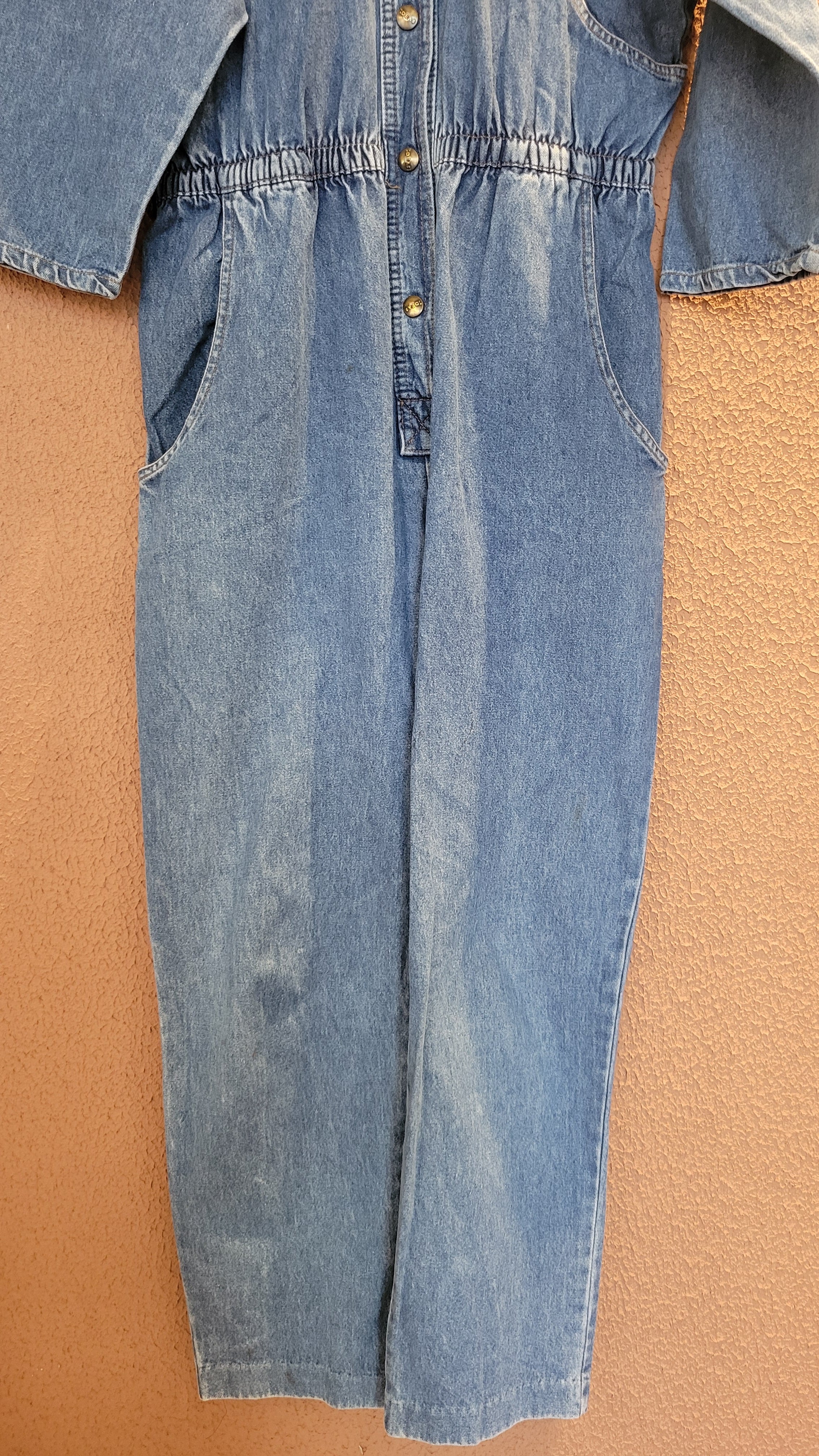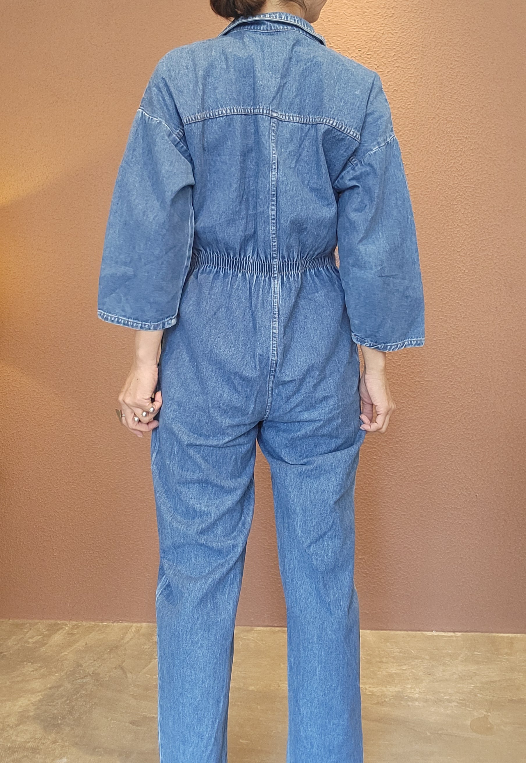 80s デニムジャンプスーツ。フロントはスナップボタン、ウエストゴム、袖は七分丈です。肩はあえての落ちるデザイン。ドルマンスリーブ、ハイウエスト、テーパードシルエット等、80sならではのデザインがたっぷり詰まっています。スニーカーでカジュアルにも、パンプスできれいめにもスタイリングできます。