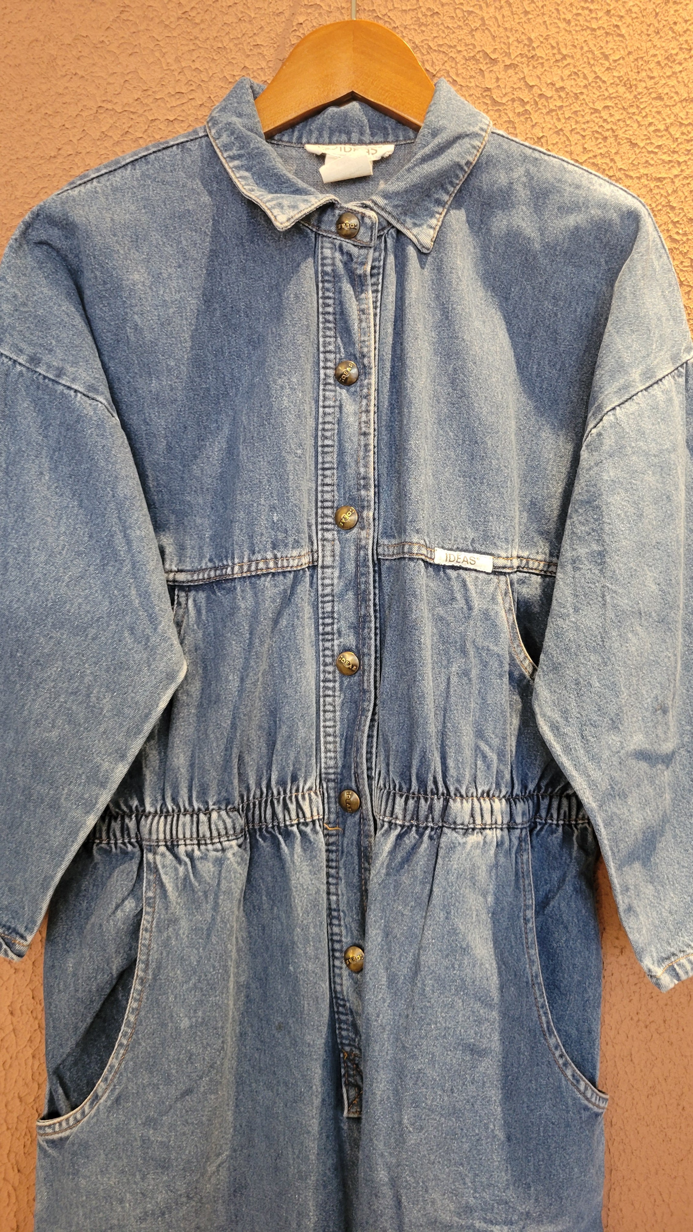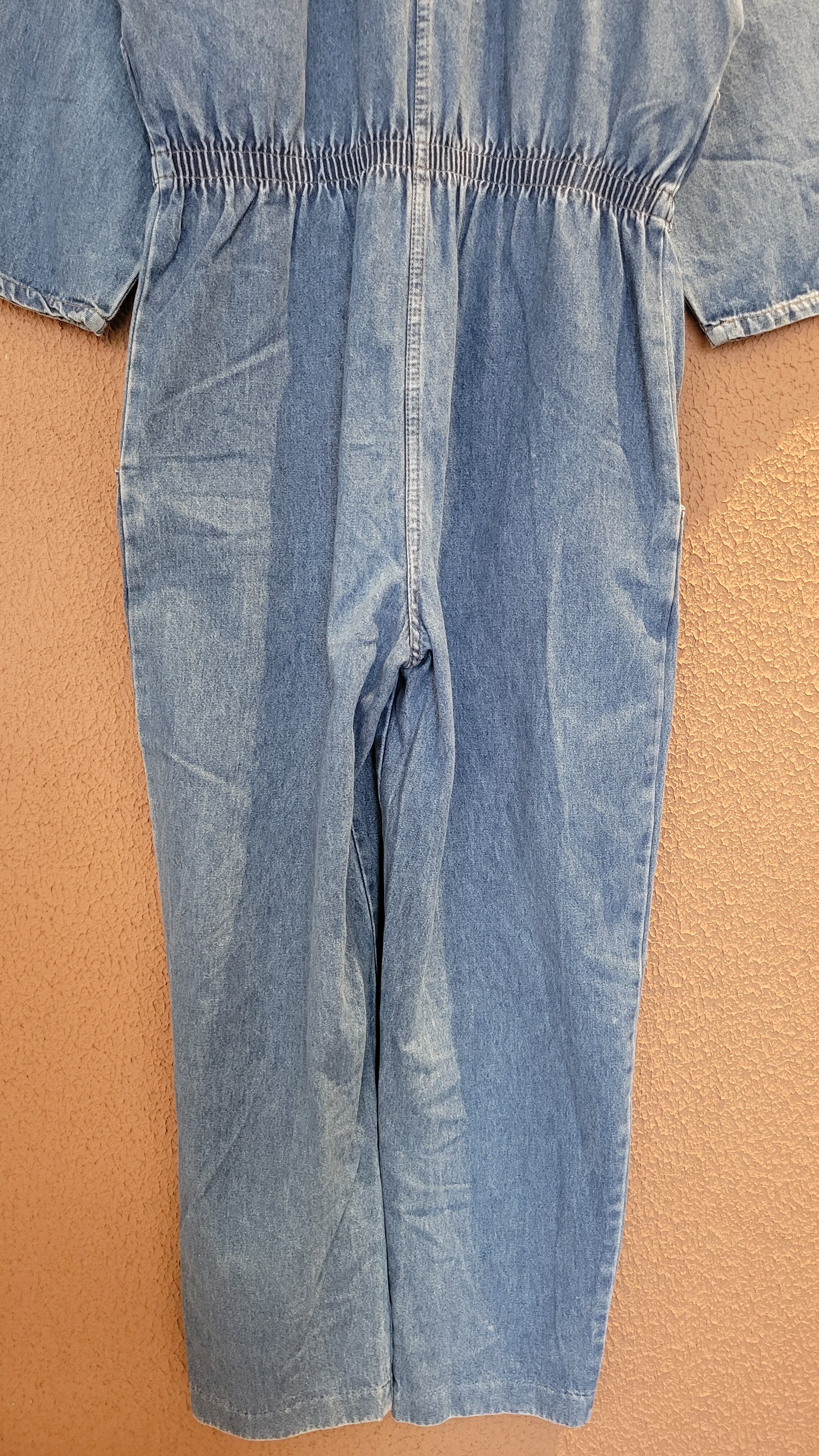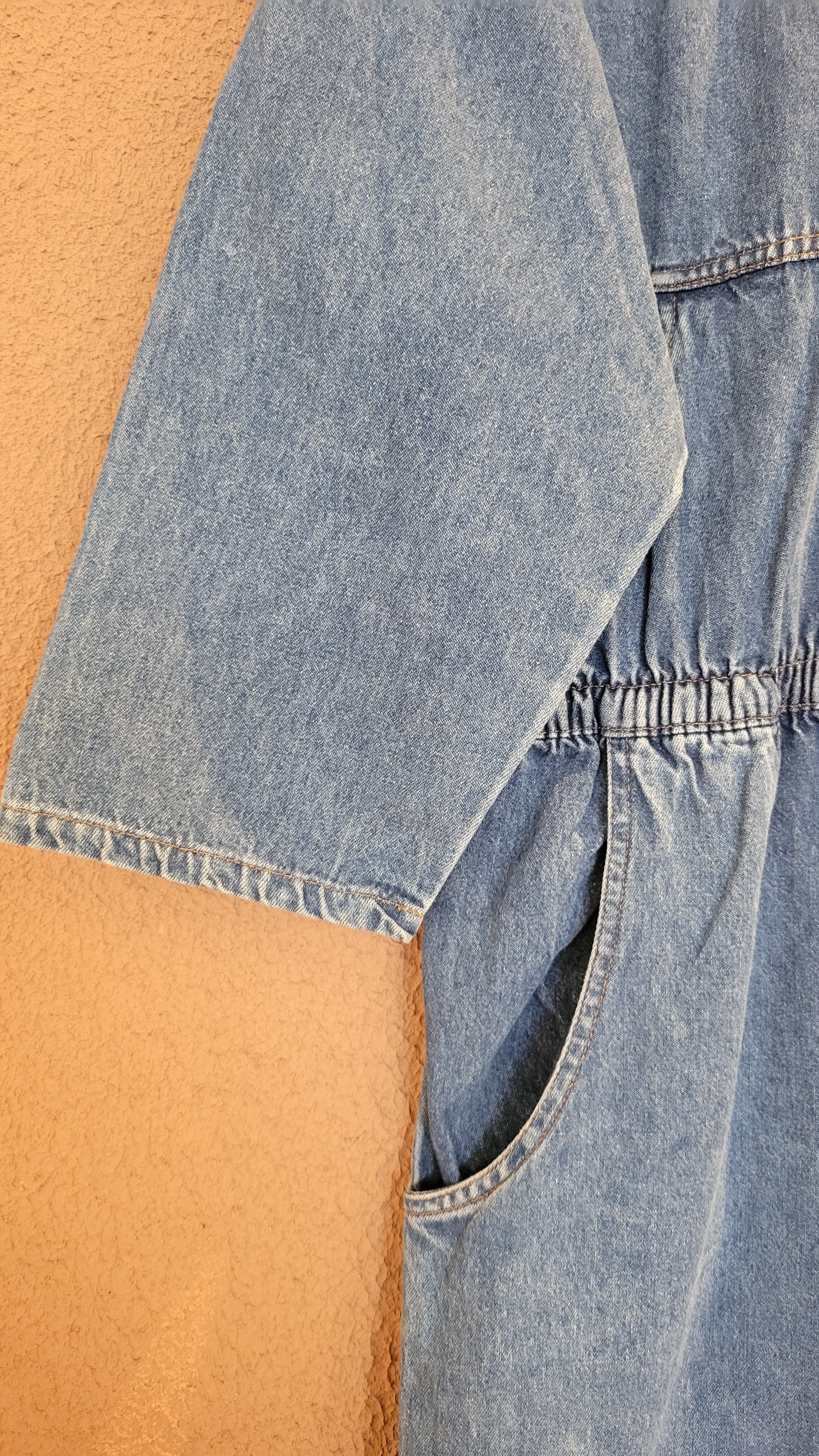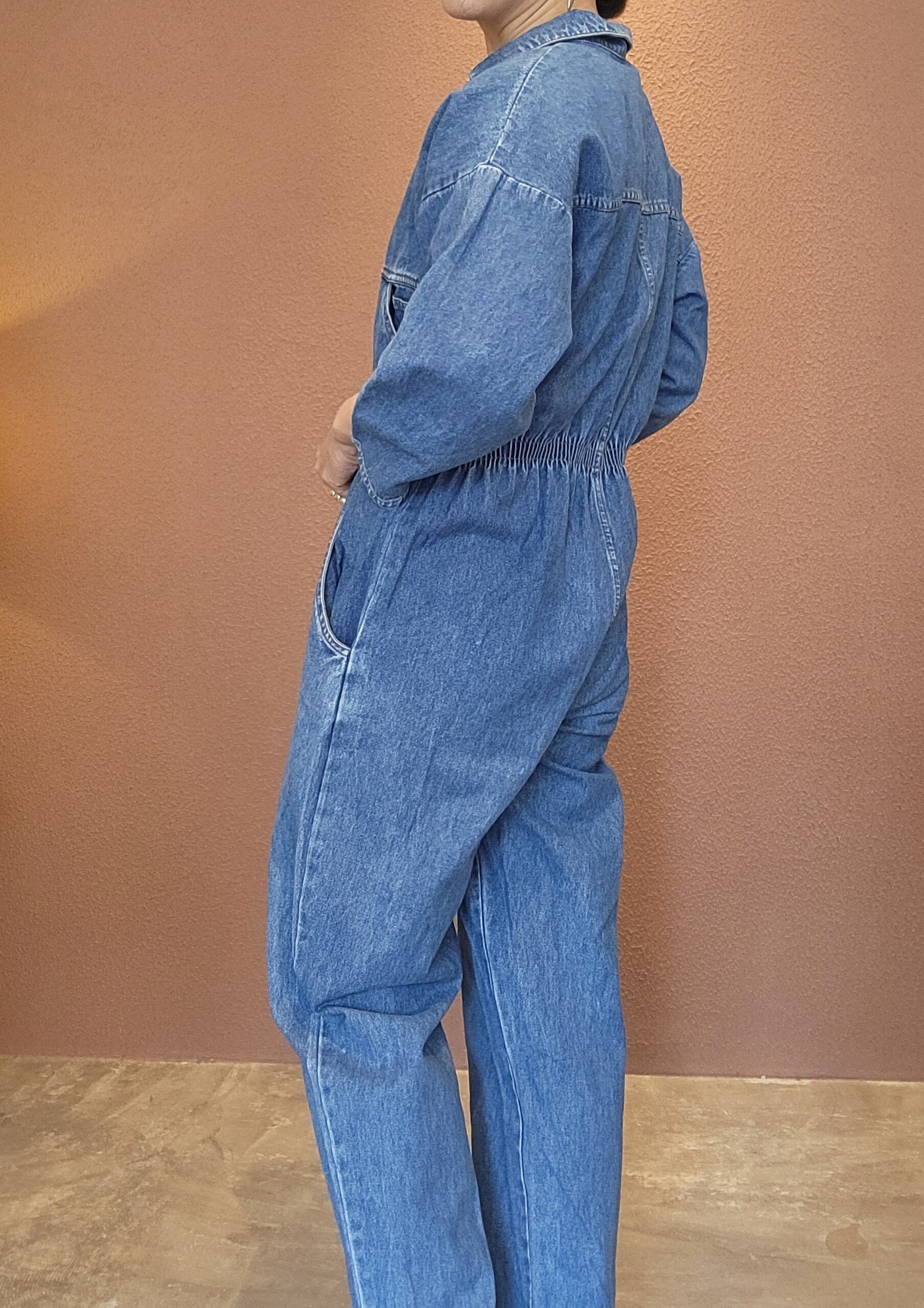 80s デニムジャンプスーツ。フロントはスナップボタン、ウエストゴム、袖は七分丈です。肩はあえての落ちるデザイン。ドルマンスリーブ、ハイウエスト、テーパードシルエット等、80sならではのデザインがたっぷり詰まっています。スニーカーでカジュアルにも、パンプスできれいめにもスタイリングできます。