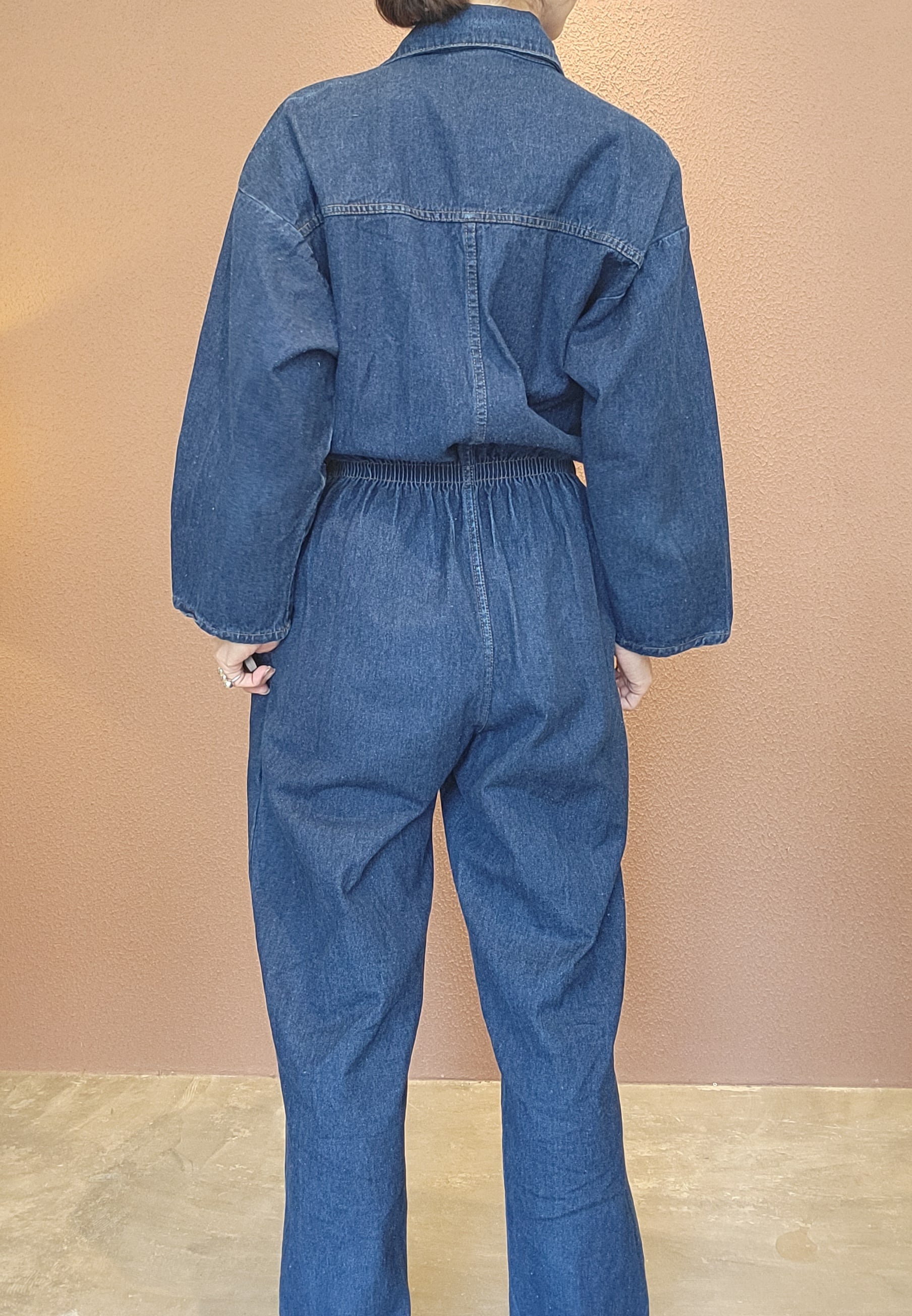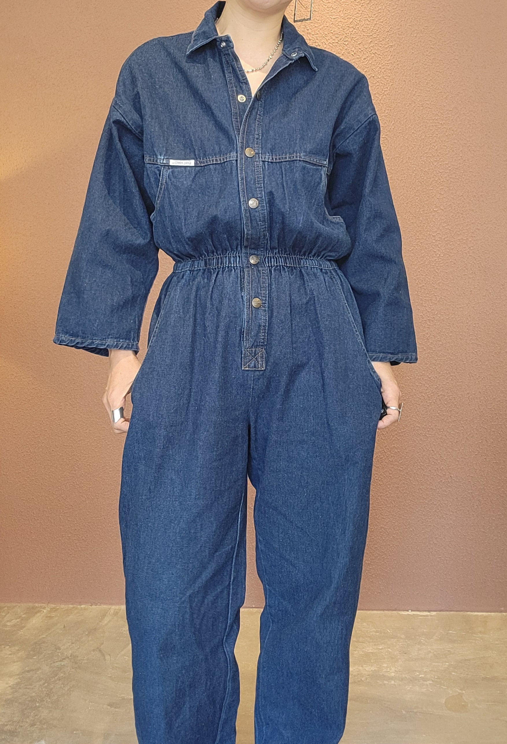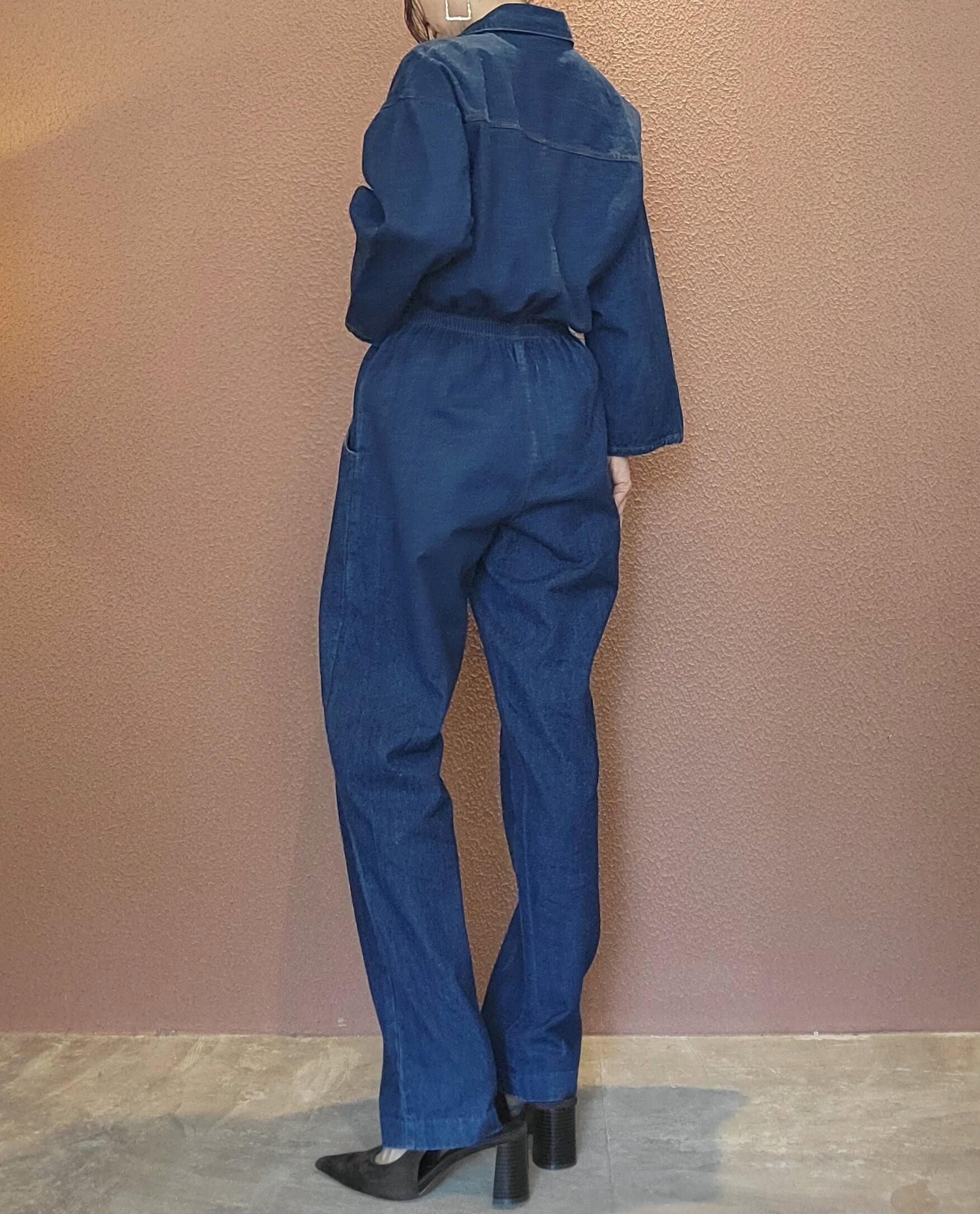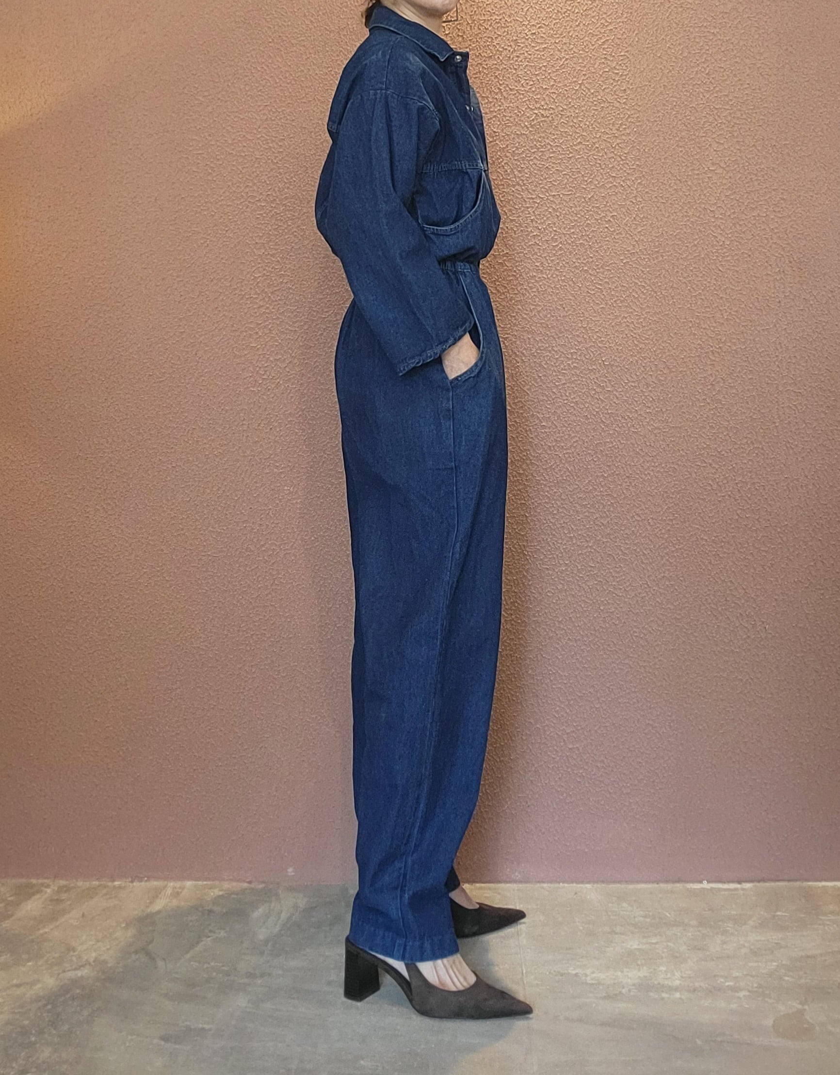 80s デニムジャンプスーツ。フロントはスナップボタン、ウエストゴムです。肩はあえての落ちるデザイン。ドルマンスリーブ、ハイウエスト、テーパードシルエット等、80sならではのデザインがたっぷり詰まっています。スニーカーでカジュアルにも、パンプスできれいめにもスタイリングできます。