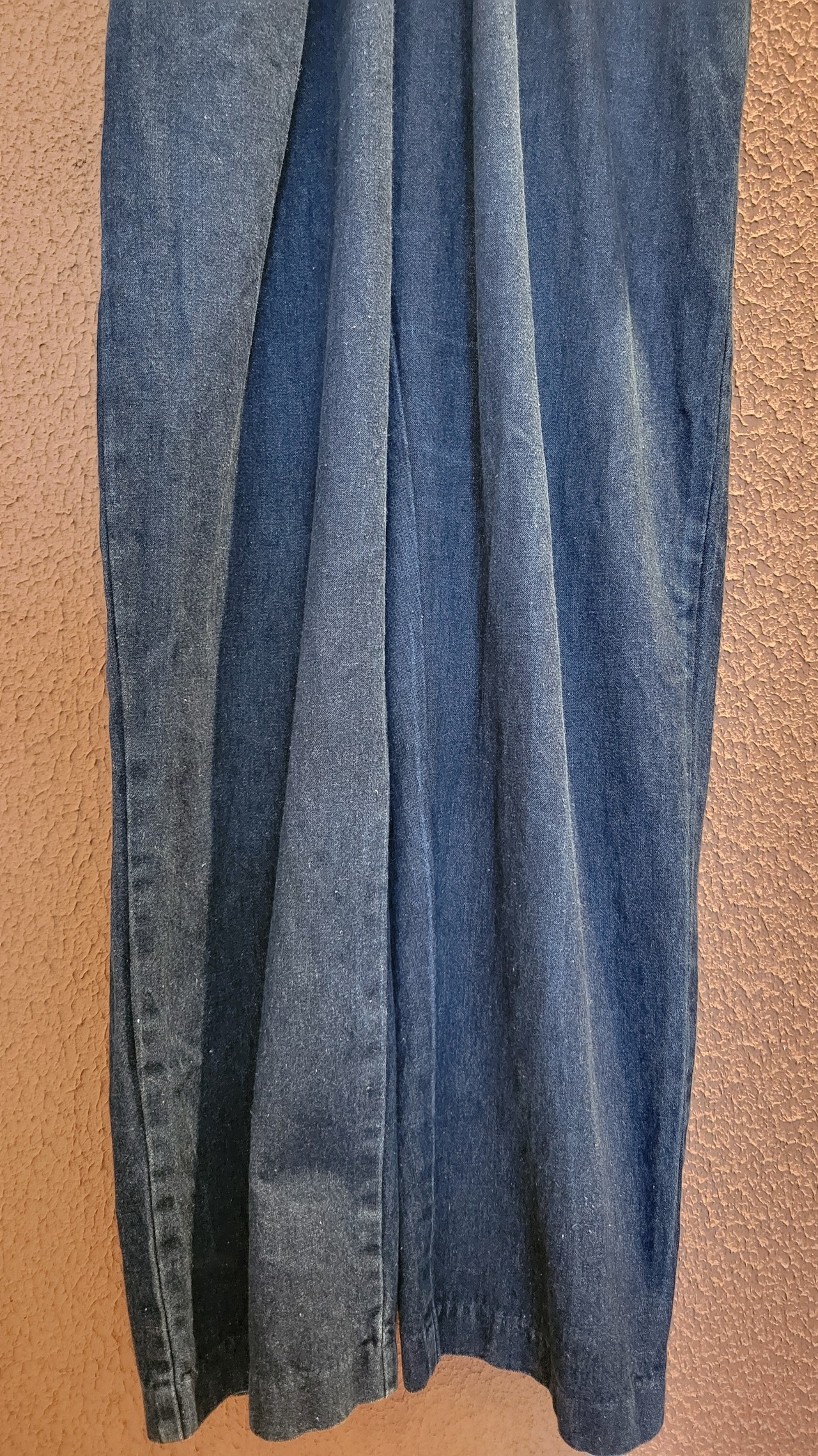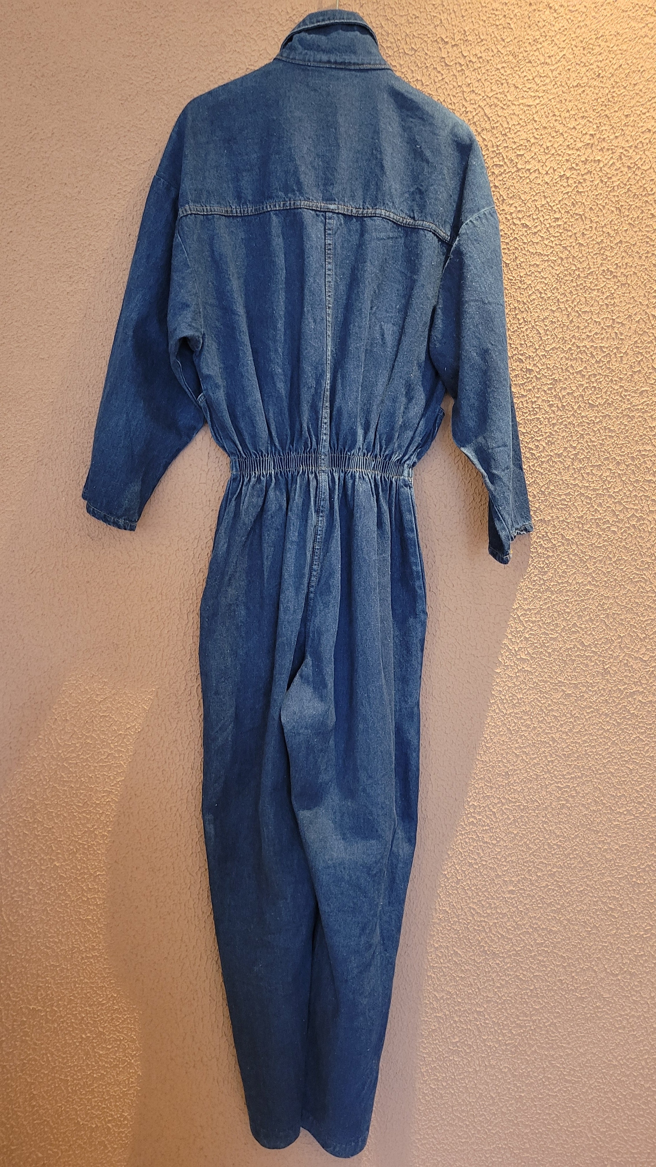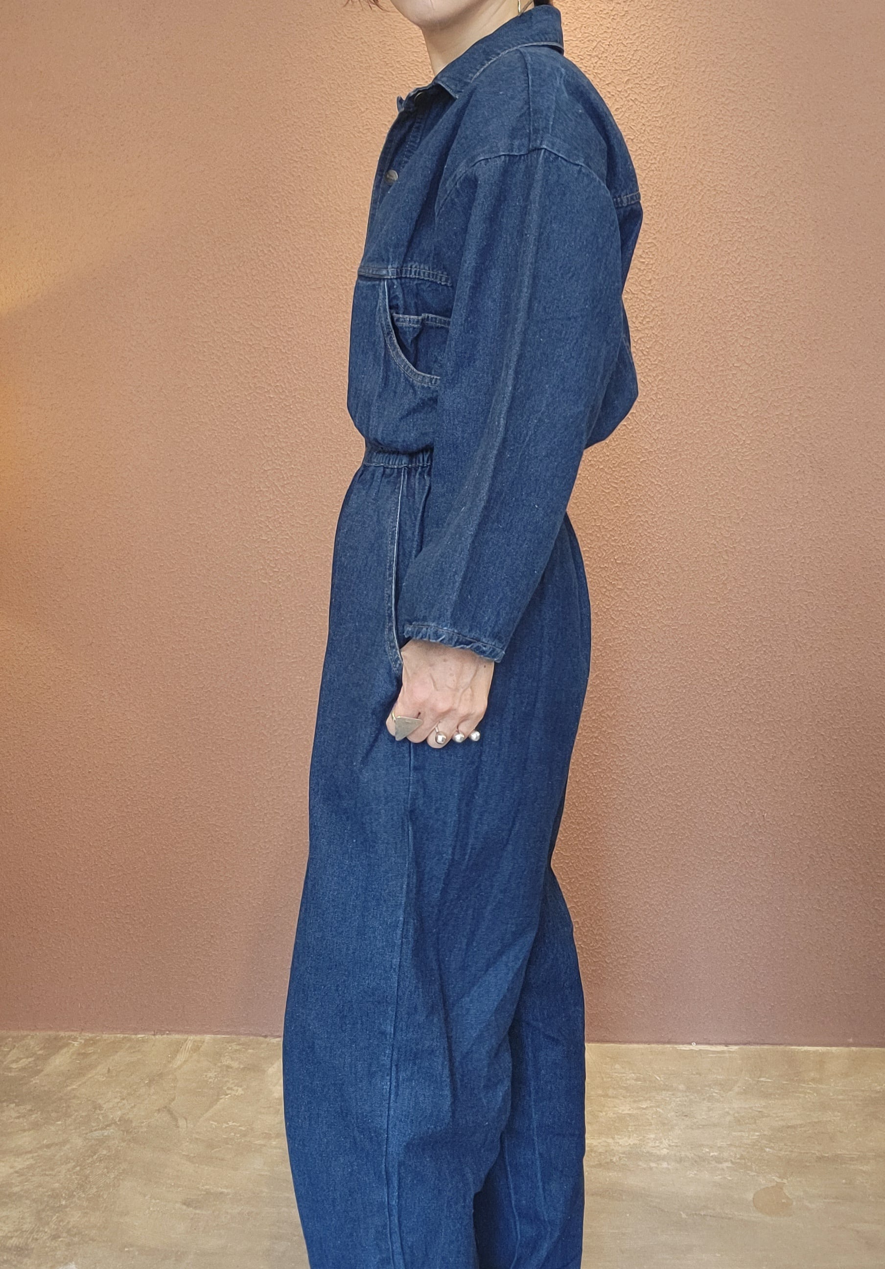 80s デニムジャンプスーツ。フロントはスナップボタン、ウエストゴムです。肩はあえての落ちるデザイン。ドルマンスリーブ、ハイウエスト、テーパードシルエット等、80sならではのデザインがたっぷり詰まっています。スニーカーでカジュアルにも、パンプスできれいめにもスタイリングできます。