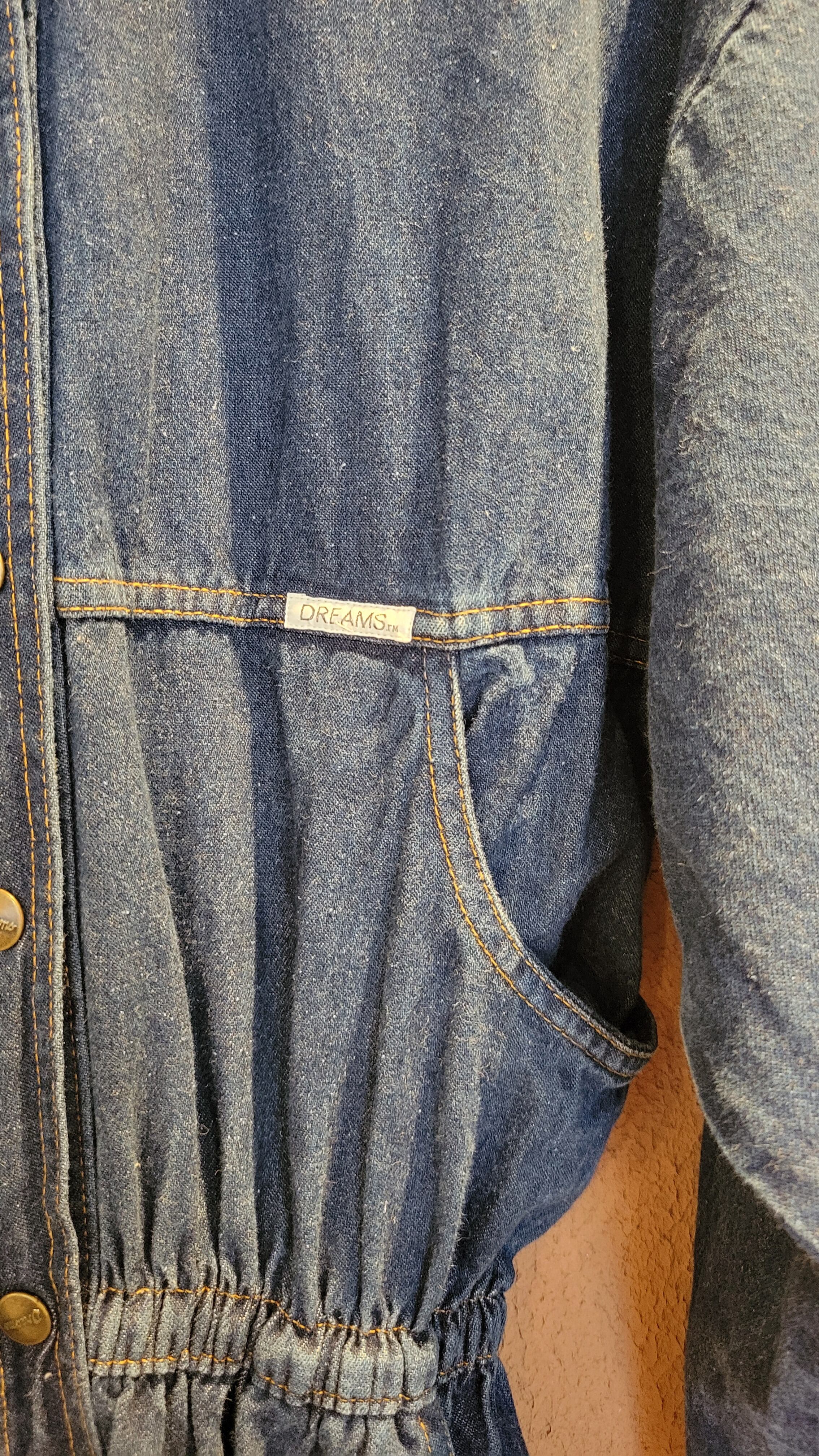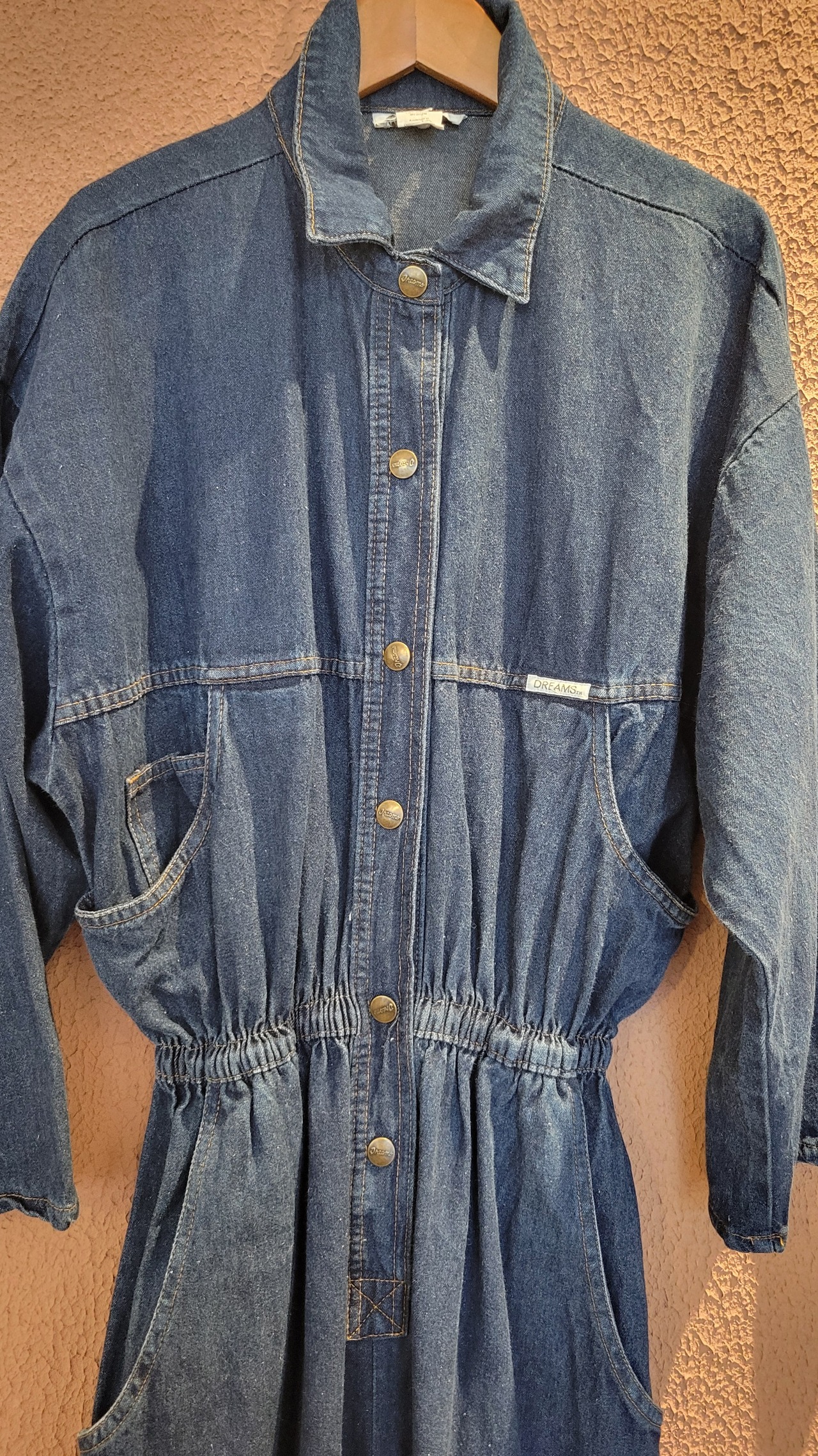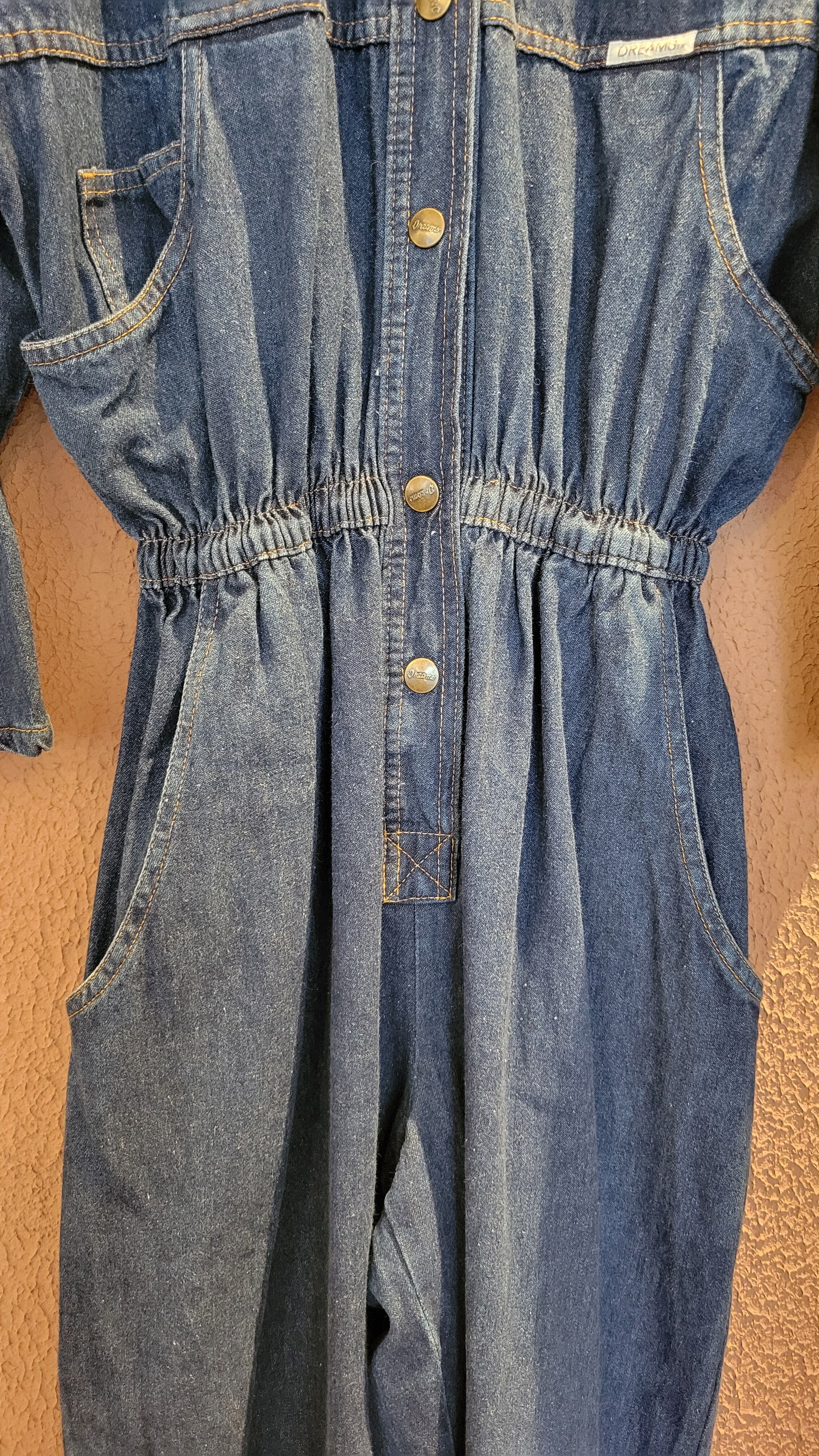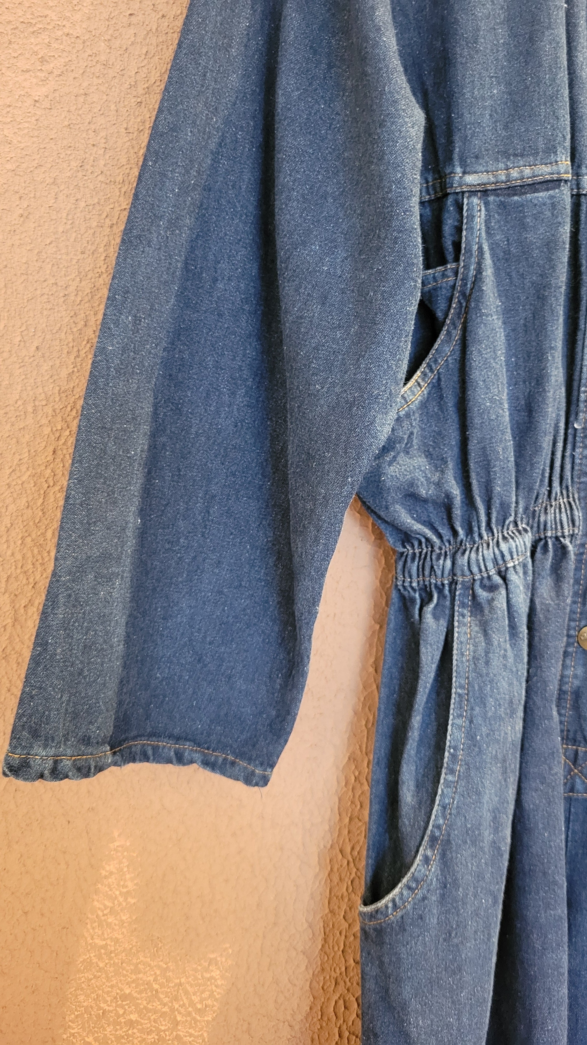 80s デニムジャンプスーツ。フロントはスナップボタン、ウエストゴムです。肩はあえての落ちるデザイン。ドルマンスリーブ、ハイウエスト、テーパードシルエット等、80sならではのデザインがたっぷり詰まっています。スニーカーでカジュアルにも、パンプスできれいめにもスタイリングできます。