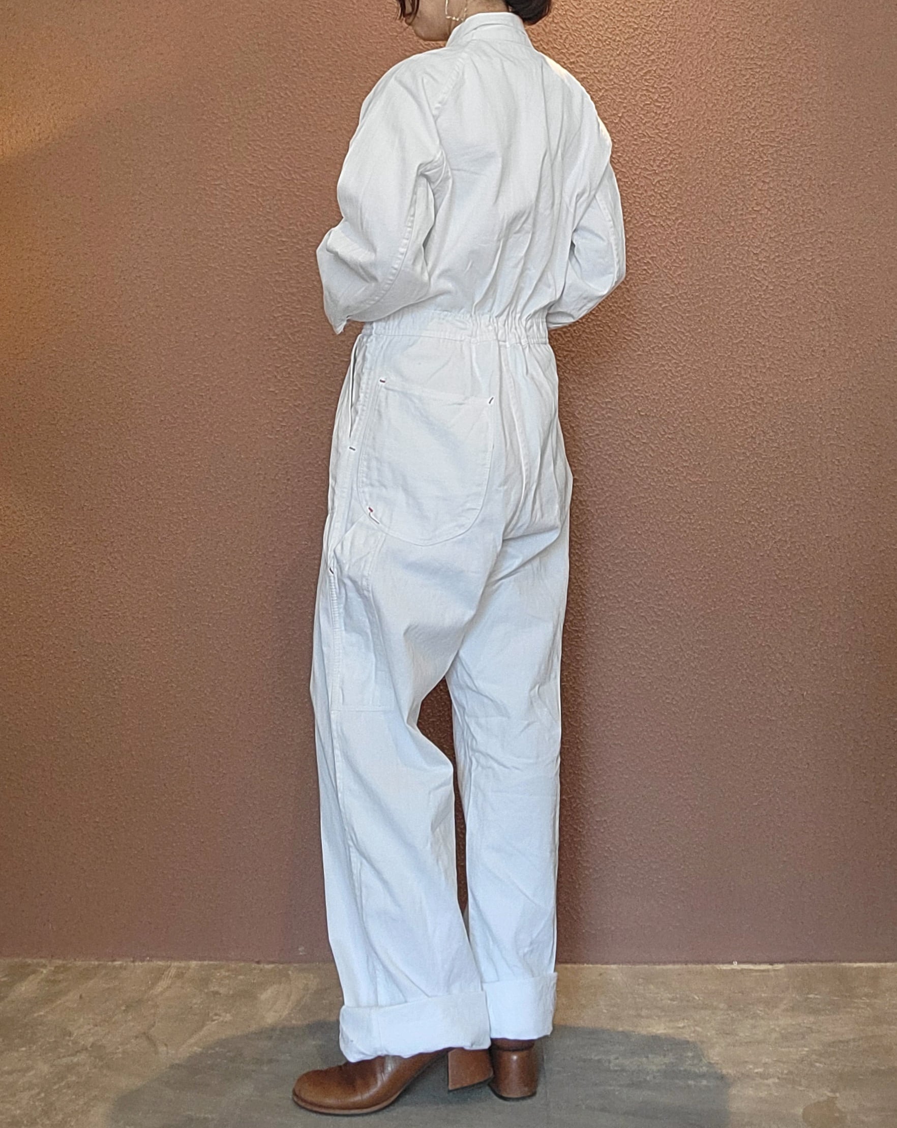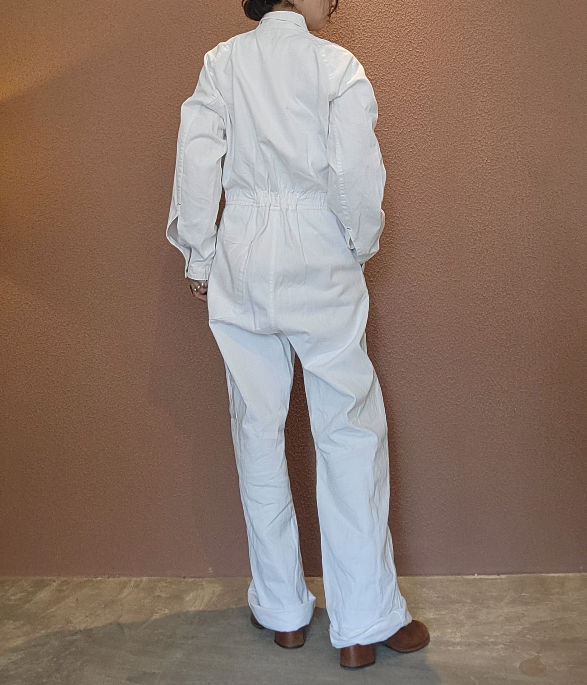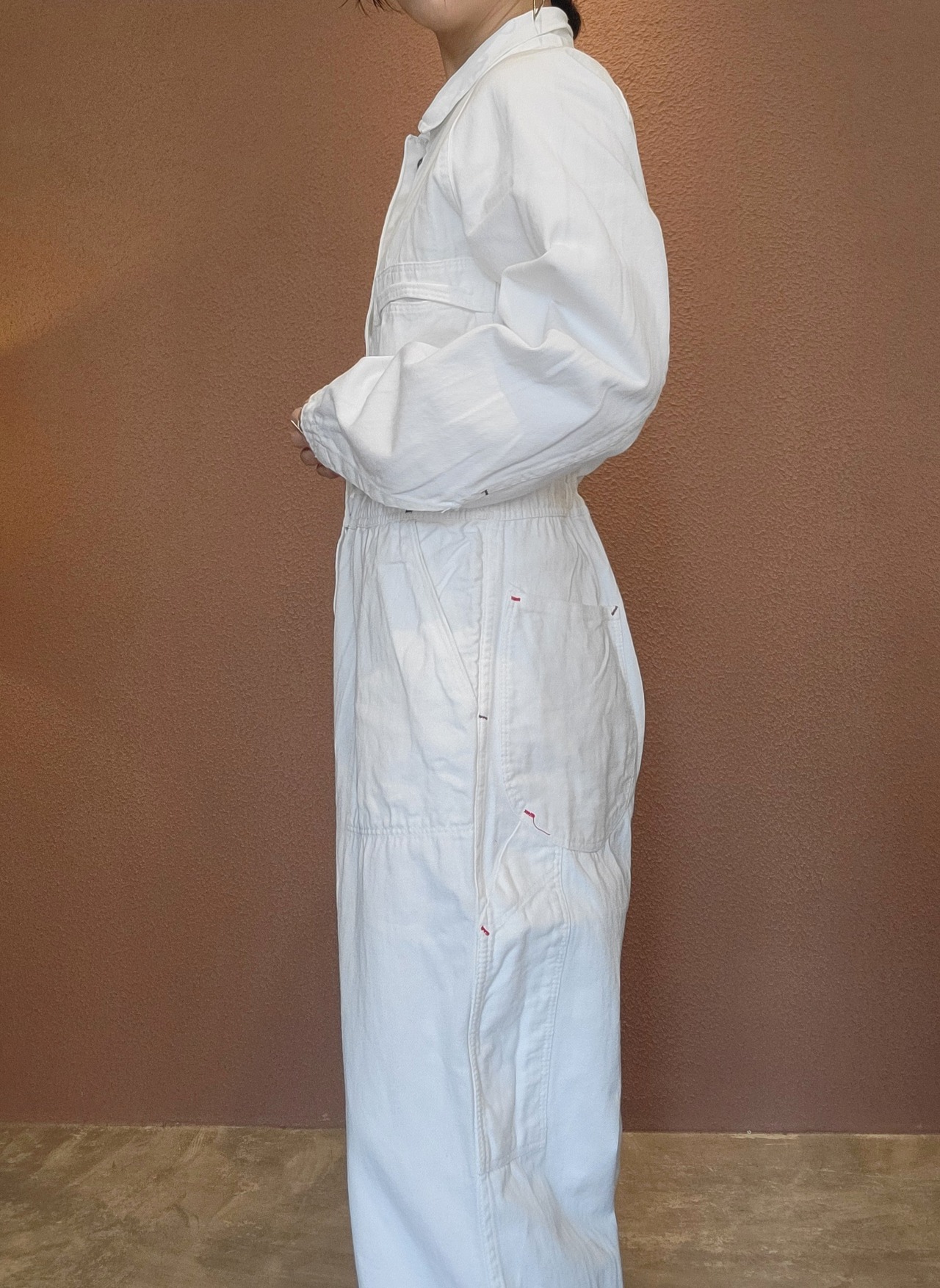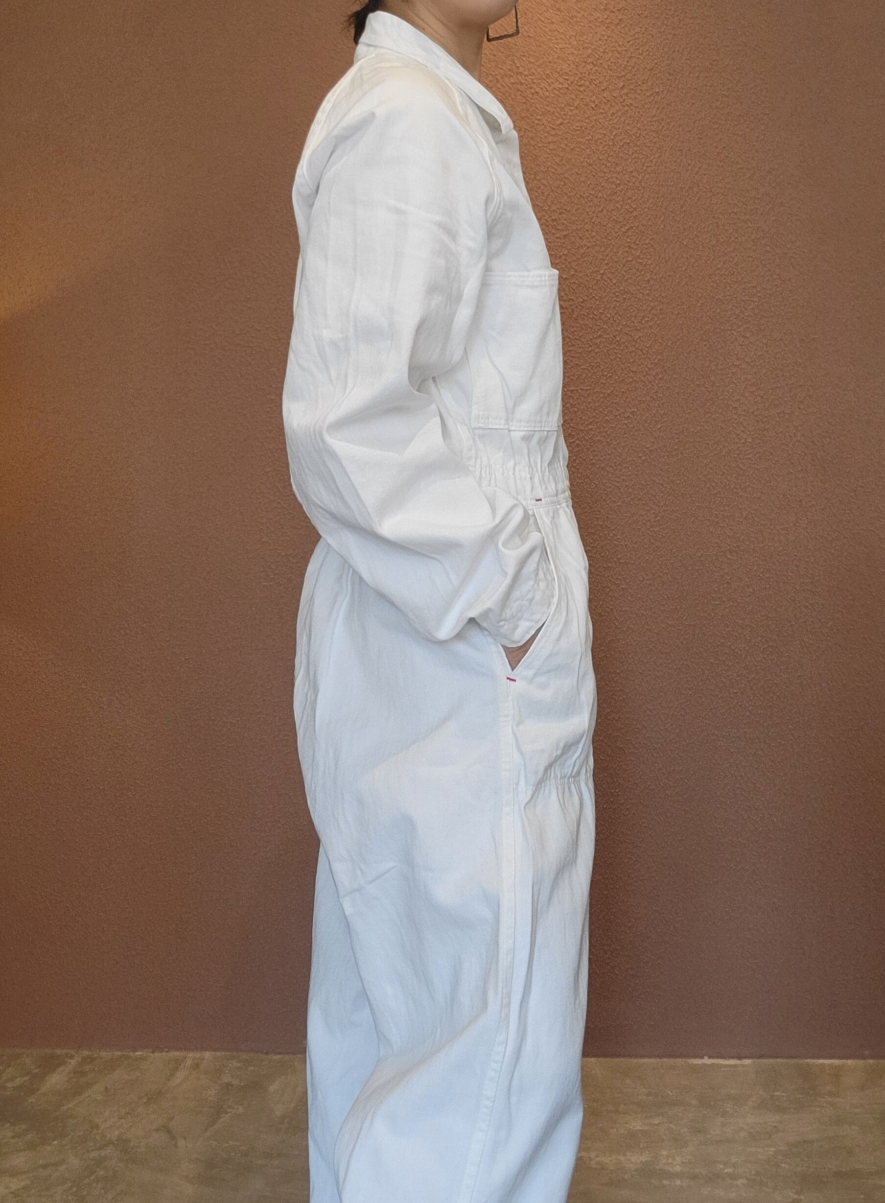 Made in Australia のホワイトデニムジャンプスーツ。フロントはスナップボタンと普通のボタンどちらも使われています。所々に入った赤のステッチが良いアクセントに。無骨なワーク系デザインを白が品良くまとめた1着です。