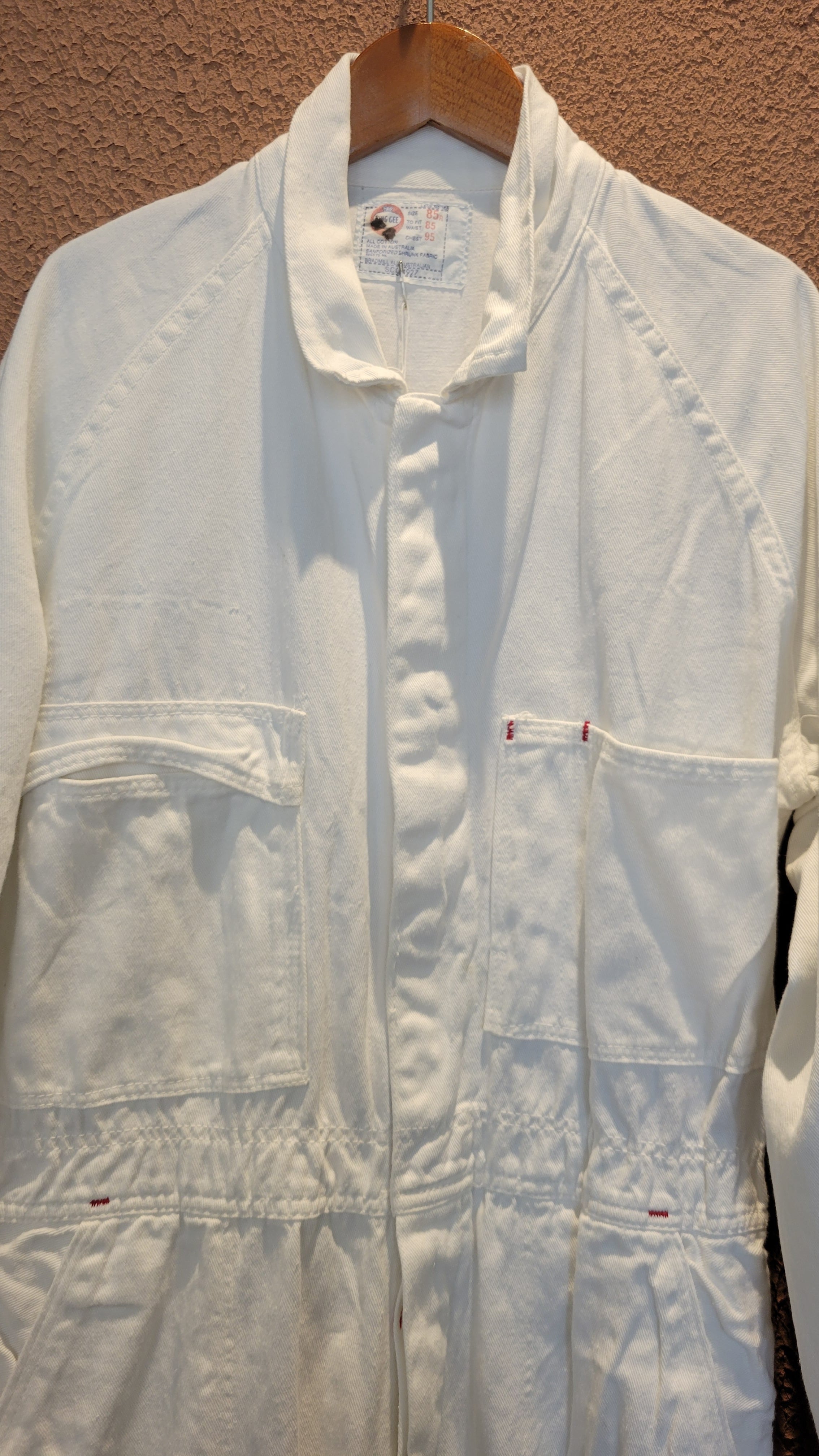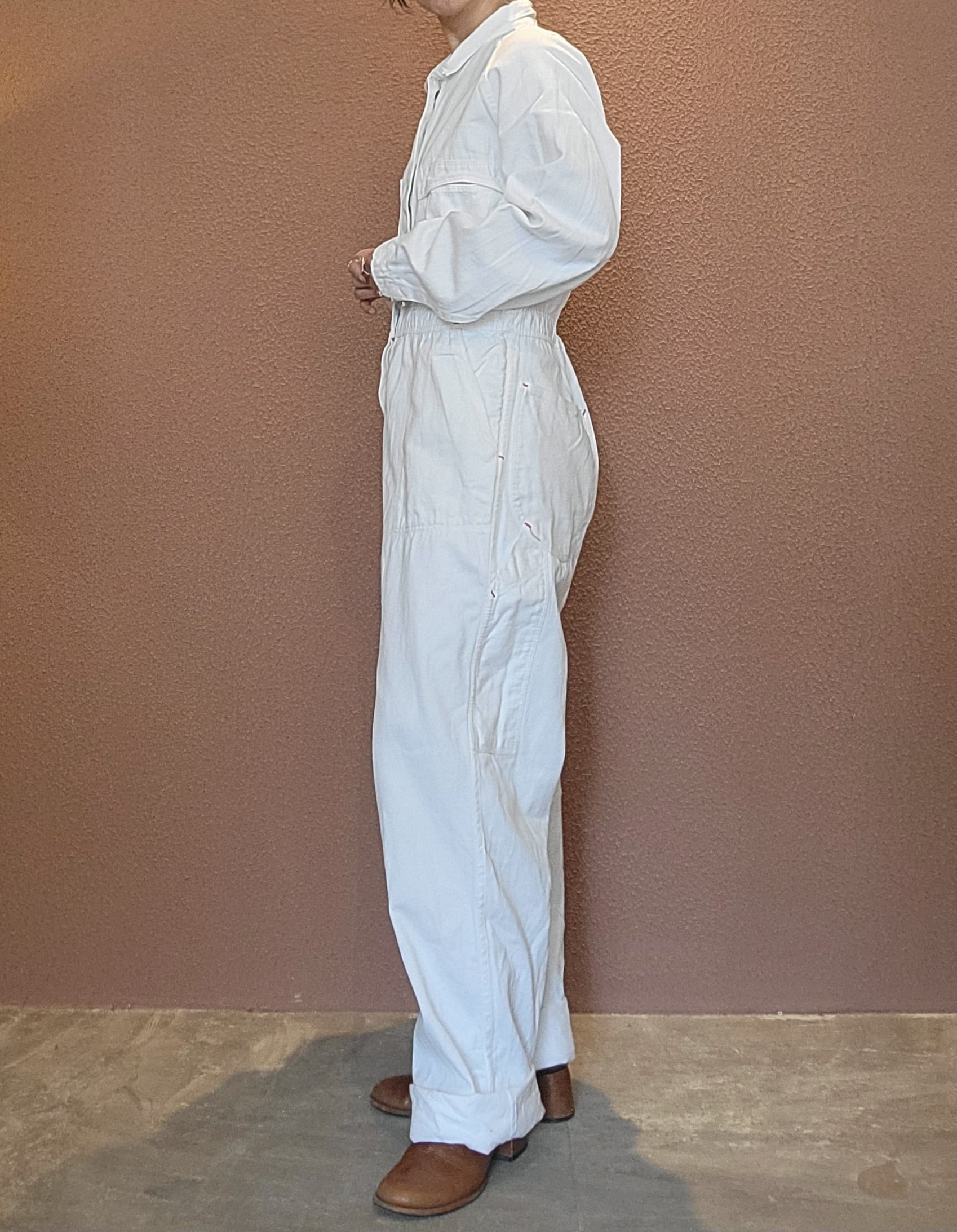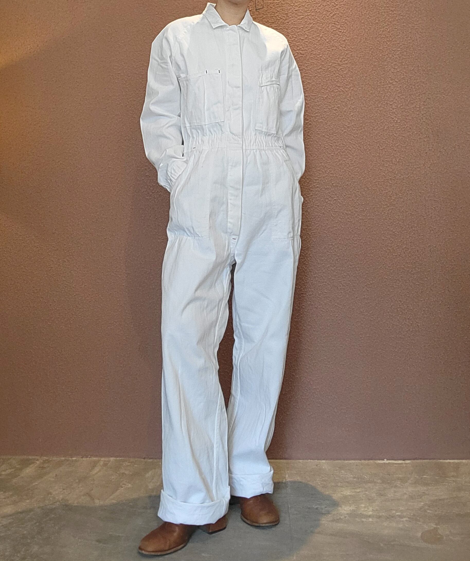 Made in Australia のホワイトデニムジャンプスーツ。フロントはスナップボタンと普通のボタンどちらも使われています。所々に入った赤のステッチが良いアクセントに。無骨なワーク系デザインを白が品良くまとめた1着です。