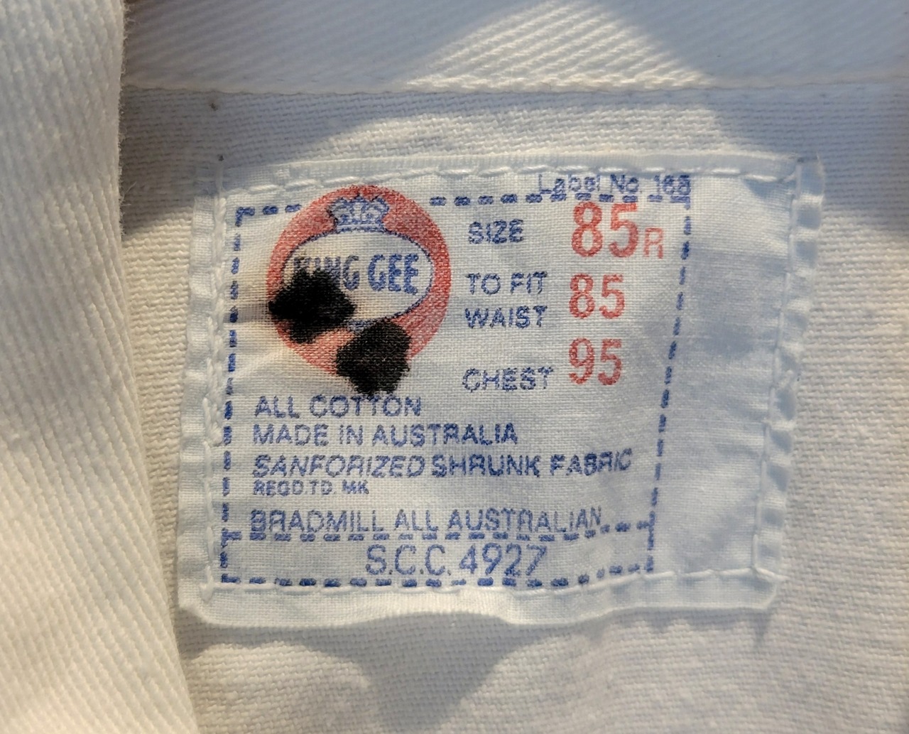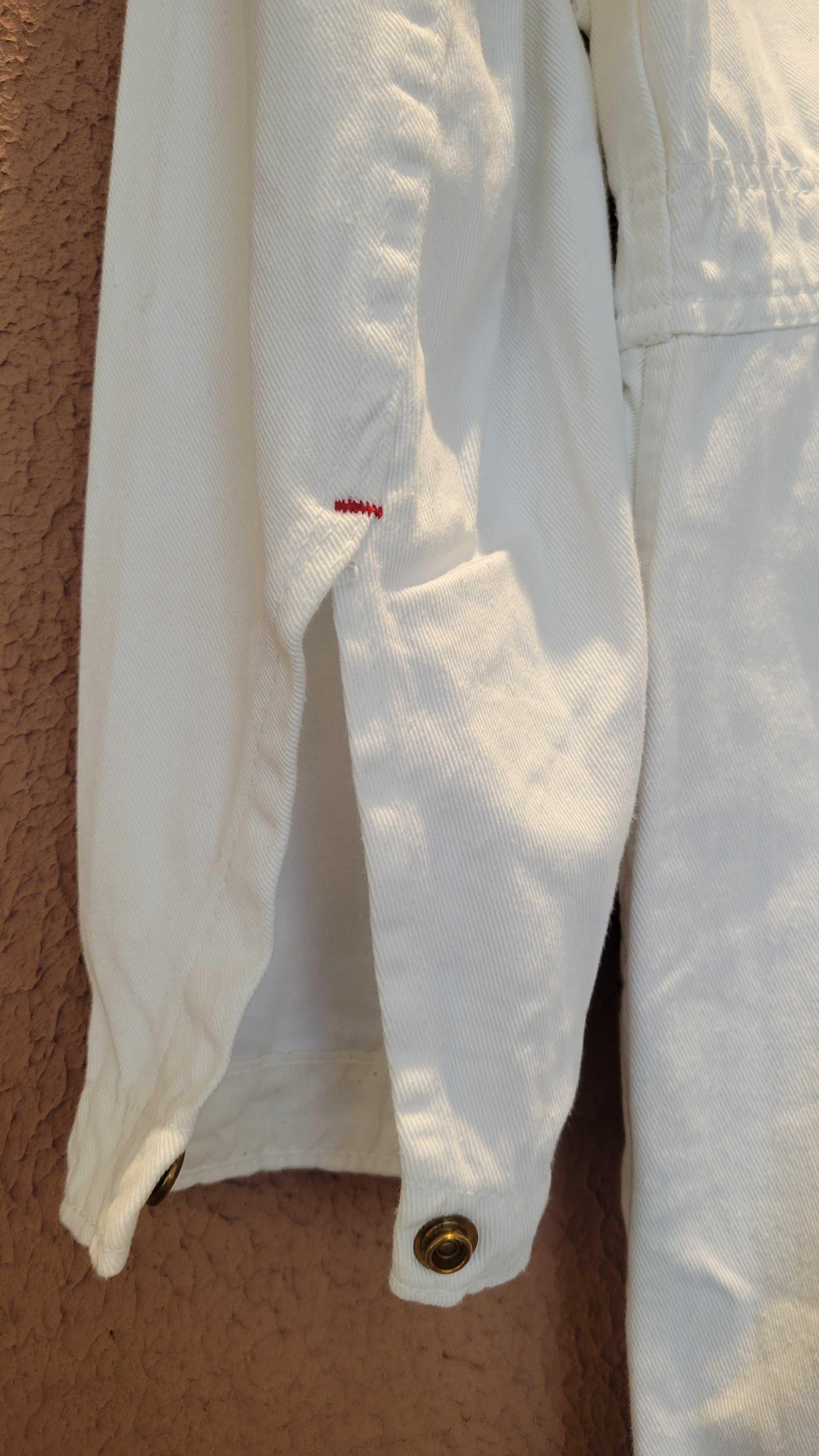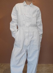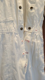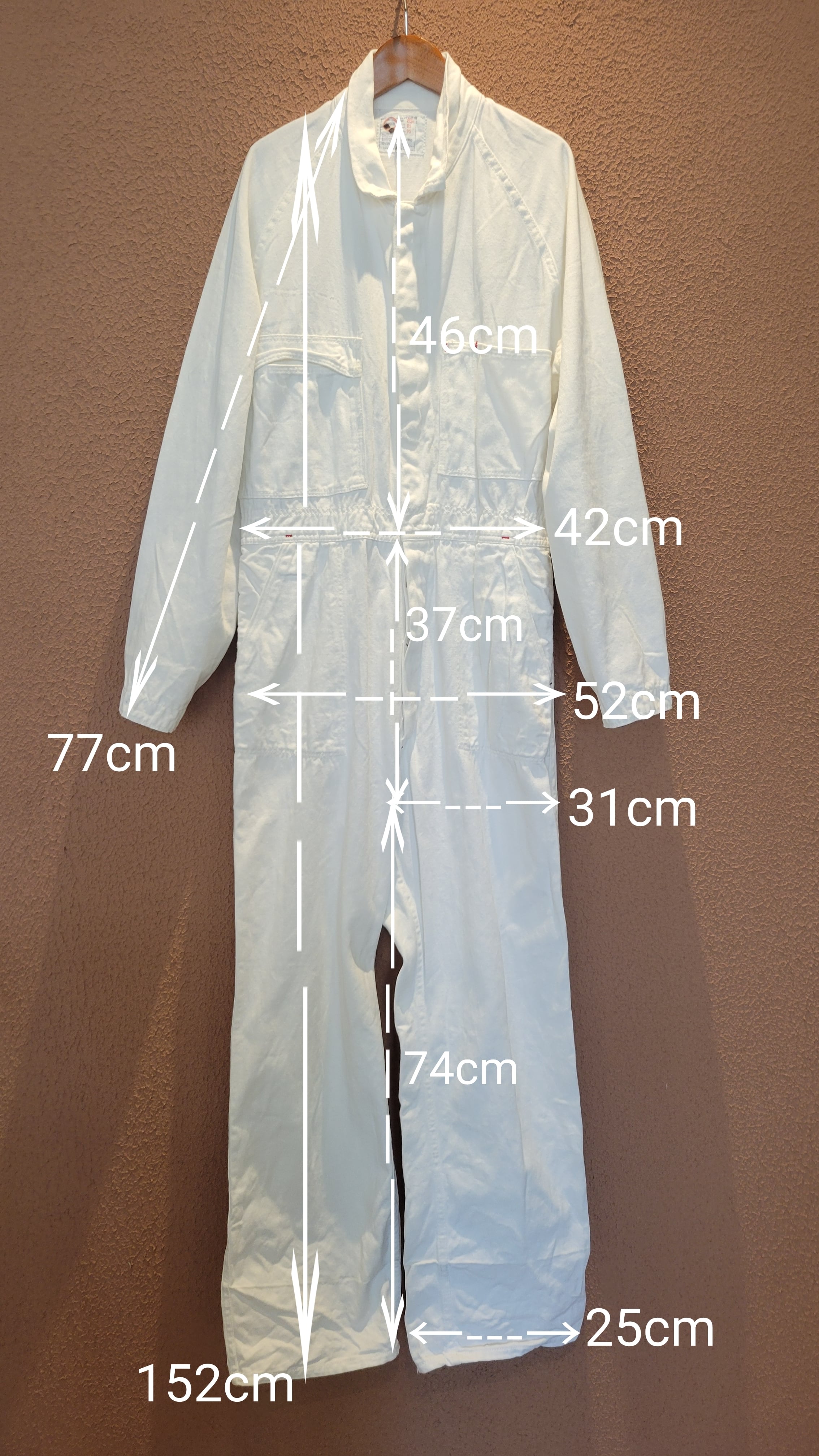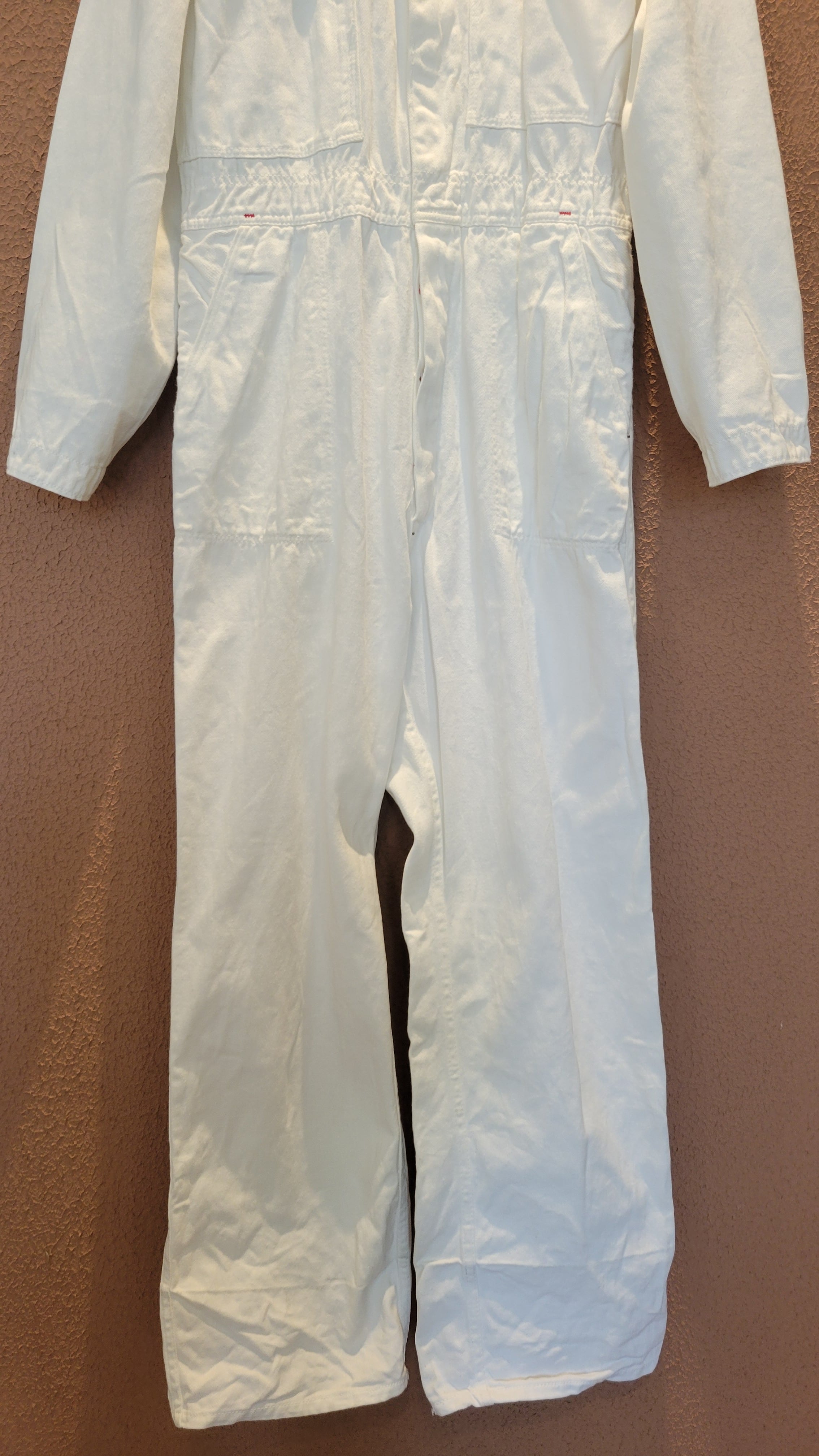 Made in Australia のホワイトデニムジャンプスーツ。フロントはスナップボタンと普通のボタンどちらも使われています。所々に入った赤のステッチが良いアクセントに。無骨なワーク系デザインを白が品良くまとめた1着です。