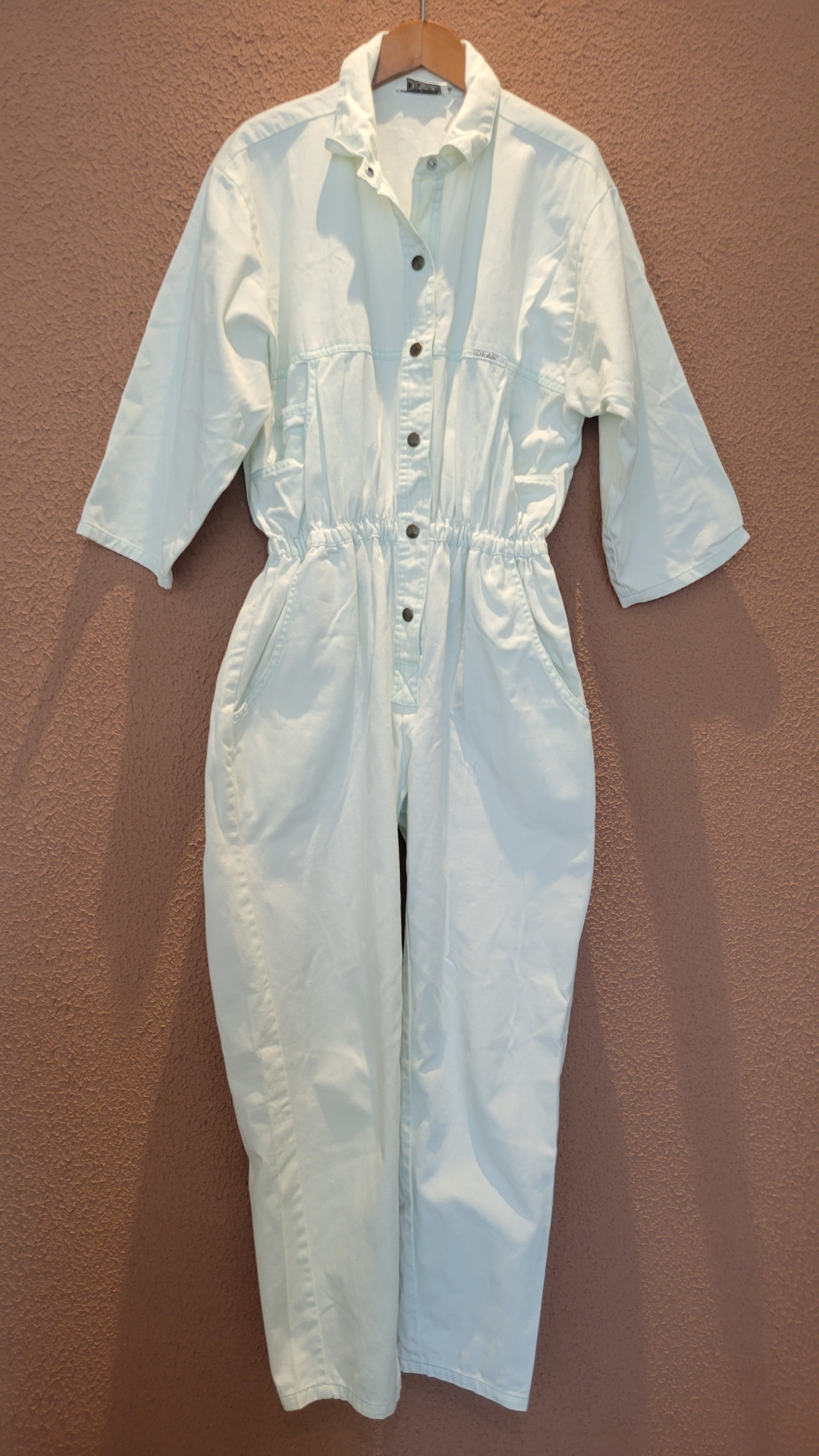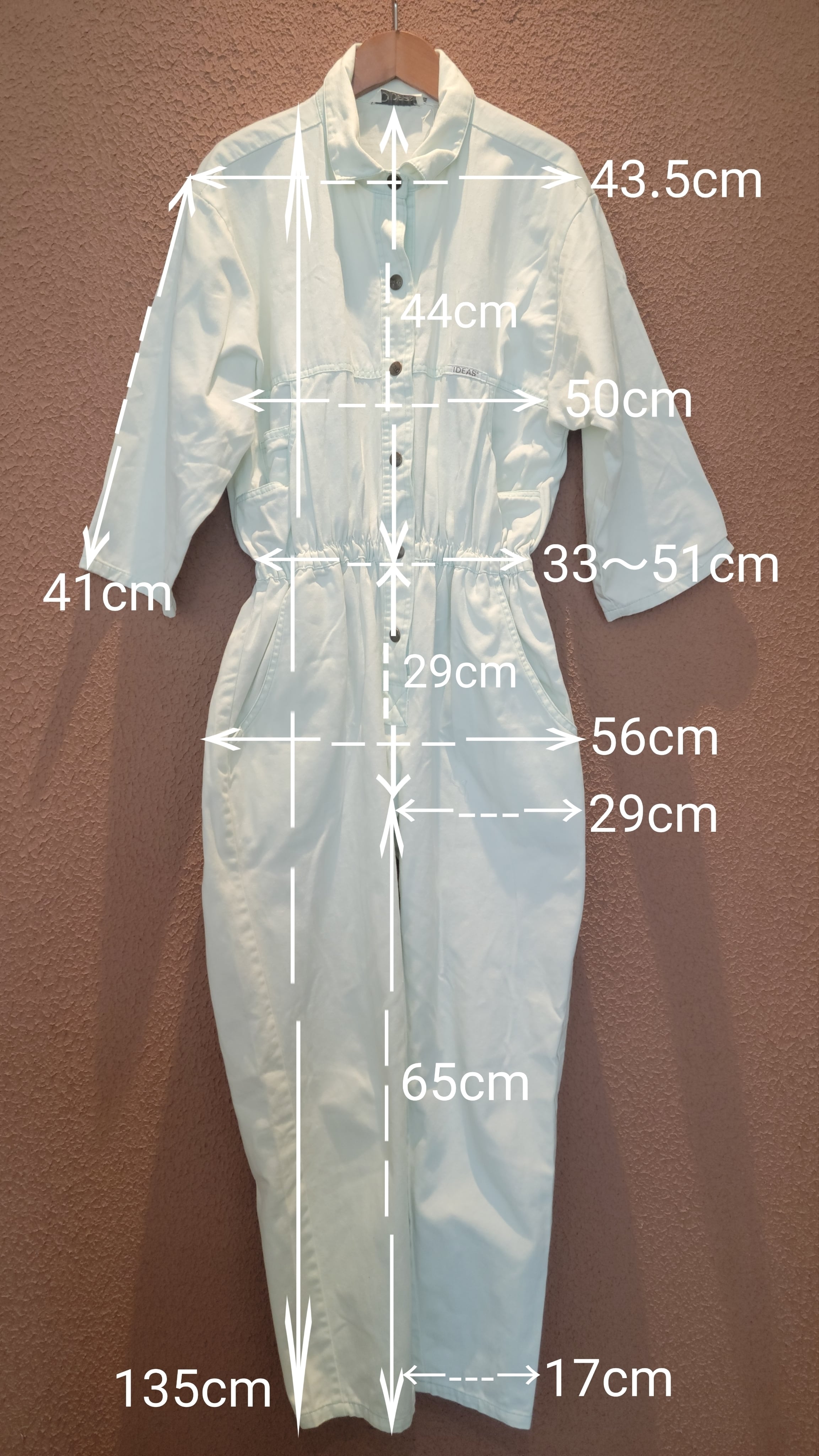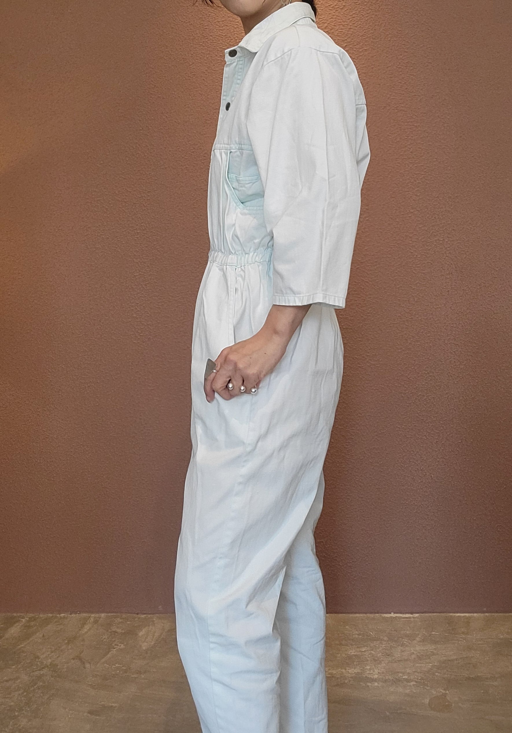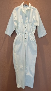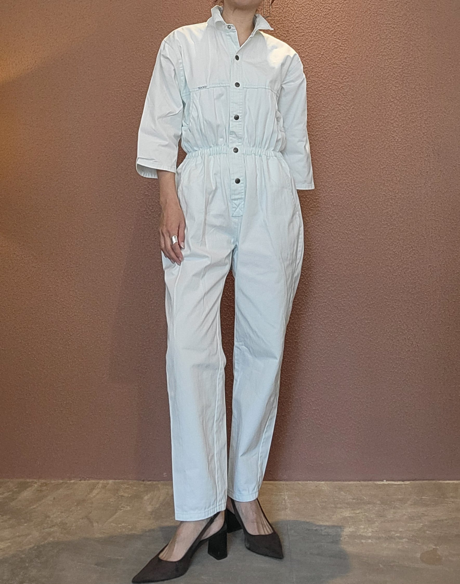 80s デニムジャンプスーツ。フロントはスナップボタン、ウエストゴム、袖は七分丈です。色はほんのり薄水色〜薄グリーンの入った白になります。肩はあえての落ちるデザイン、ドルマンスリーブ、ハイウエスト、テーパードシルエット等、80sならではのデザインがたっぷり詰まっています。スニーカーでカジュアルにも、パンプスできれいめにもスタイリングできます。