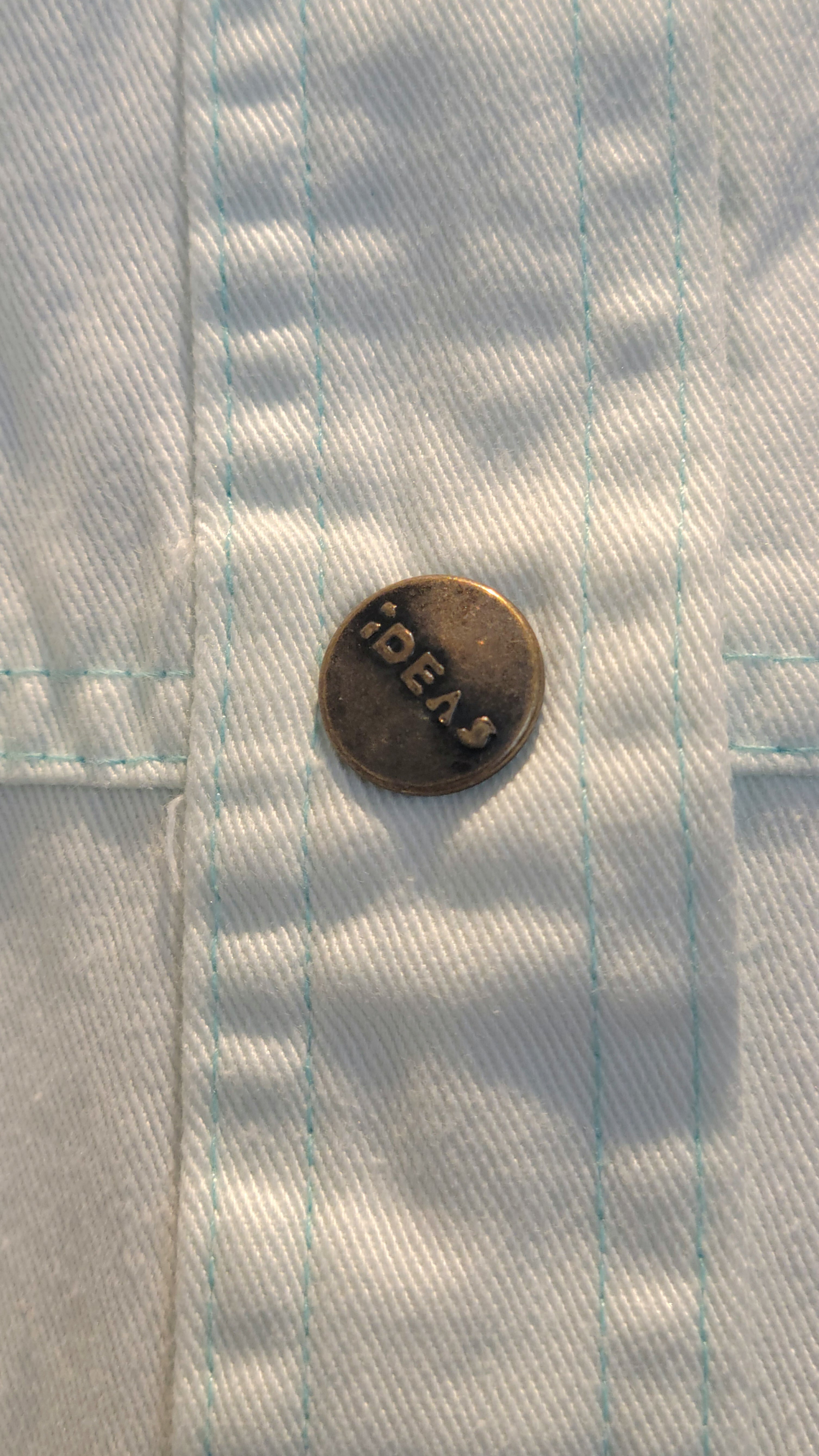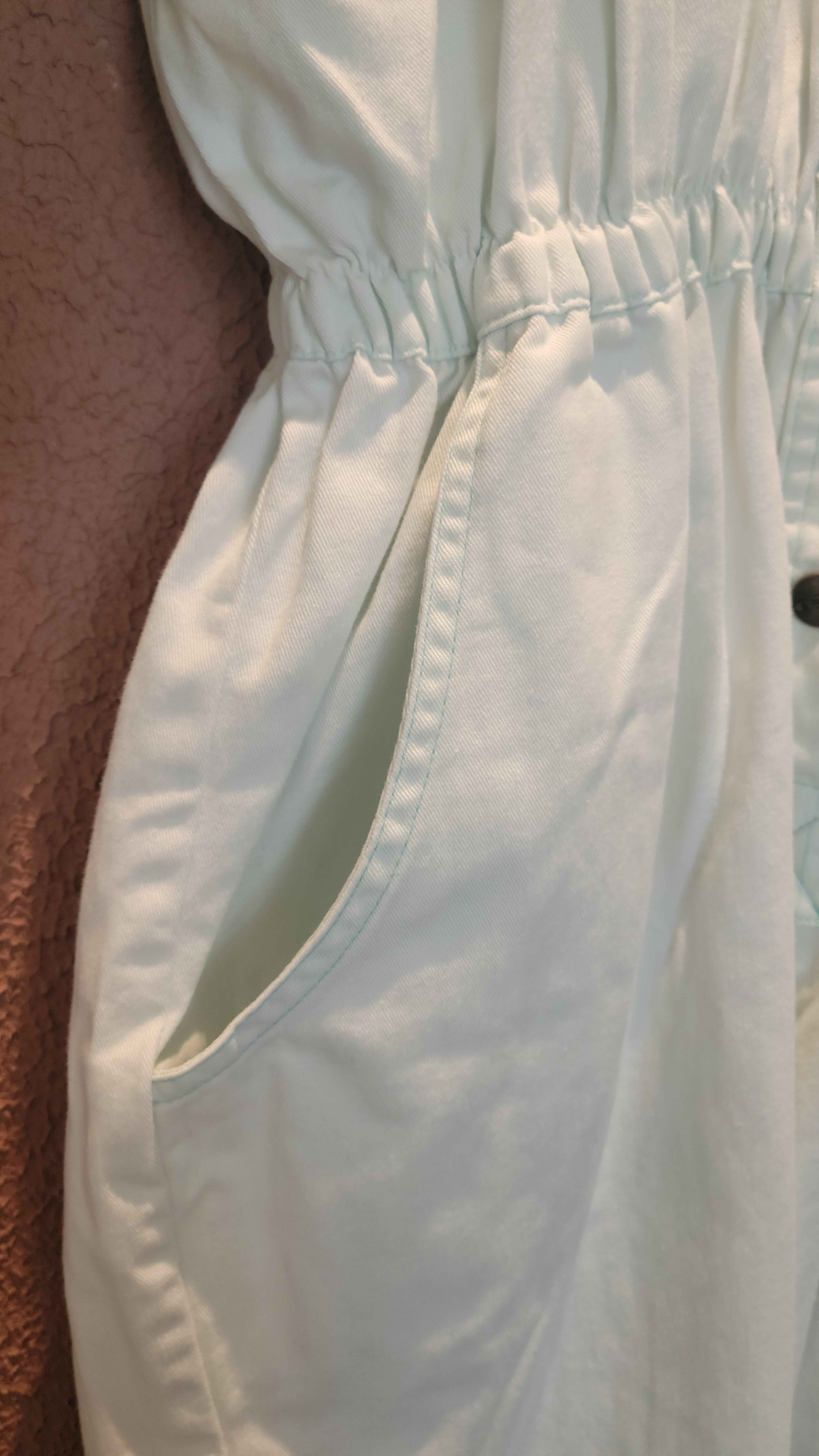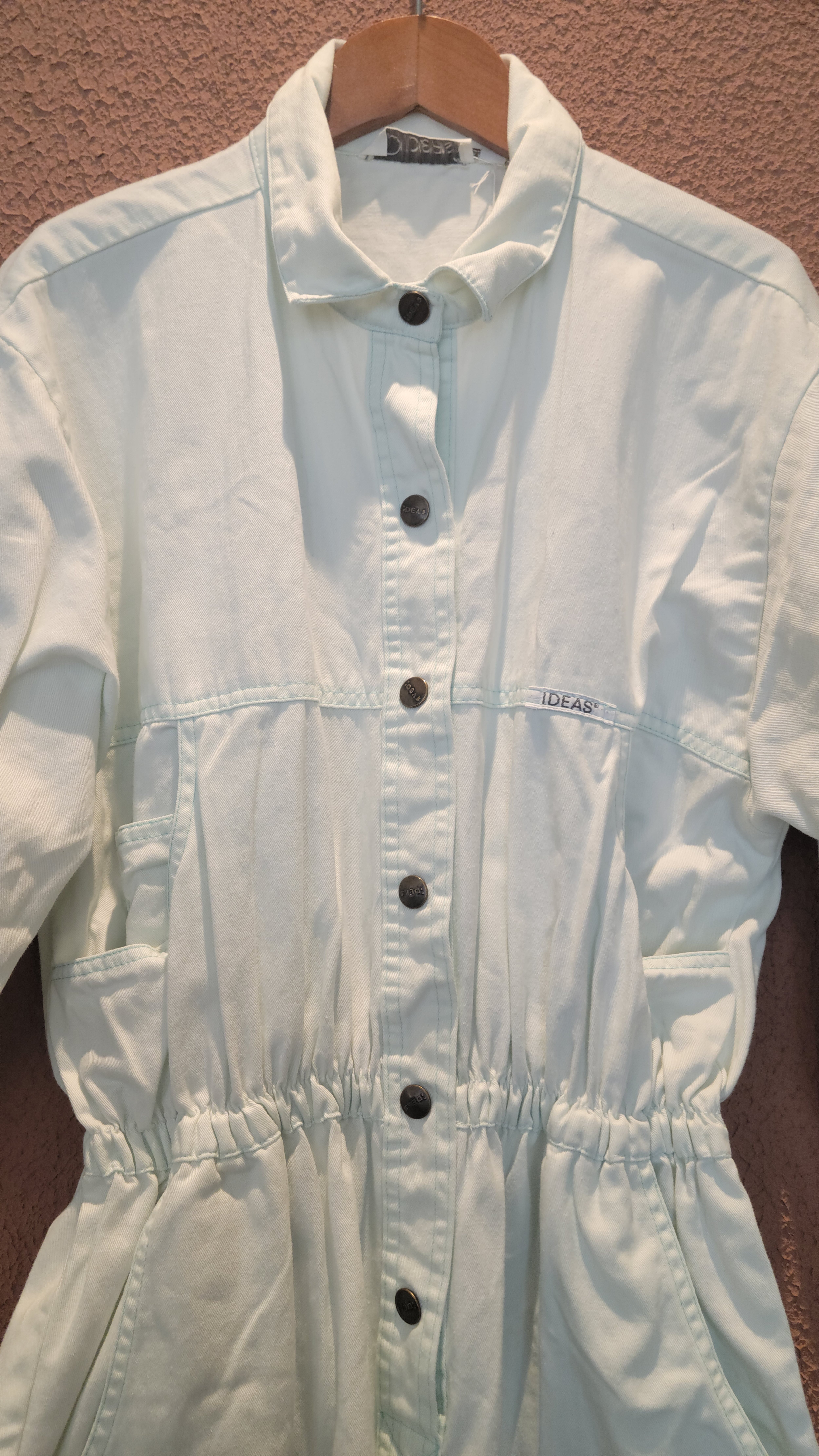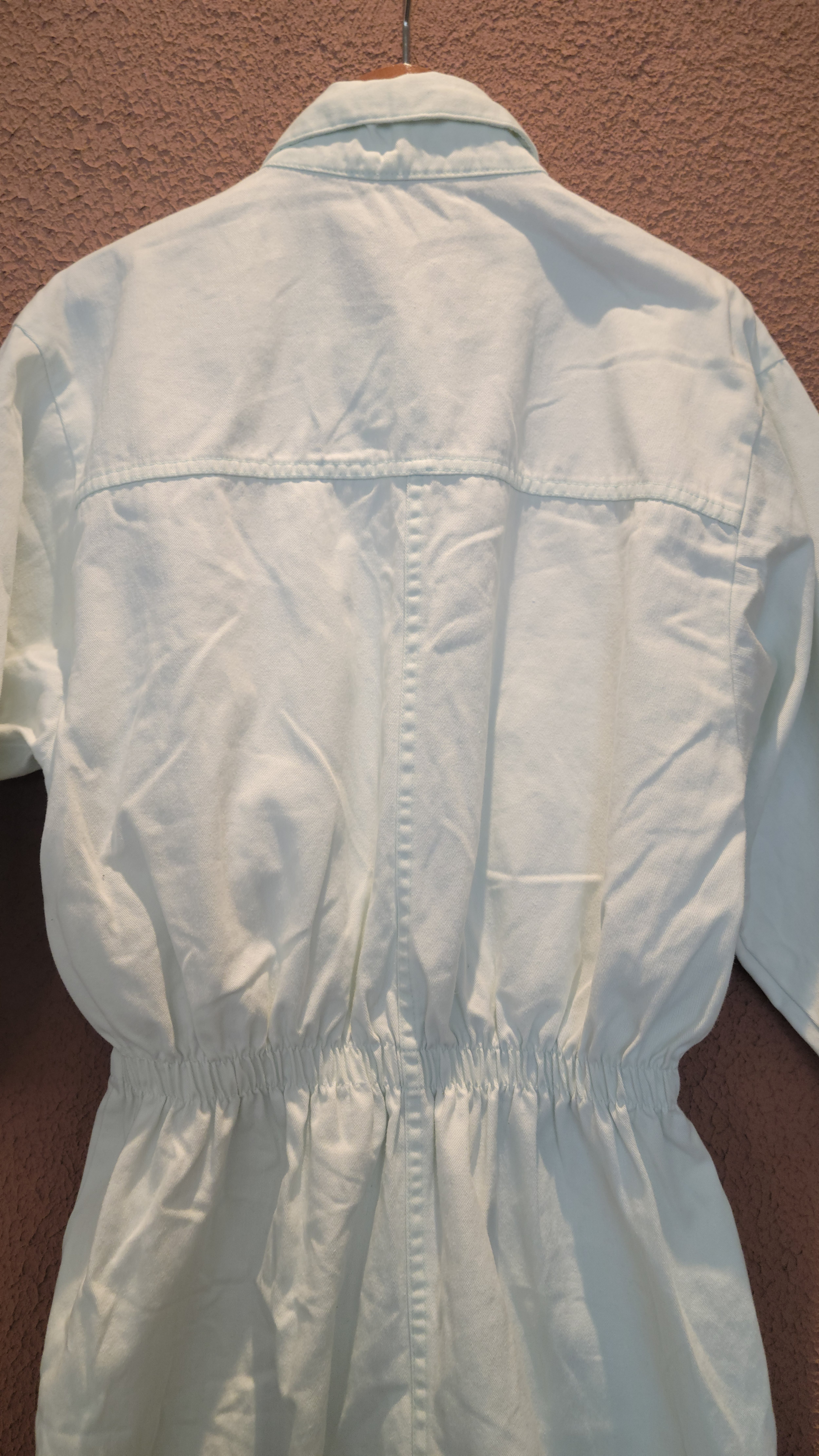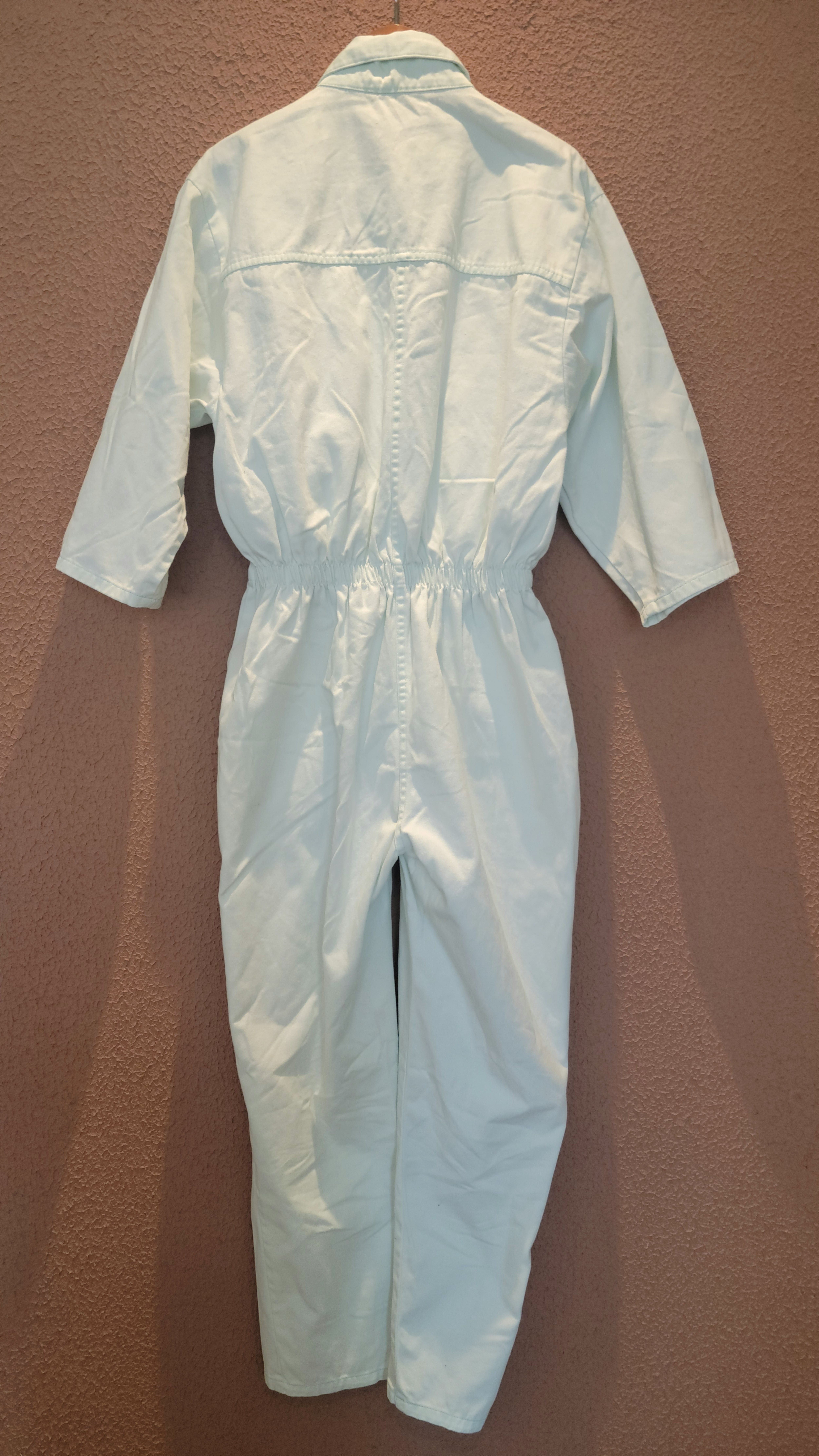 80s デニムジャンプスーツ。フロントはスナップボタン、ウエストゴム、袖は七分丈です。色はほんのり薄水色〜薄グリーンの入った白になります。肩はあえての落ちるデザイン、ドルマンスリーブ、ハイウエスト、テーパードシルエット等、80sならではのデザインがたっぷり詰まっています。スニーカーでカジュアルにも、パンプスできれいめにもスタイリングできます。