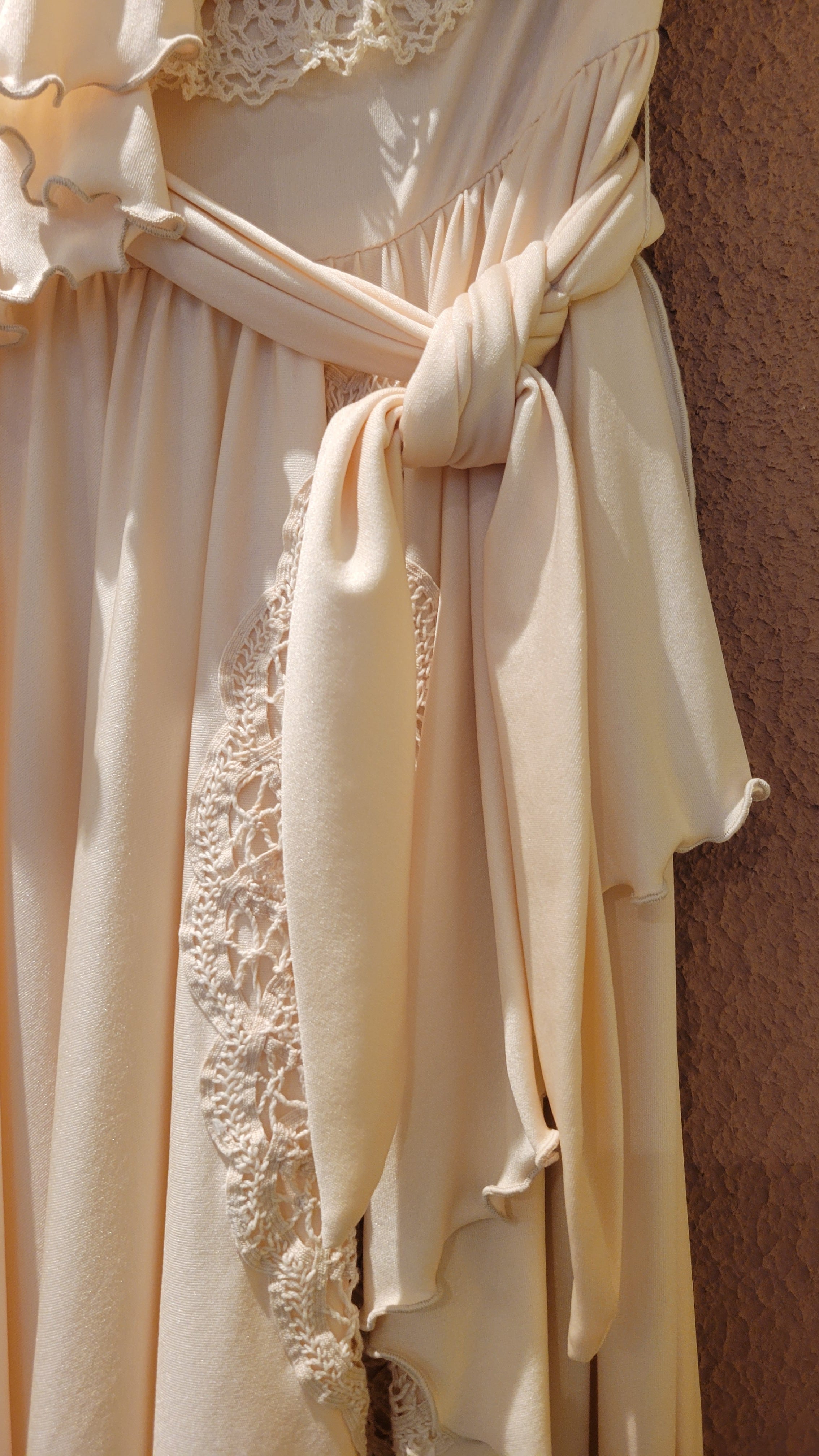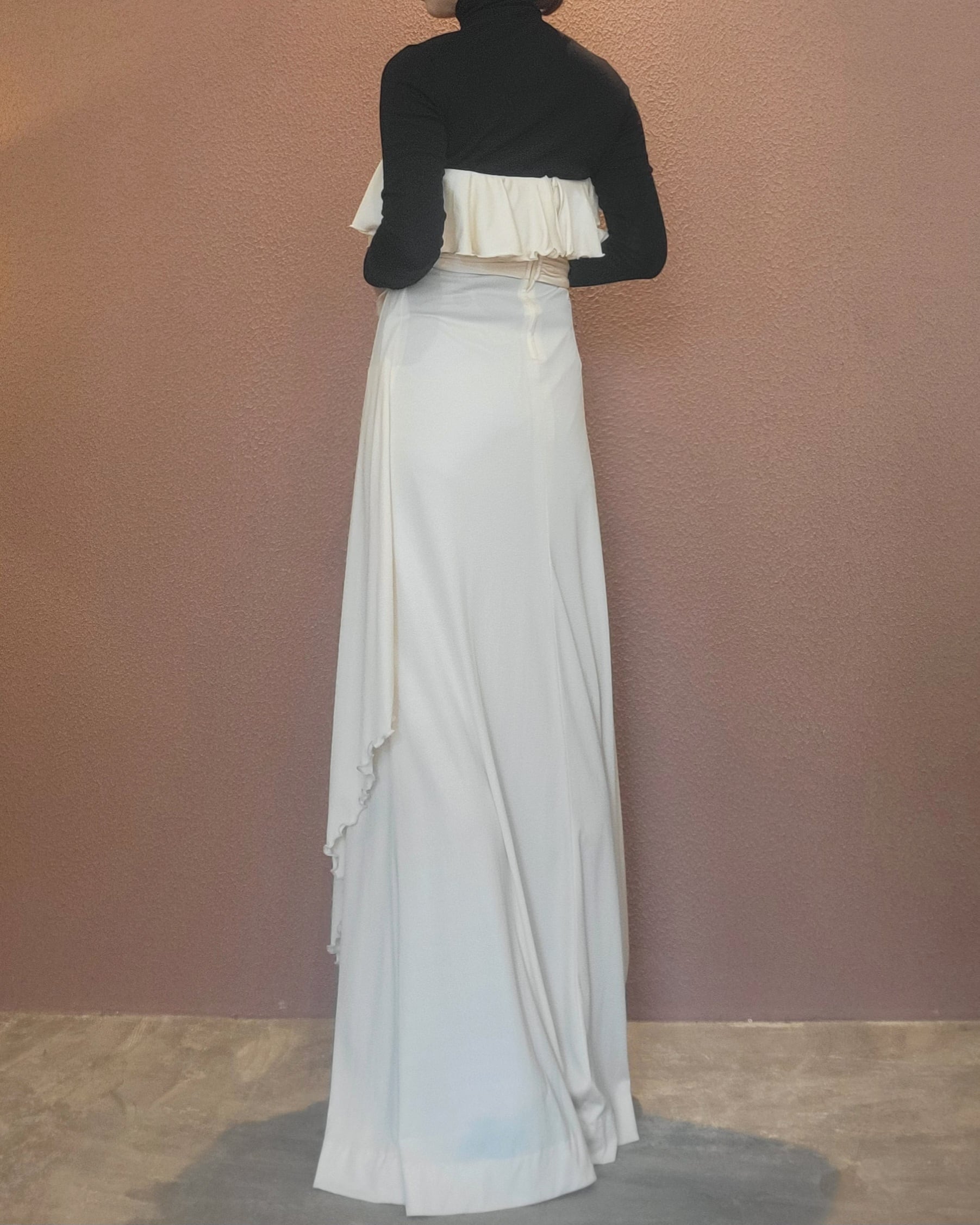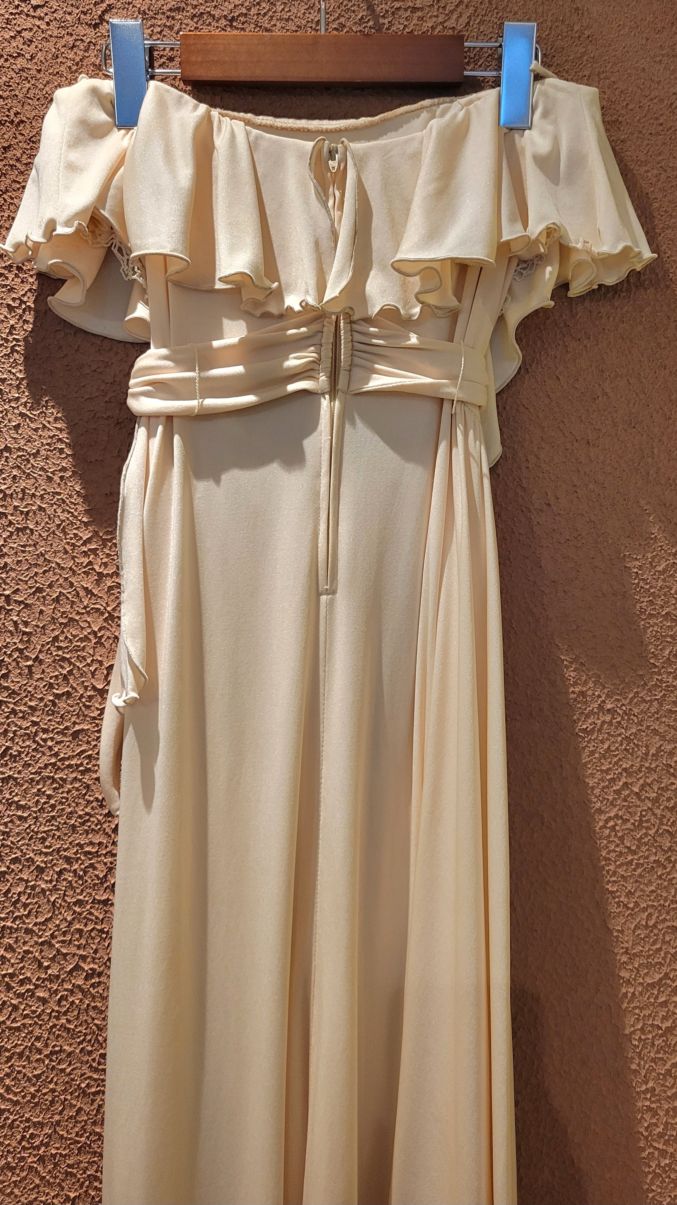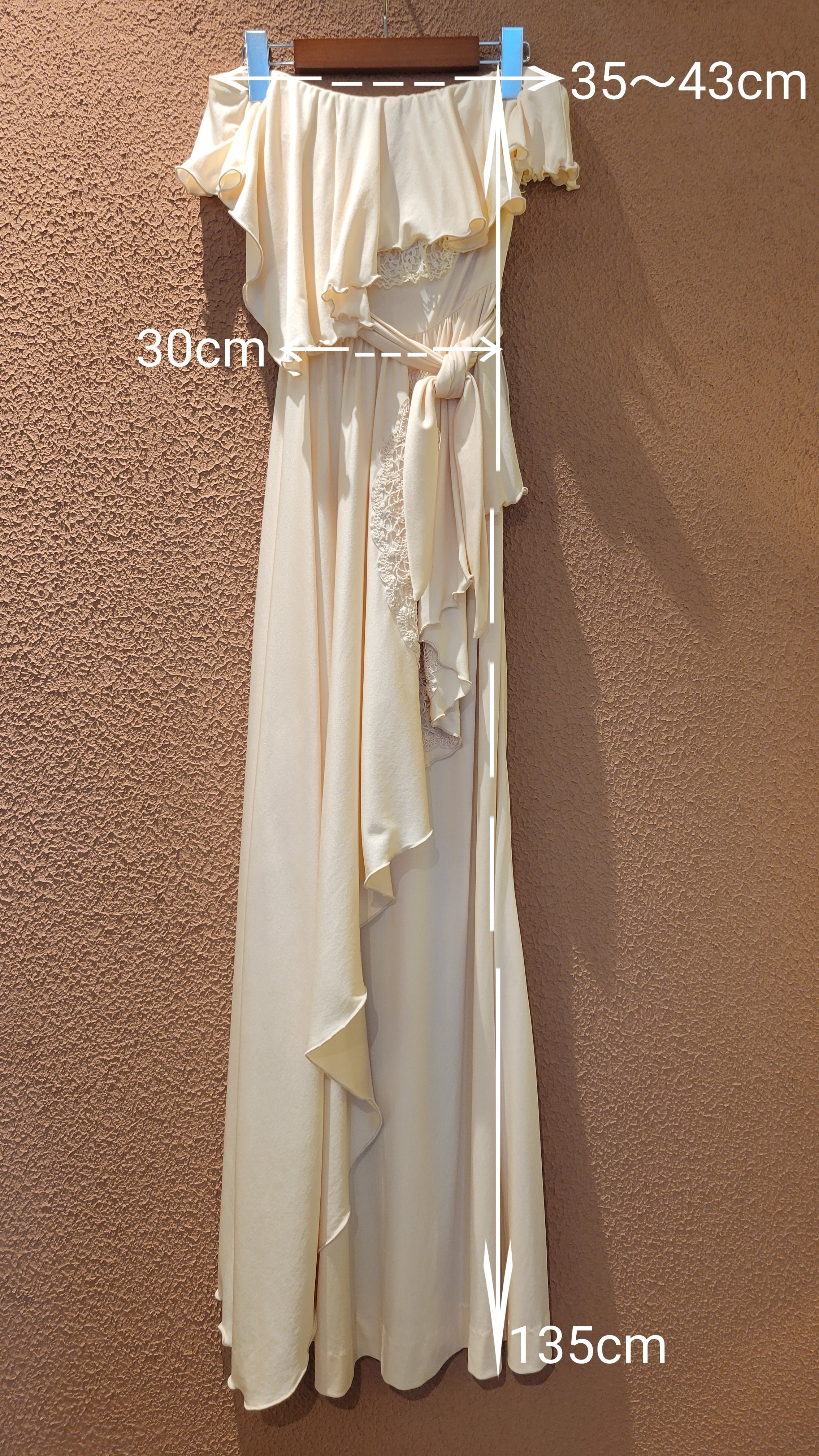 70s ヴィンテージのベアワンピース。素材表記はありませんがポリウレタンのようです。伸縮性があります。やや透け感がありますがインナーにベージュ等のペチコートを着ていただければ問題無く着用できます。トップスの胸元にはゴム入り、バックにファスナー(TALON)付きです。ウエストベルトが縫い付けられておりベルトループに通して左サイドで結びます。ハイウエスト、落ち感のある素材で縦のラインが際立ち、落ち感のあるドレープが大変美しいドレスです。カジュアルウエディングにもぴったりの1着。