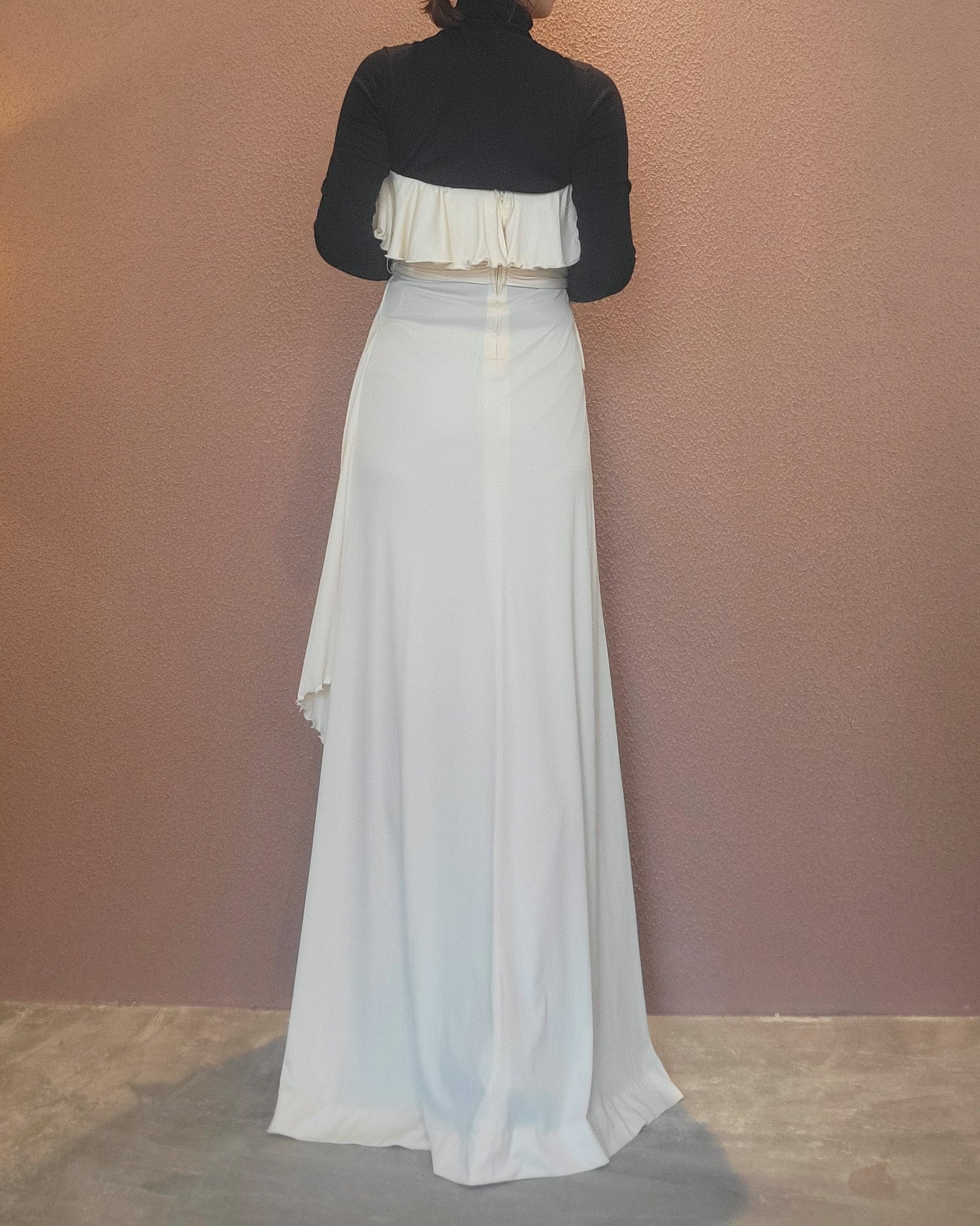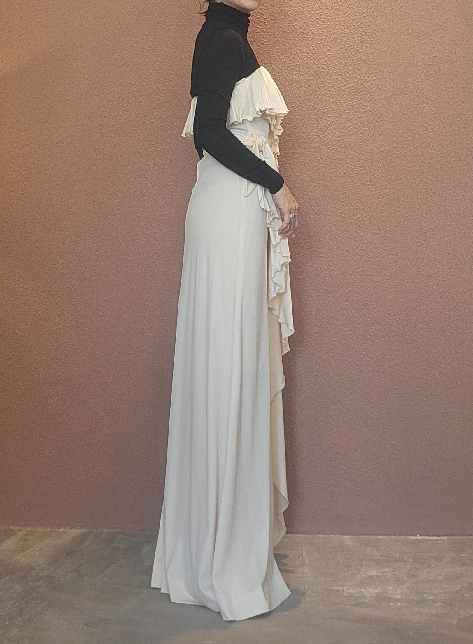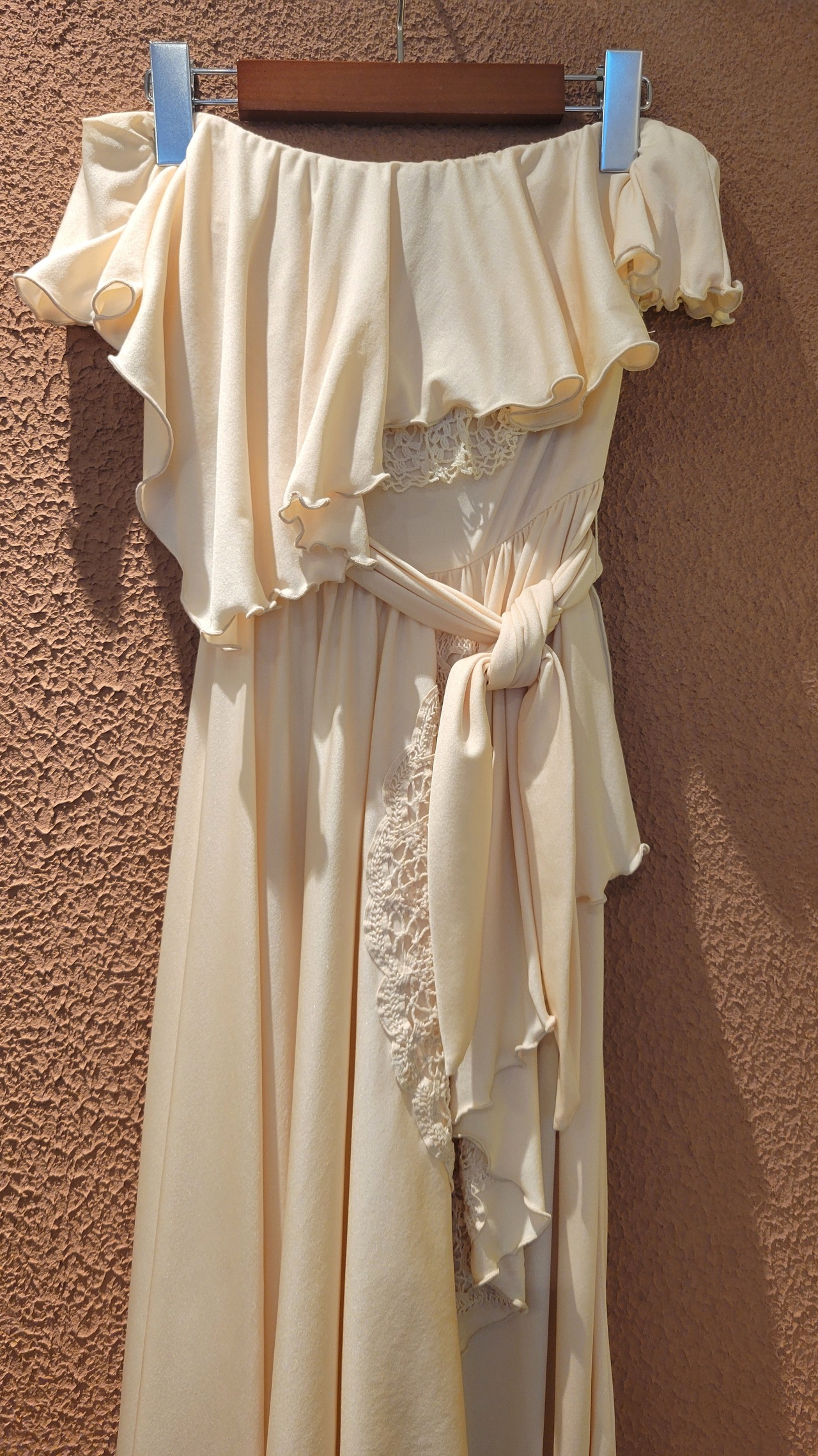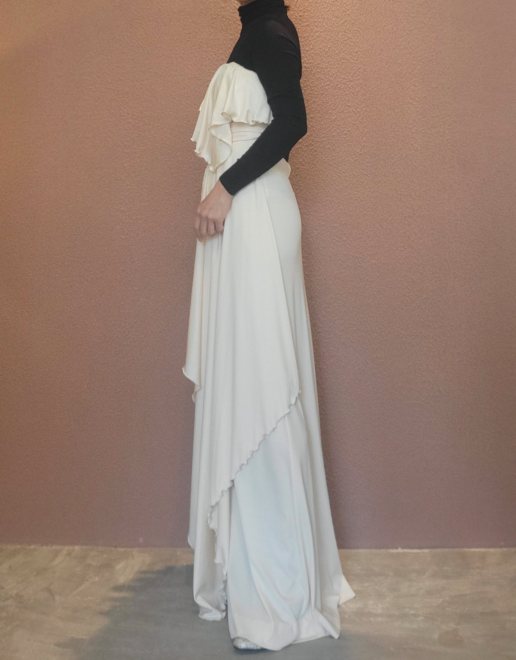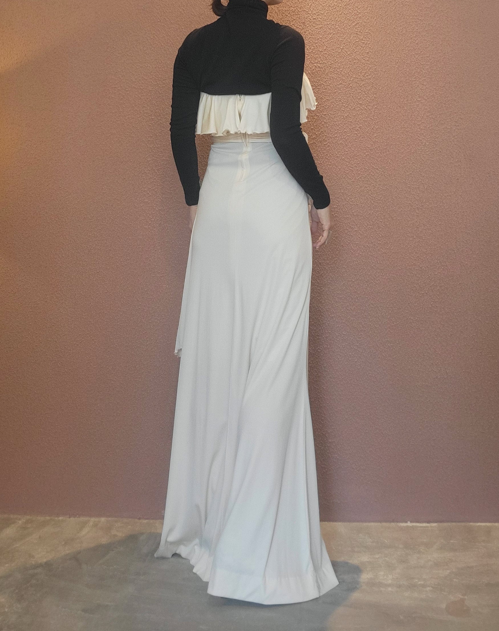 70s ヴィンテージのベアワンピース。素材表記はありませんがポリウレタンのようです。伸縮性があります。やや透け感がありますがインナーにベージュ等のペチコートを着ていただければ問題無く着用できます。トップスの胸元にはゴム入り、バックにファスナー(TALON)付きです。ウエストベルトが縫い付けられておりベルトループに通して左サイドで結びます。ハイウエスト、落ち感のある素材で縦のラインが際立ち、落ち感のあるドレープが大変美しいドレスです。カジュアルウエディングにもぴったりの1着。