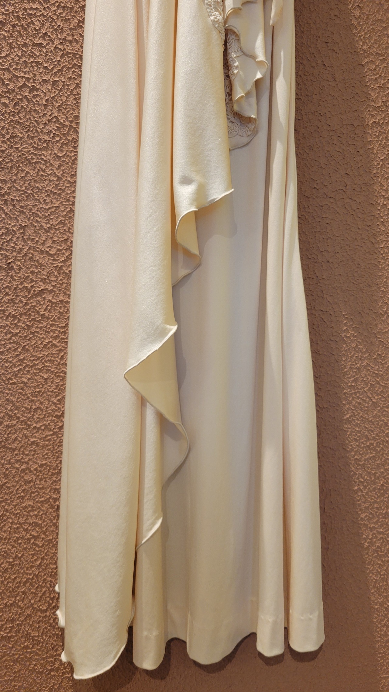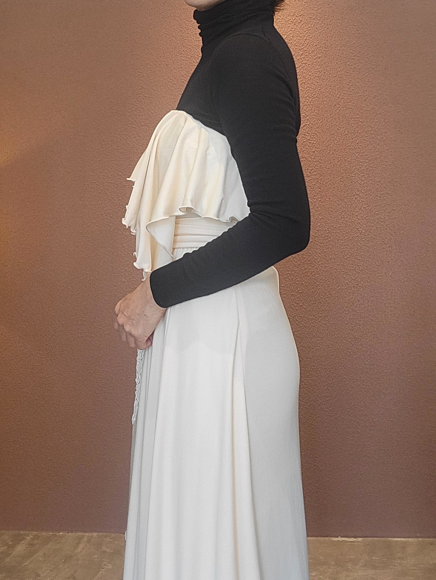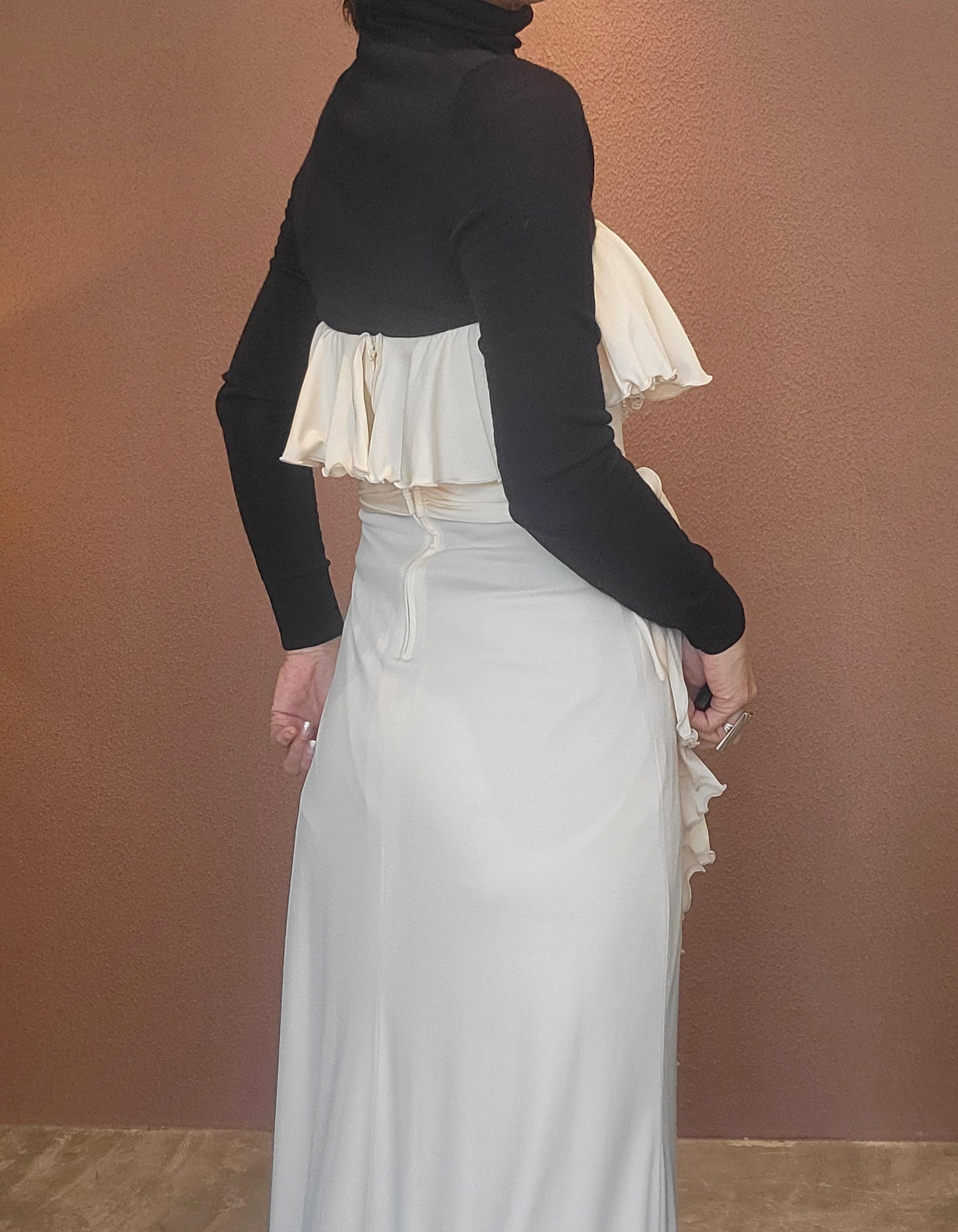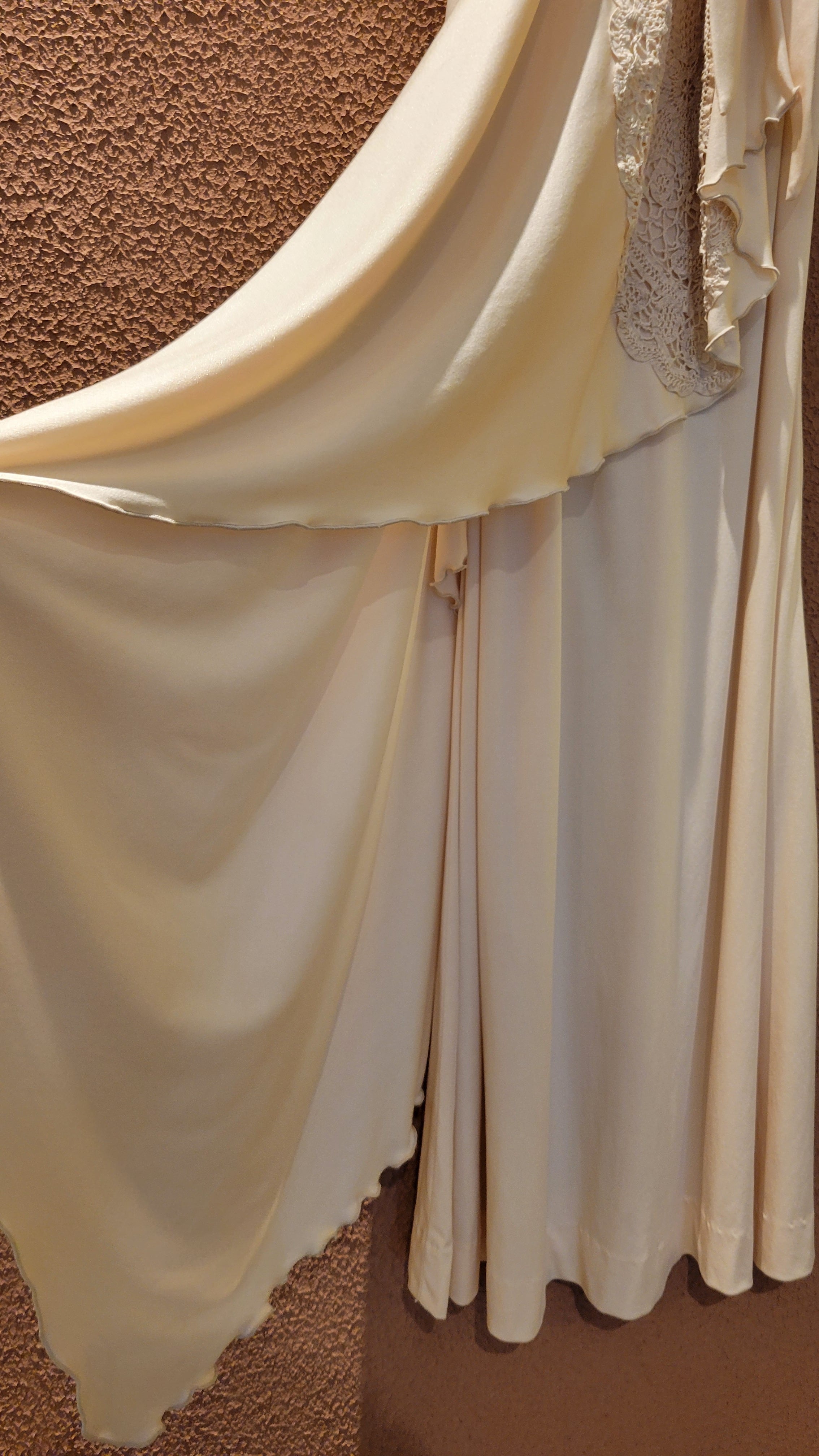 70s ヴィンテージのベアワンピース。素材表記はありませんがポリウレタンのようです。伸縮性があります。やや透け感がありますがインナーにベージュ等のペチコートを着ていただければ問題無く着用できます。トップスの胸元にはゴム入り、バックにファスナー(TALON)付きです。ウエストベルトが縫い付けられておりベルトループに通して左サイドで結びます。ハイウエスト、落ち感のある素材で縦のラインが際立ち、落ち感のあるドレープが大変美しいドレスです。カジュアルウエディングにもぴったりの1着。
