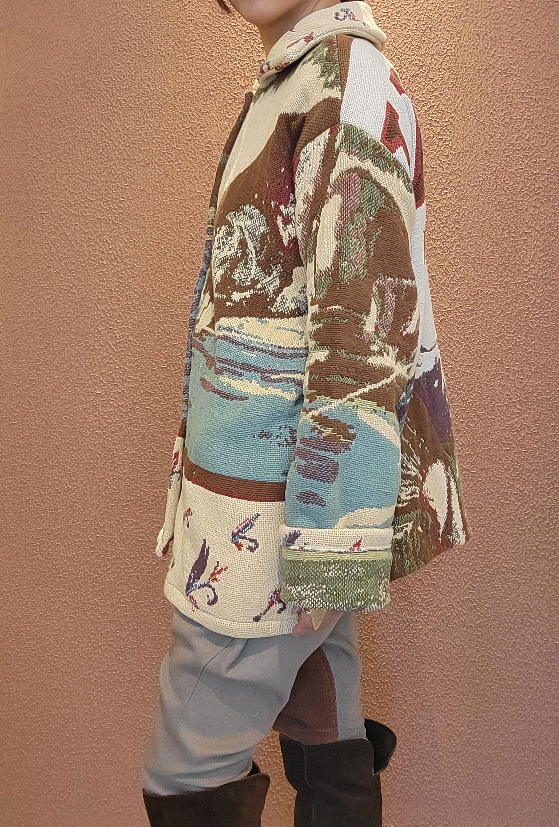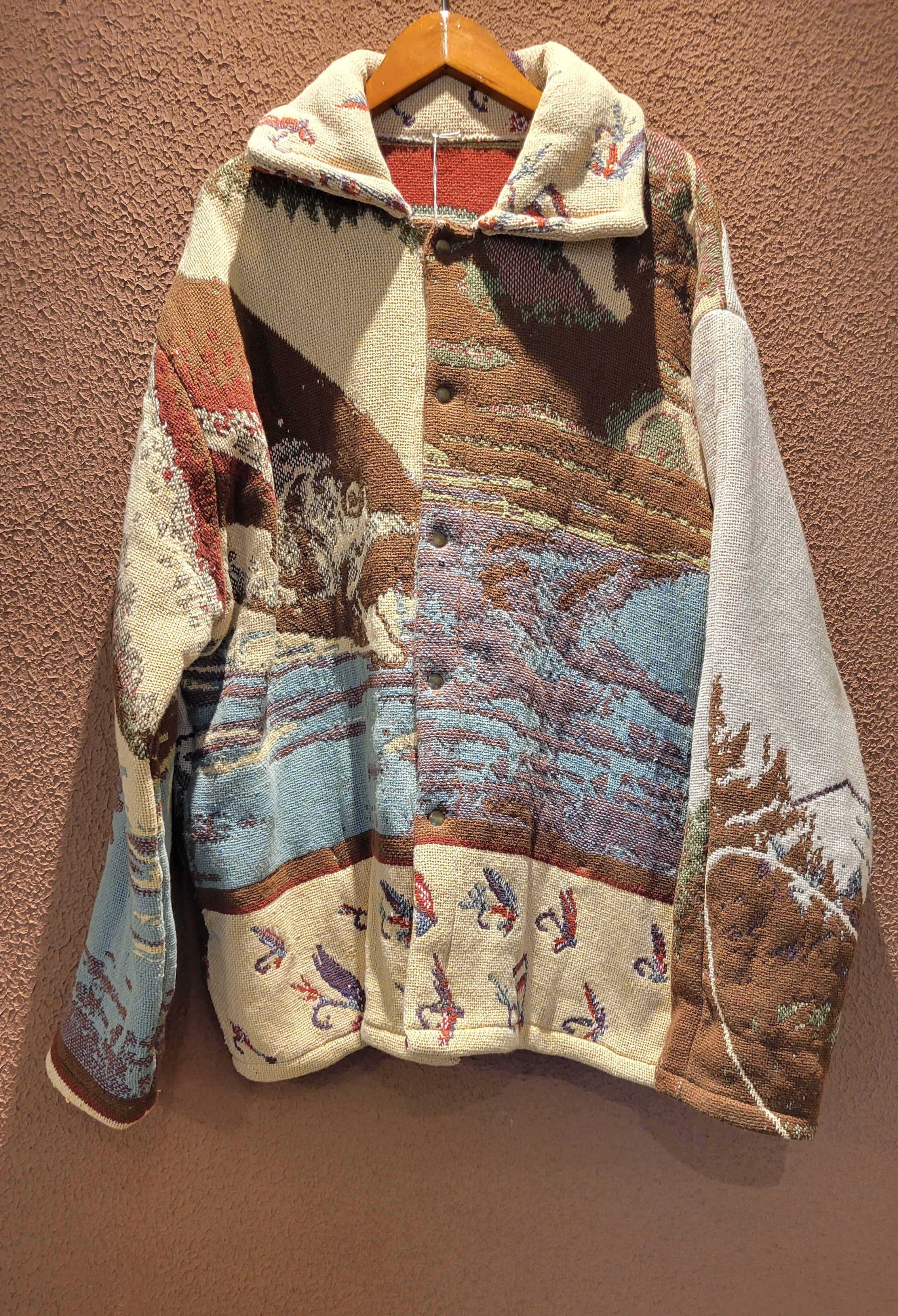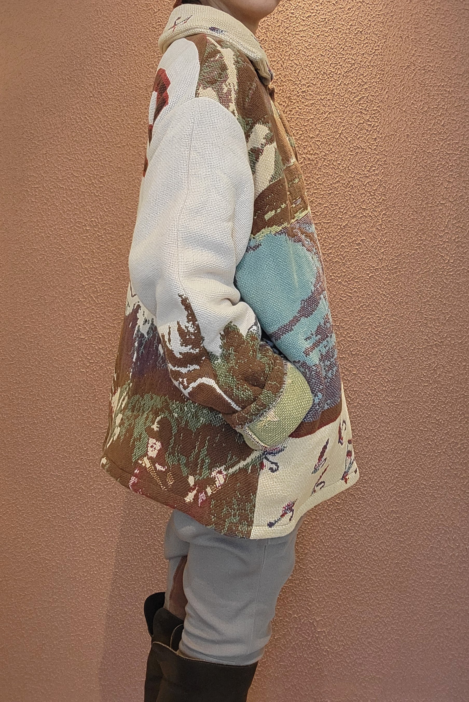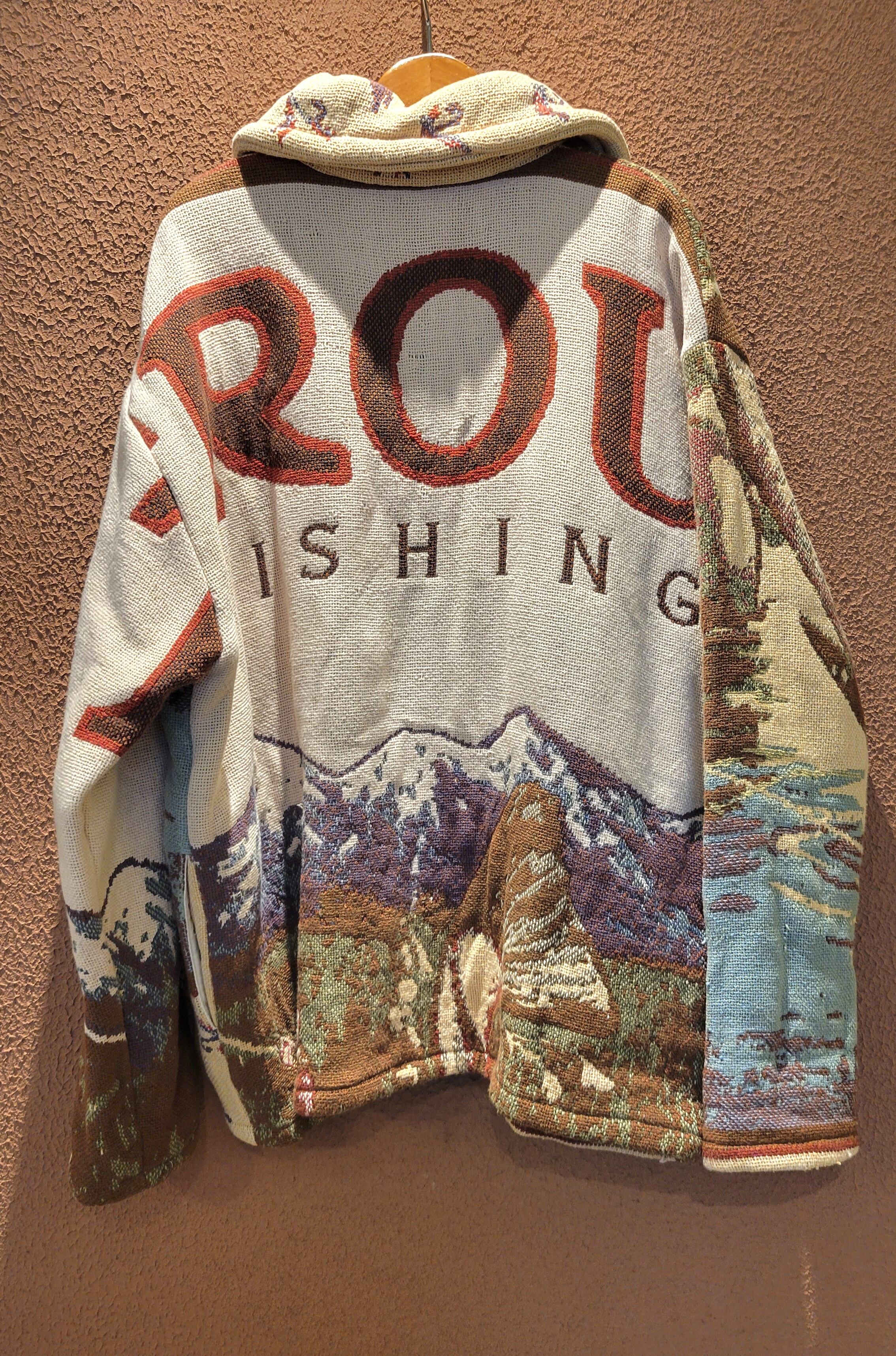 usedブランケットを使用したリメイクジャケット。素材はコットンです。フロントはスナップボタン仕様。左右サイドポケット付き。元々はメンズ仕様ですが女性がオーバーサイズで着ても素敵です。スウェットやニットなどやや厚手のインナーもOKなゆったりサイズ感。釣りモチーフの柄で裾のルアー柄などユニークな1着。春先まで着られます。