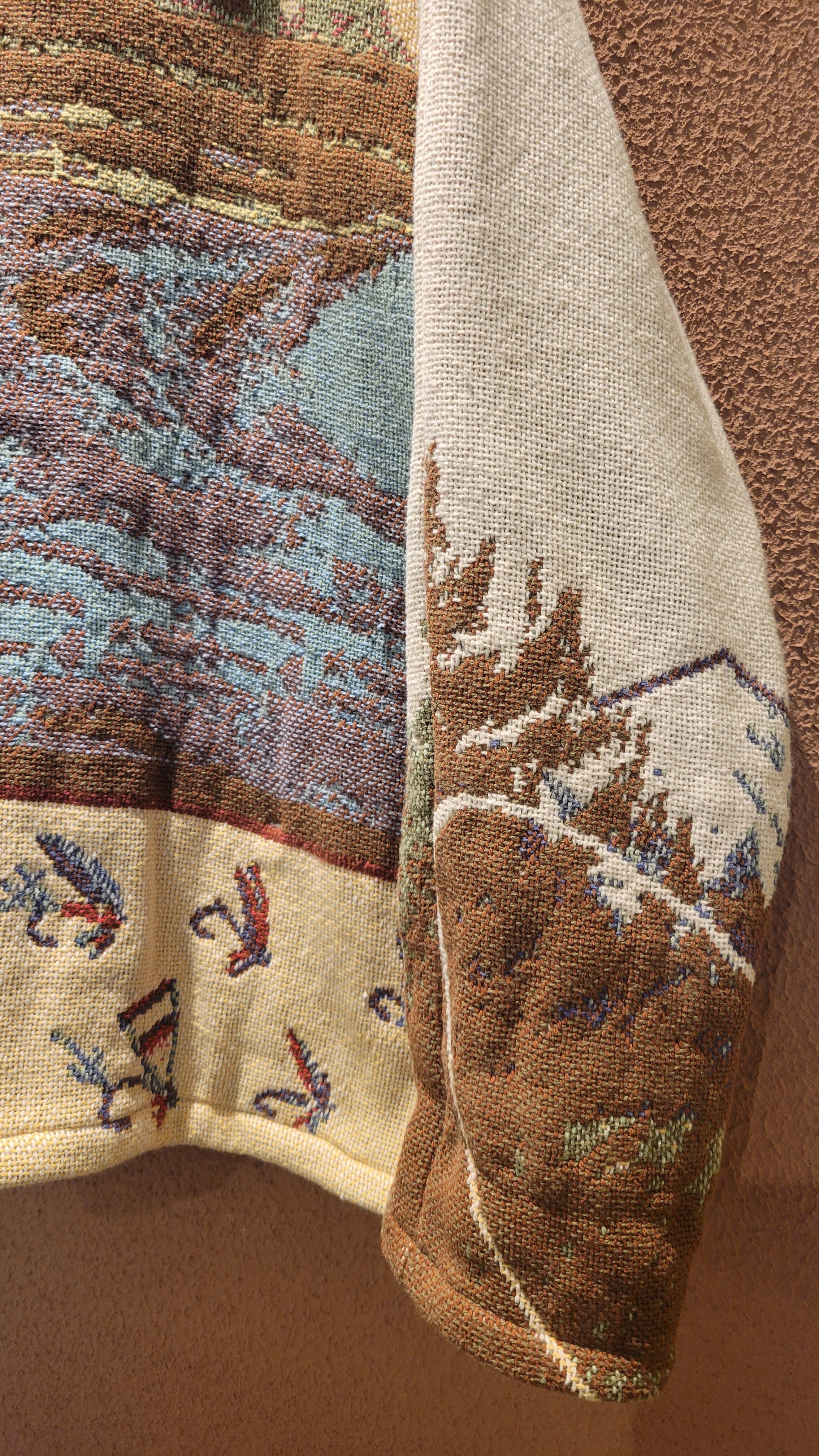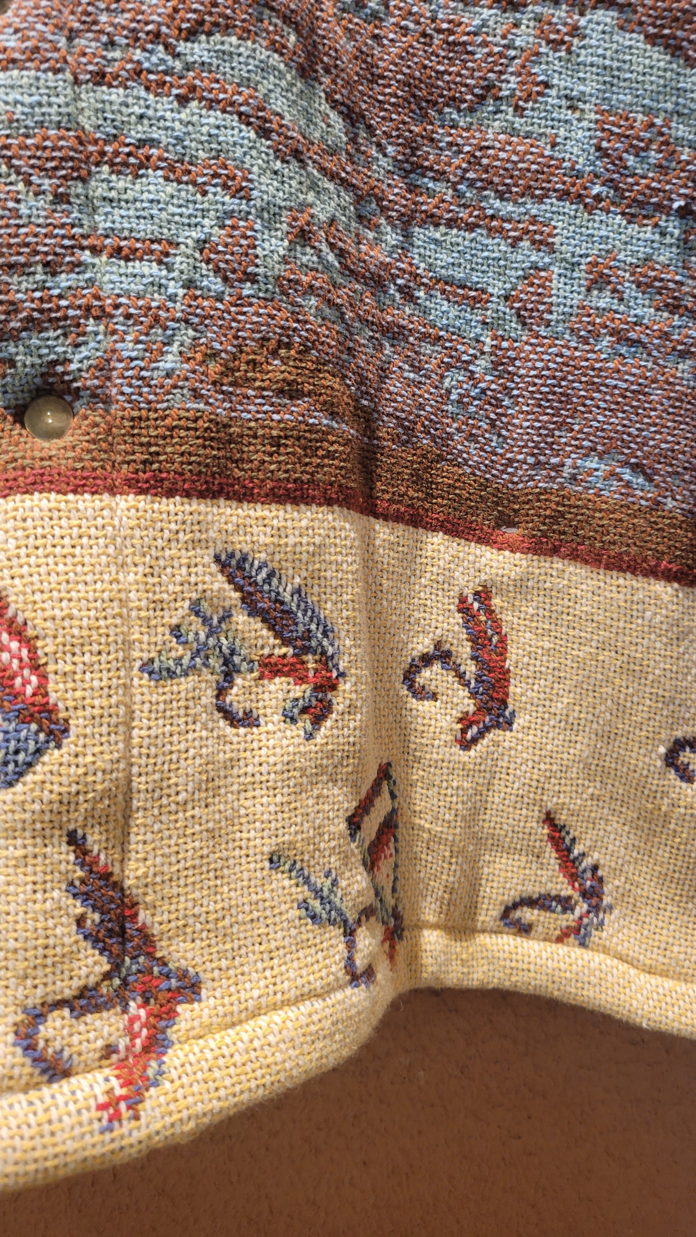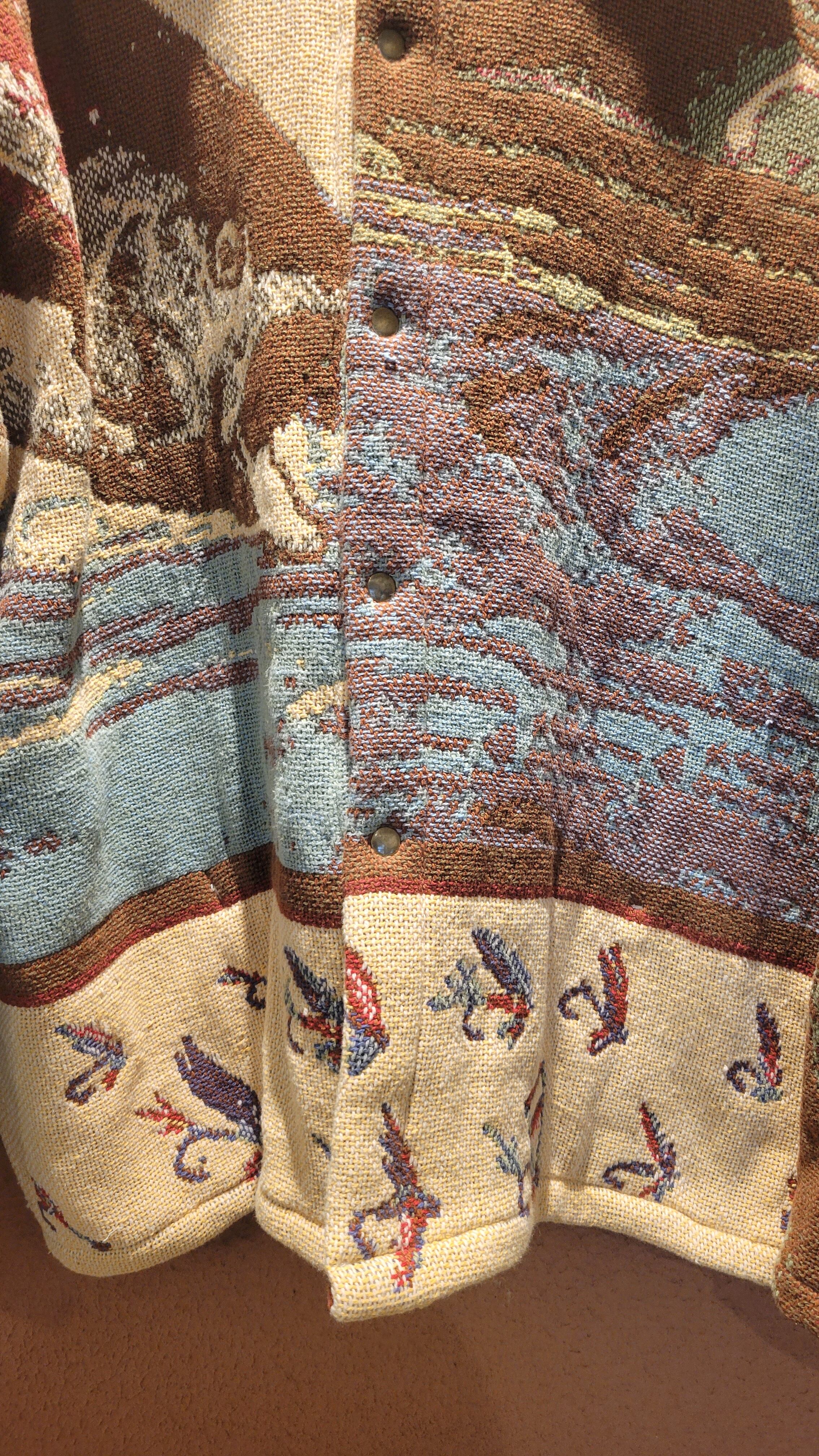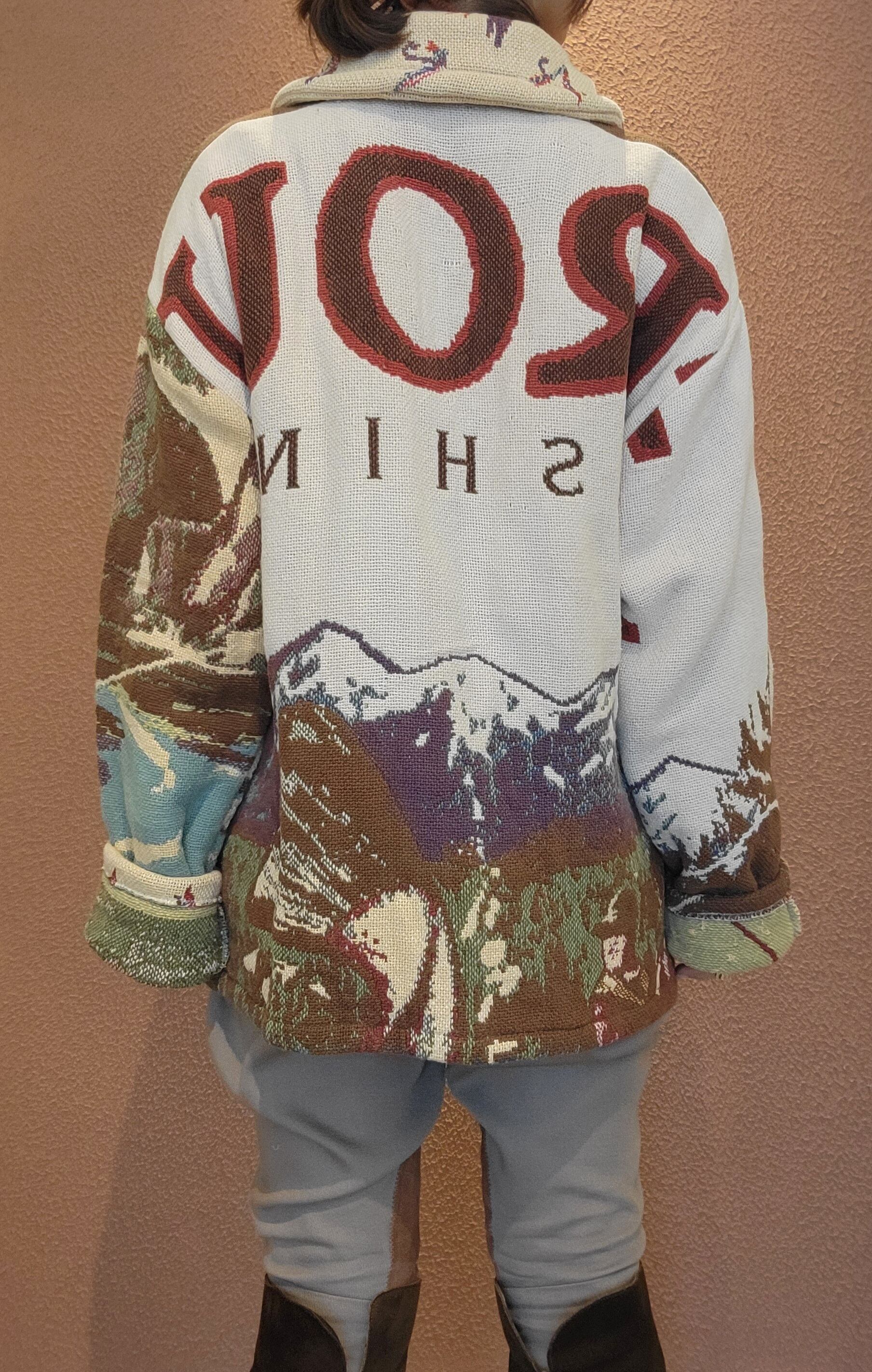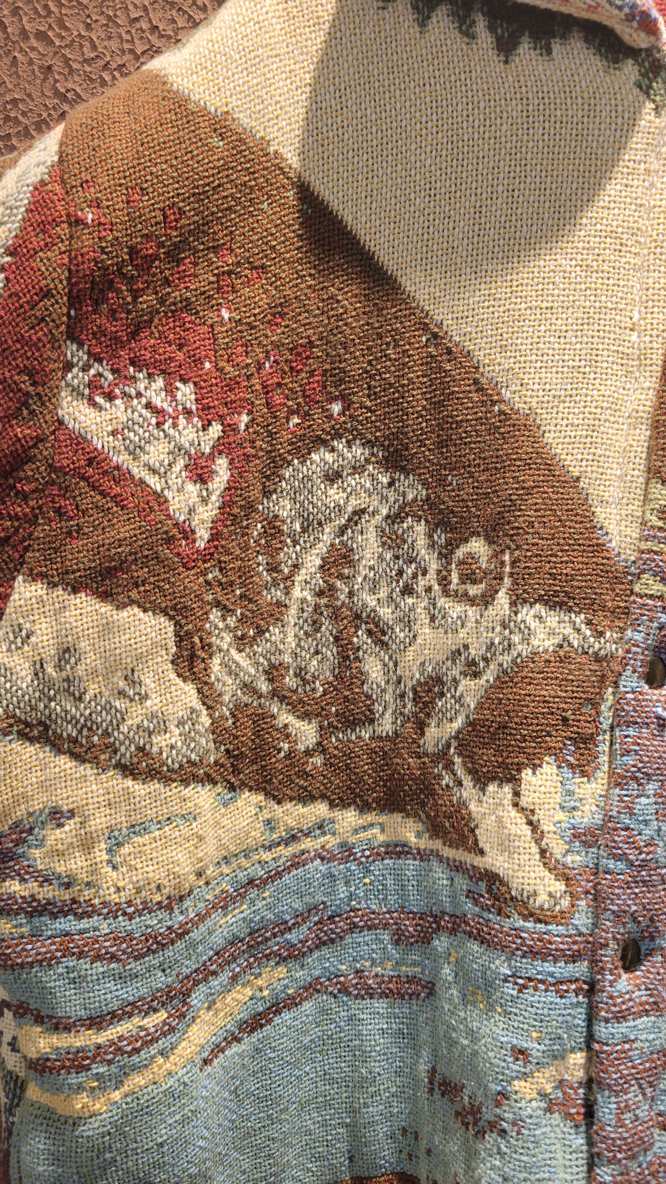 usedブランケットを使用したリメイクジャケット。素材はコットンです。フロントはスナップボタン仕様。左右サイドポケット付き。元々はメンズ仕様ですが女性がオーバーサイズで着ても素敵です。スウェットやニットなどやや厚手のインナーもOKなゆったりサイズ感。釣りモチーフの柄で裾のルアー柄などユニークな1着。春先まで着られます。