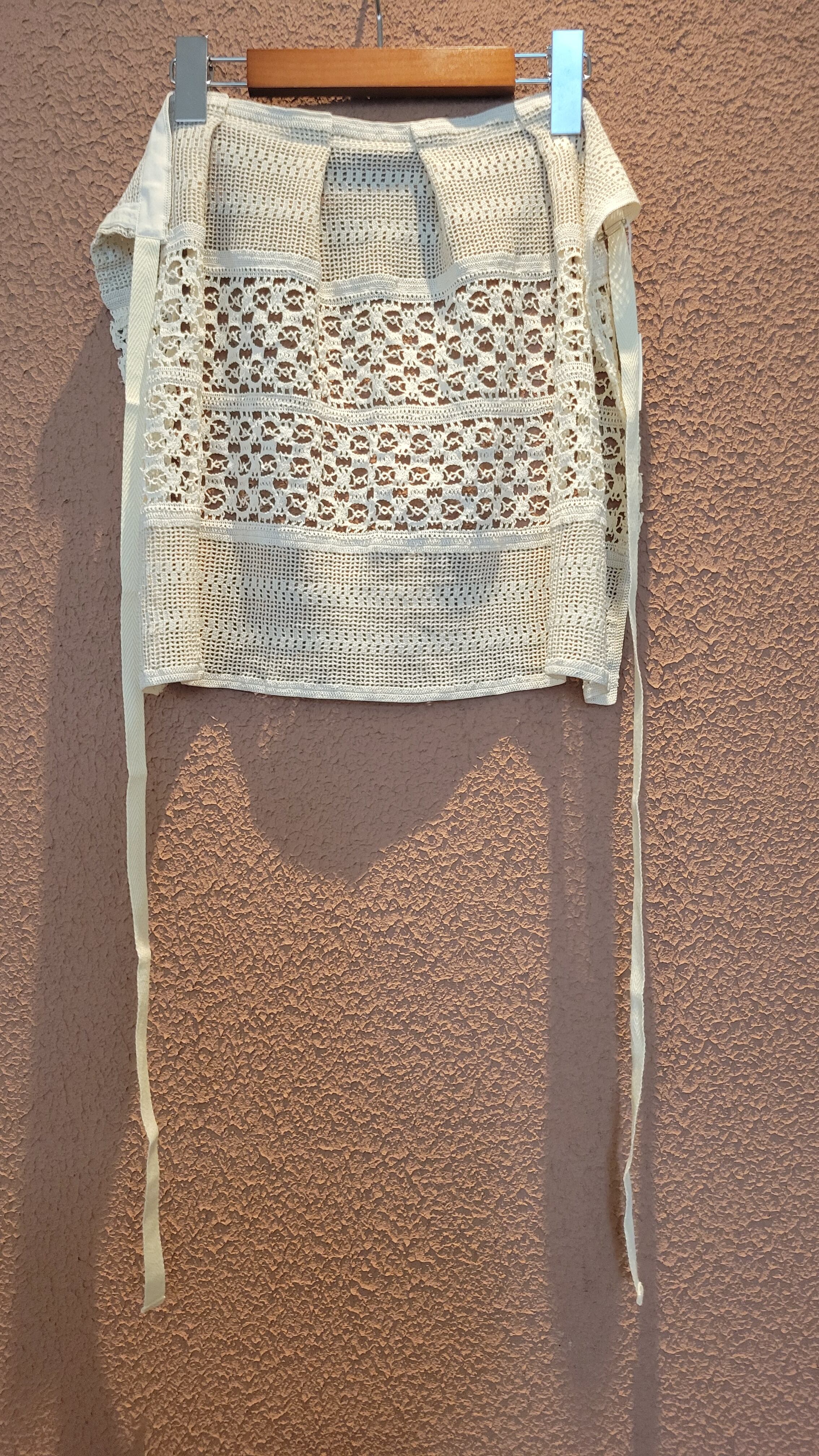 ヴィンテージレースを使用したリメイクエプロン。素材不明ですがコットンのようです。フロントタック入り。デニムはもちろん、ミリタリーやワークパンツ、オーバーオールやワンピースなどいつものスタイリングにプラスしてお楽しみいただけます。レースの柄が素敵な1枚。