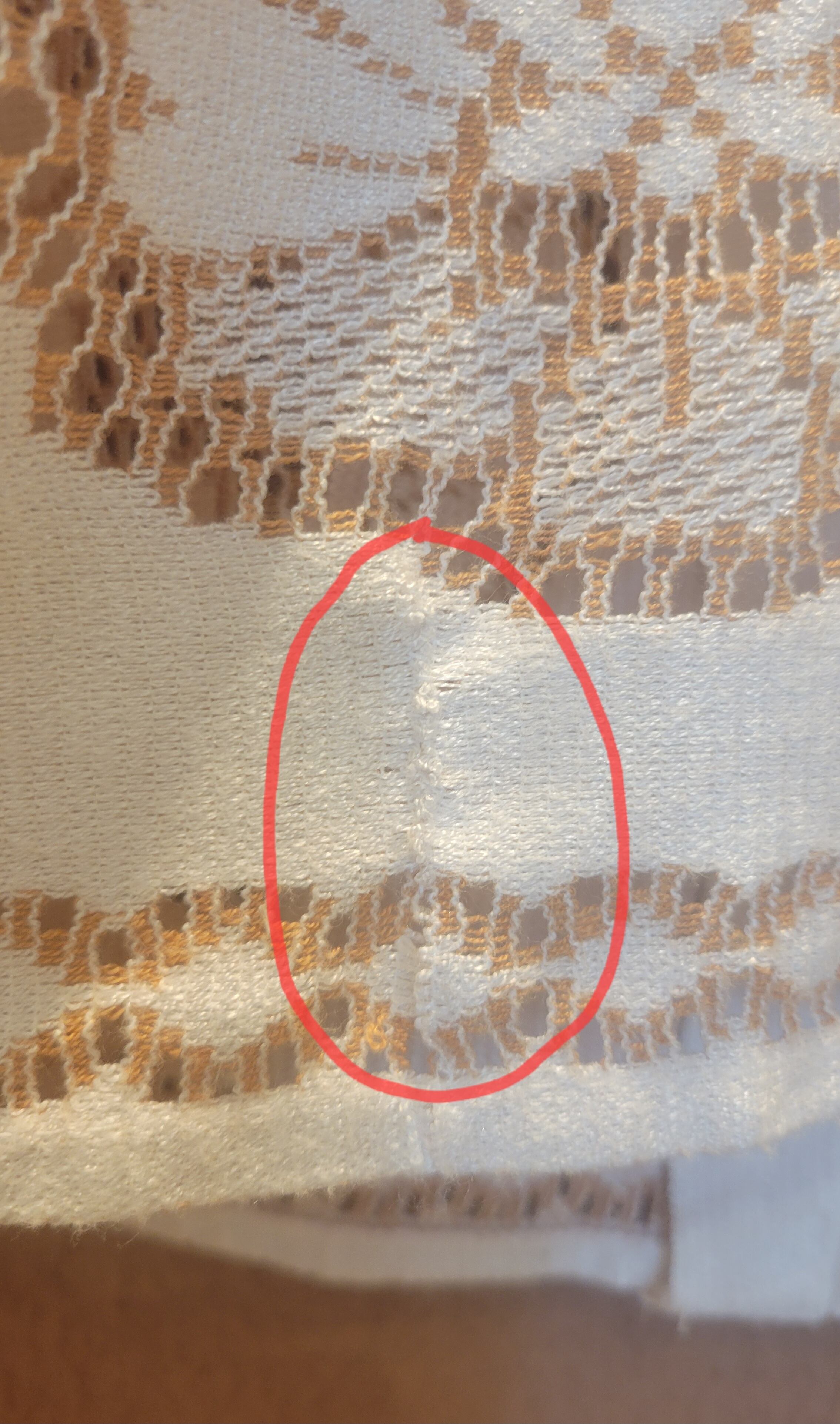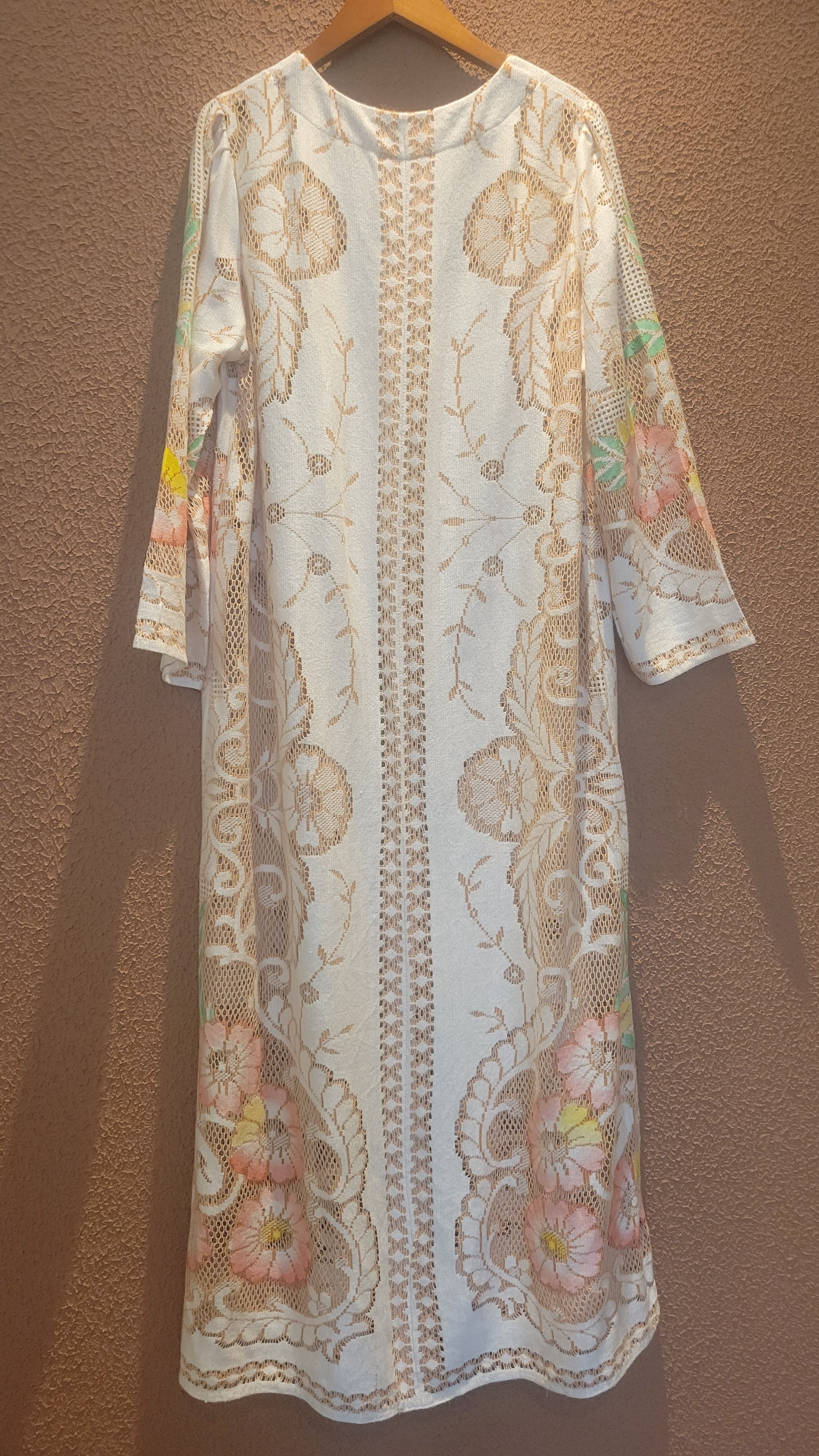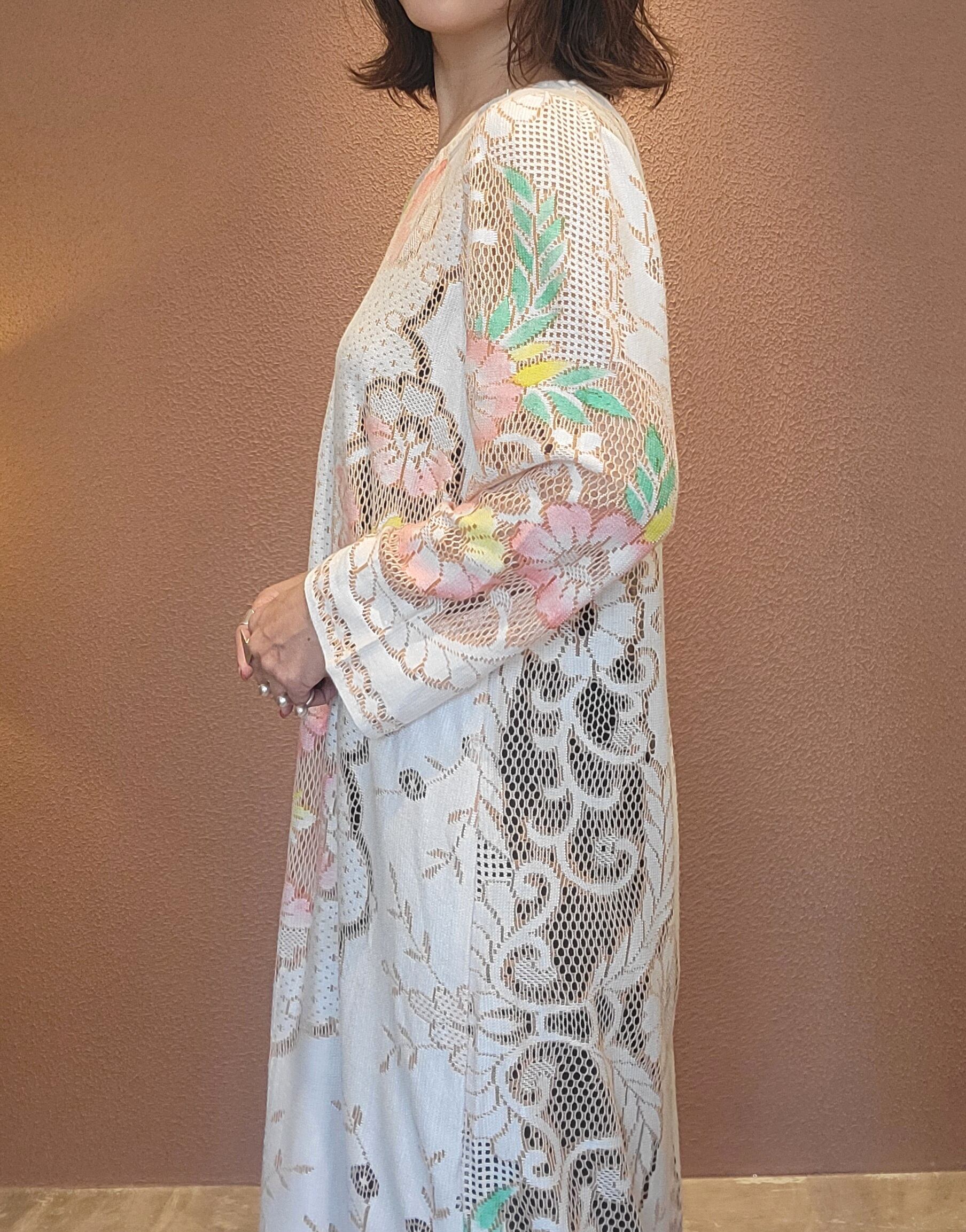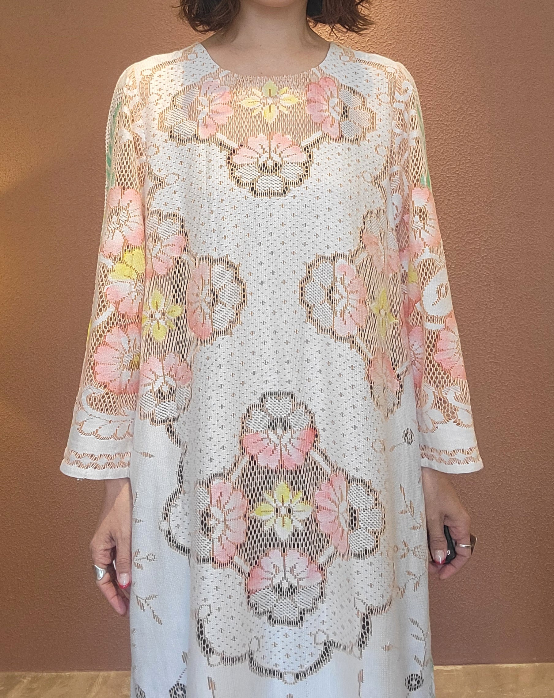 ヴィンテージの希少なカラーレースを贅沢に使用したリメイクワンピース。素材不明です。薄手軽量の肌触りの良い柔らかな素材です。ファスナーは付いておらず頭から被るようにして着用するプルオーバータイプ。フロント裾付近に生地ダメージと修繕跡があります。着用時にはそれほど目立つものではありません。画像でご確認ください。