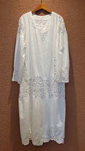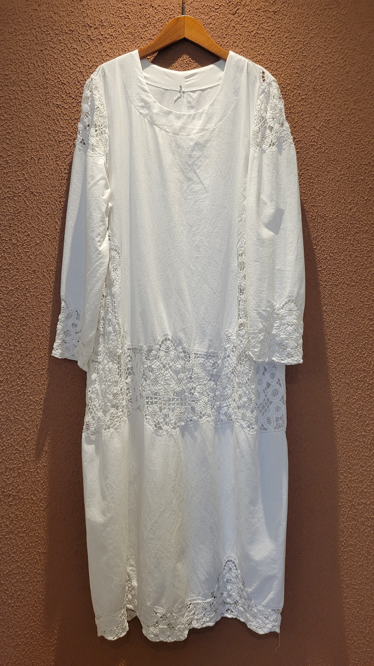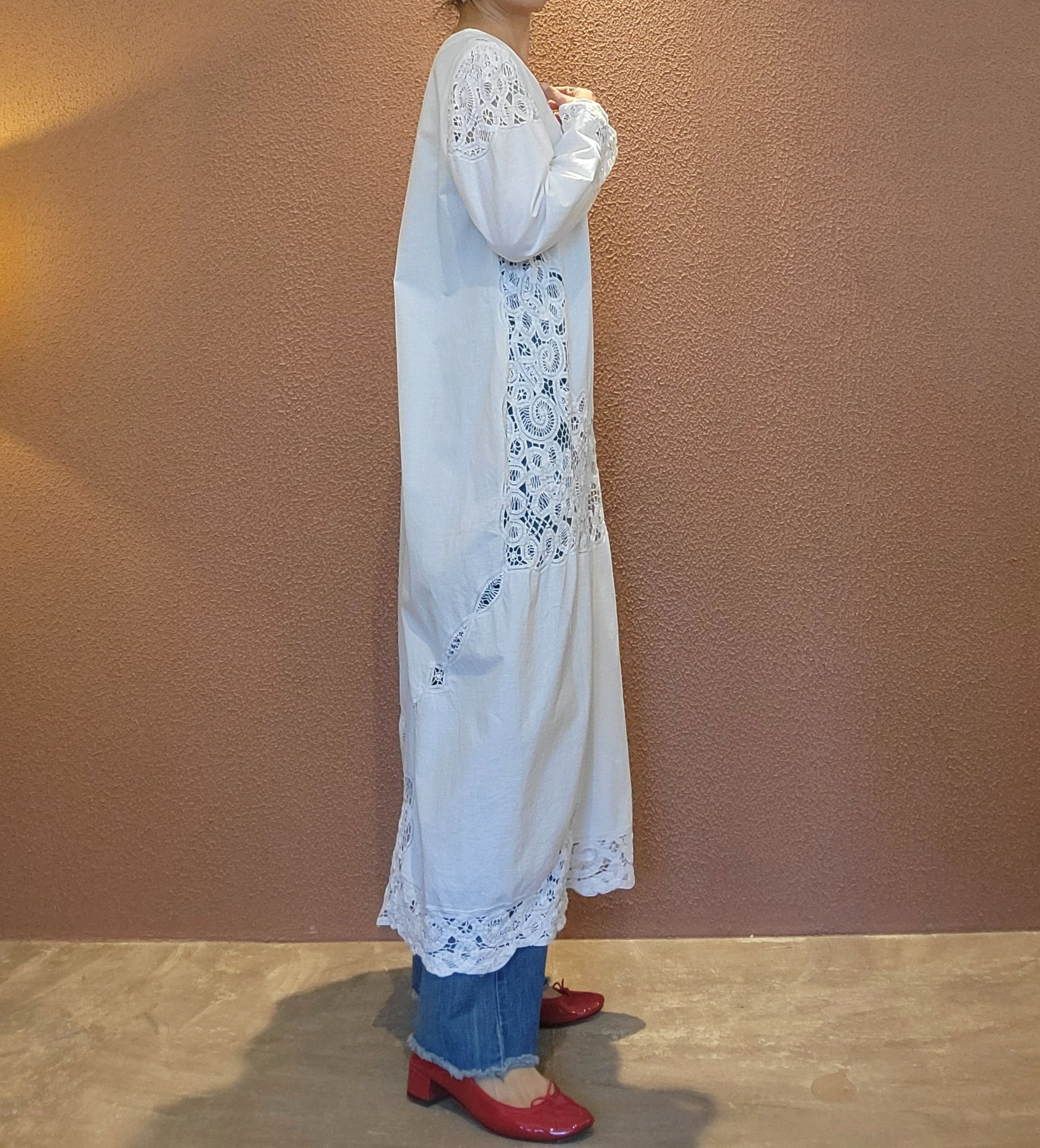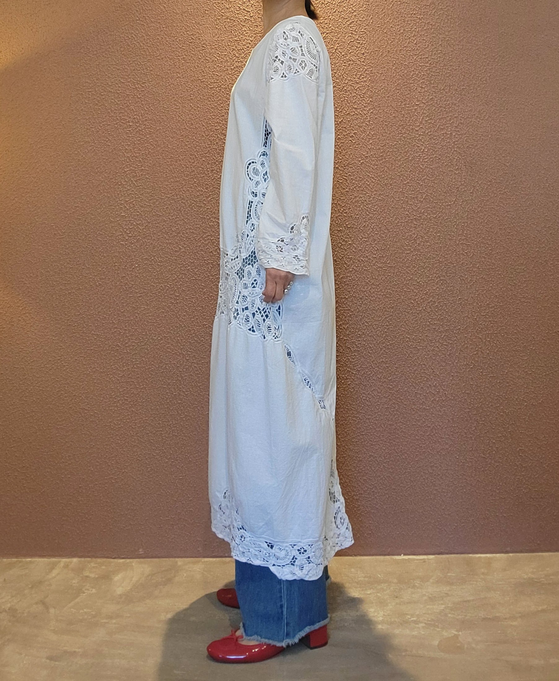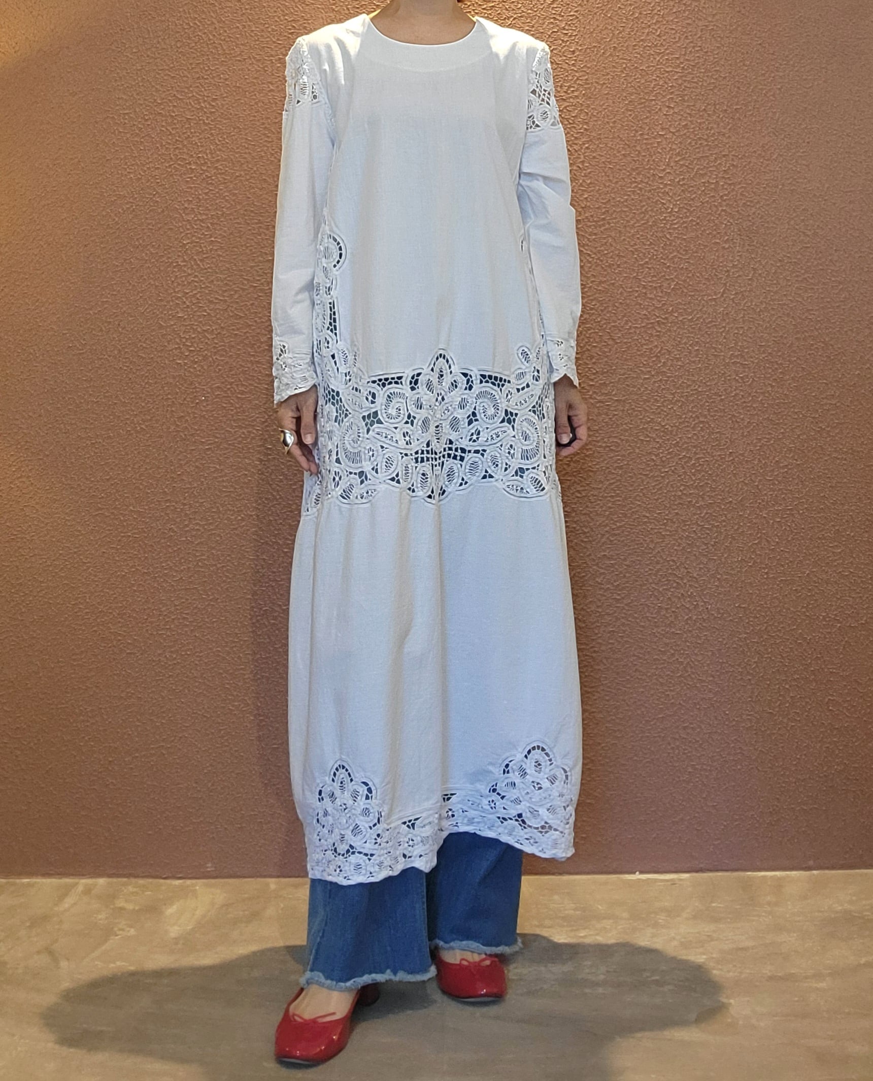 ヴィンテージのバテンレースを使用したリメイクワンピース。素材不明ですがコットンのようです。さらりとした肌触りです。透け感があるのでインナーにスリップドレスやキャミソール&ペチコートの着用が必要です。ファスナーは付いておらず頭から被って着用するプルオーバータイプ。長袖でもレースなので涼しく、夏場でも着用できます。デニムに合わせて裾からデニムを覗かせてカジュアルに着るのもおすすめです。