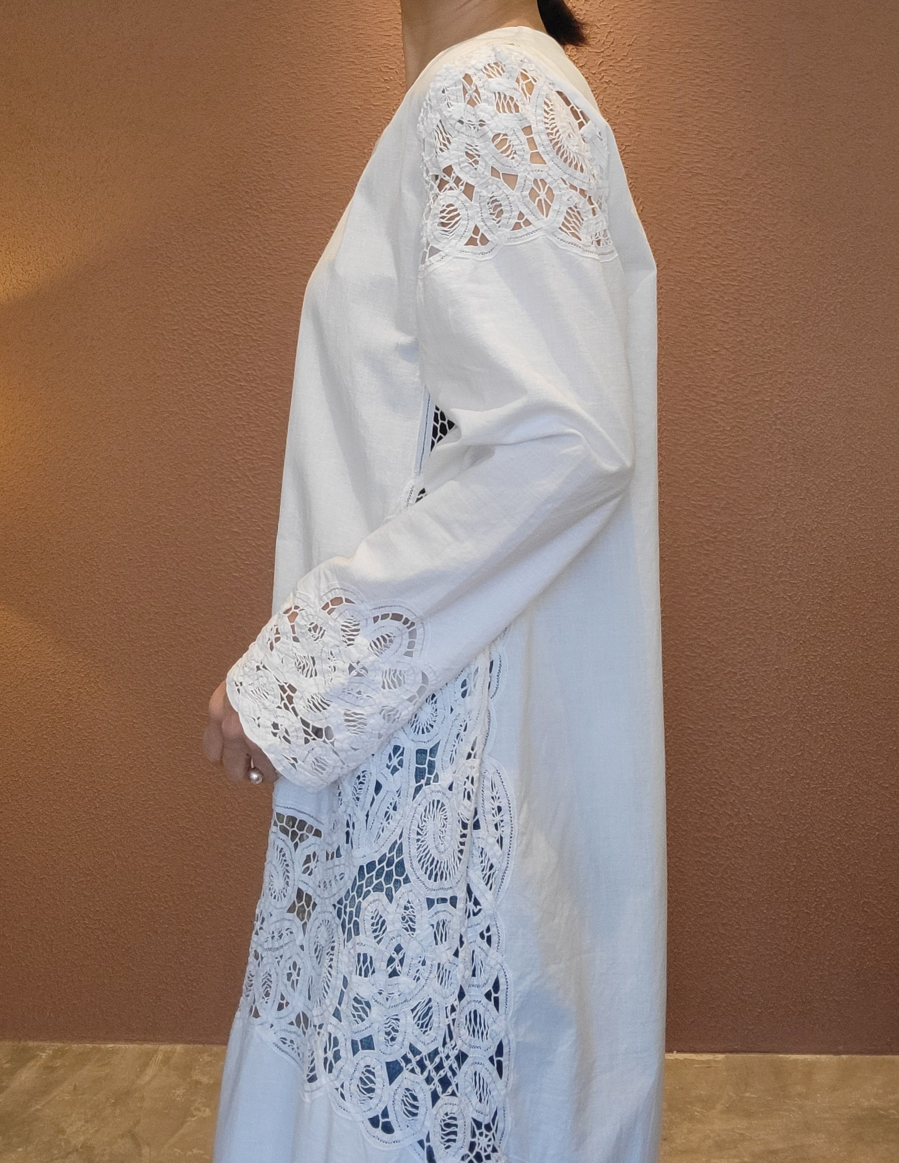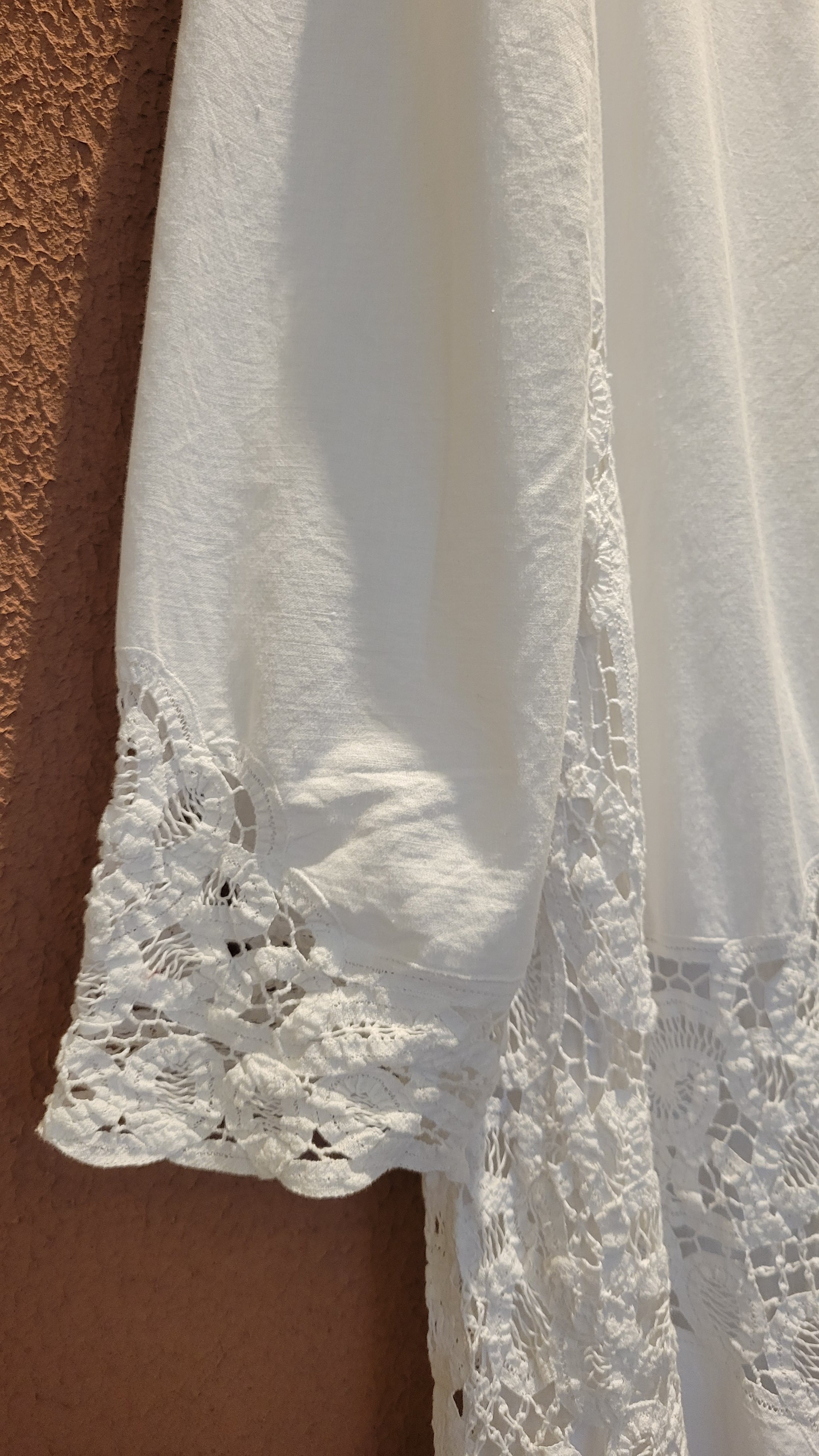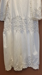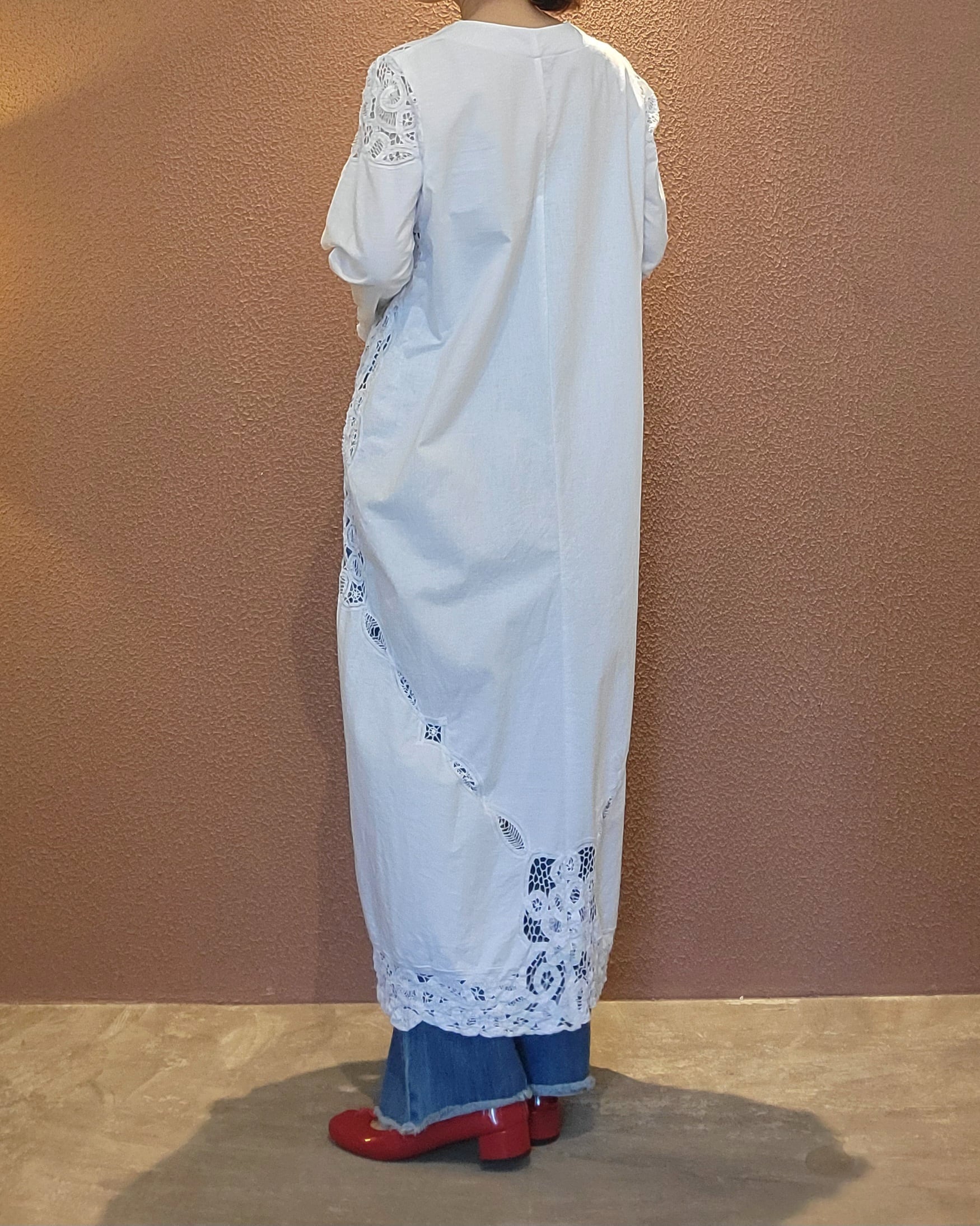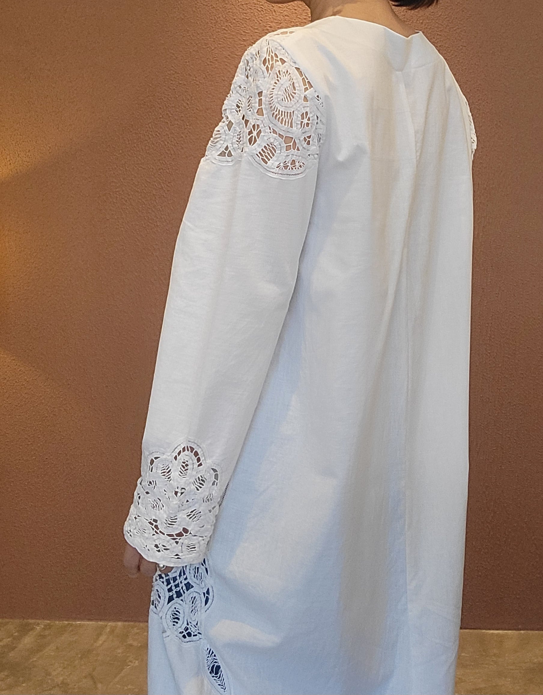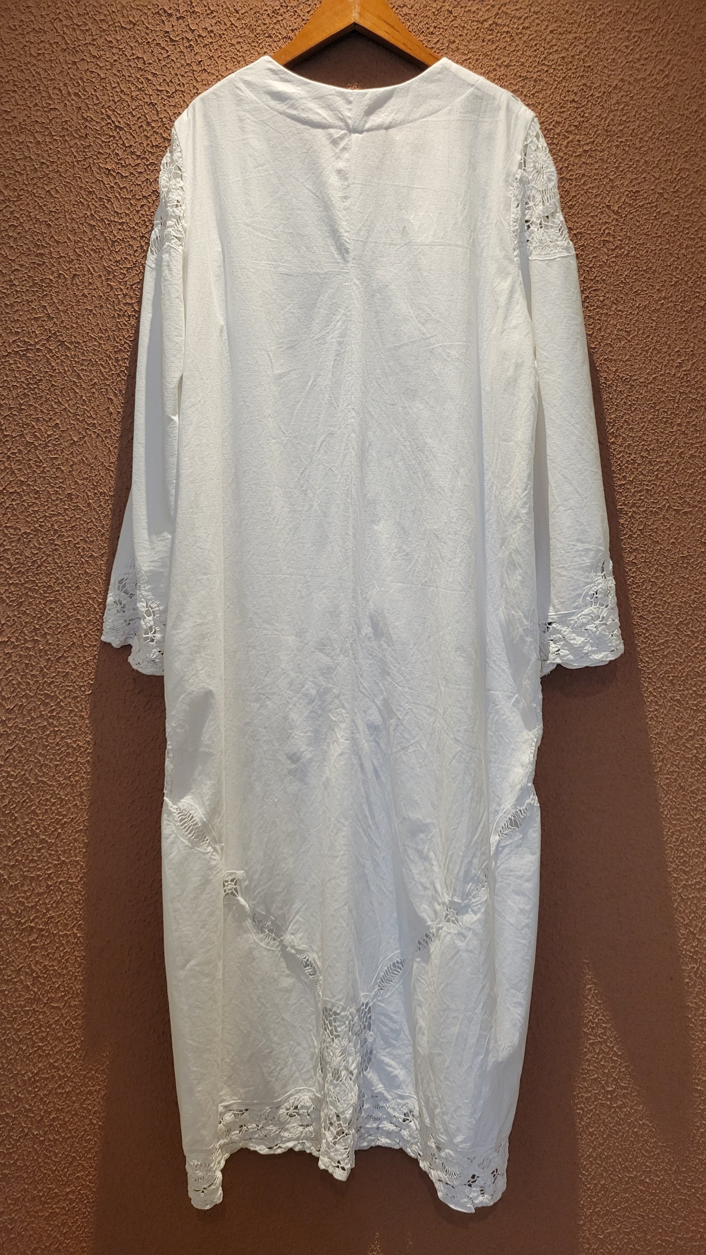 ヴィンテージのバテンレースを使用したリメイクワンピース。素材不明ですがコットンのようです。さらりとした肌触りです。透け感があるのでインナーにスリップドレスやキャミソール&ペチコートの着用が必要です。ファスナーは付いておらず頭から被って着用するプルオーバータイプ。長袖でもレースなので涼しく、夏場でも着用できます。デニムに合わせて裾からデニムを覗かせてカジュアルに着るのもおすすめです。