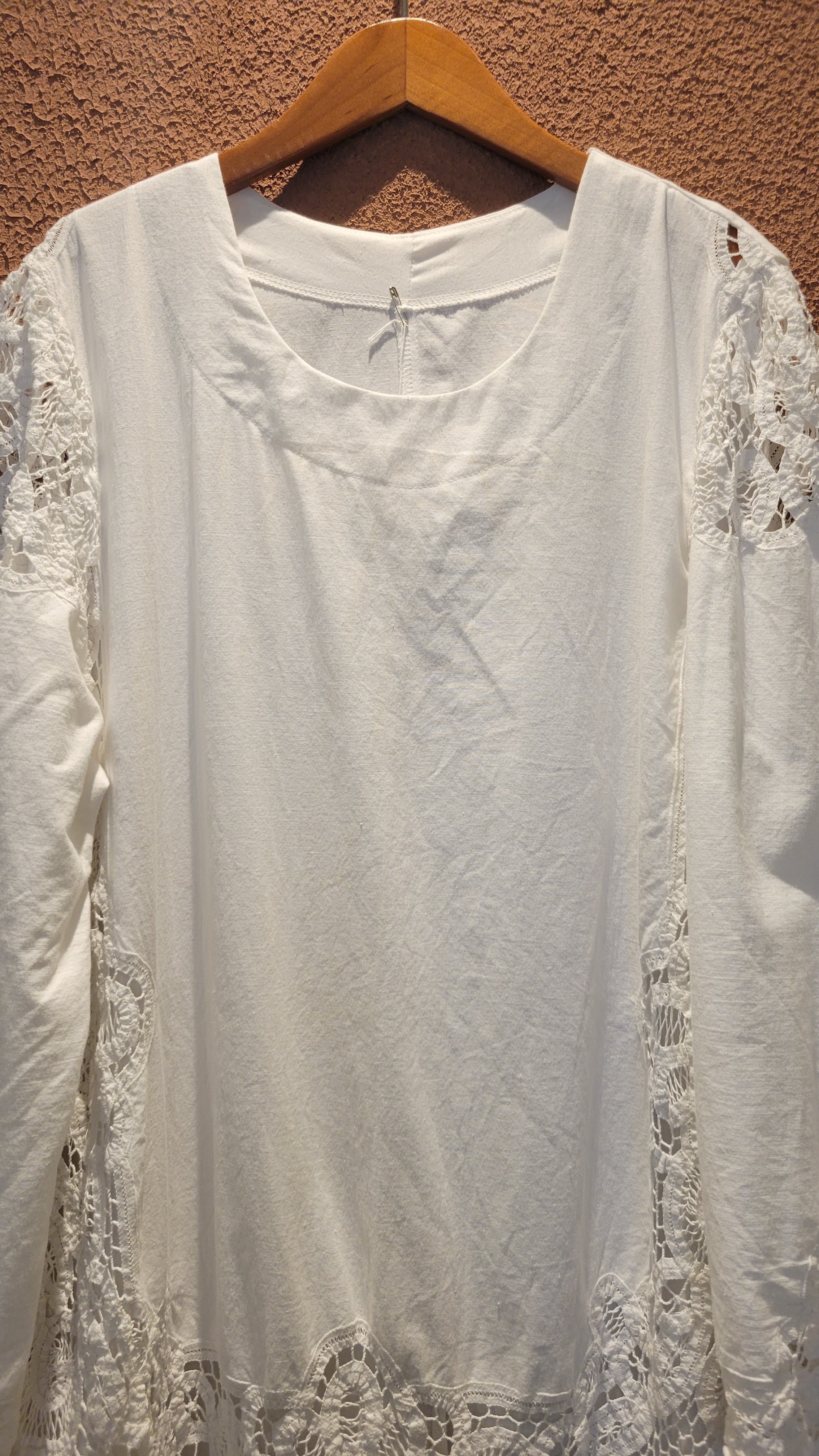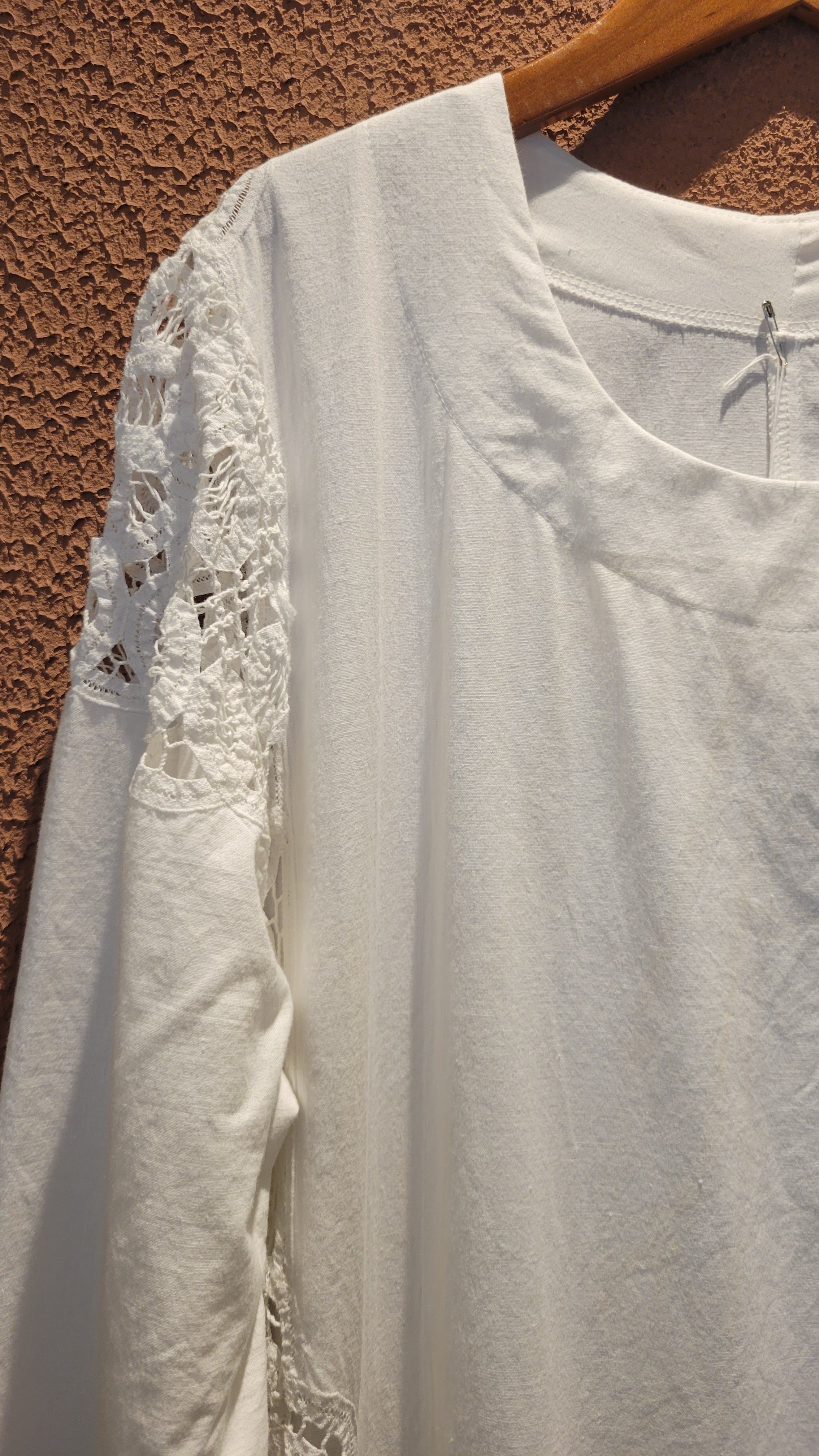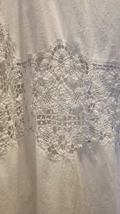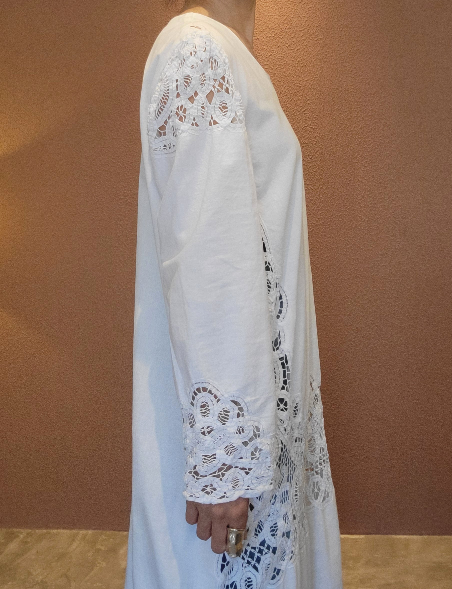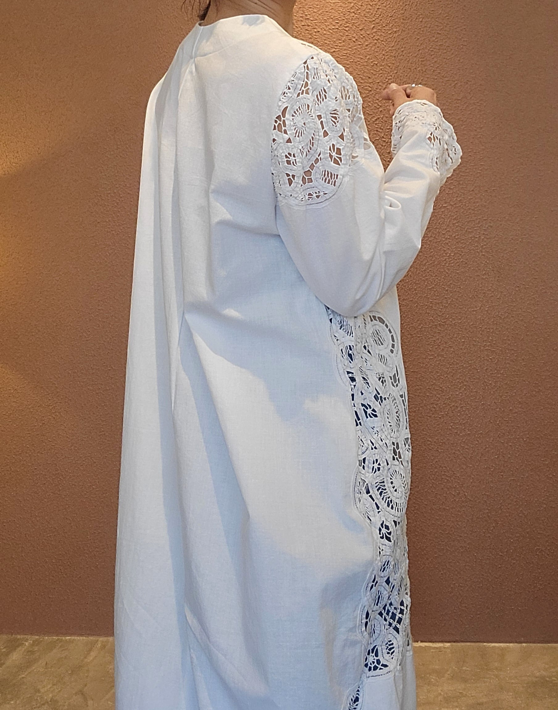 ヴィンテージのバテンレースを使用したリメイクワンピース。素材不明ですがコットンのようです。さらりとした肌触りです。透け感があるのでインナーにスリップドレスやキャミソール&ペチコートの着用が必要です。ファスナーは付いておらず頭から被って着用するプルオーバータイプ。長袖でもレースなので涼しく、夏場でも着用できます。デニムに合わせて裾からデニムを覗かせてカジュアルに着るのもおすすめです。